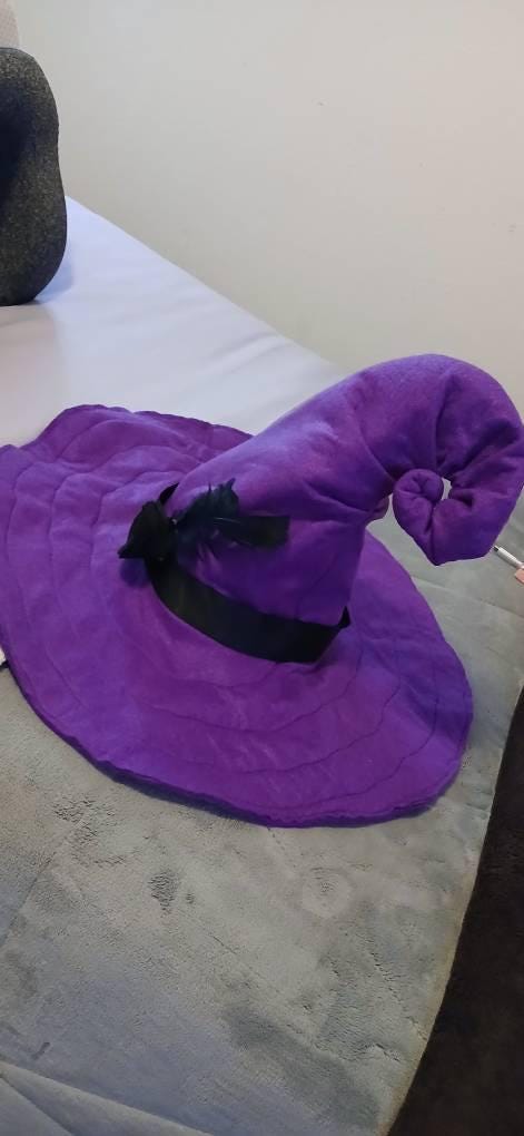 This hat is made of soft purple felt, (vegan friendly) it offers a colorful alternative to your standard black with hat. It has a classic look with a curl back cone perfect for either a dressed up or down witch look. Its extra large brim has layers of magic stitched together for a floppy, yet ridgid look and feel. Add an accessory to really define yourself. Go plain with just a ribbon or add a seasonal bat bow with or without tulle. It would be great for a wizard or mage cosplay, ren faire costume or everyday wear! The possibilities are only limited by your imagination!