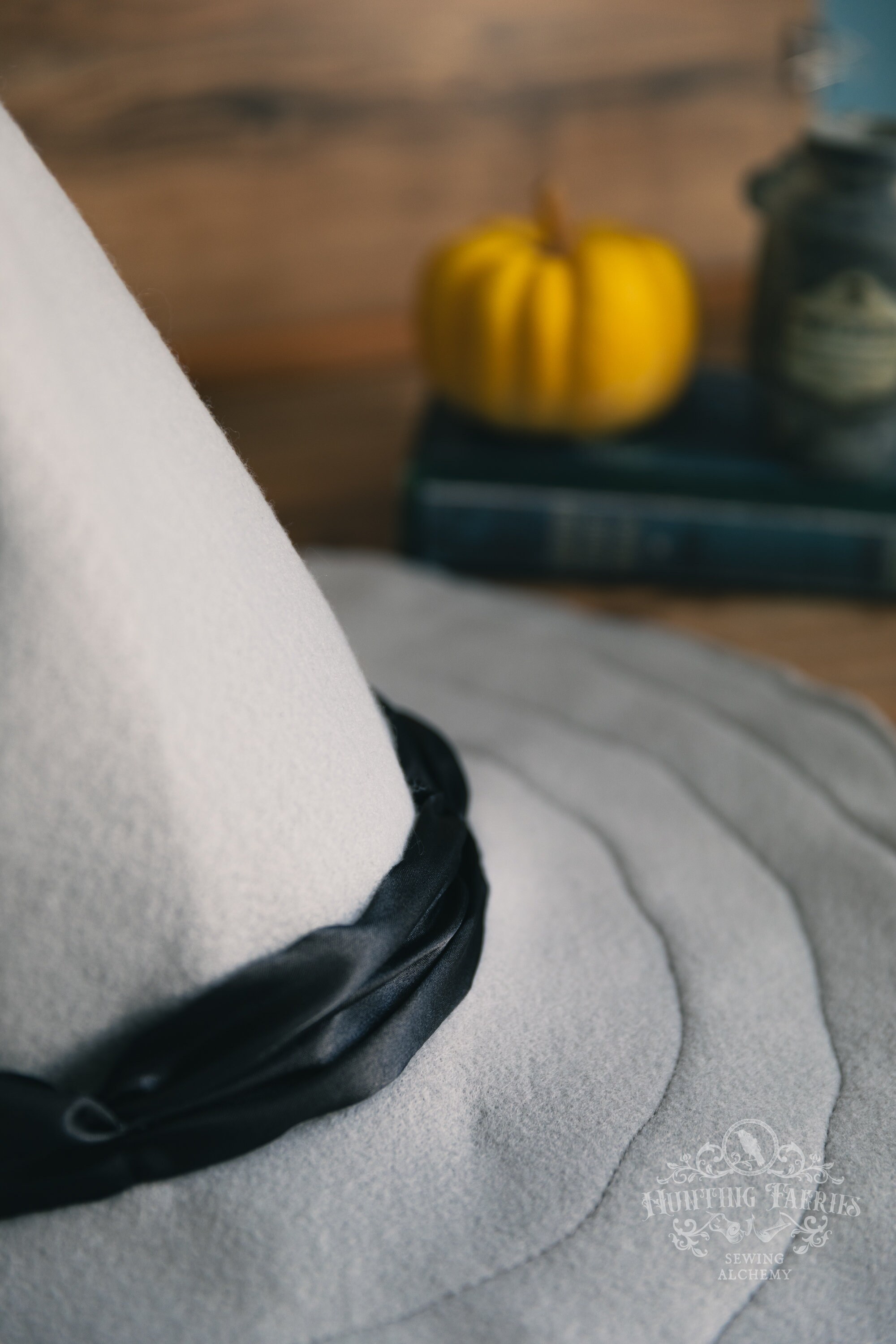 They offer an extra large floppy brim (6 inches from ribbon to outer brim) made of three stitched layers of felt: to keep out the bugs as you circle above. The cone is lined in another layer of felt to help keep its crooked shape, and yet be a comfortable soft fit. There is a lovely graphite satin ribbon or black ruched satin encircling the crown. You choose! Simply bewitching!