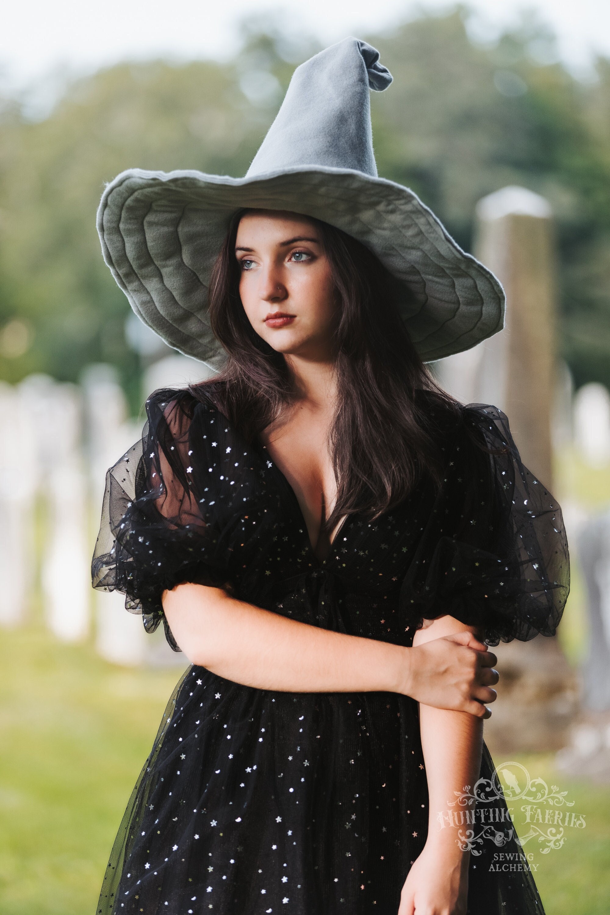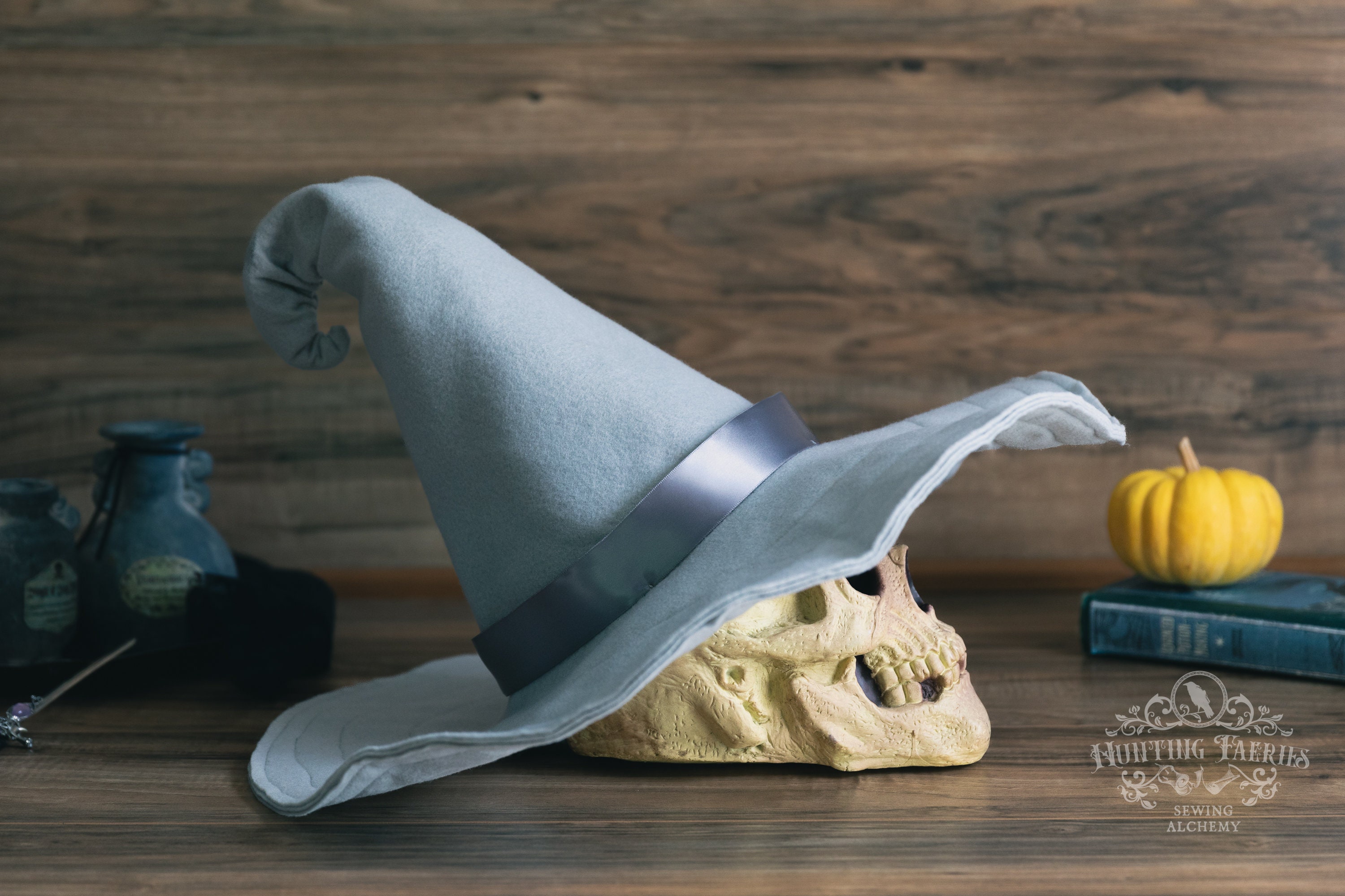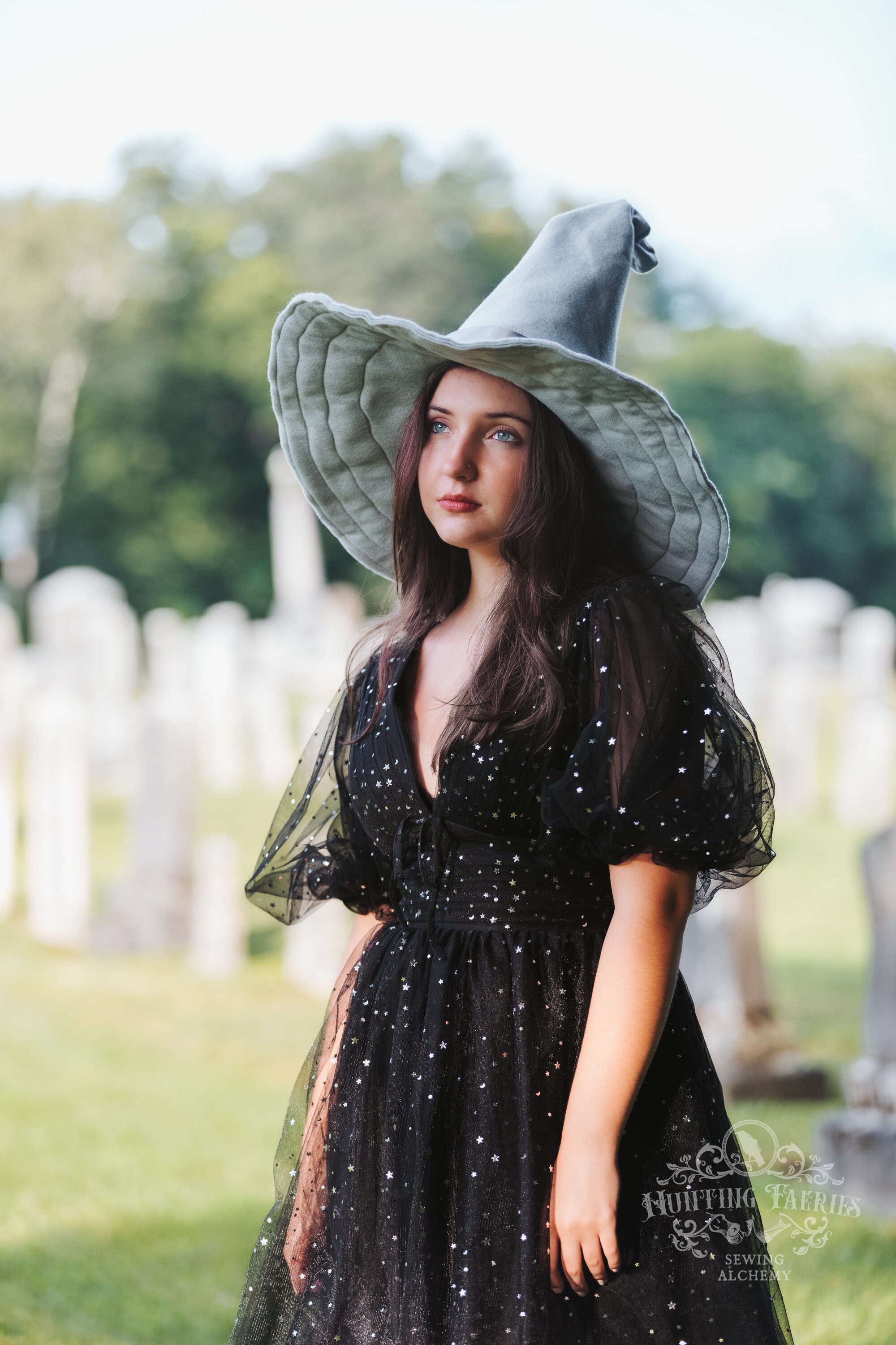 This oversized crooked witch hat is made of light grey vegan friendly felt. It offers a classic look with a slight back crook or back curl perfect for either a dressed up or down witch look. Its wide brim has layers of magic stitched together for a floppy, yet rigid look and feel. Offered with black satin cascading down the back or a or graphite satin ribbon, or no decoration so you can dress it up yourself! A magical bride to be? This is a great choice for a themed witch or Halloween ceremony with the xl wide in lieu of a veil. This grey witches hat would be great for a wizard or mage cosplay, ren faire costume or everyday wear! The possibilities are only limited by your imagination!