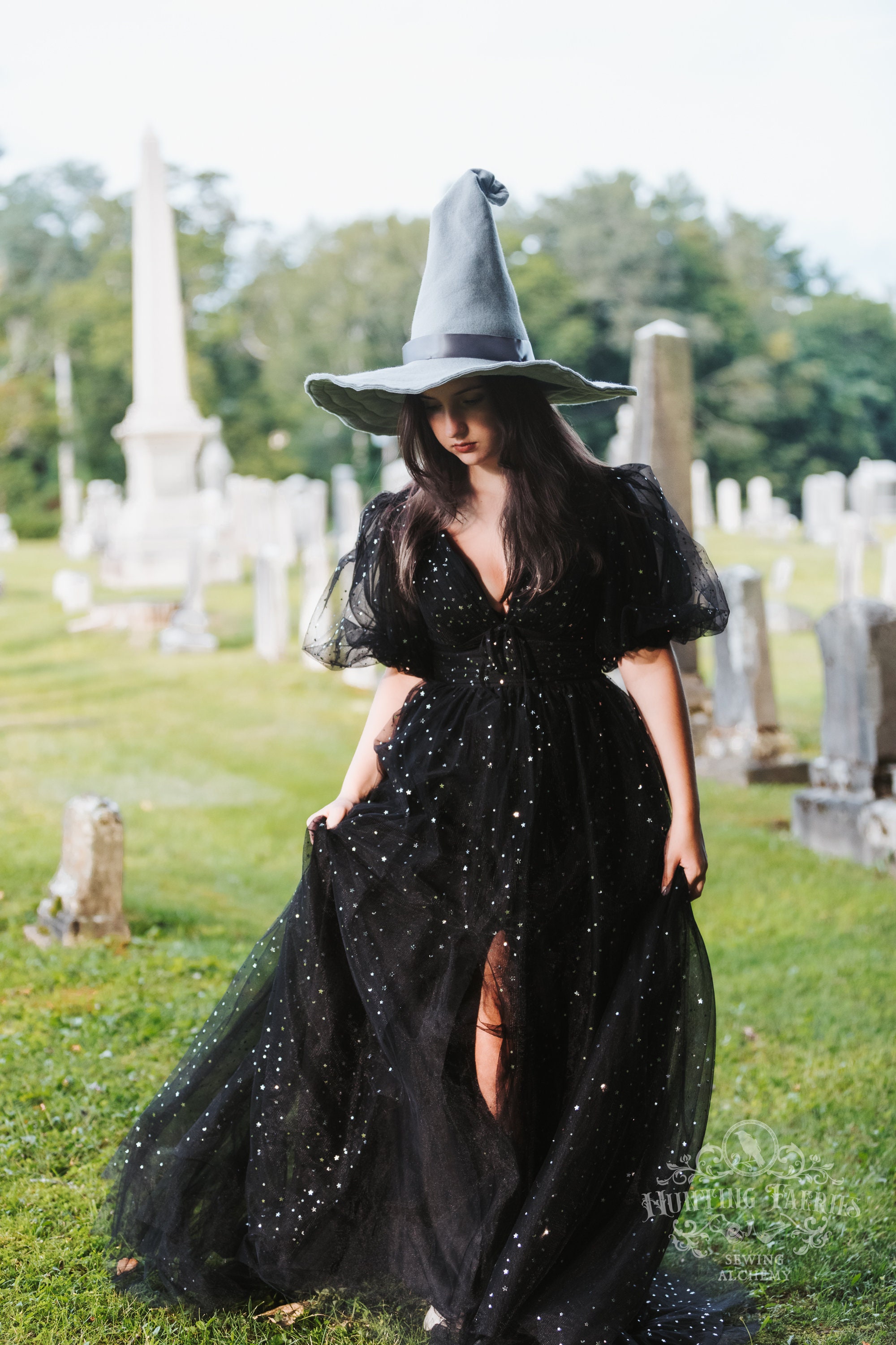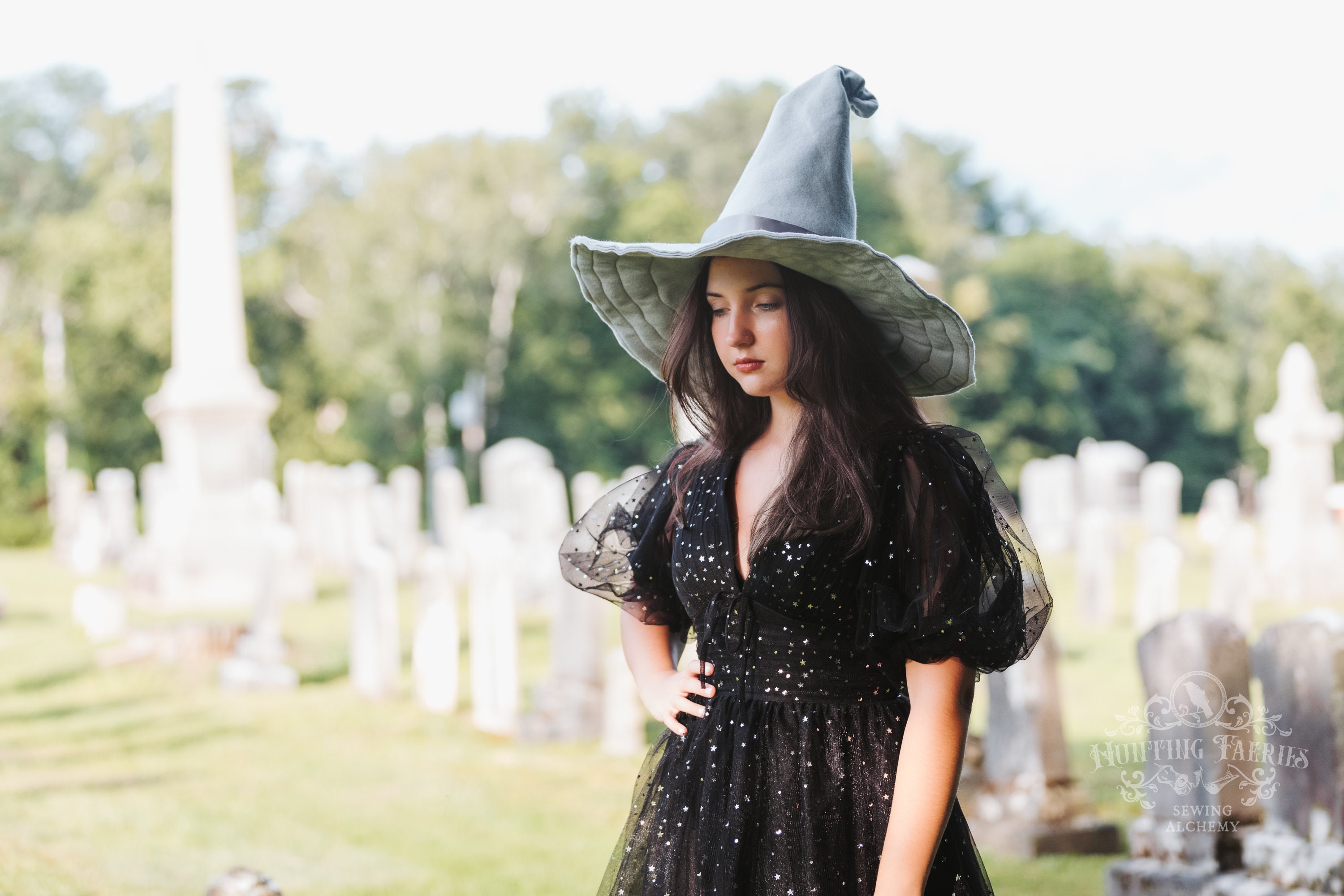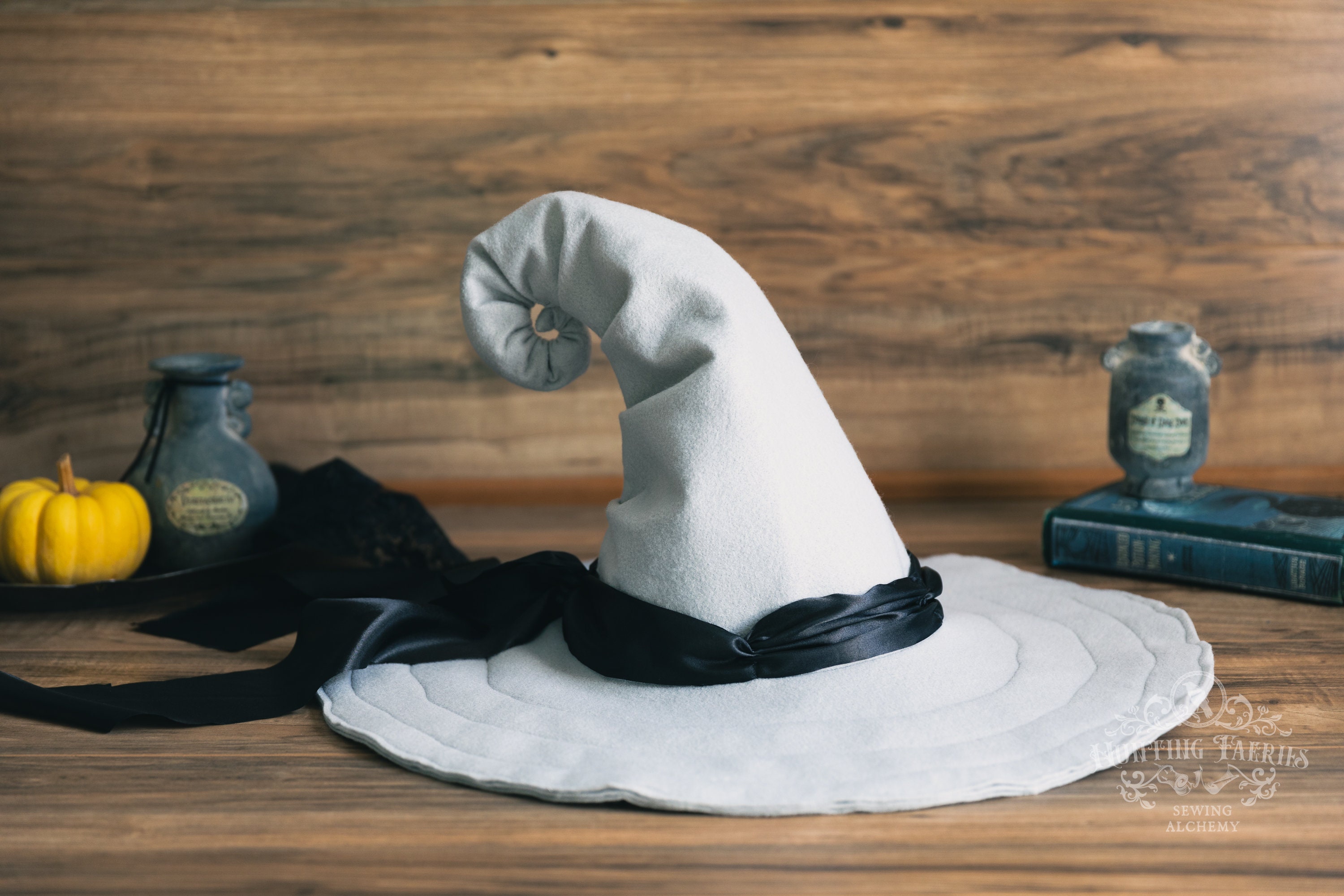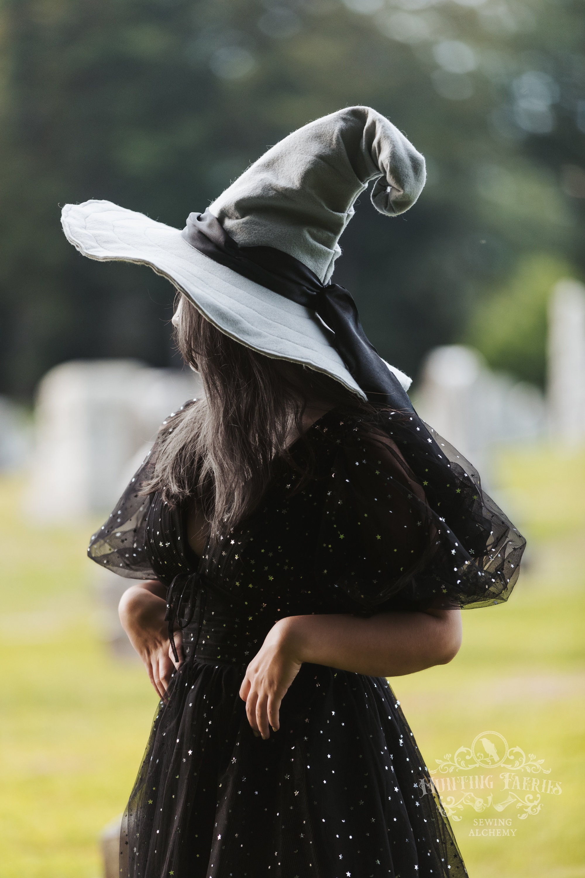 This oversized crooked witch hat is made of light grey vegan friendly felt. It offers a classic look with a slight back crook or back curl perfect for either a dressed up or down witch look. Its wide brim has layers of magic stitched together for a floppy, yet rigid look and feel. Offered with black satin cascading down the back or a or graphite satin ribbon, or no decoration so you can dress it up yourself! A magical bride to be? This is a great choice for a themed witch or Halloween ceremony with the xl wide in lieu of a veil. This grey witches hat would be great for a wizard or mage cosplay, ren faire costume or everyday wear! The possibilities are only limited by your imagination!