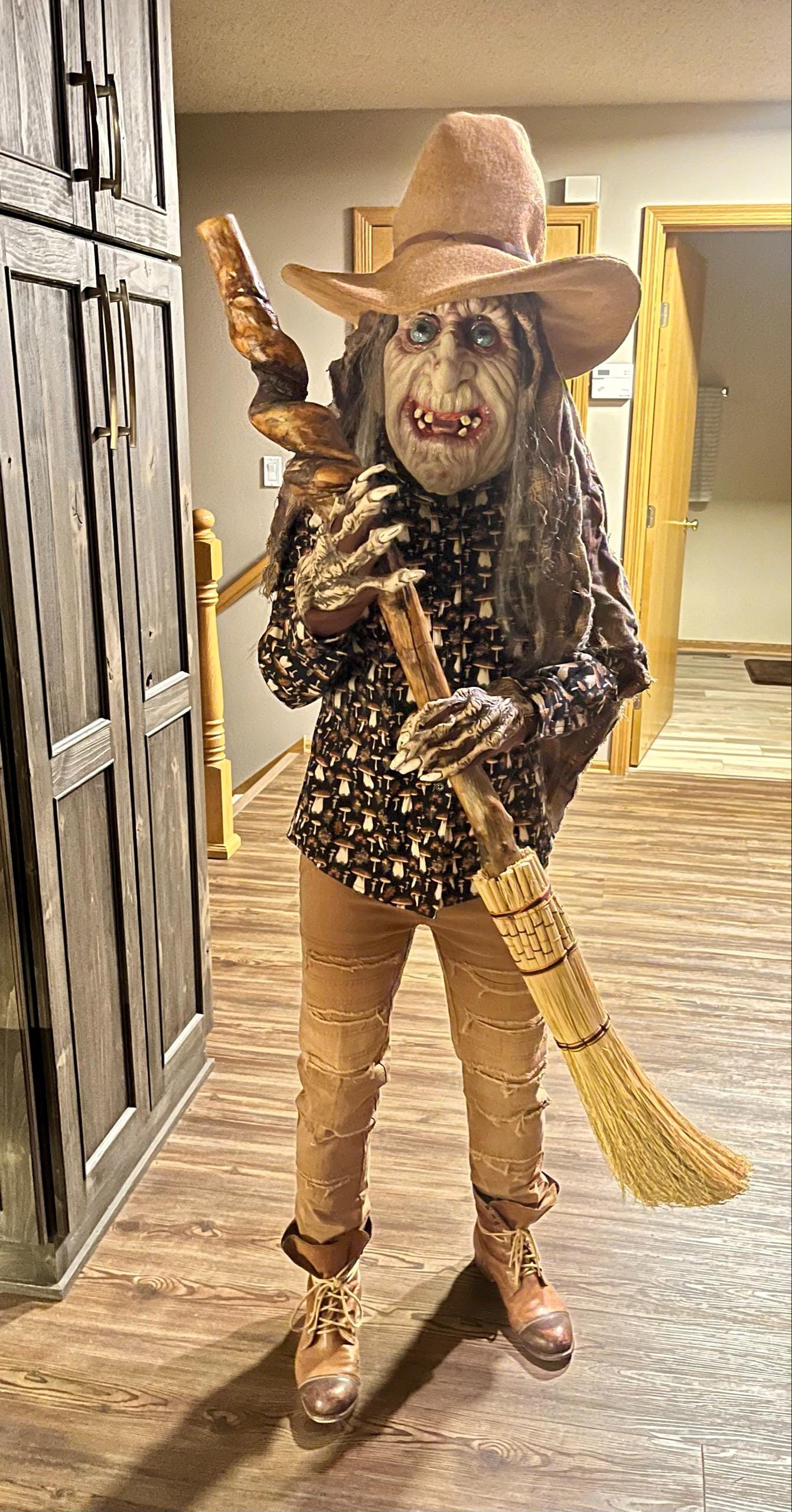 This witch hat is made of dark brown felt, (vegan friendly) it offers a wizarding dark look with a ruched curled cone perfect for either a dressed up or down witch look. Its wide sloped brim has layers of magic stitched together and wired for a ridgid looking brim and soft feel from the cone. It has a thin strip of leather that crosses in the back offering a natural strong, powerful woodland look. It would be great for a wizard or mage cosplay, ren faire costume or everyday wear! This hat screams for a powerful wearer, no frills here, it's all business. The possibilities are only limited by your imagination!