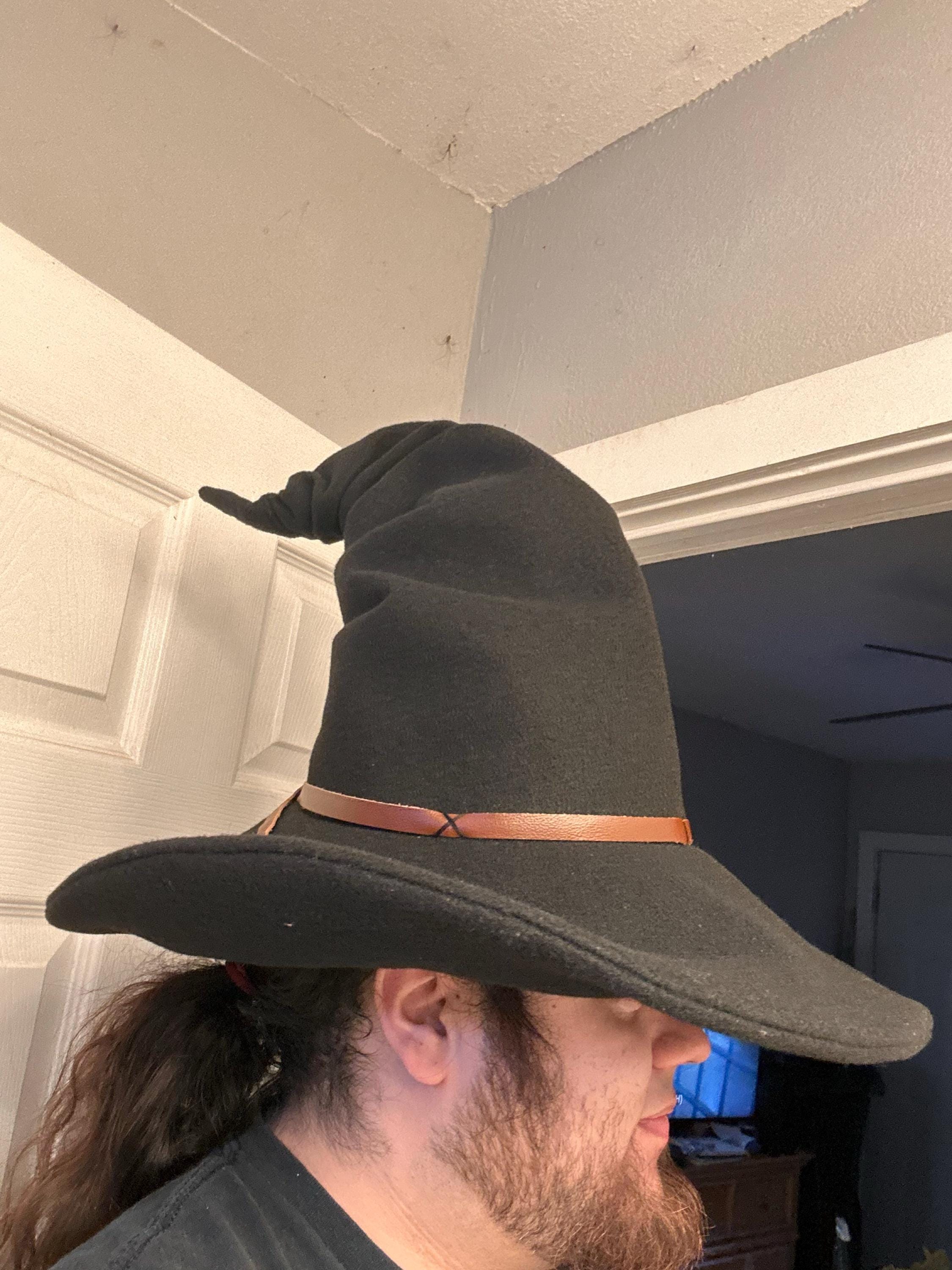 This witch hat is made of black felt. It offers a wizarding dark look with a ruched curled cone perfect for a dressed-up or down witch look. Its wide-sloped brim has layers of magic stitched together and wired for a rigid-looking brim and soft feel from the cone. It has a thin strip of leather around the cone that crosses in the back, offering a natural strong, powerful woodland look. It would be great for a wizard or mage cosplay, Ren faire costume, or everyday wear! This hat screams for a powerful wearer; no frills here, it's all business. The possibilities are only limited by your imagination!
