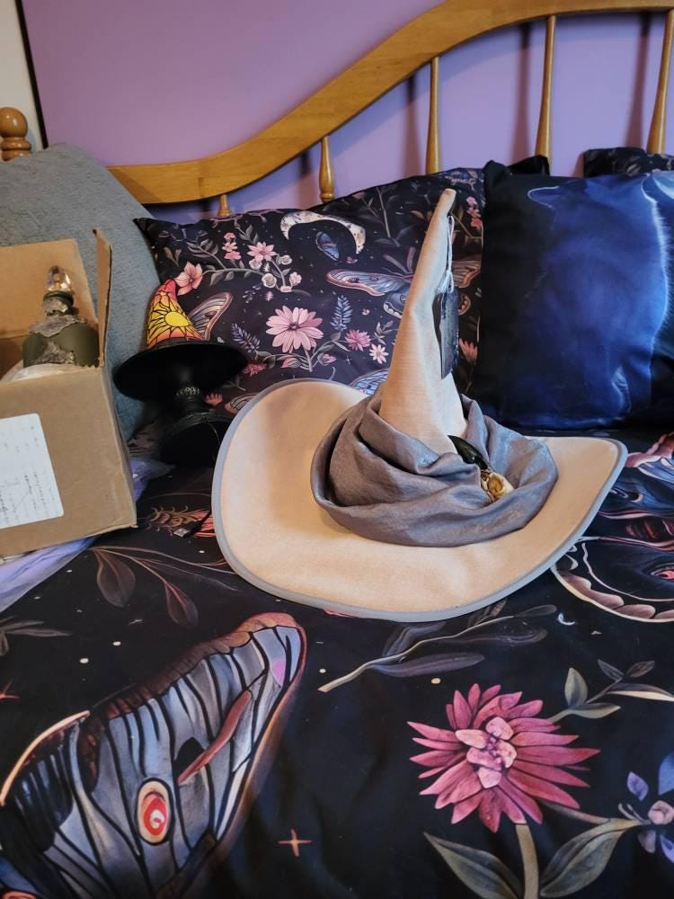 This hat has the potential for good or evil. That choice is all yours. The exaggerated brim will make a statement wherever you go. This witches' hat would be a great addition to your costume, your next Renaissance Faire, Wolfshäger Hexenbrut dance event, or everyday wear! The possibilities are only limited by your imagination!
