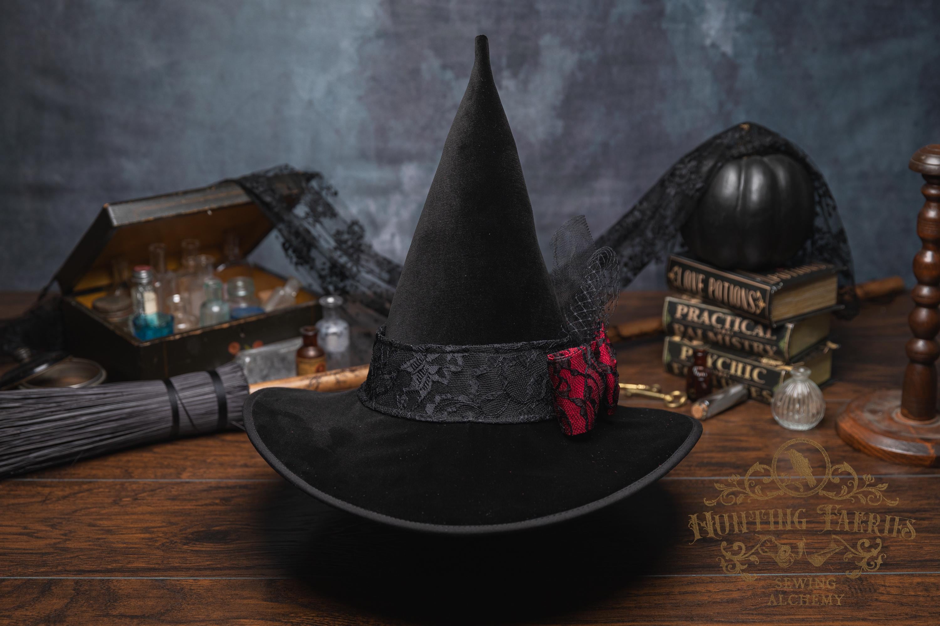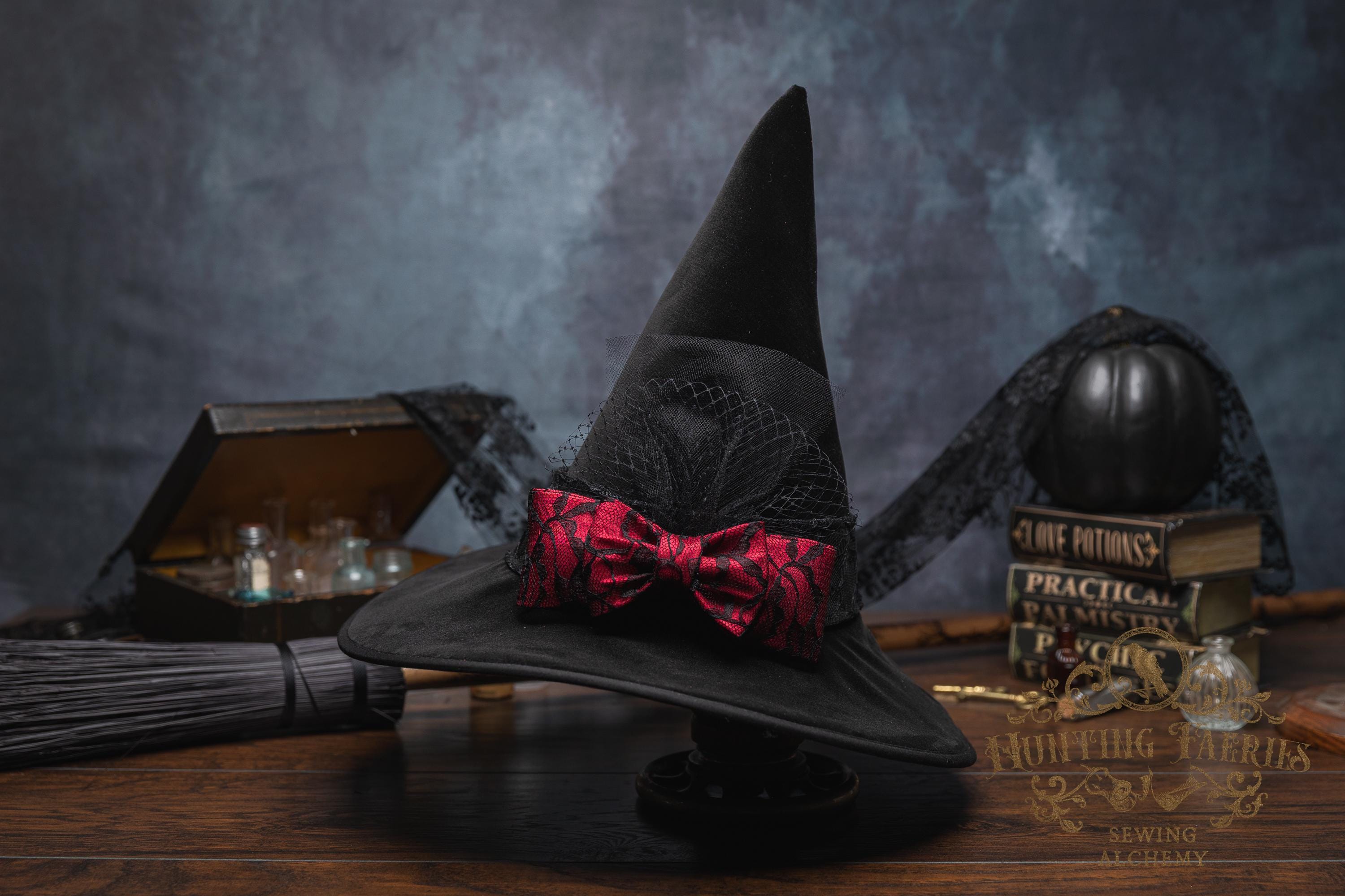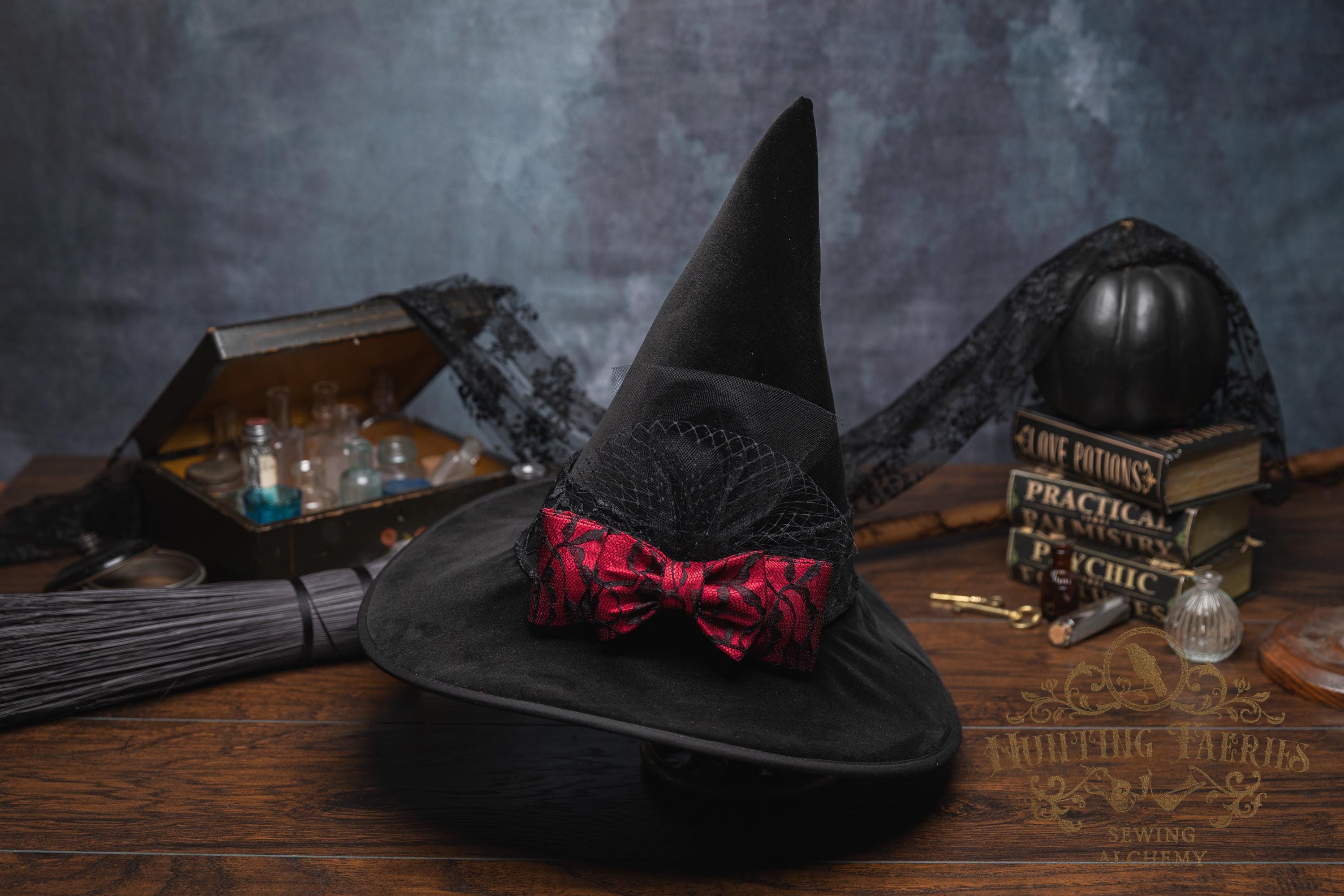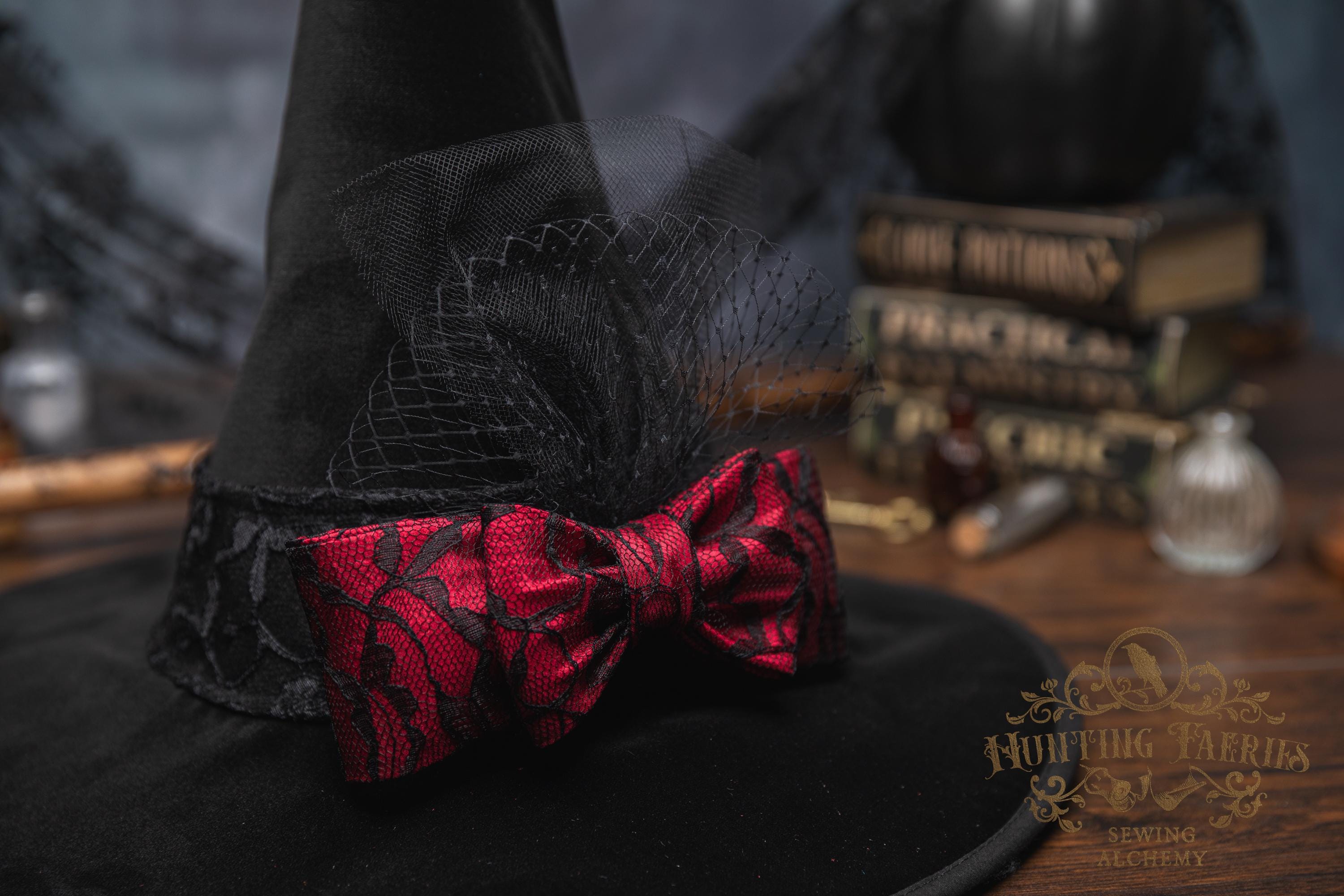 This witch hat is made from black velvet with a black lace band encircling a straight cone. The brim features three layers of magic stitched together and polished off with black bias tape. The underside and inside cone is black felt, which helps the hat maintain its shape, and it absorbs that extra moonlight as you fly through those October skies. The side of the hat is adorned with a red lace bow with a splash of tulle and veil netting. It is removable, allowing you to decorate it to suit your own personal style or change it up to match your witch ensemble.