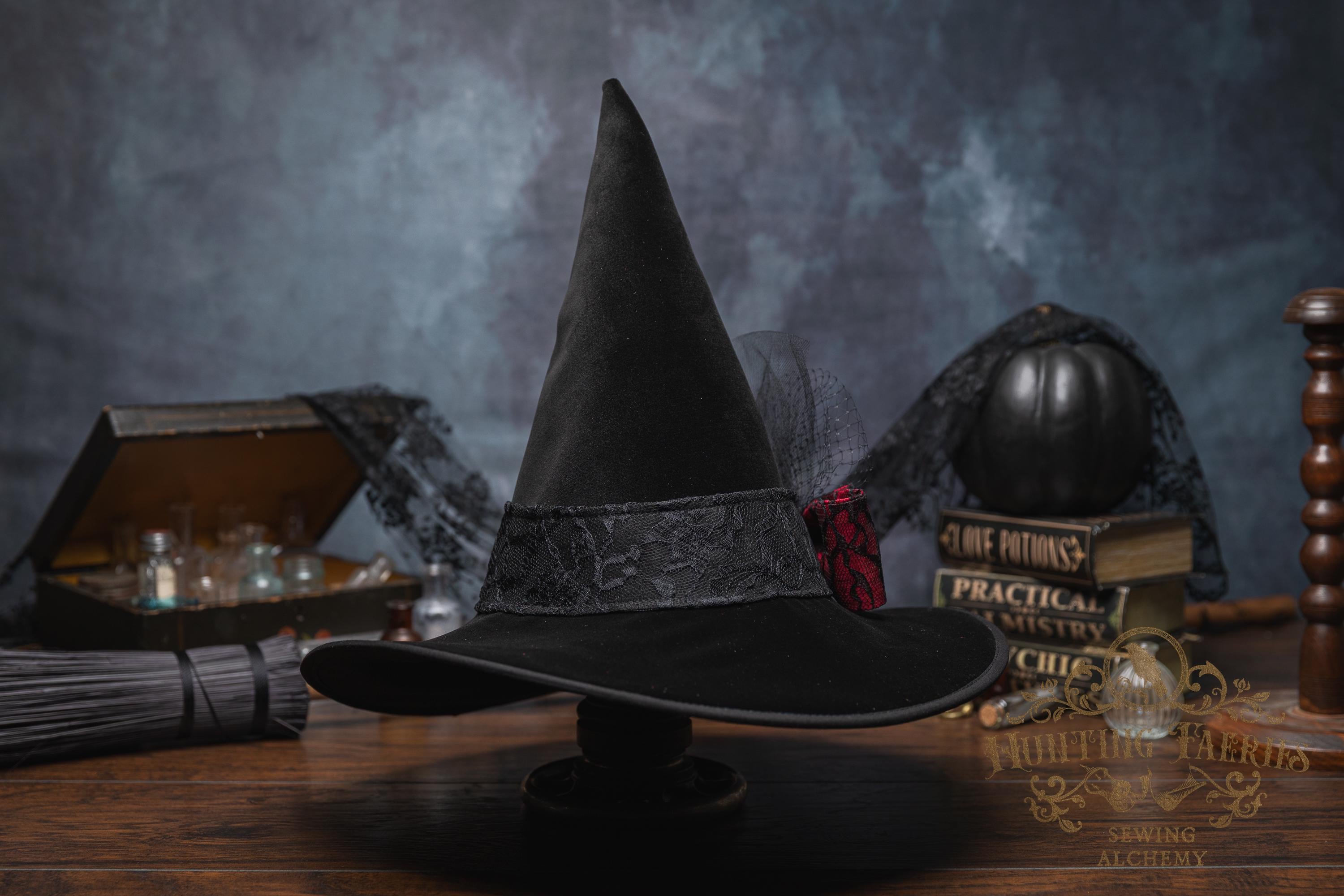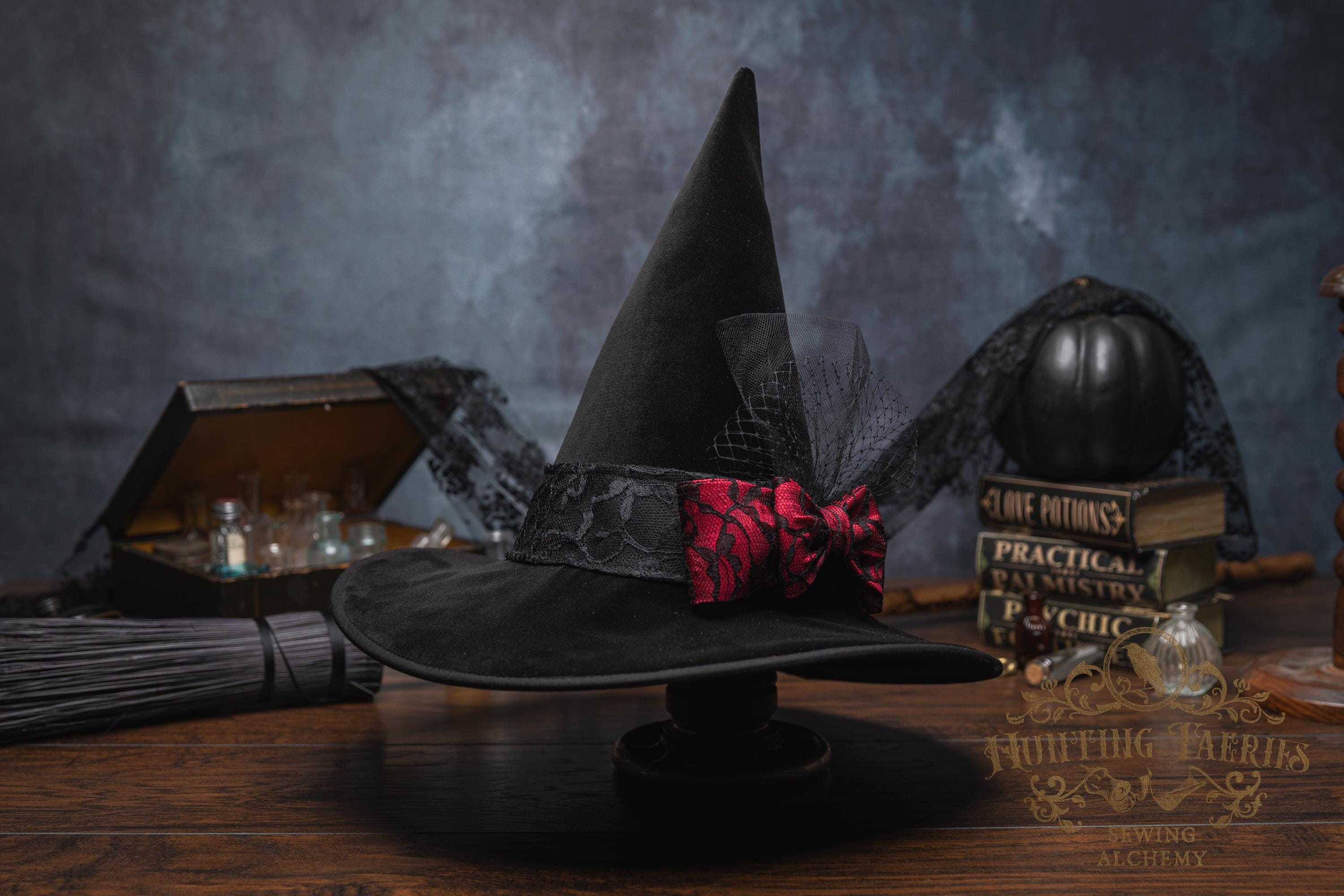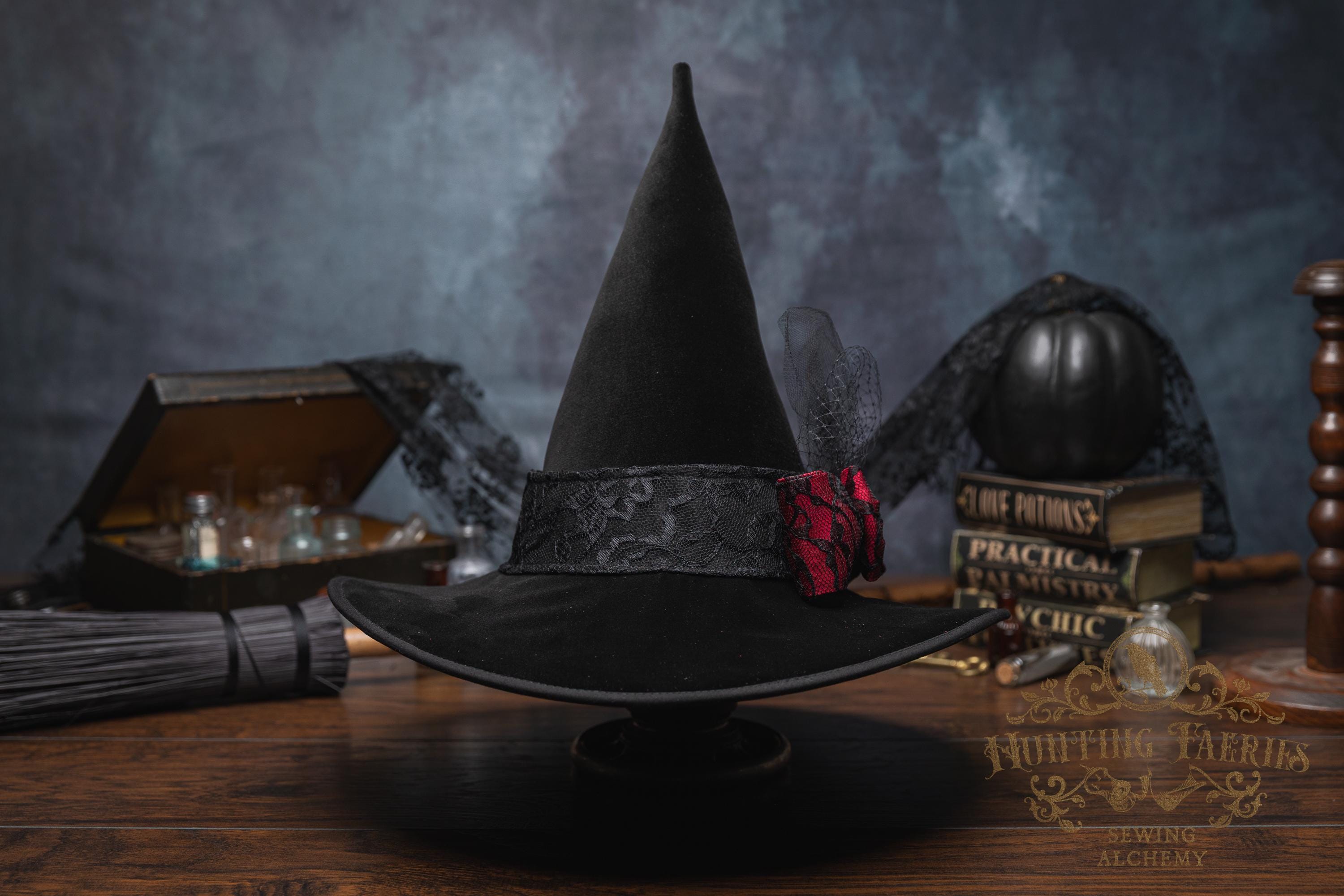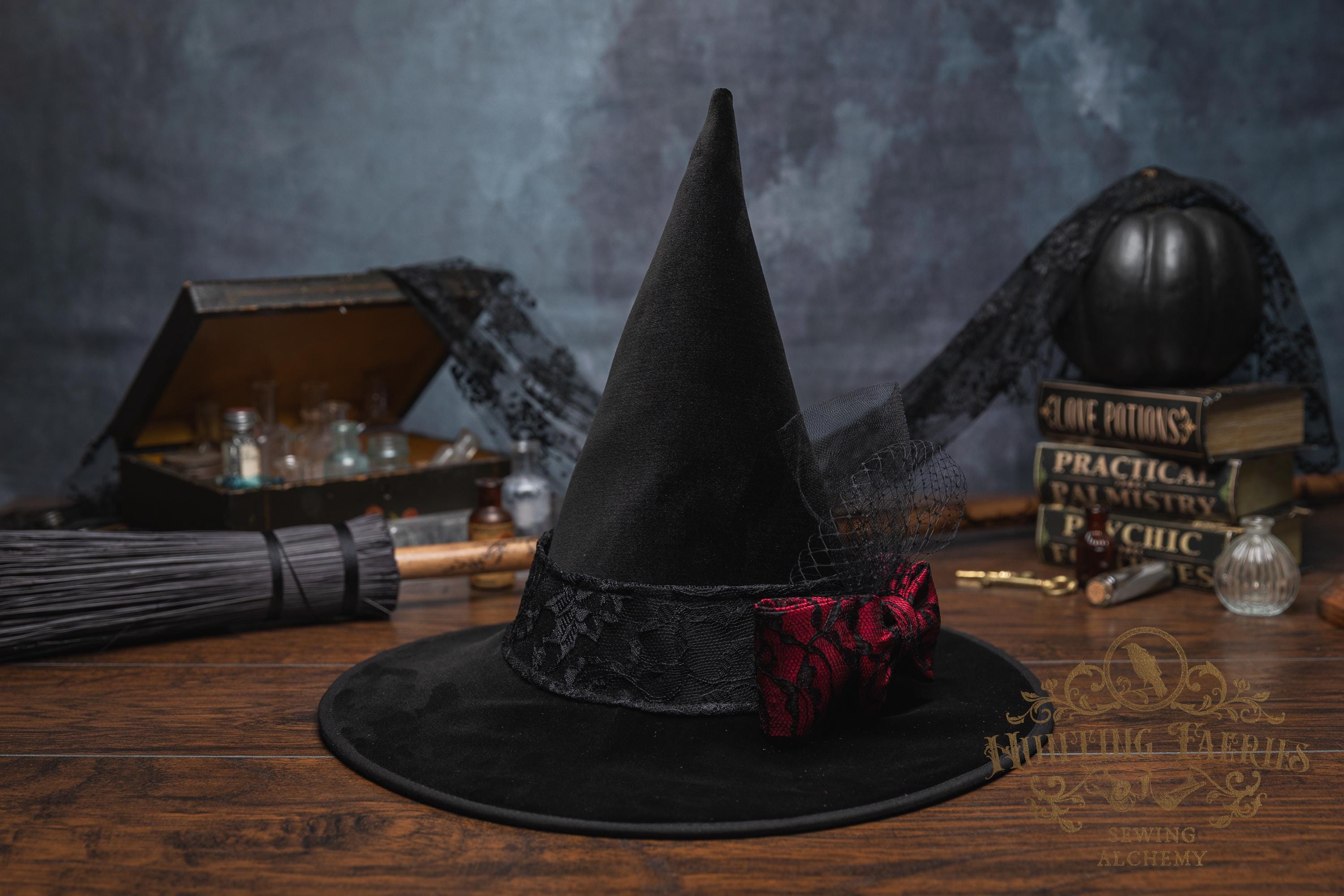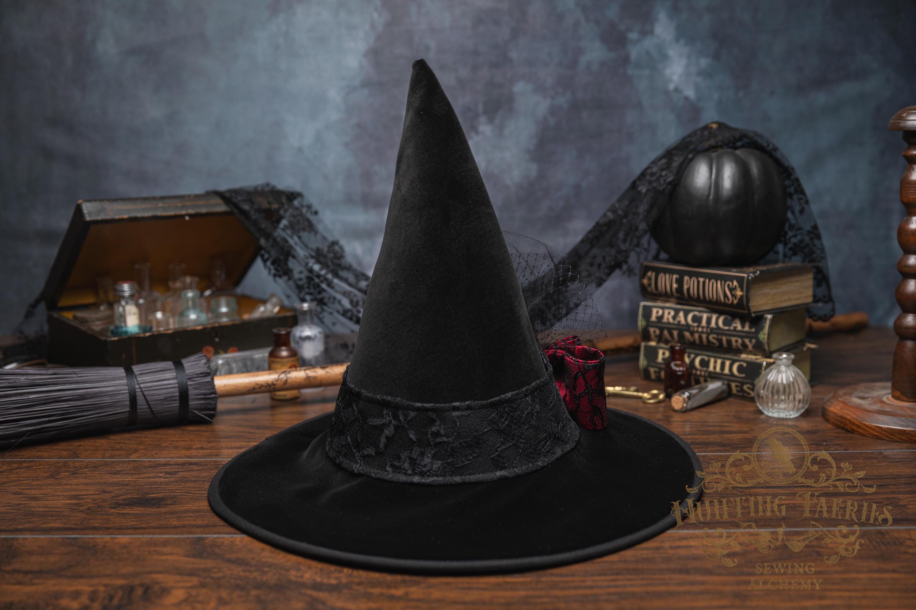 This witch hat is made from black velvet with a black lace band encircling a straight cone. The brim features three layers of magic stitched together and polished off with black bias tape. The underside and inside cone is black felt, which helps the hat maintain its shape, and it absorbs that extra moonlight as you fly through those October skies. The side of the hat is adorned with a red lace bow with a splash of tulle and veil netting. It is removable, allowing you to decorate it to suit your own personal style or change it up to match your witch ensemble.
