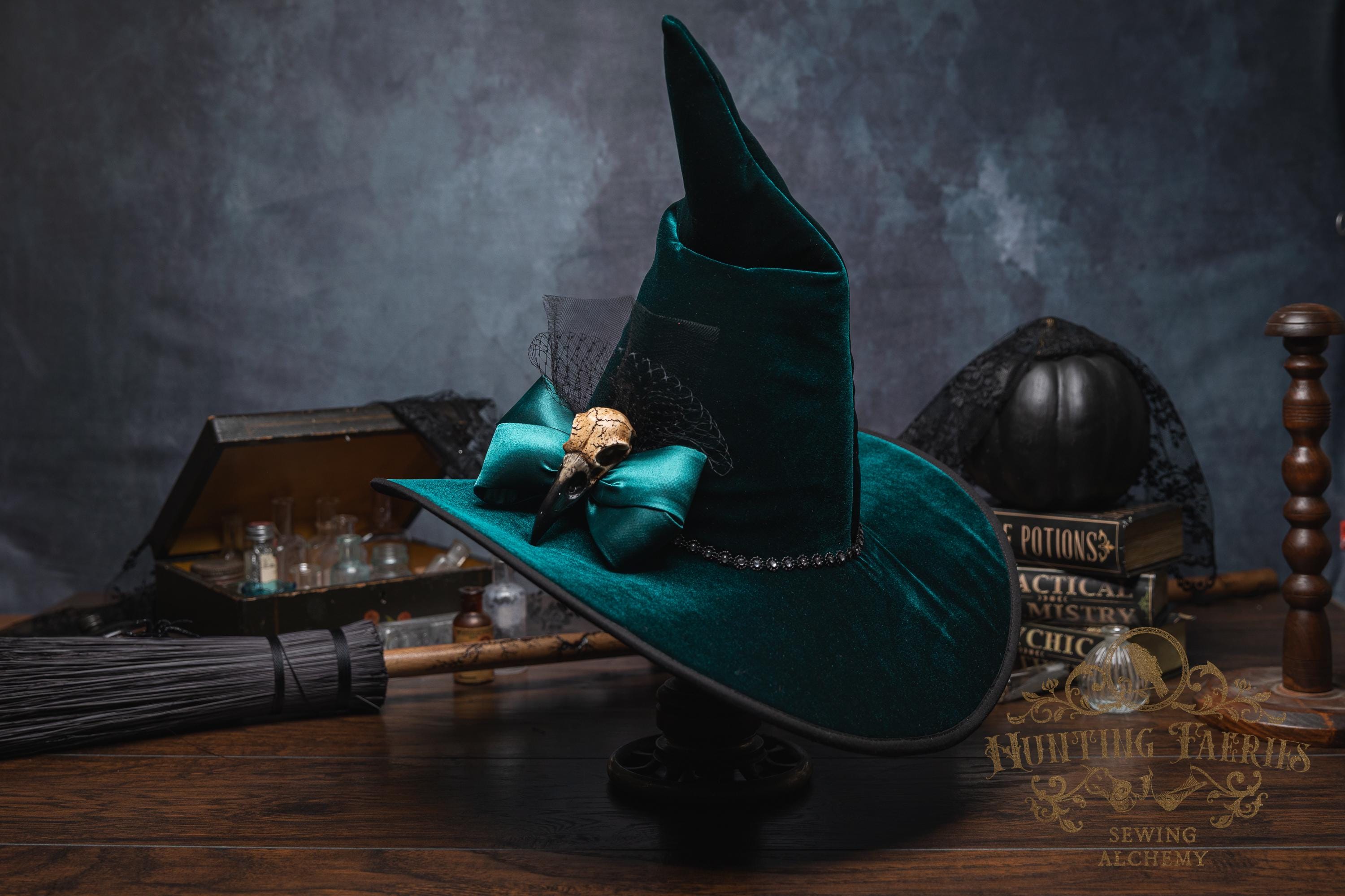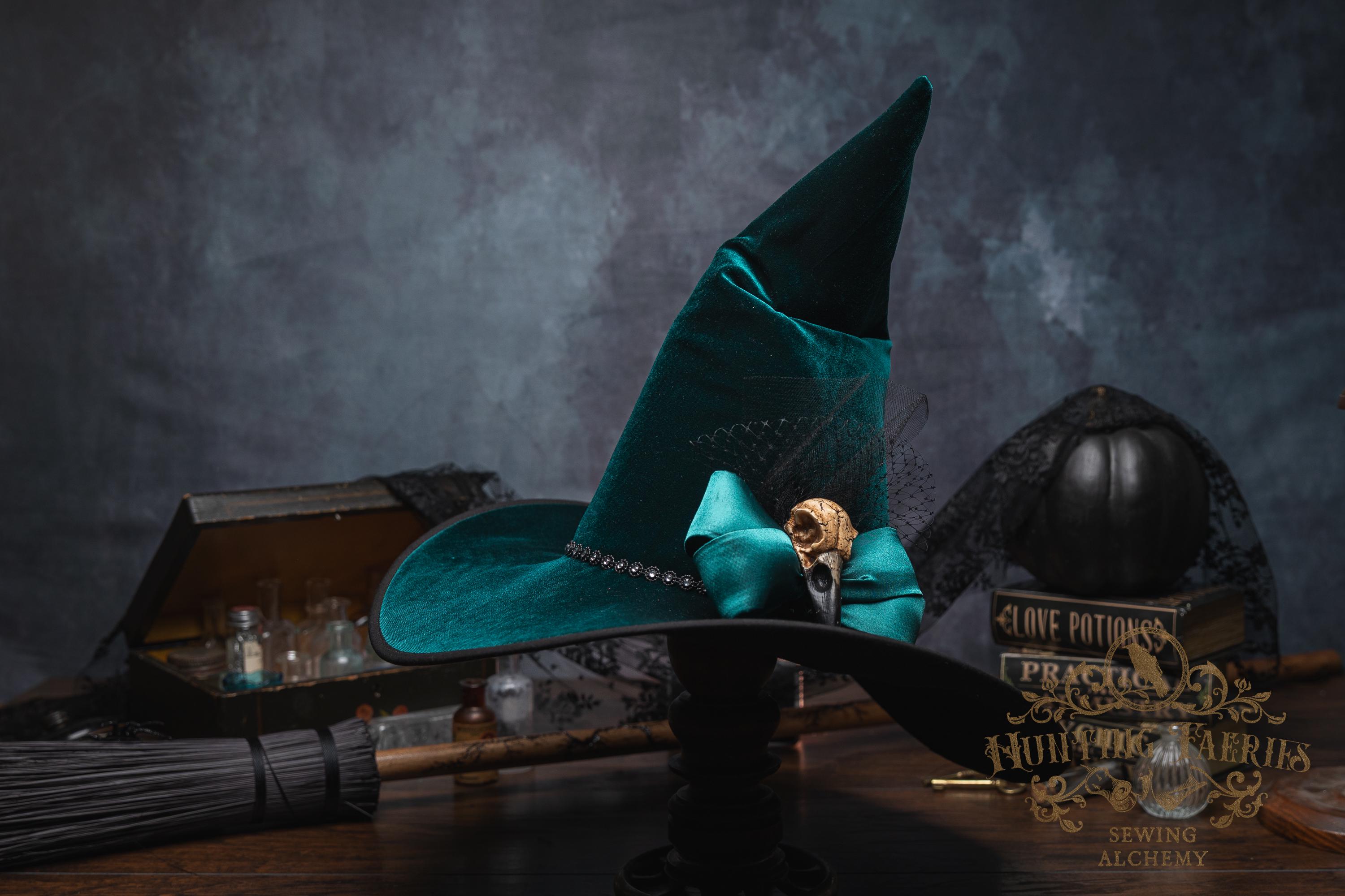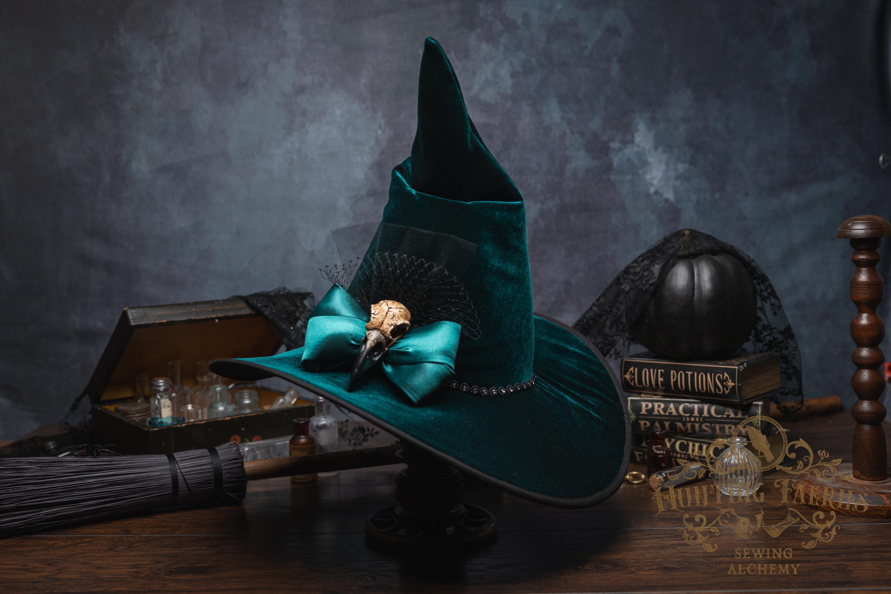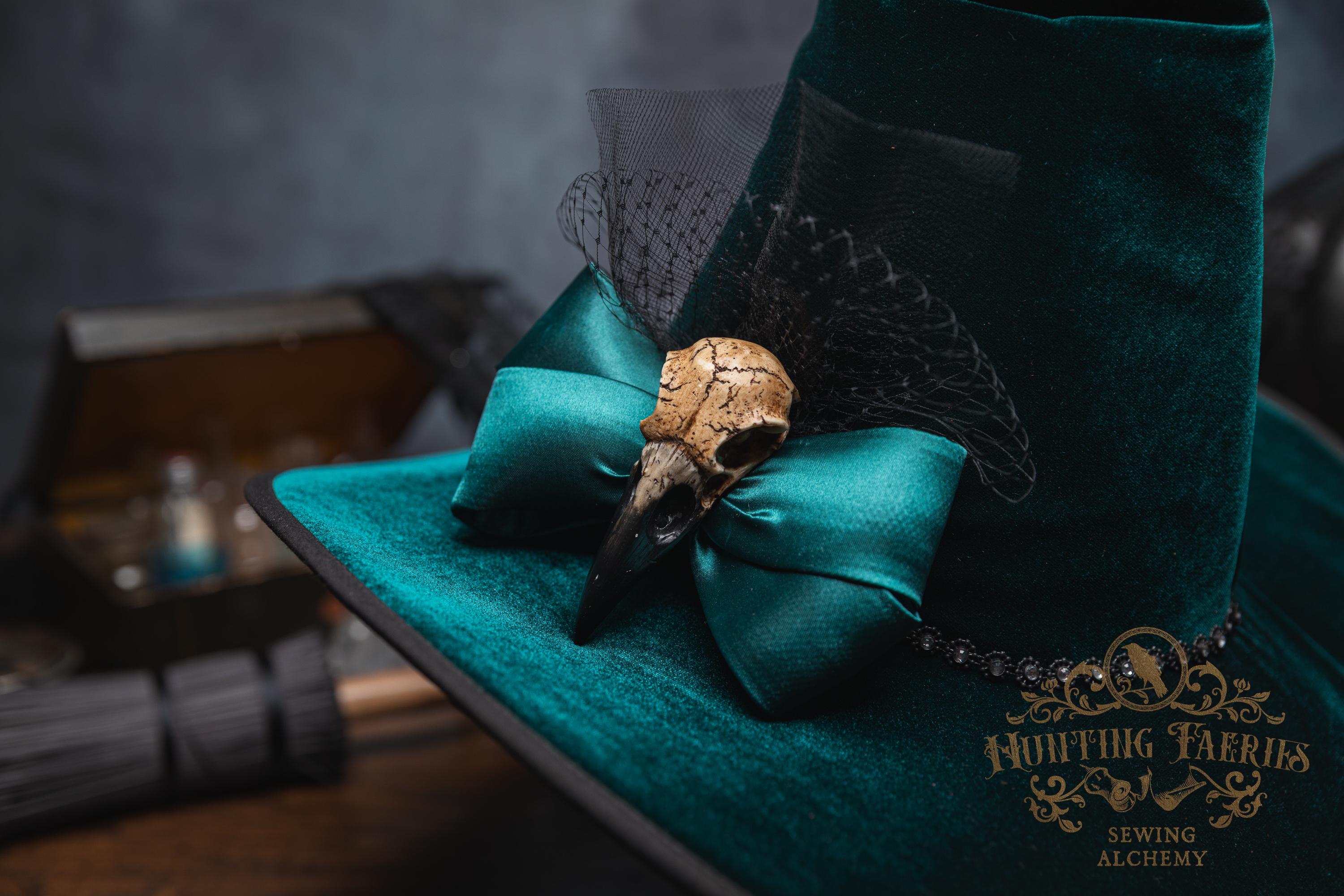 This witch hat is made from emerald green velvet with a black rhinestone band encircling a crooked cone. The brim features three layers of magic stitched together and polished off with black bias tape. The underside and inside cone is black felt, which helps the hat maintain its shape, and it absorbs that extra moonlight as you fly through those October skies. The side of the hat is adorned with a tone on tone green bow with a crow skull. It is removable, allowing you to decorate it to suit your own personal style or change it up to match your witch ensemble.