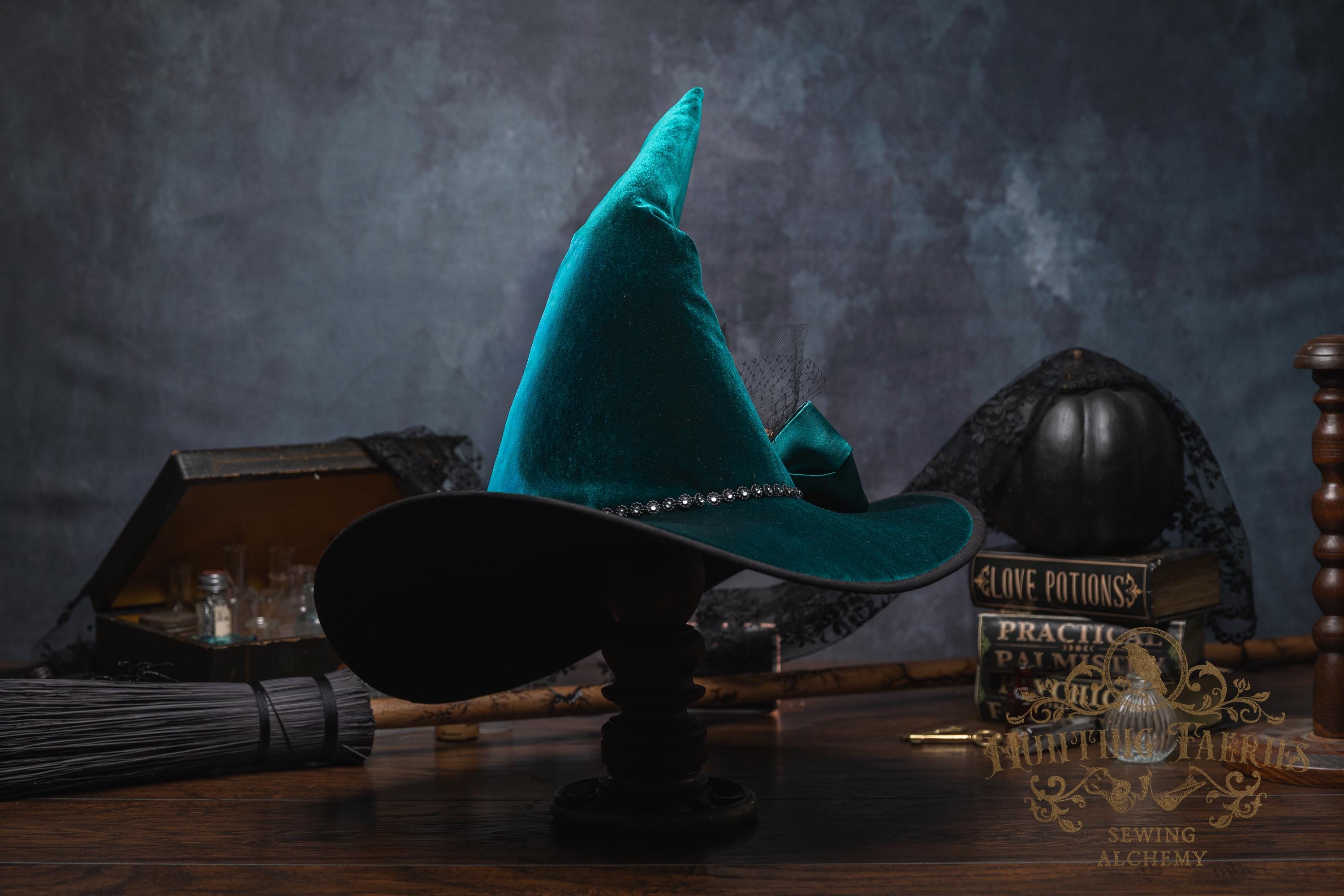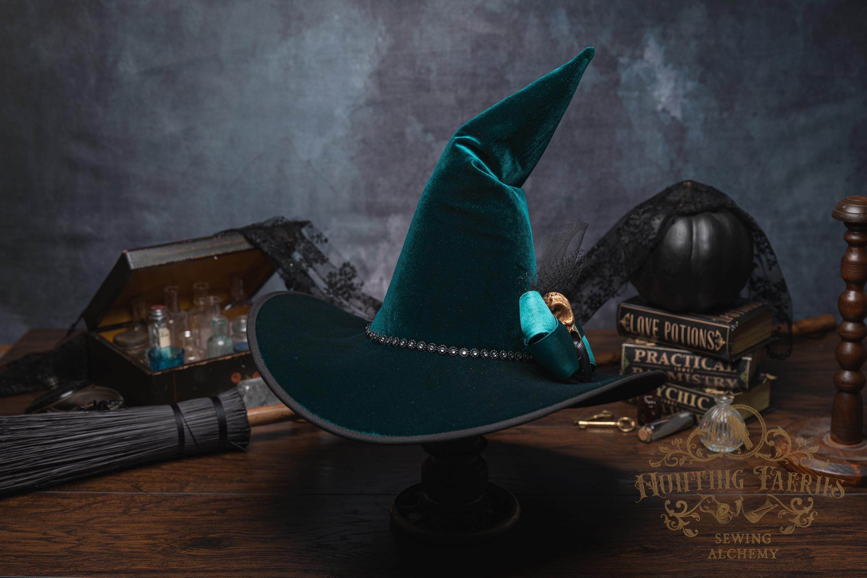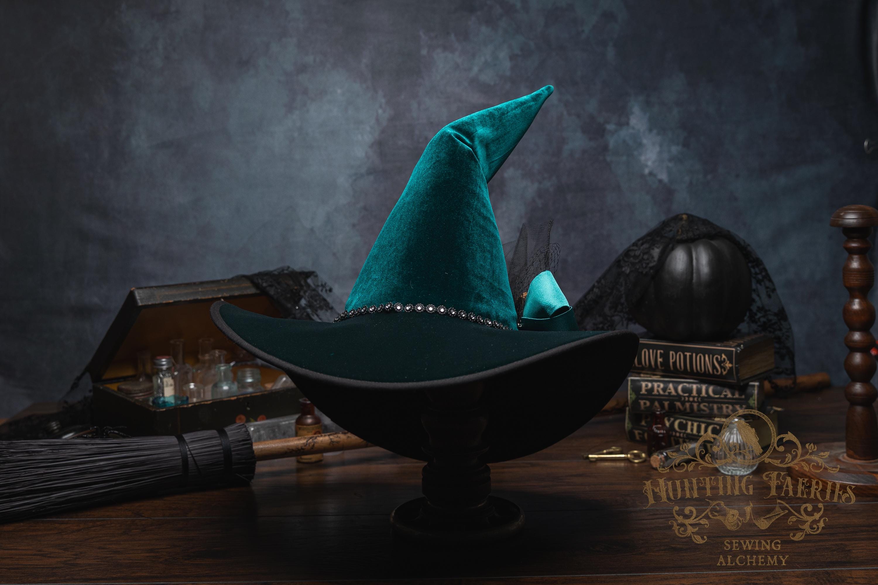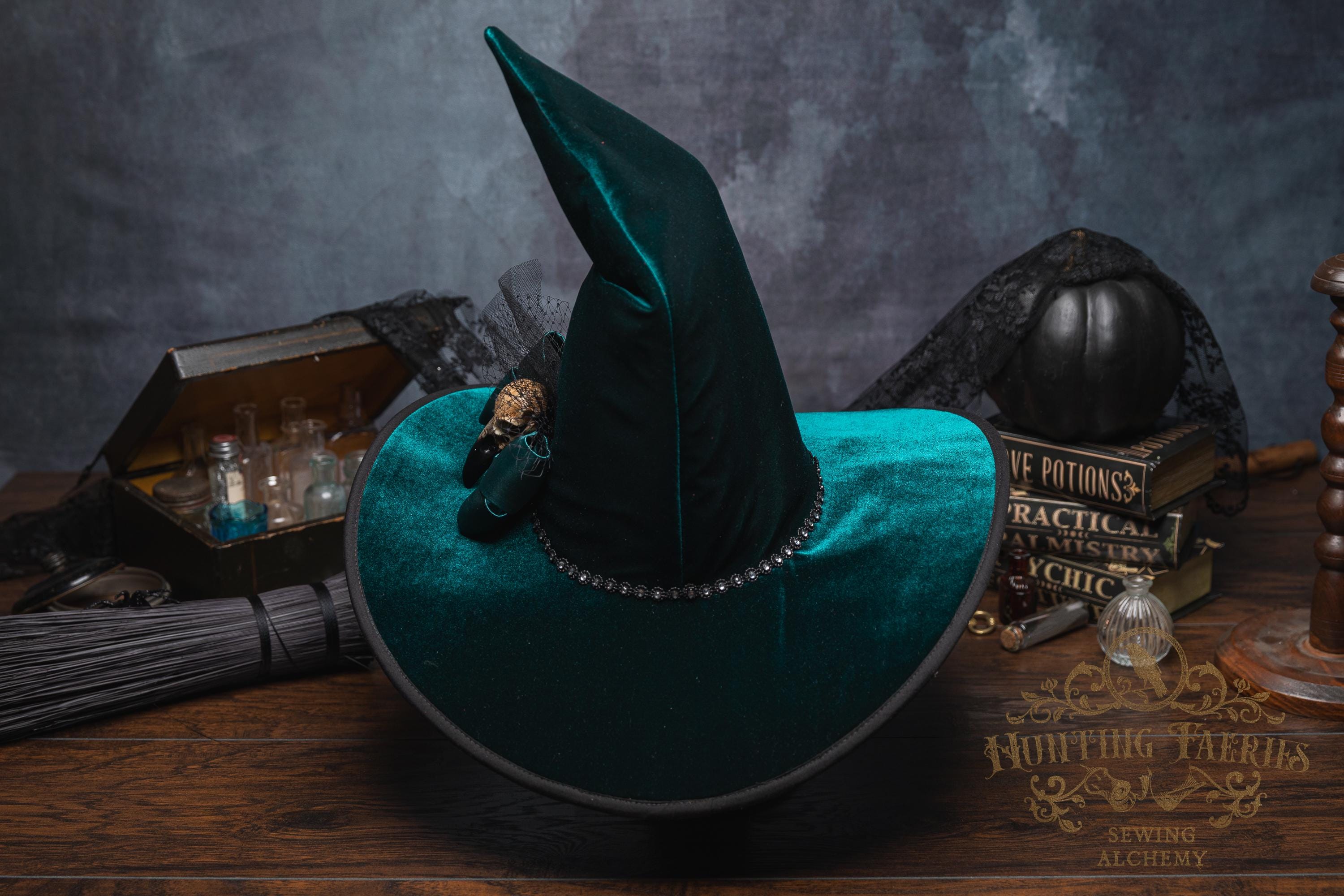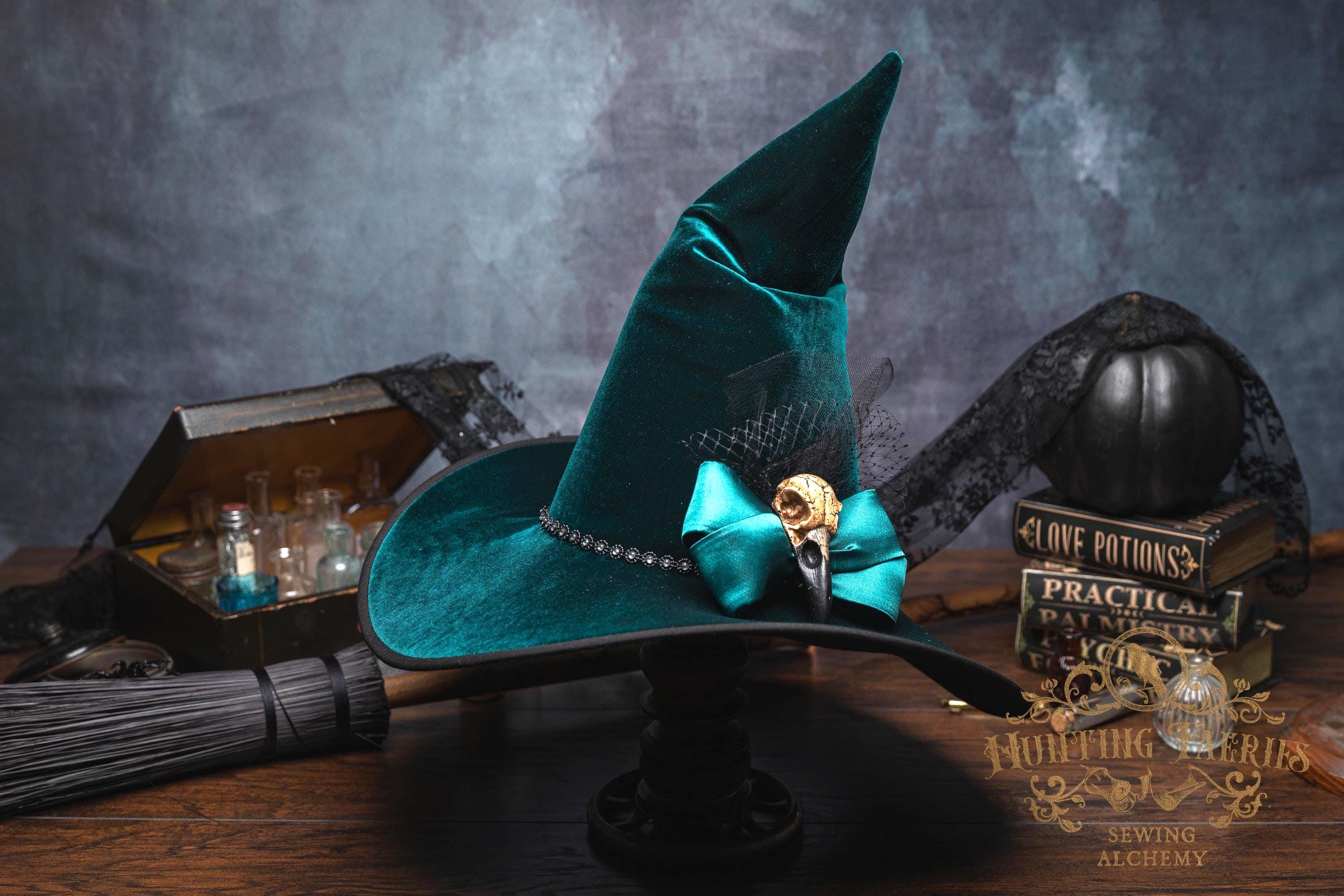 This witch hat is made from emerald green velvet with a black rhinestone band encircling a crooked cone. The brim features three layers of magic stitched together and polished off with black bias tape. The underside and inside cone is black felt, which helps the hat maintain its shape, and it absorbs that extra moonlight as you fly through those October skies. The side of the hat is adorned with a tone on tone green bow with a crow skull. It is removable, allowing you to decorate it to suit your own personal style or change it up to match your witch ensemble.