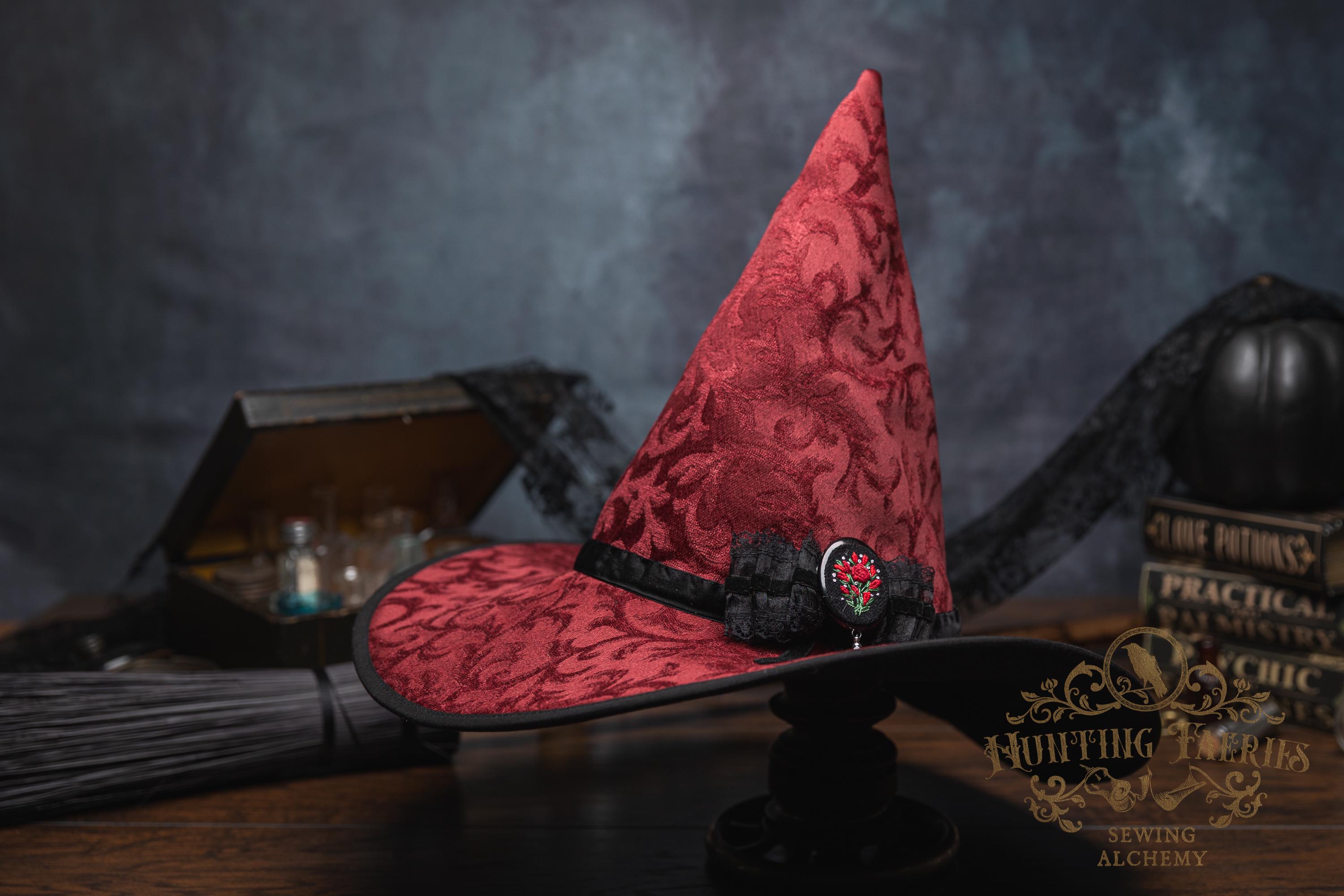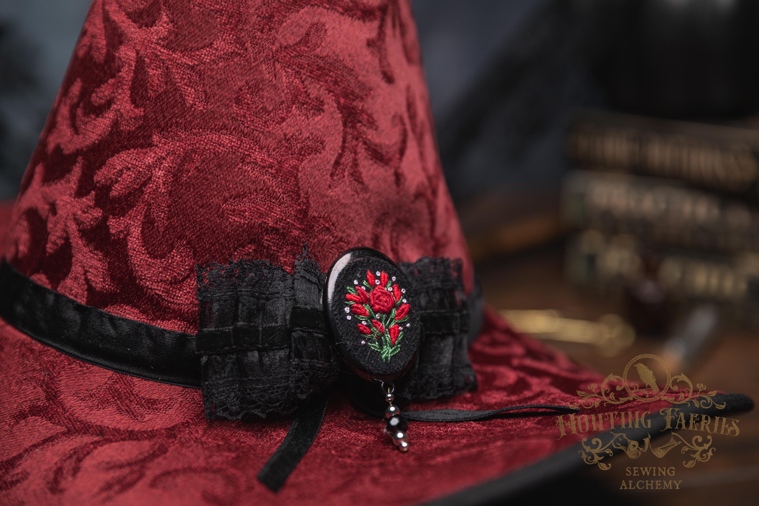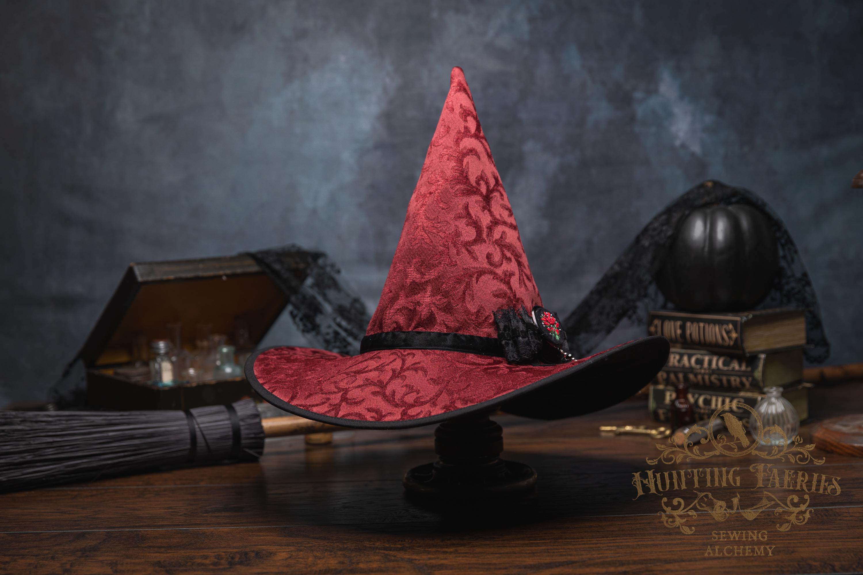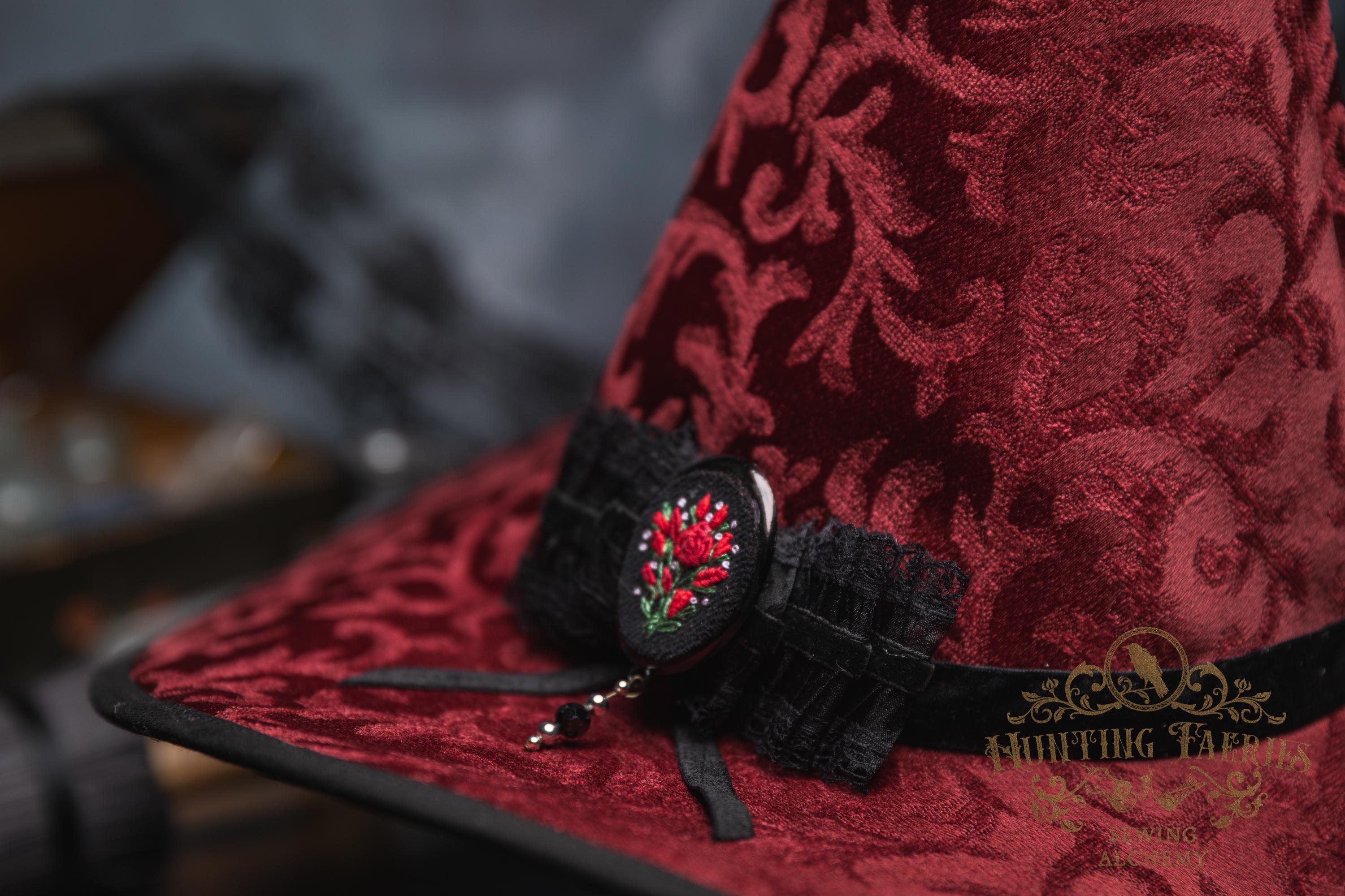This witch hat is made from a floral scrolled burgundy fabric with a blak velvet band encircling a pointy cone. The brim features three layers of magic stitched together and polished off with black bias tape. The underside and inside cone is black felt, which helps the hat maintain its shape, and it absorbs that extra moonlight as you fly through those October skies. The side of the hat is adorned with a black bow and a hand-embroidered pin. It is removable, allowing you to decorate it yourself or change it up to suit your full witch ensemble.