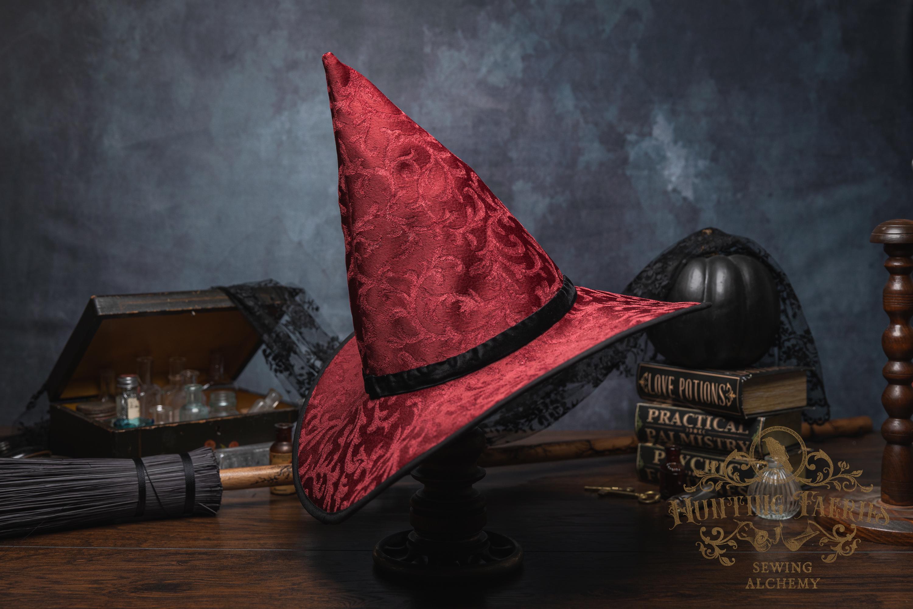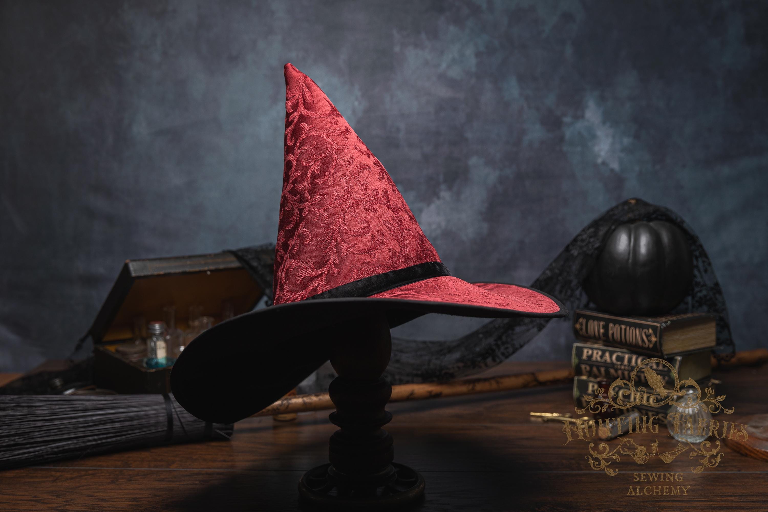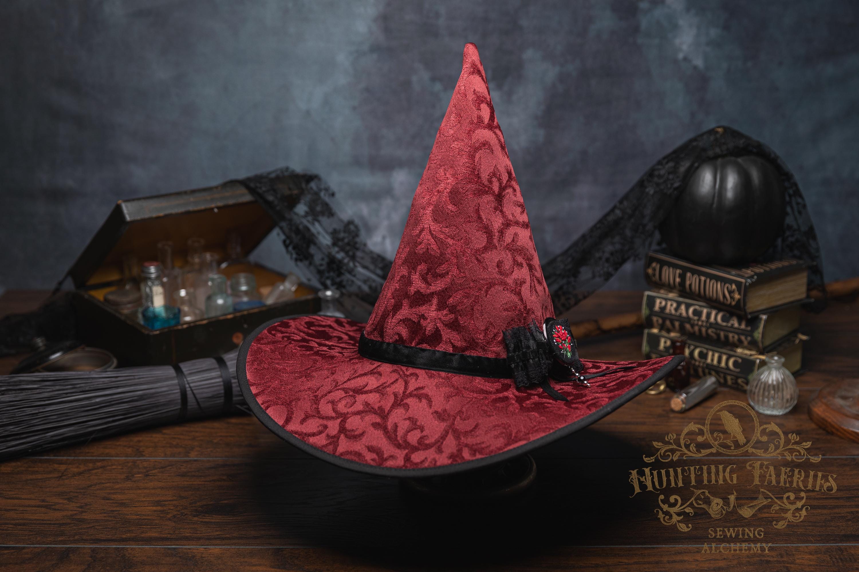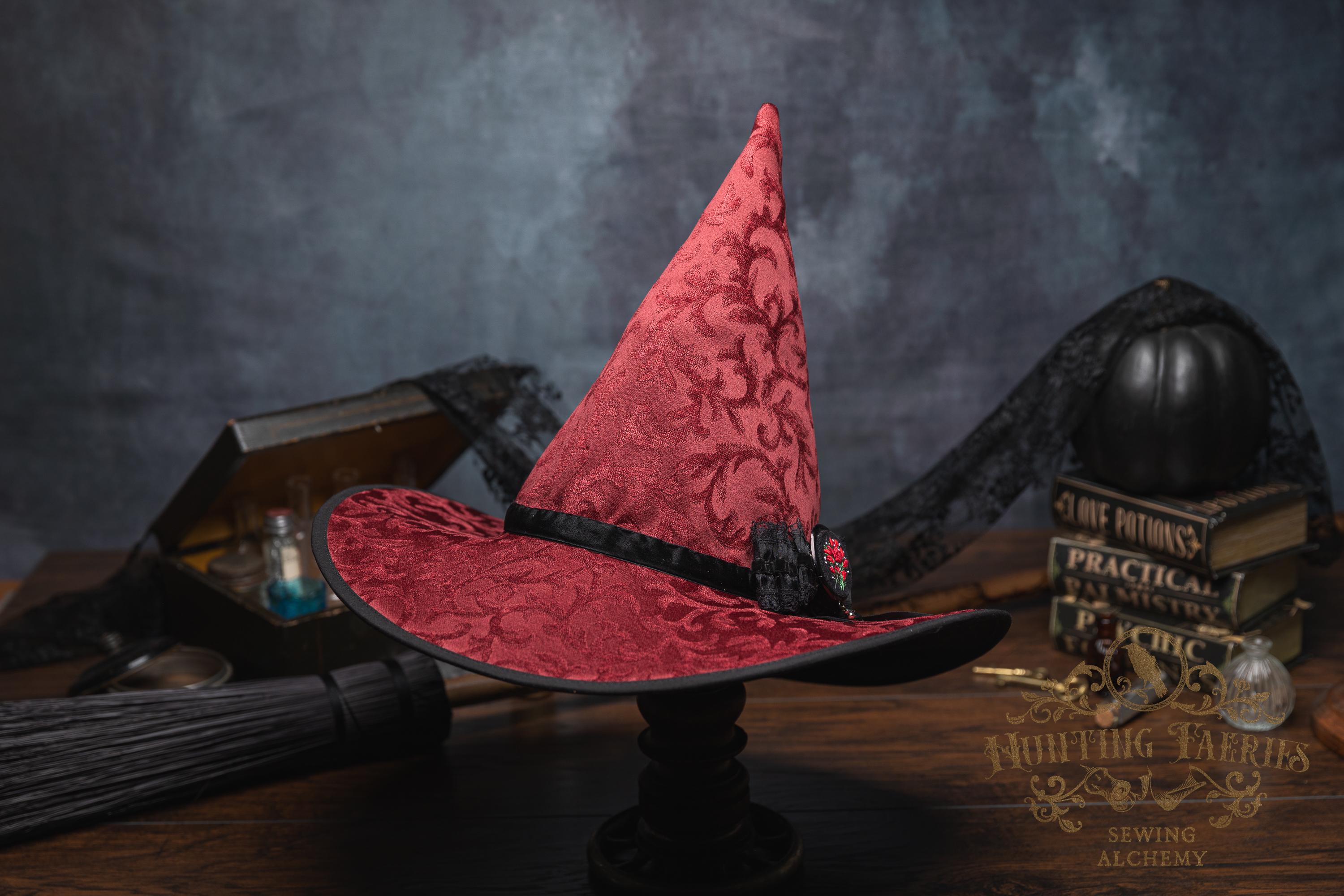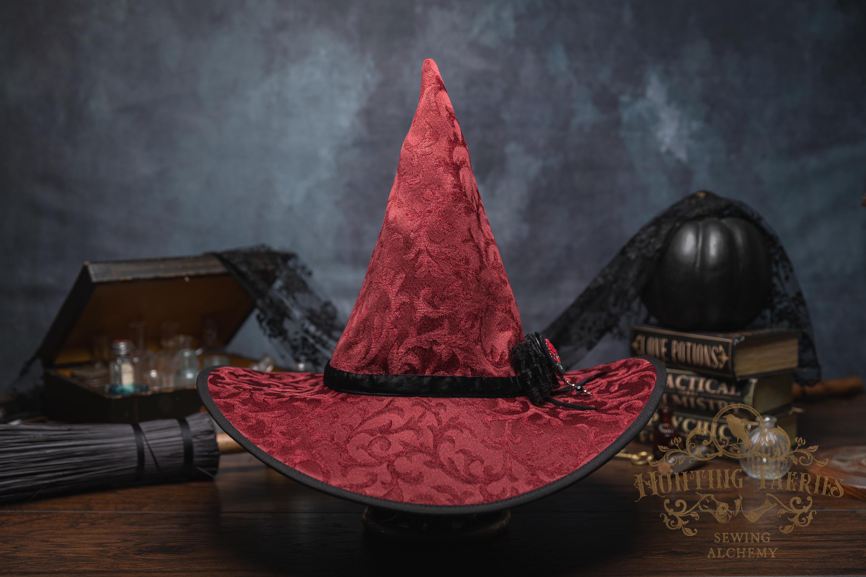 This witch hat is made from a floral scrolled burgundy fabric with a blak velvet band encircling a pointy cone. The brim features three layers of magic stitched together and polished off with black bias tape. The underside and inside cone is black felt, which helps the hat maintain its shape, and it absorbs that extra moonlight as you fly through those October skies. The side of the hat is adorned with a black bow and a hand-embroidered pin. It is removable, allowing you to decorate it yourself or change it up to suit your full witch ensemble.