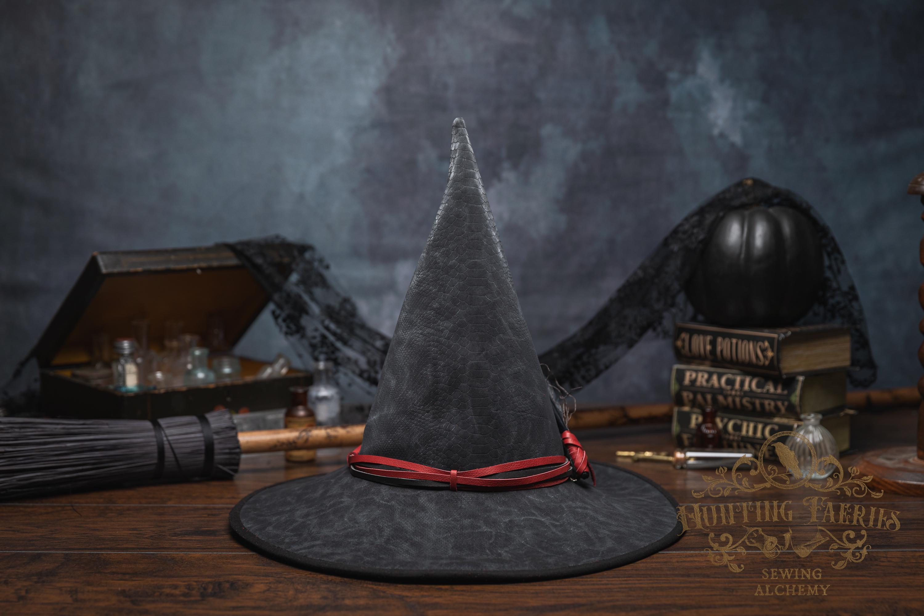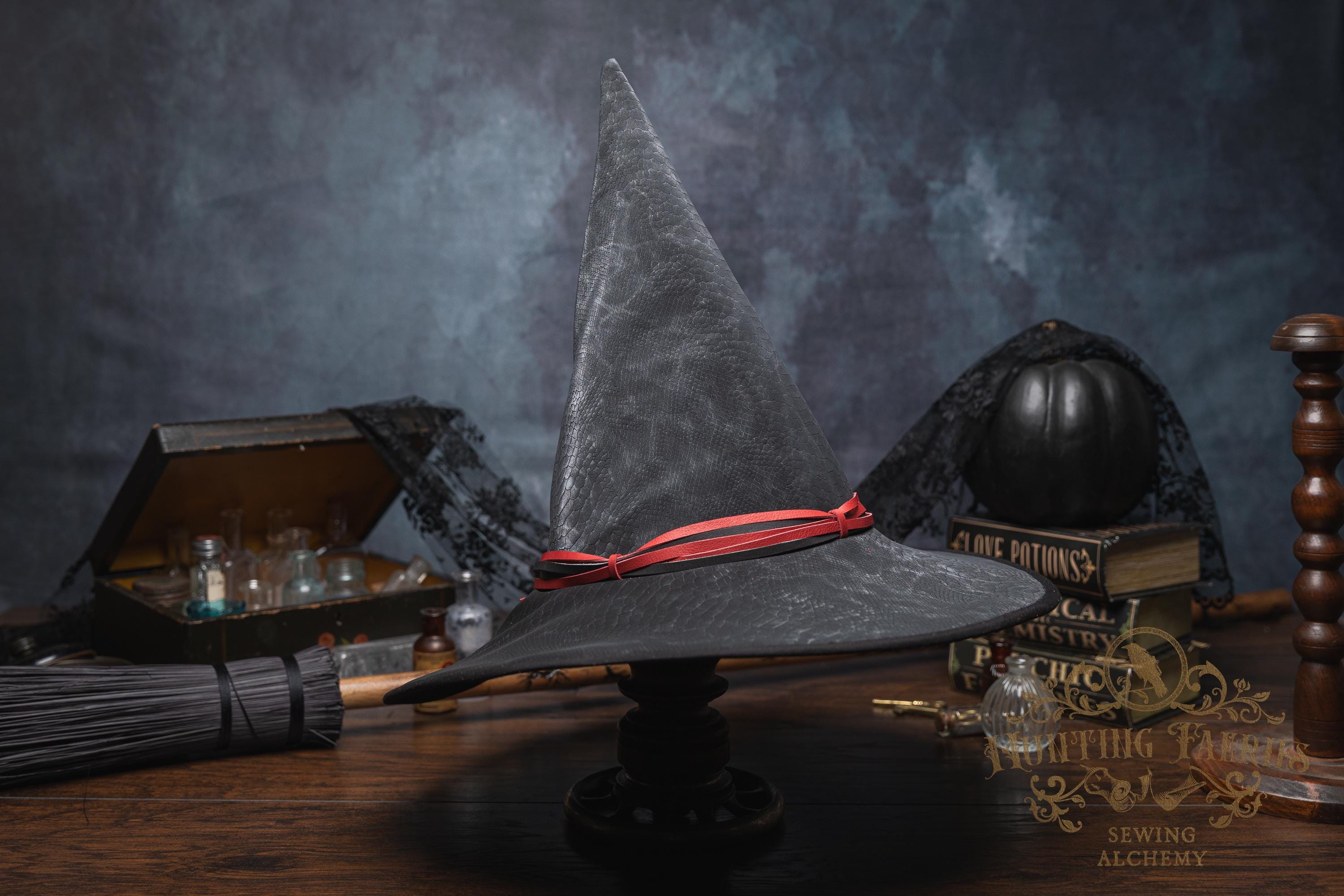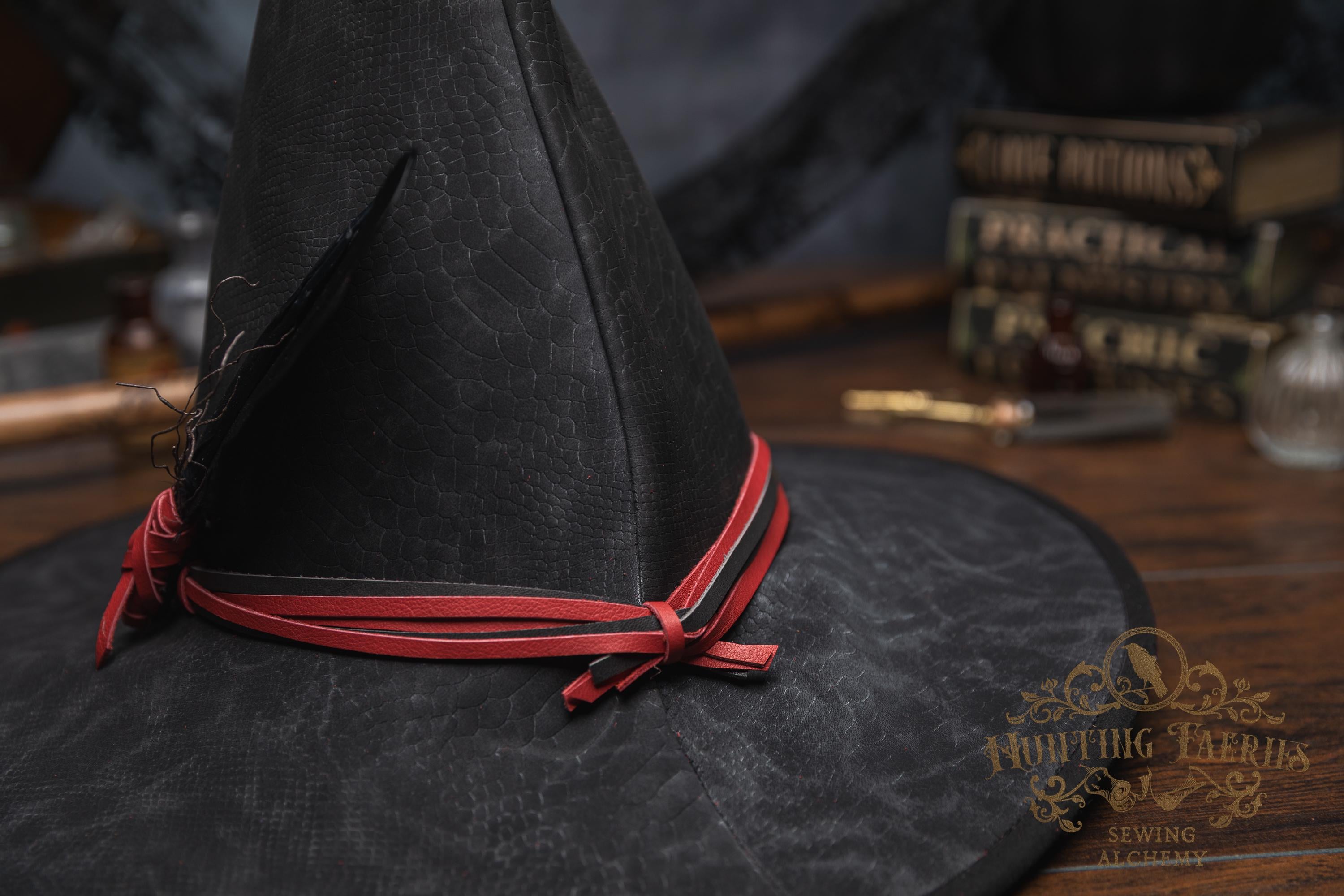 This witch hat is made from grey faux snake skin fabric with leather strips encircling a pointy cone. The brim features three layers of magic stitched together and polished off with black bias tape. The underside and inside cone is black felt, which helps the hat maintain its shape, and it absorbs that extra moonlight as you fly through those October skies. The side of the hat is adorned with black feathers bound with a red leather strip. It is removable, allowing you to decorate it for yourself or change it up to suit your full witch ensemble.
