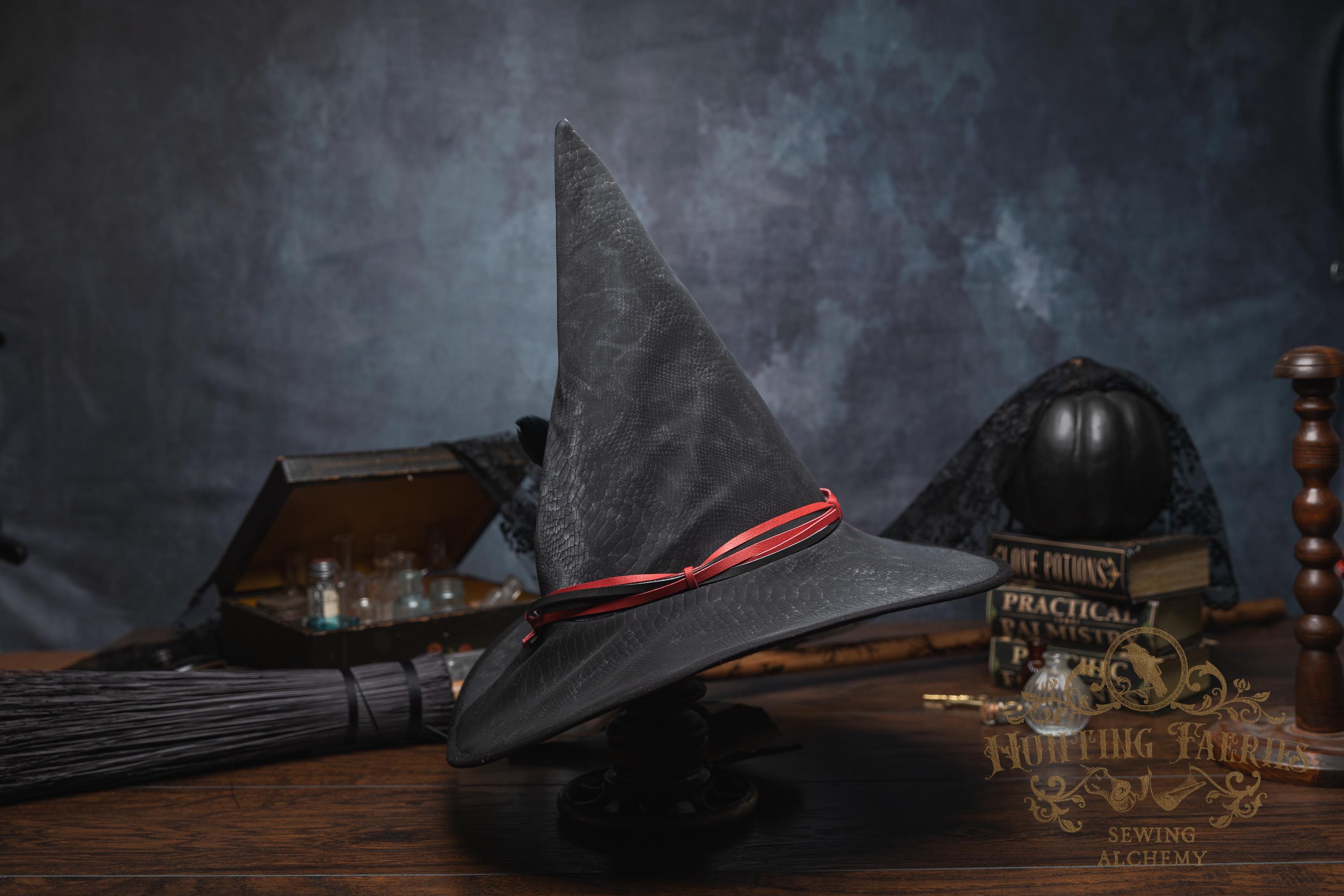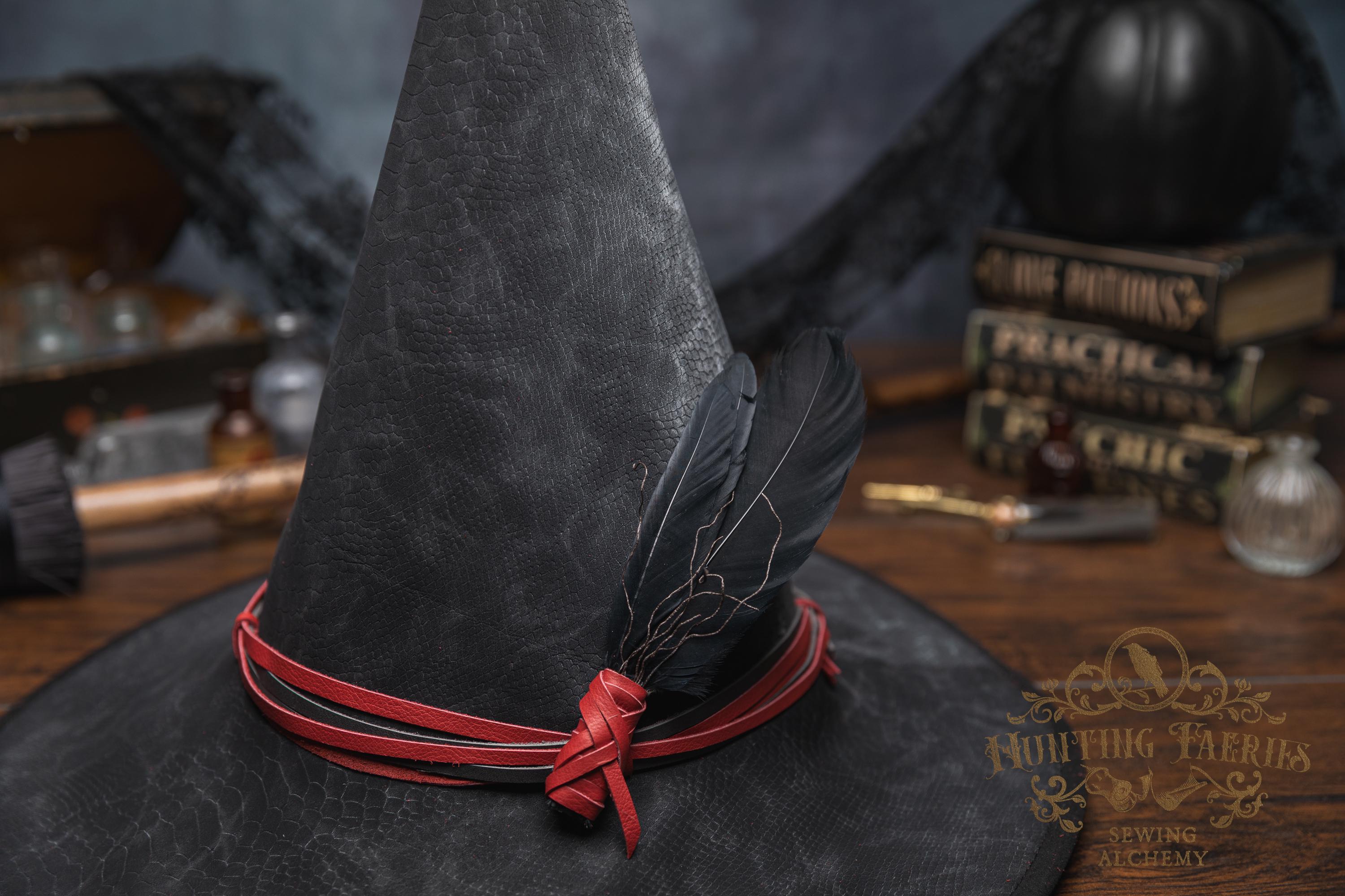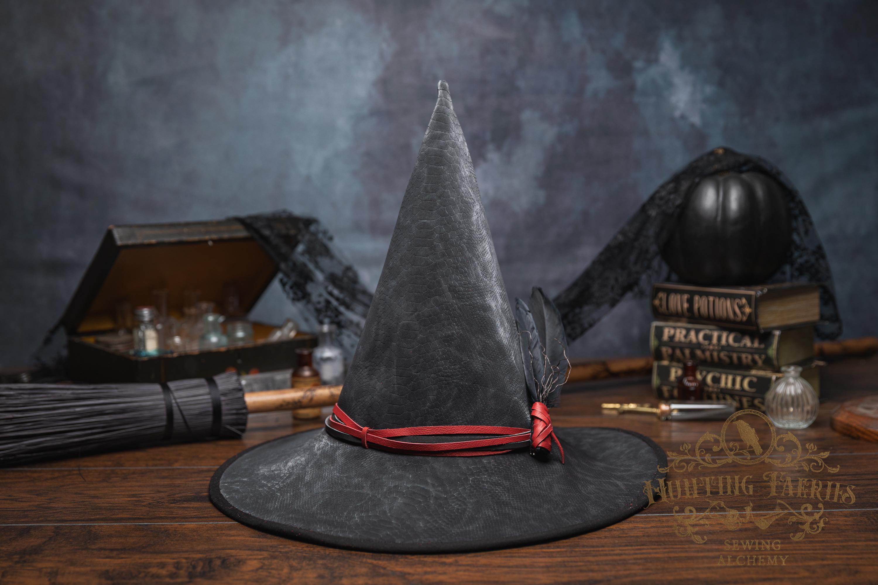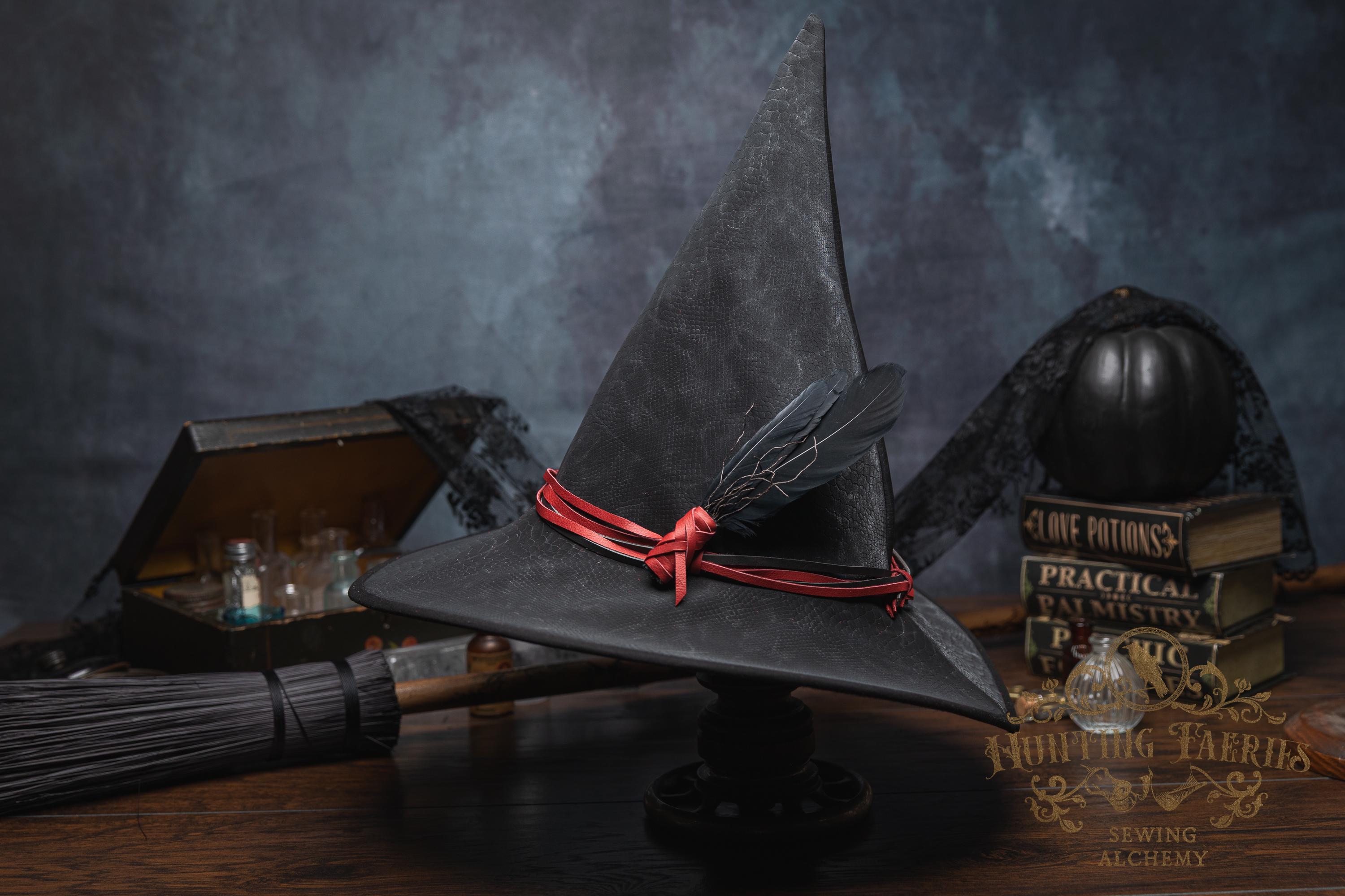 This witch hat is made from grey faux snake skin fabric with leather strips encircling a pointy cone. The brim features three layers of magic stitched together and polished off with black bias tape. The underside and inside cone is black felt, which helps the hat maintain its shape, and it absorbs that extra moonlight as you fly through those October skies. The side of the hat is adorned with black feathers bound with a red leather strip. It is removable, allowing you to decorate it for yourself or change it up to suit your full witch ensemble.