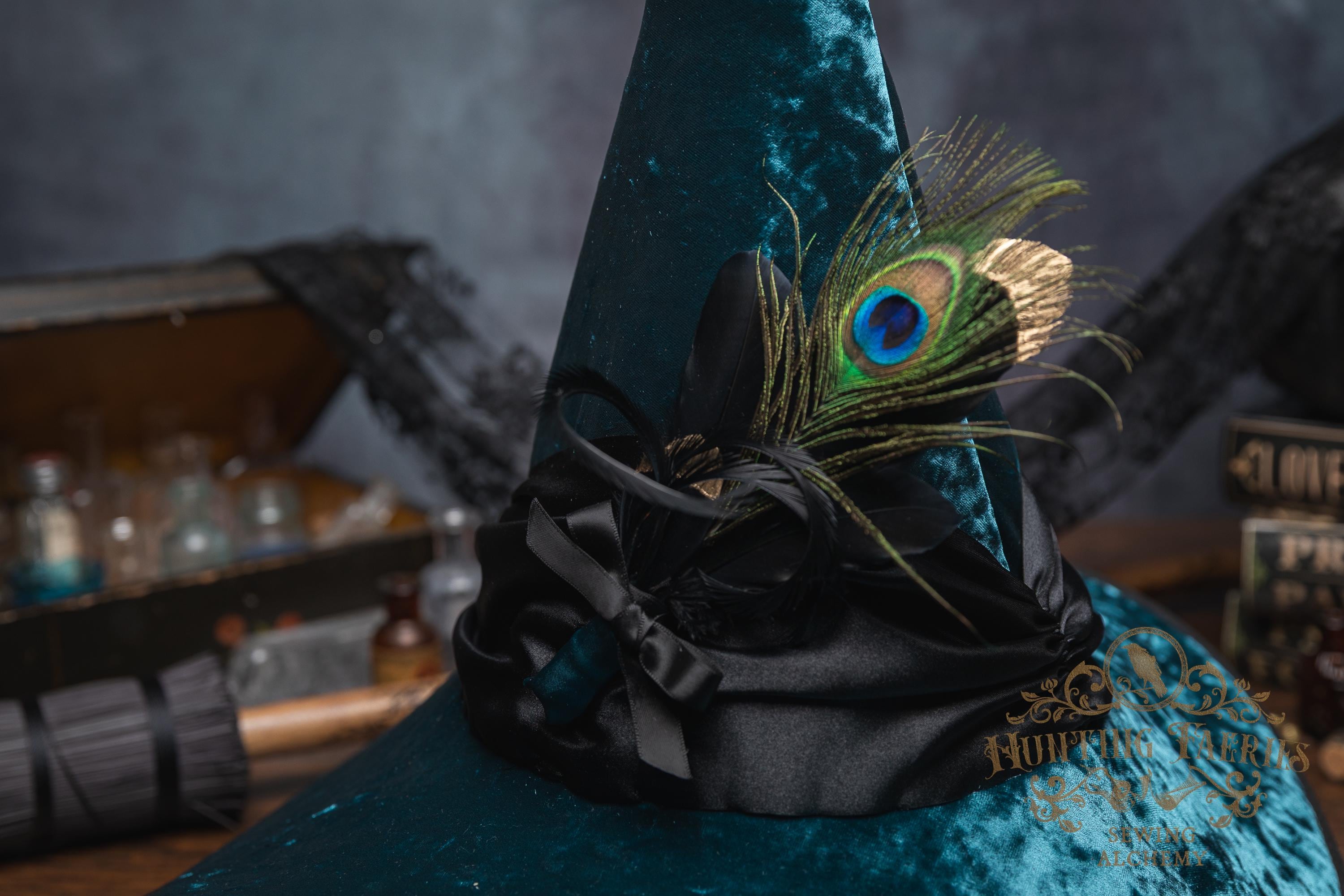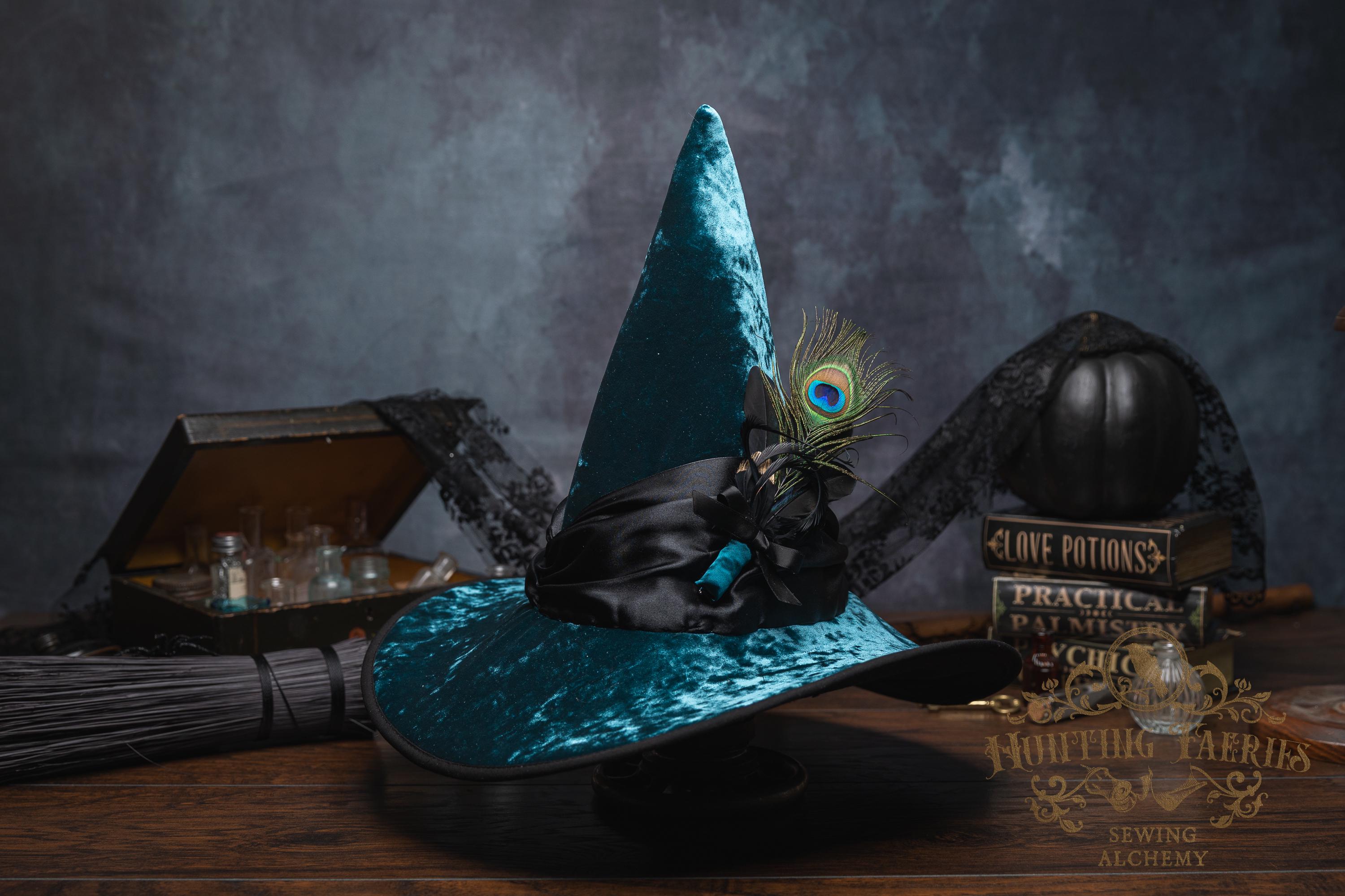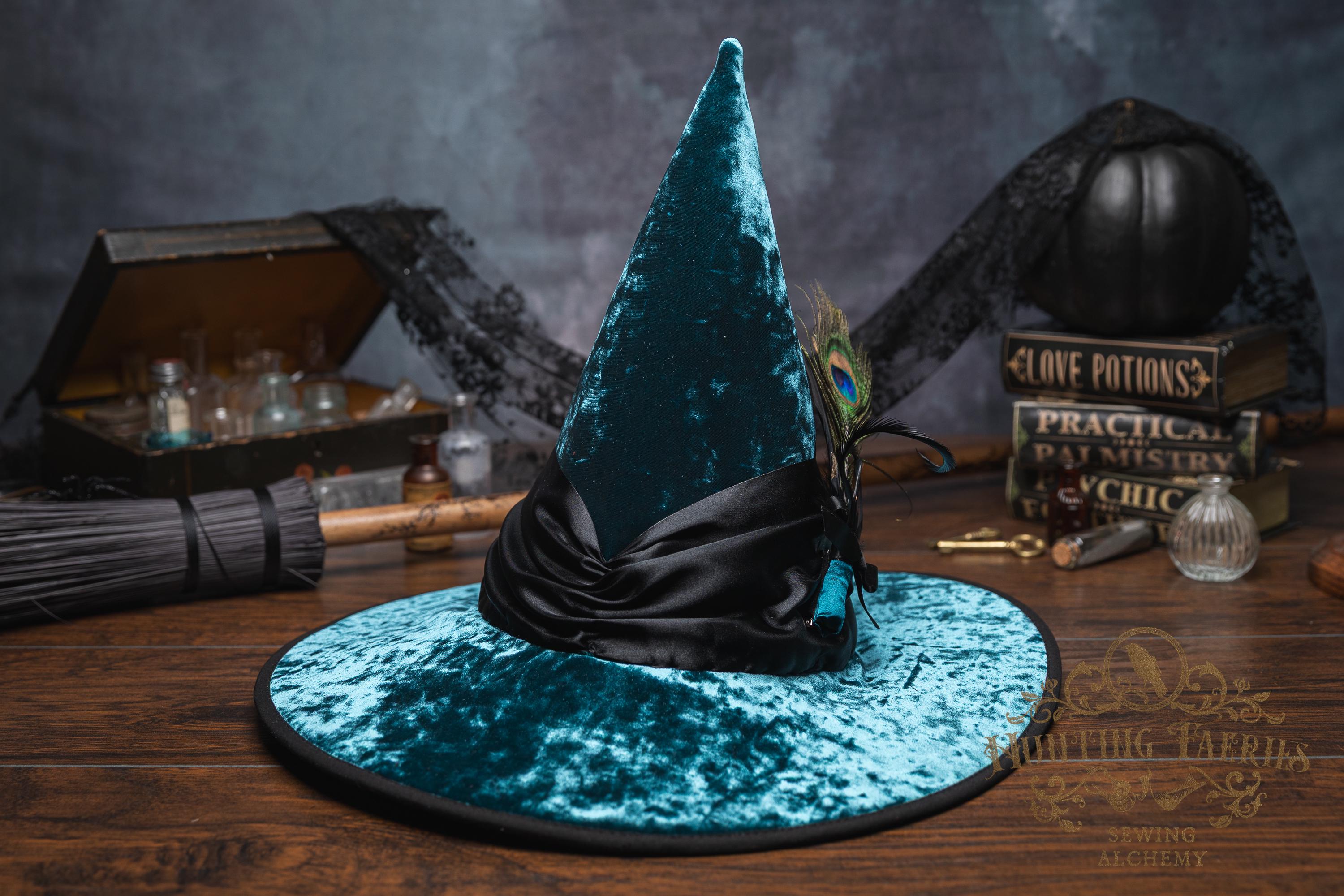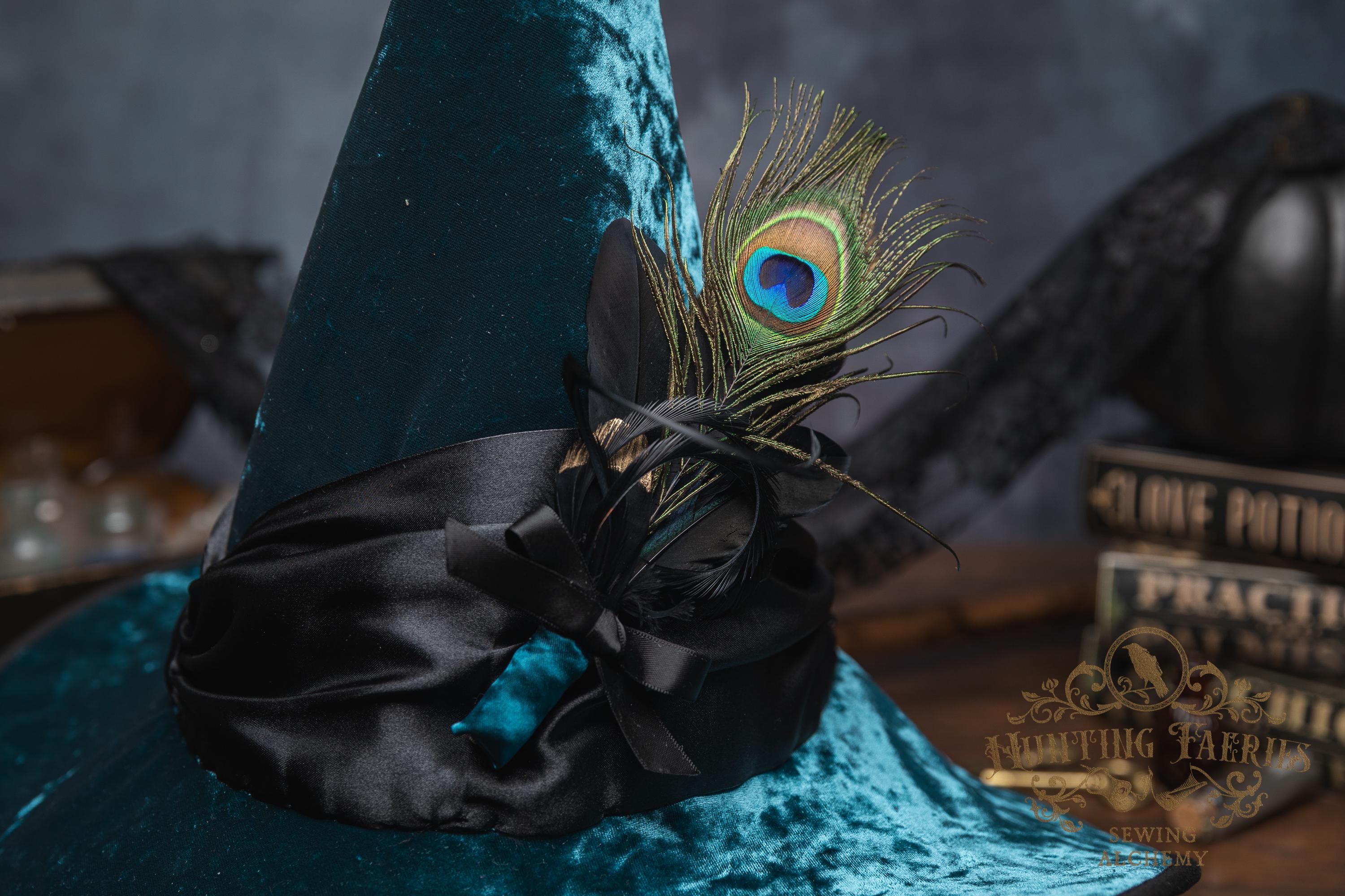 This witch hat is made from crushed turquoise velvet with a black ruched satin band encircling a pointy cone. The brim features three layers of magic stitched together and polished off with black bias tape. The underside and inside cone is black felt, which helps the hat maintain its shape, and it absorbs that extra moonlight as you fly through those October skies. The side of the hat is adorned with a peacock feather wrapped at the bottom with turquoise satin. It is removable, allowing you to decorate it for yourself or change it up to suit your full witch ensemble.