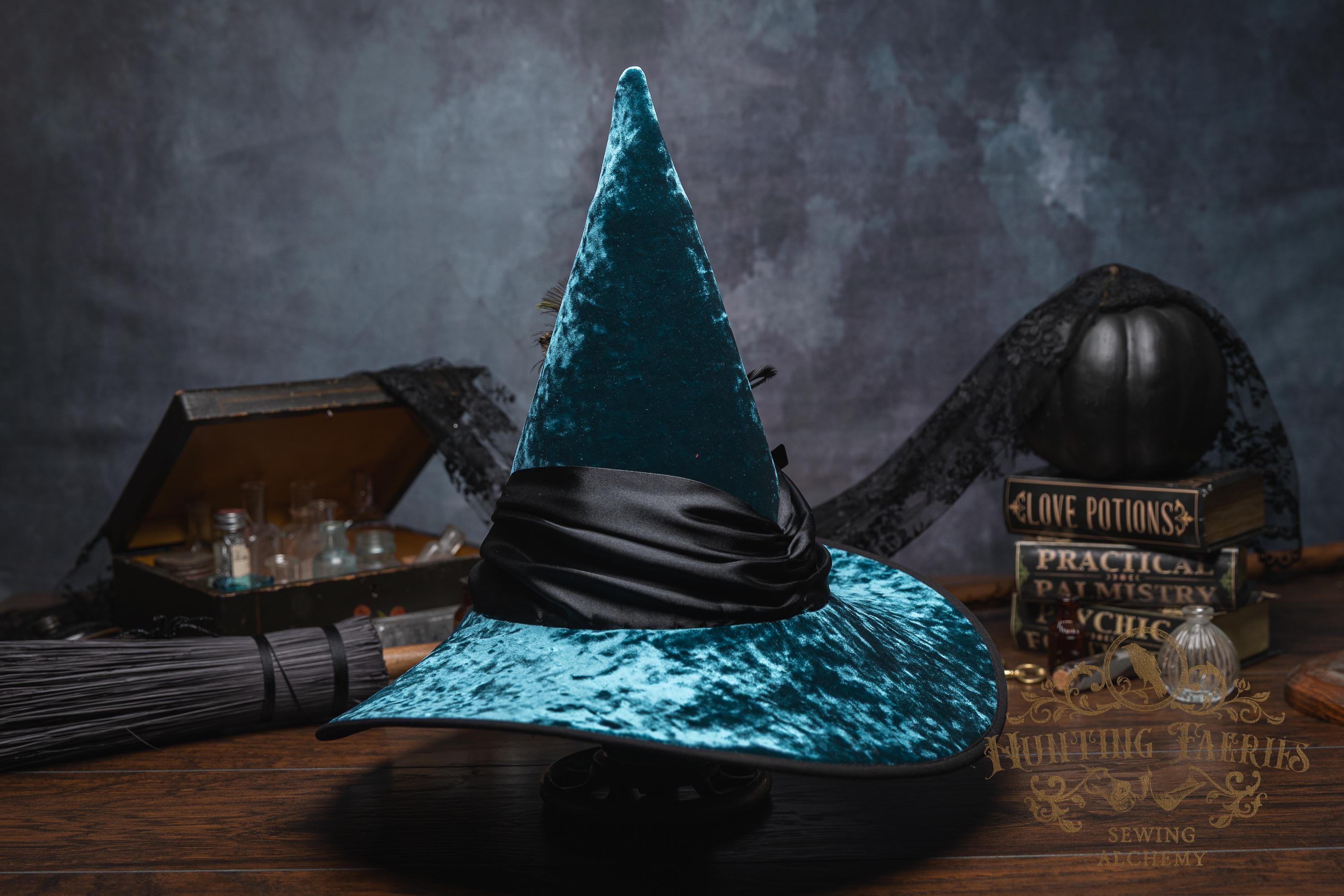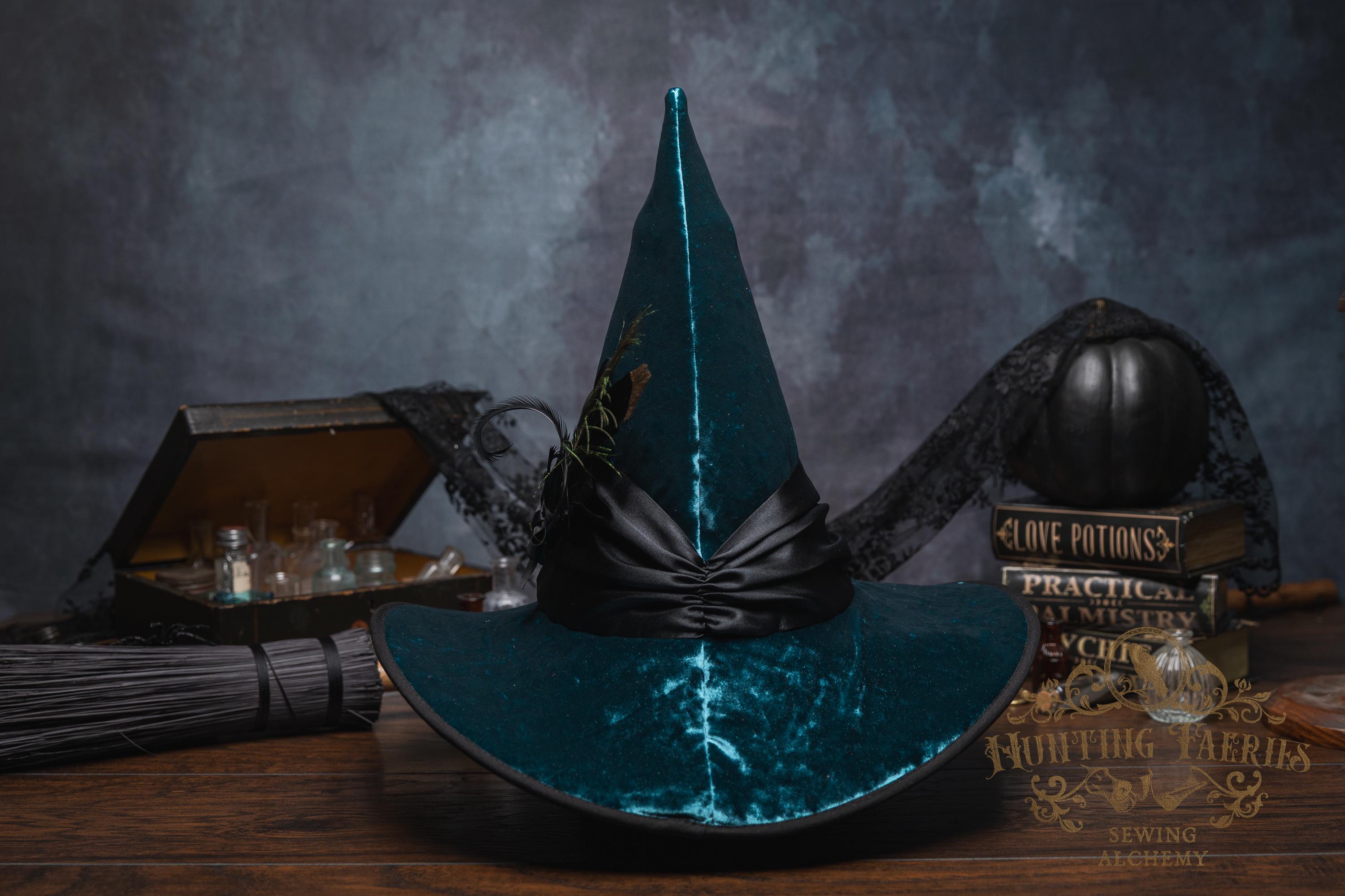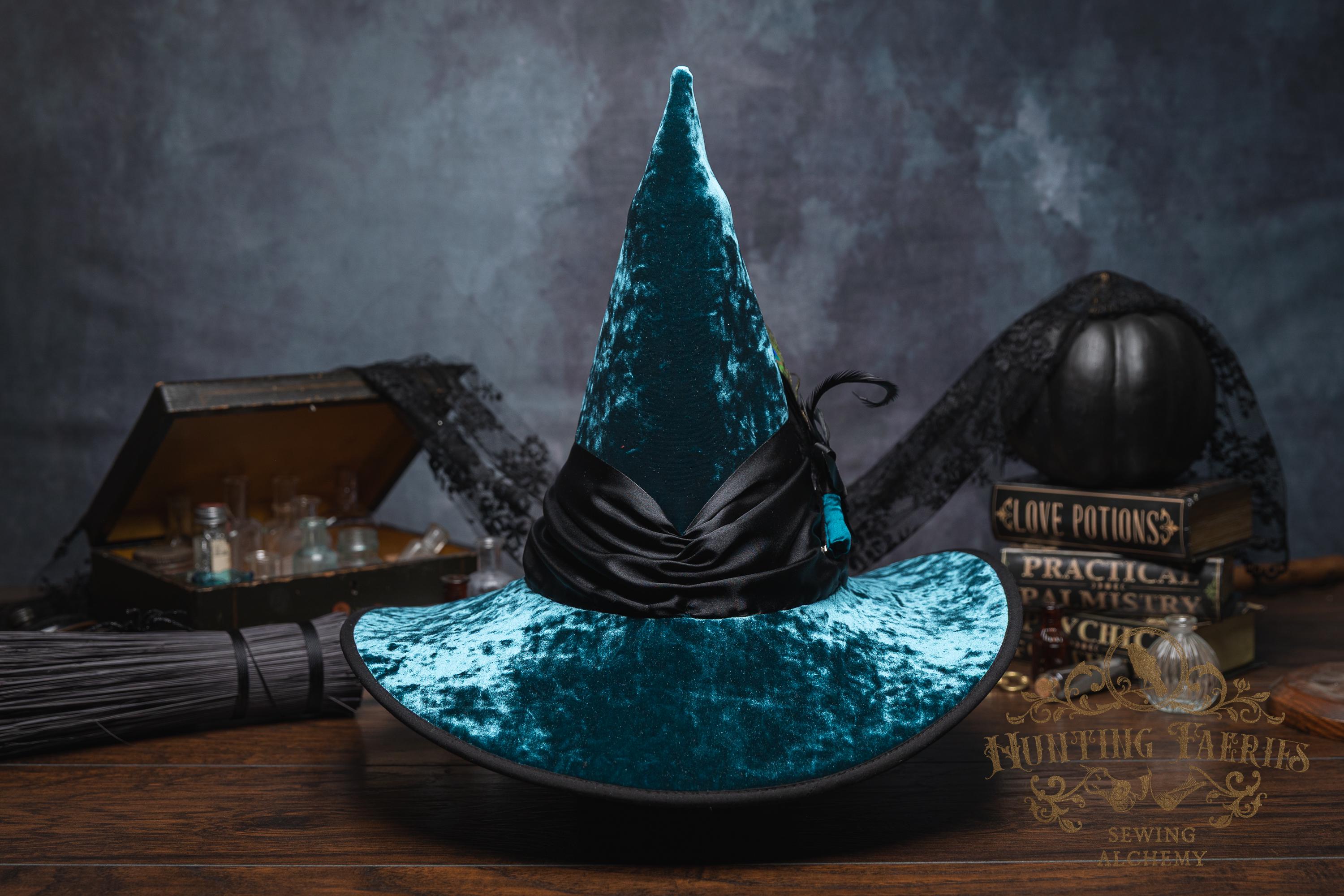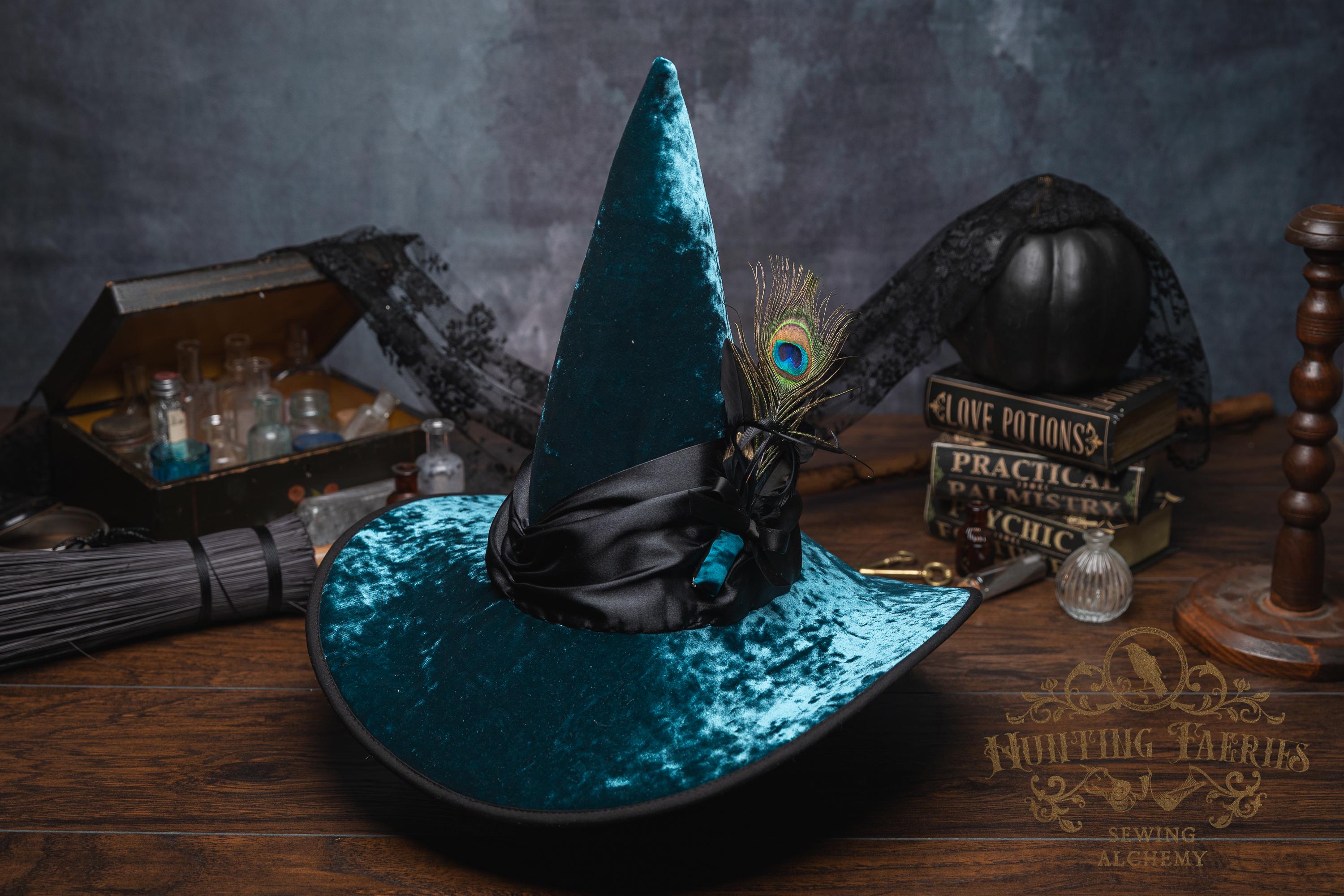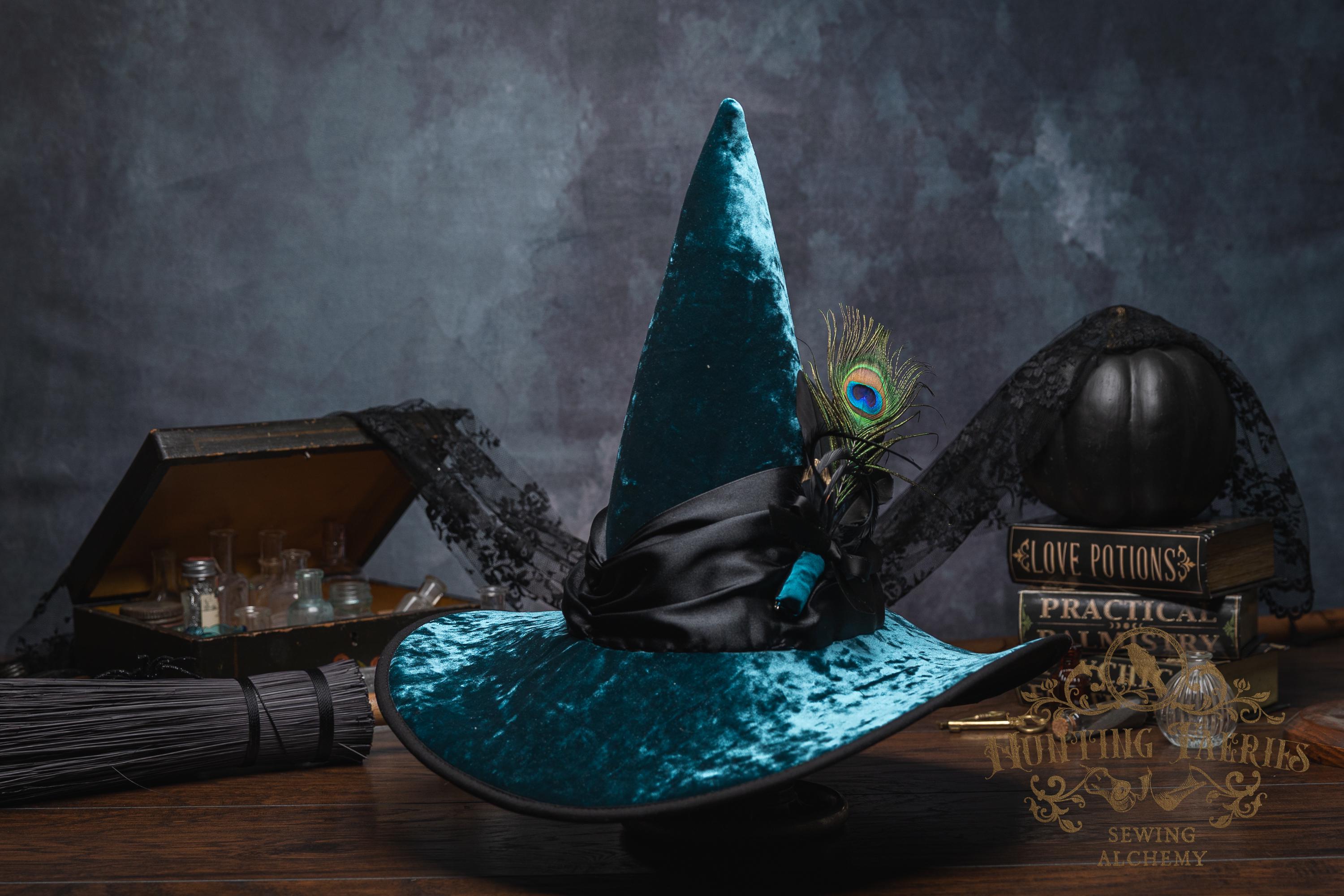 This witch hat is made from crushed turquoise velvet with a black ruched satin band encircling a pointy cone. The brim features three layers of magic stitched together and polished off with black bias tape. The underside and inside cone is black felt, which helps the hat maintain its shape, and it absorbs that extra moonlight as you fly through those October skies. The side of the hat is adorned with a peacock feather wrapped at the bottom with turquoise satin. It is removable, allowing you to decorate it for yourself or change it up to suit your full witch ensemble.