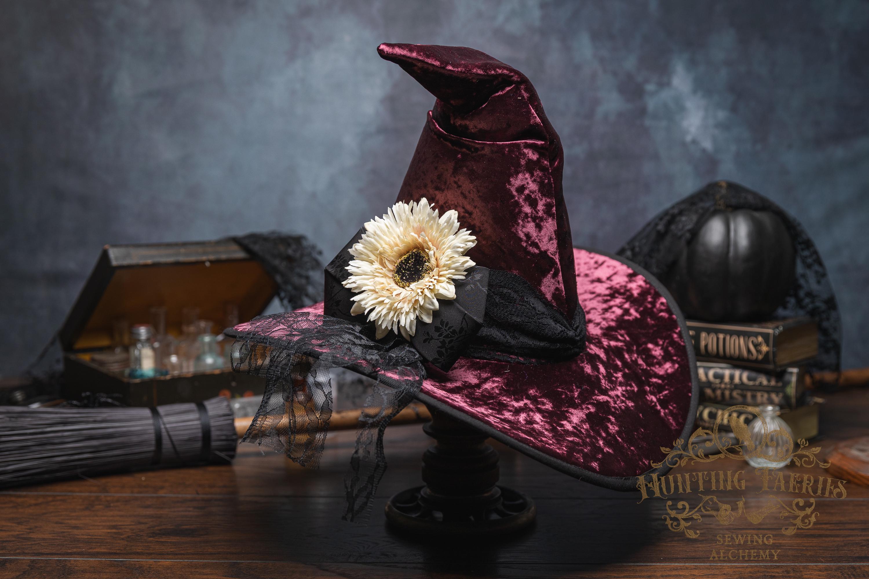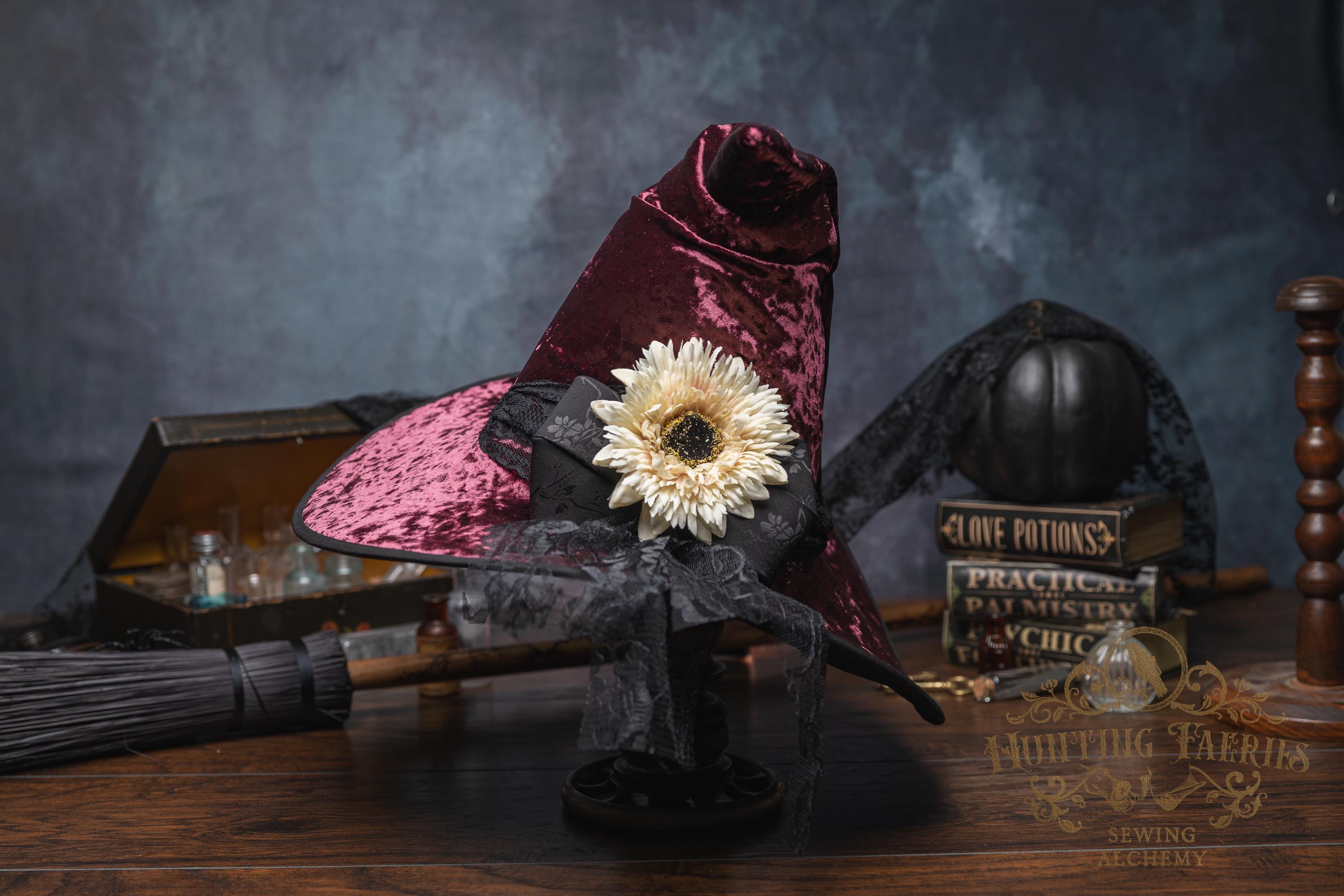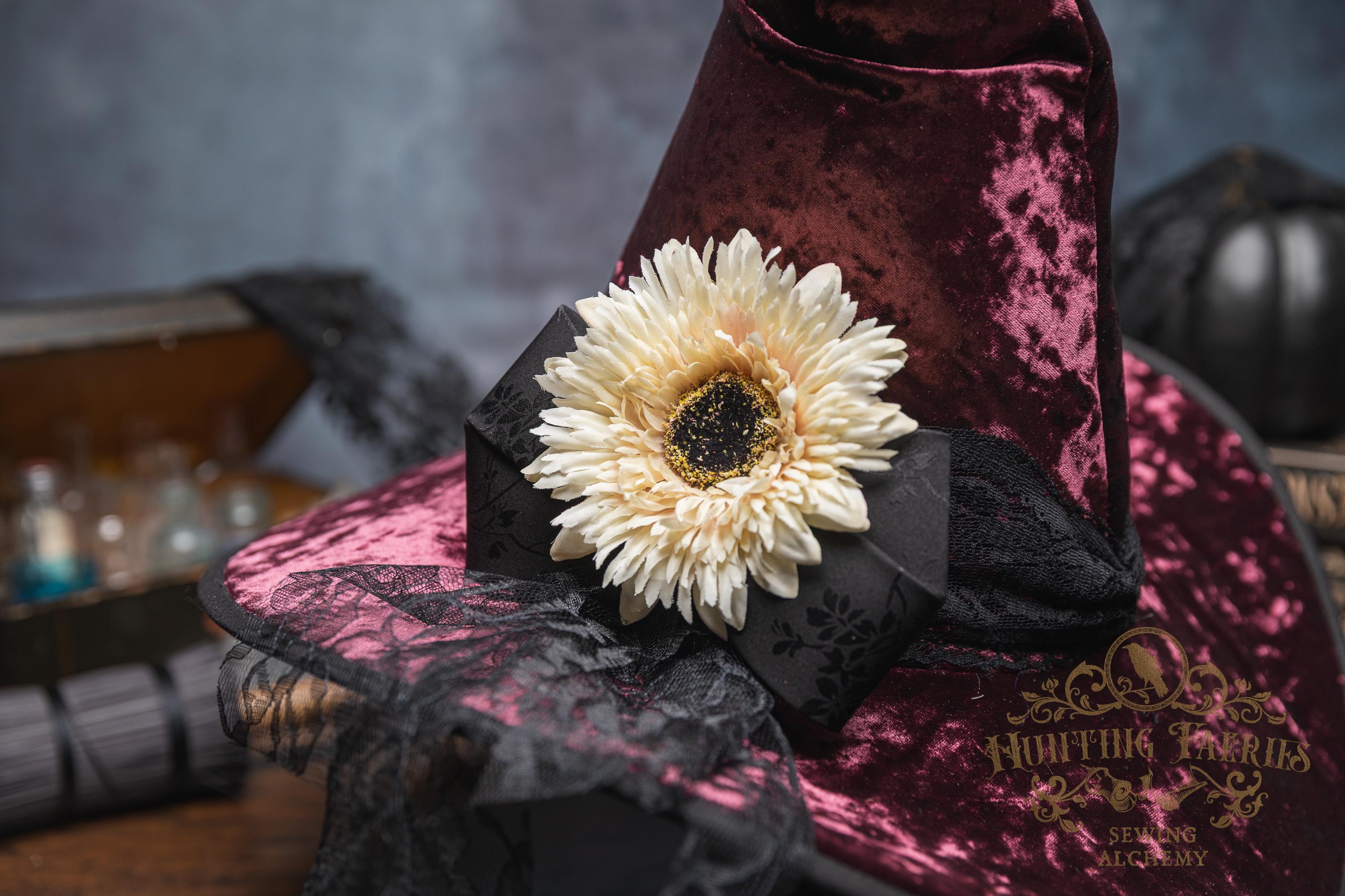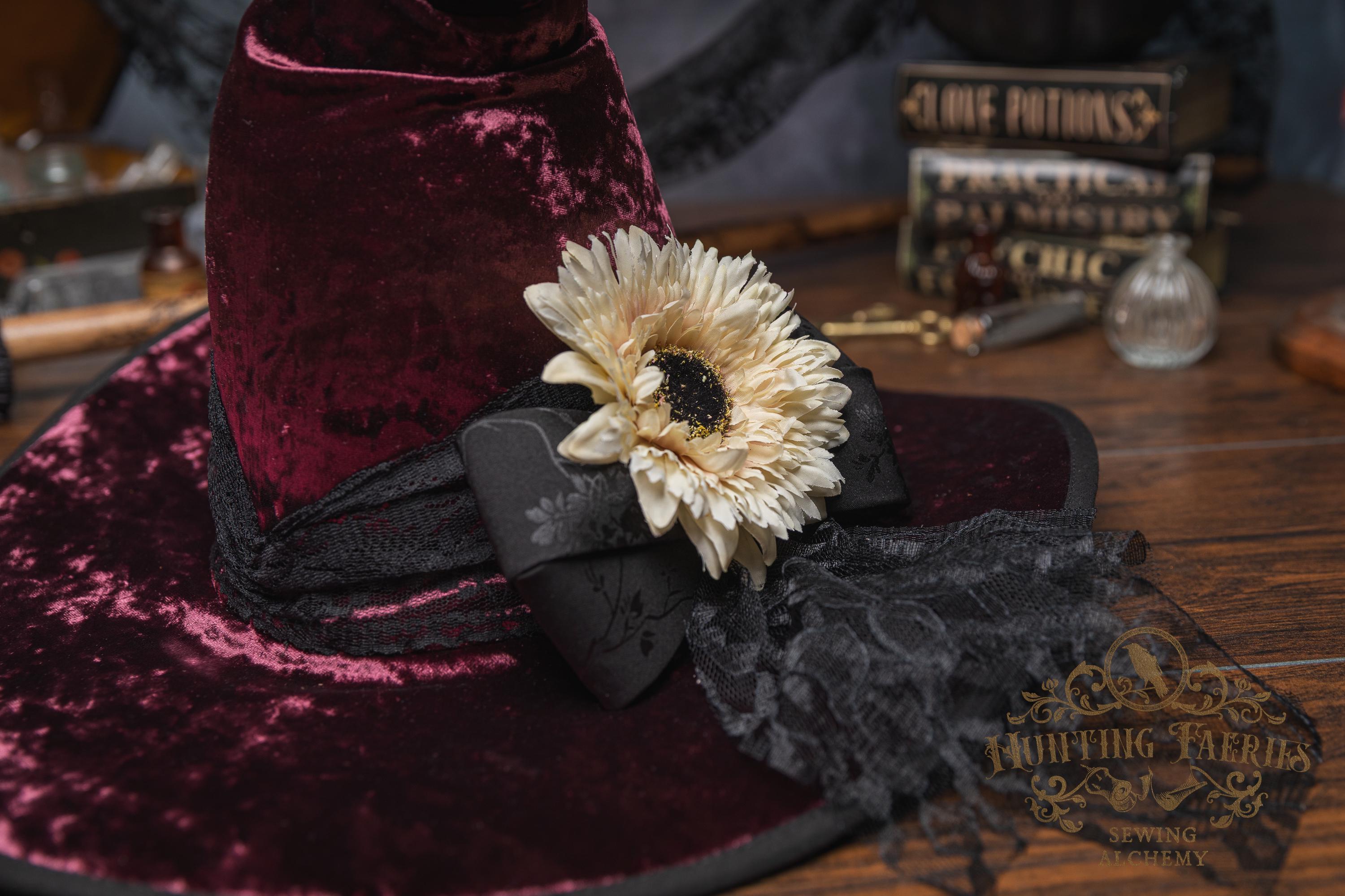 This witch hat is made from burgundy colored crushed velvet with a black lace band encircling a crooked cone. The brim features three layers of magic stitched together and polished off with black bias tape. The underside and inside cone is black felt, which helps the hat maintain its shape, and it absorbs that extra moonlight as you fly through those October skies. The side of the hat is adorned with a black silk floral bow with a splash of lace and a white sunflower. It is removable, allowing you to decorate it to suit your own personal style or change it up to match your witch ensemble.
