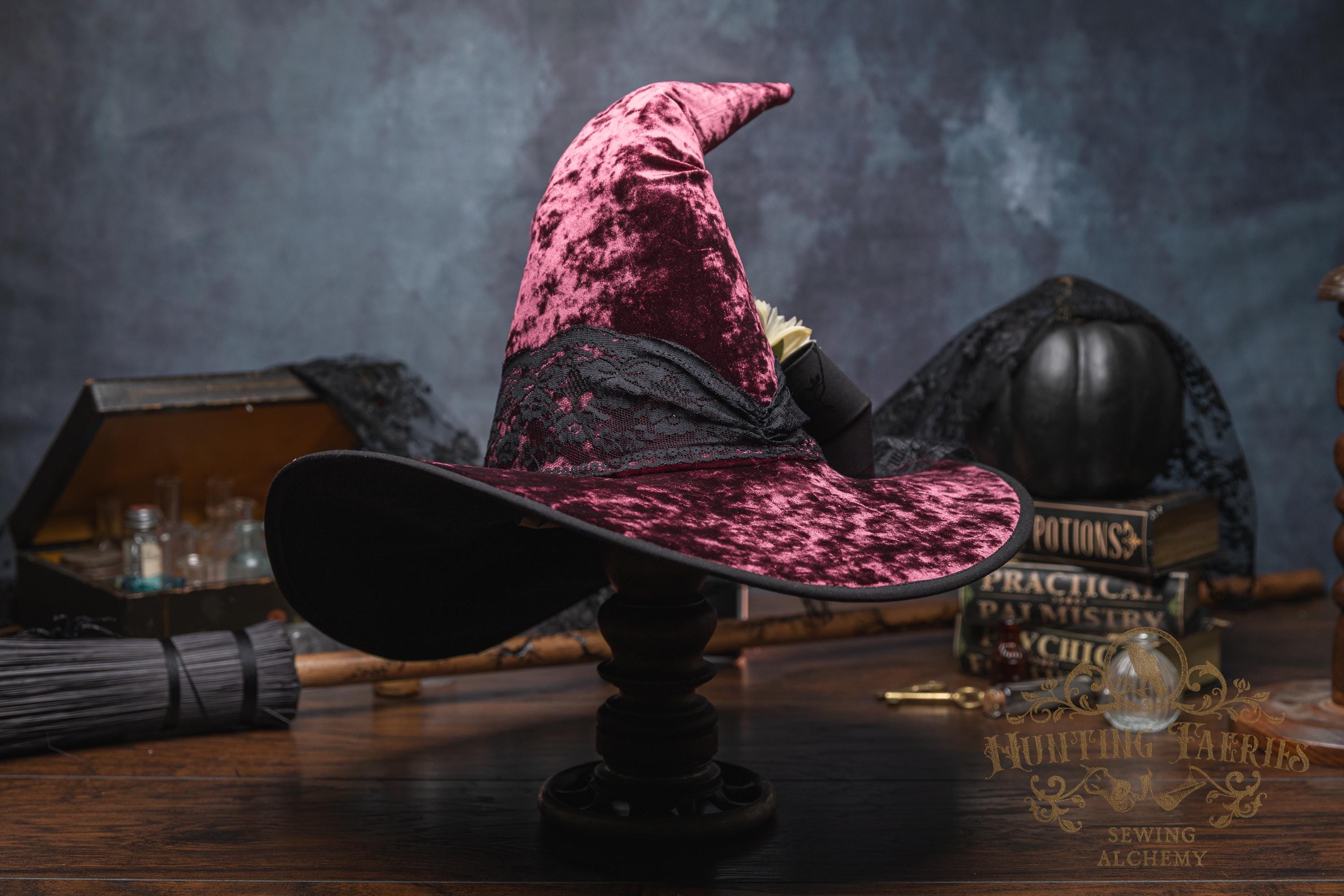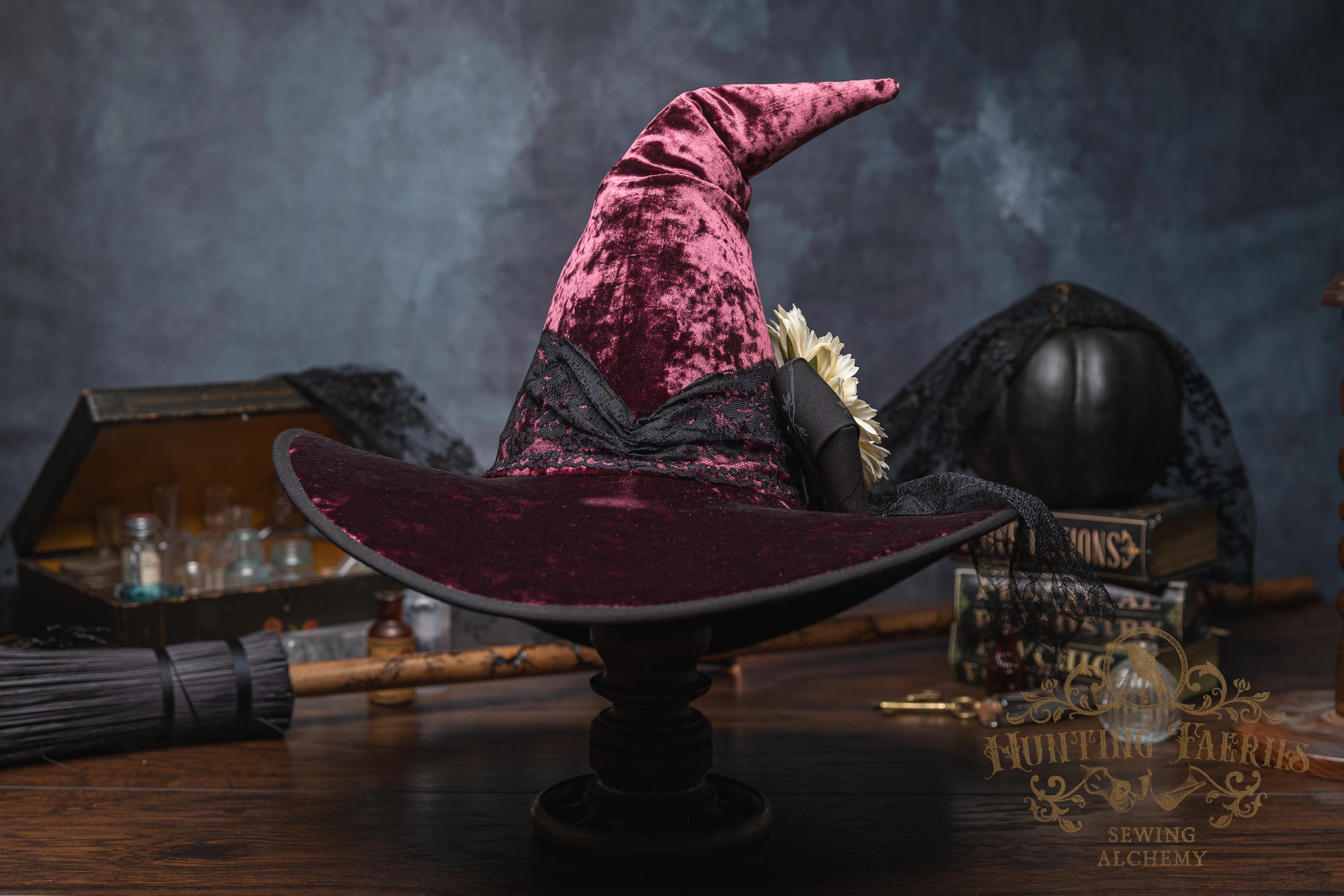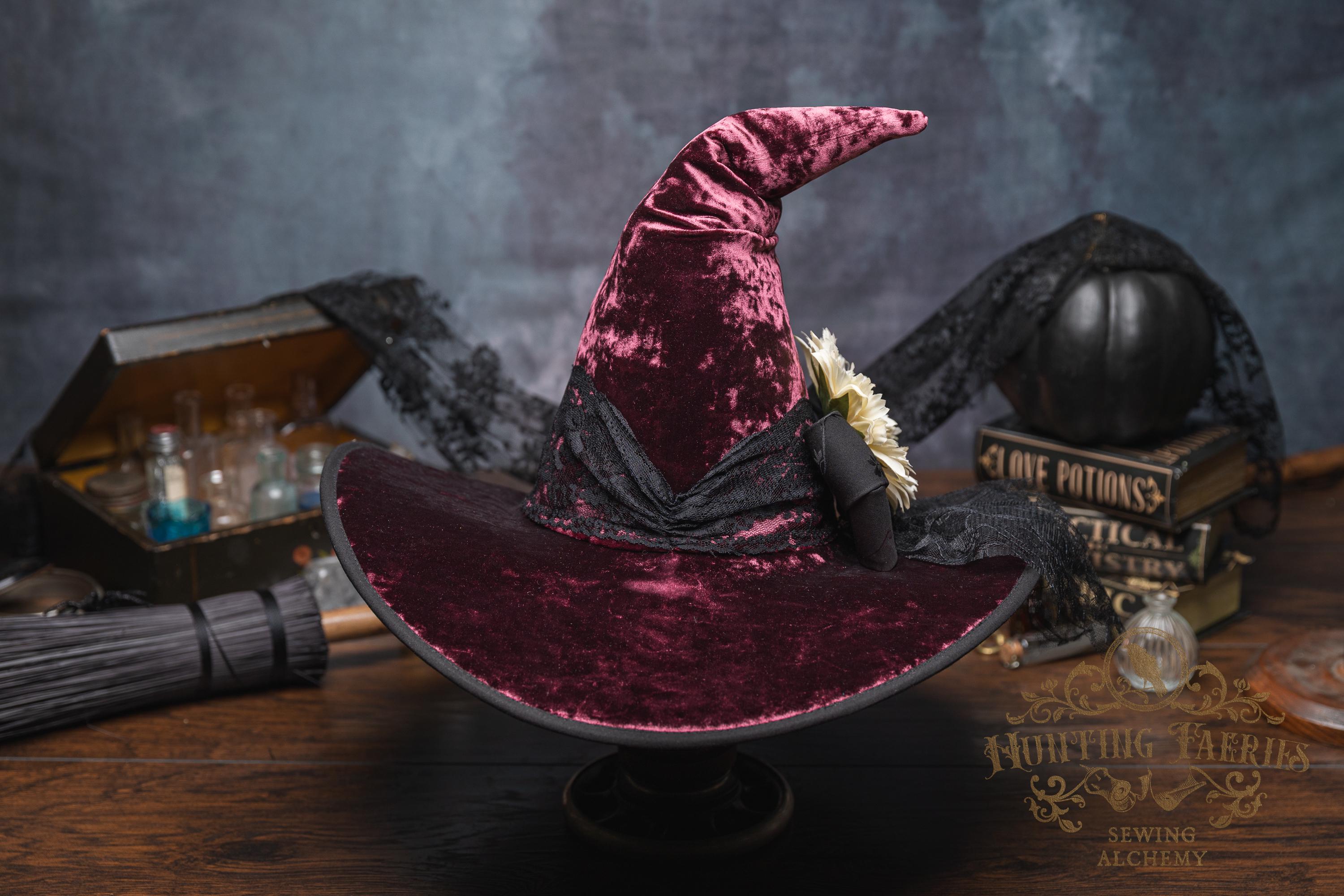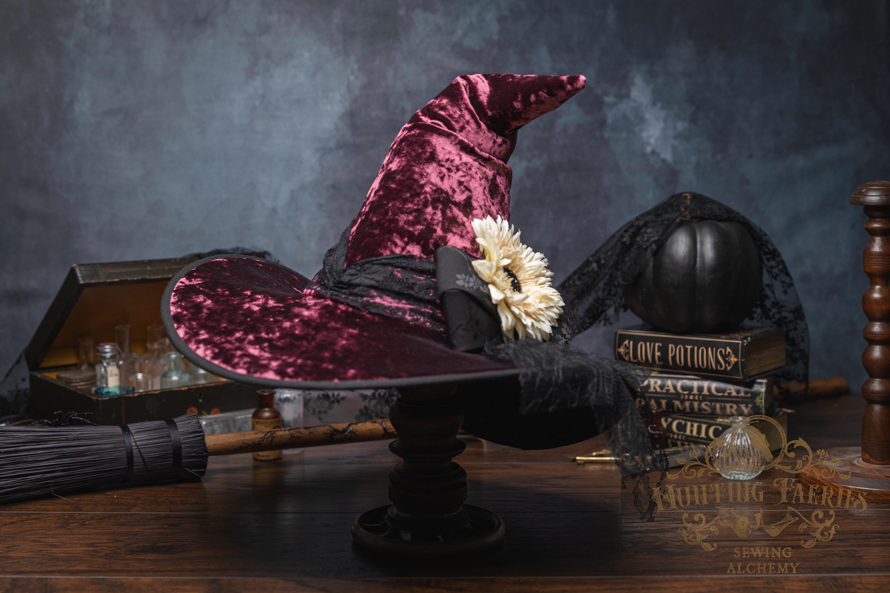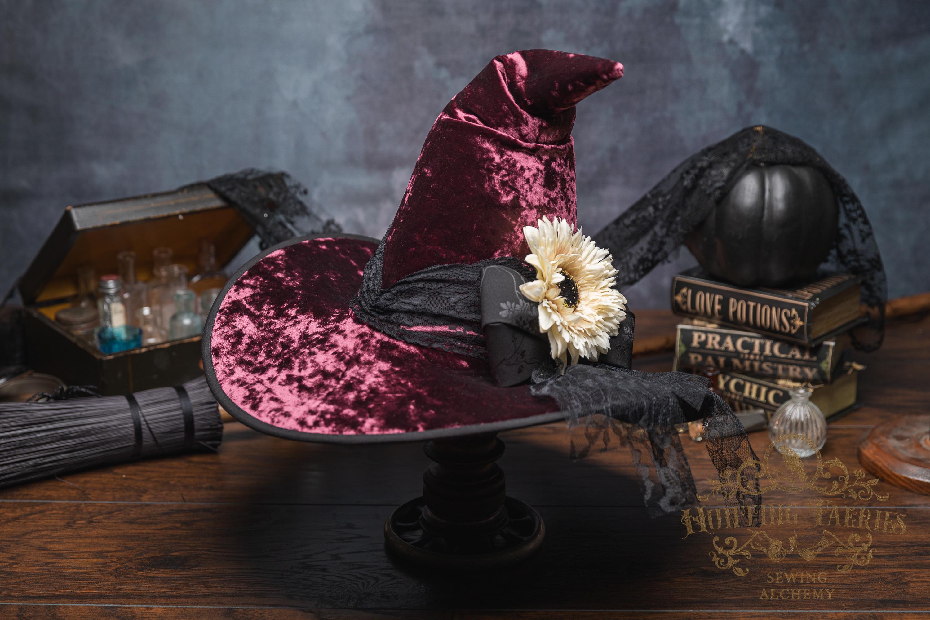 This witch hat is made from burgundy colored crushed velvet with a black lace band encircling a crooked cone. The brim features three layers of magic stitched together and polished off with black bias tape. The underside and inside cone is black felt, which helps the hat maintain its shape, and it absorbs that extra moonlight as you fly through those October skies. The side of the hat is adorned with a black silk floral bow with a splash of lace and a white sunflower. It is removable, allowing you to decorate it to suit your own personal style or change it up to match your witch ensemble.