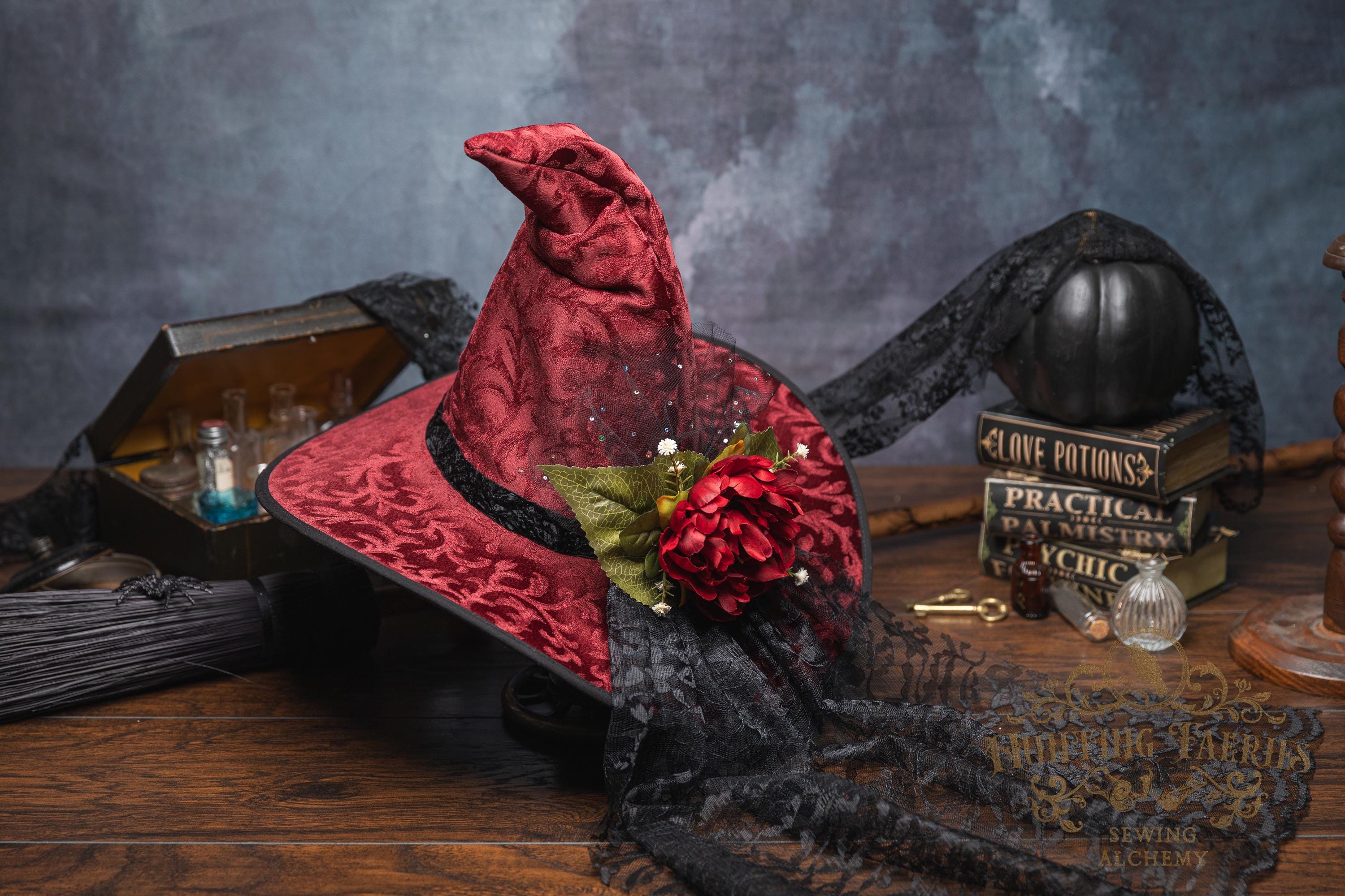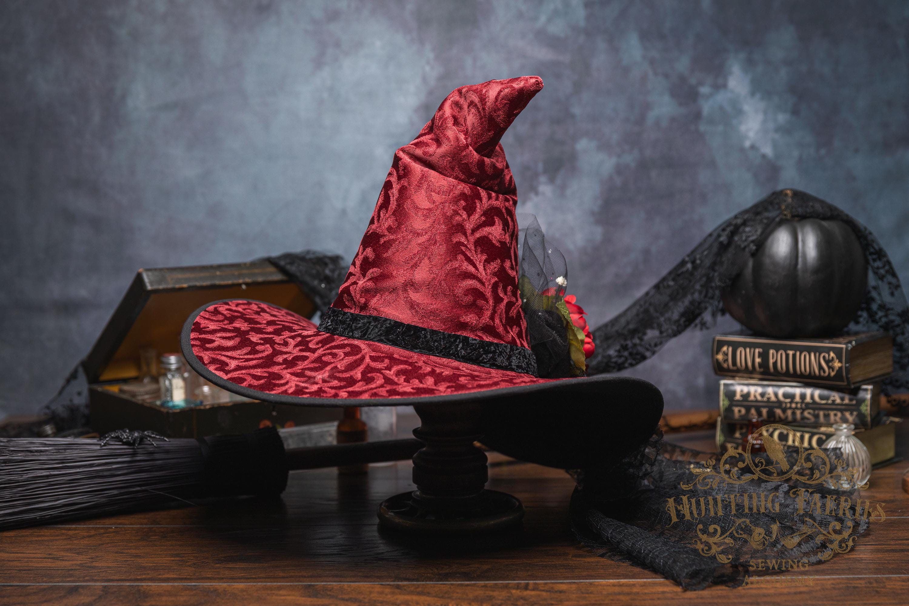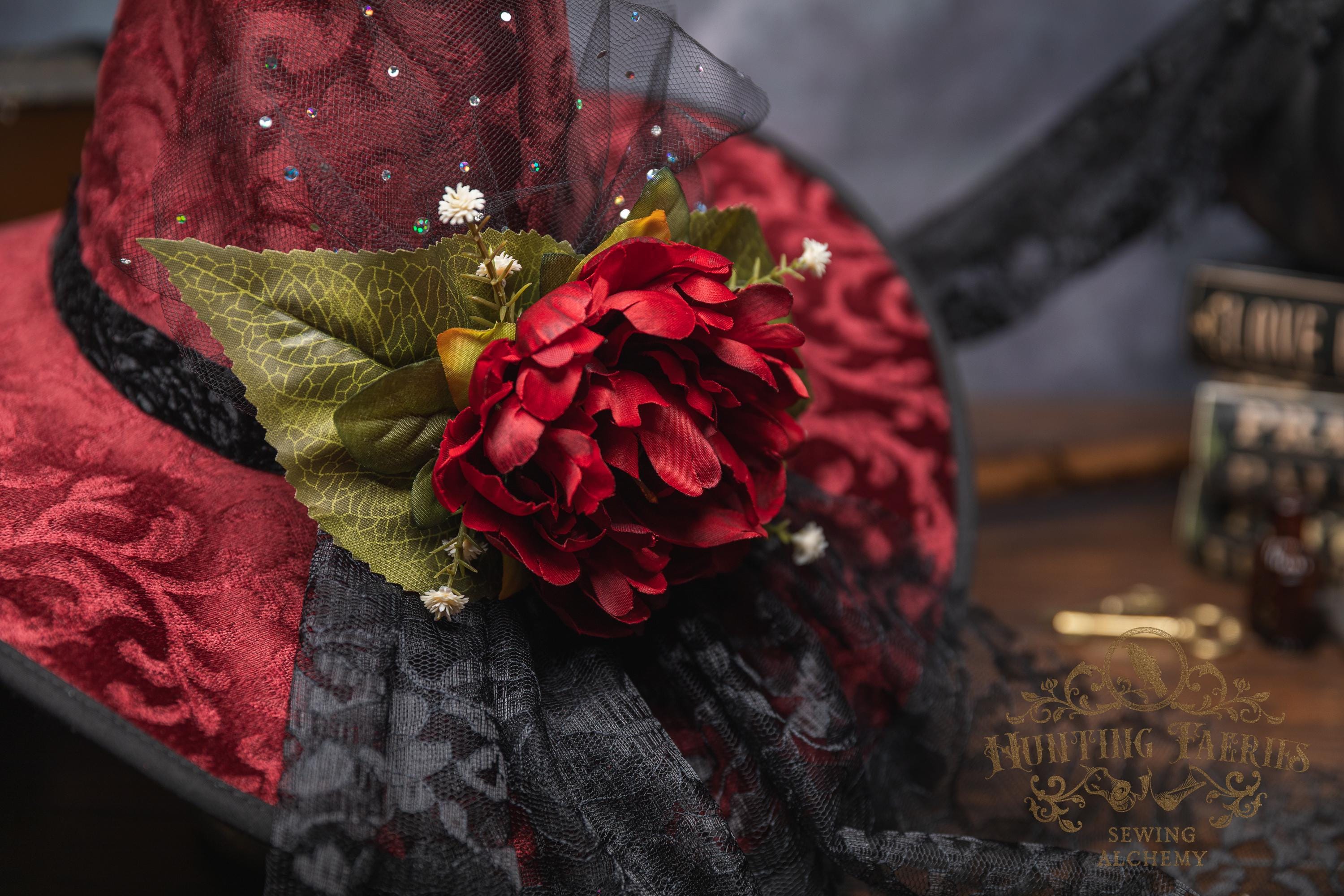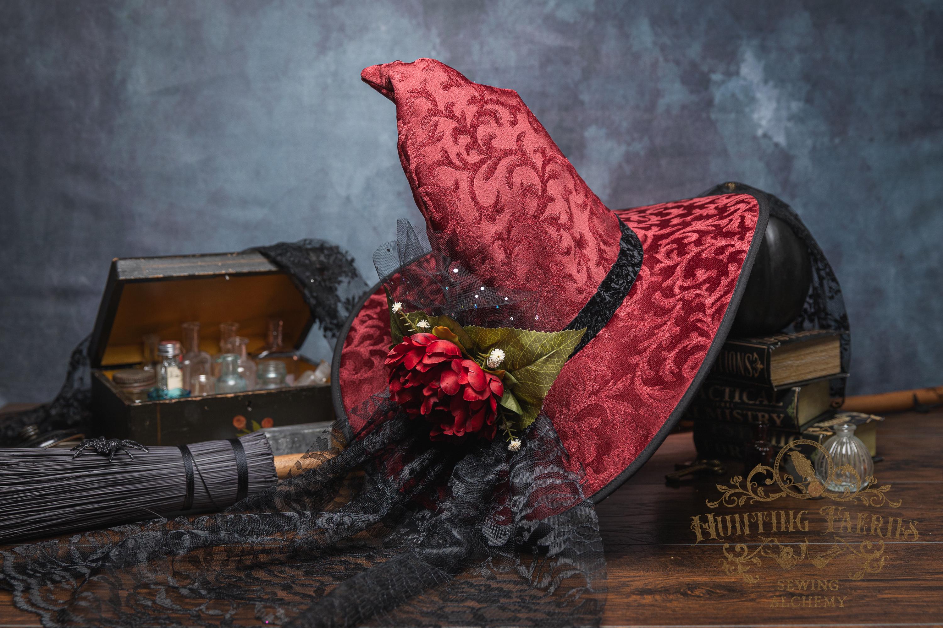 This witch hat is made from burgundy colored damask fabric with a black crushed velvet band encircling a crooked cone. The brim features three layers of magic stitched together and polished off with black bias tape. The underside and inside cone is black felt, which helps the hat maintain its shape, and it absorbs that extra moonlight as you fly through those October skies. The back of the hat is adorned with a red flower and a splash of lace trailing behind. It is removable, allowing you to decorate it to suit your own personal style or change it up to match your witch ensemble.
