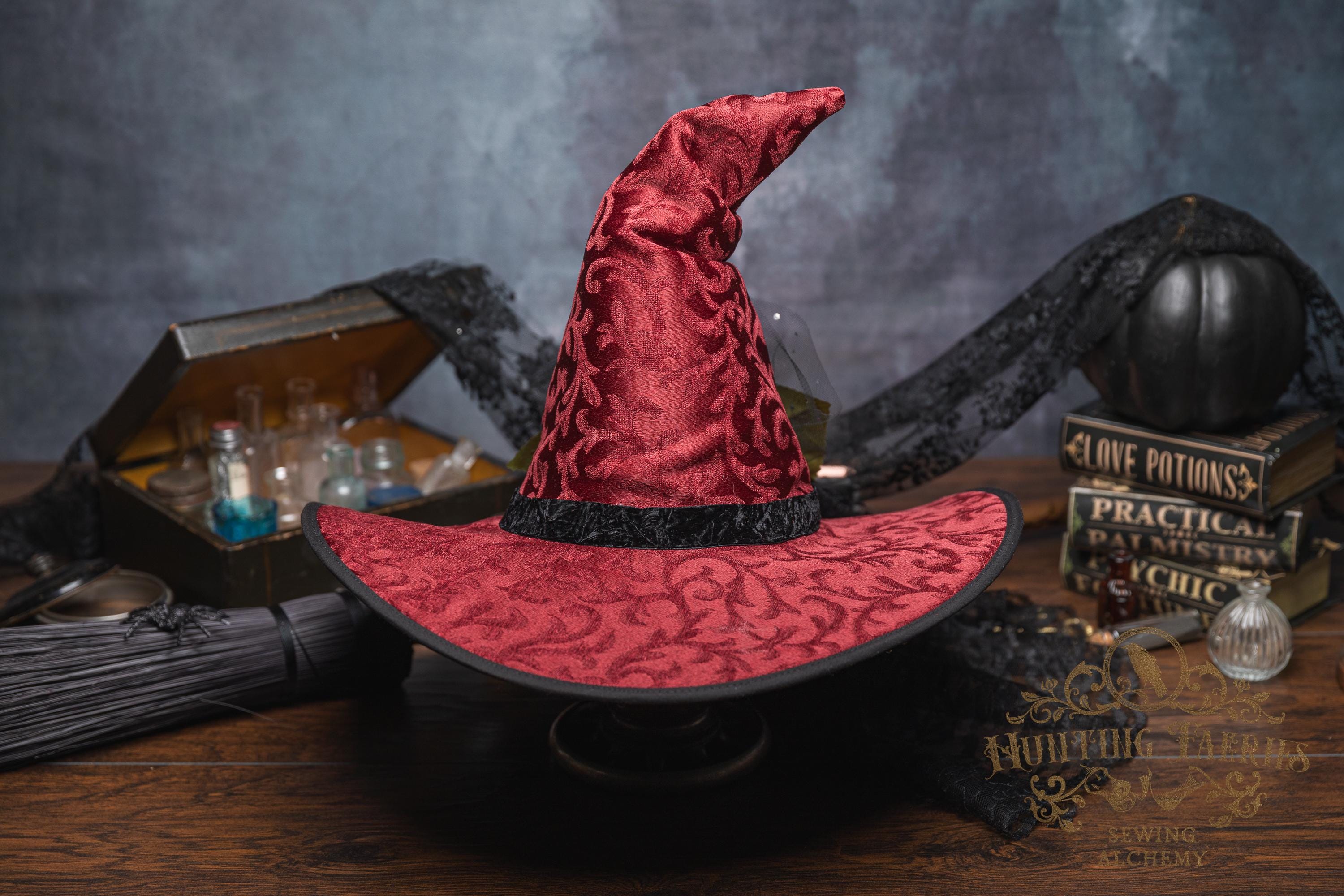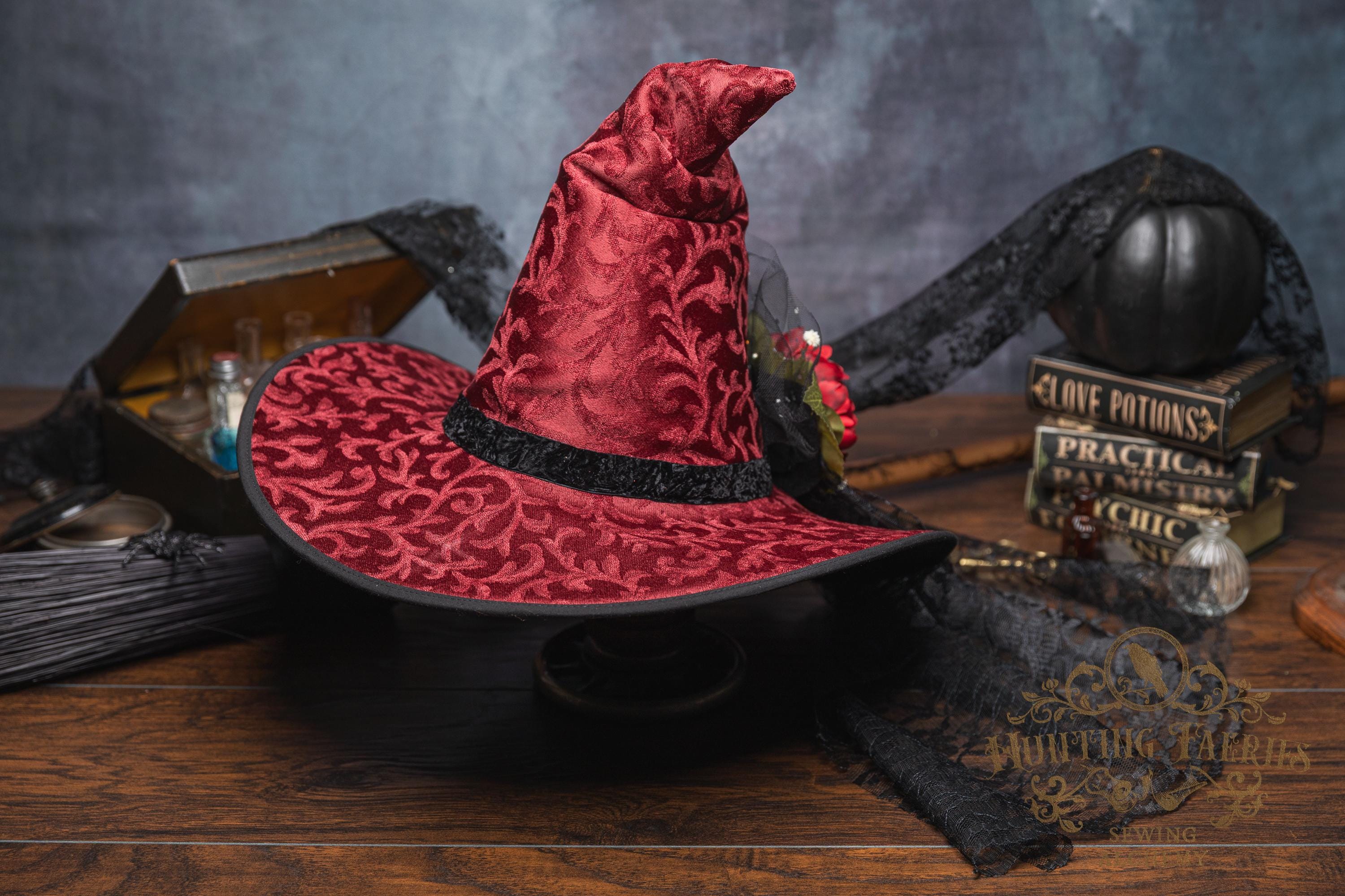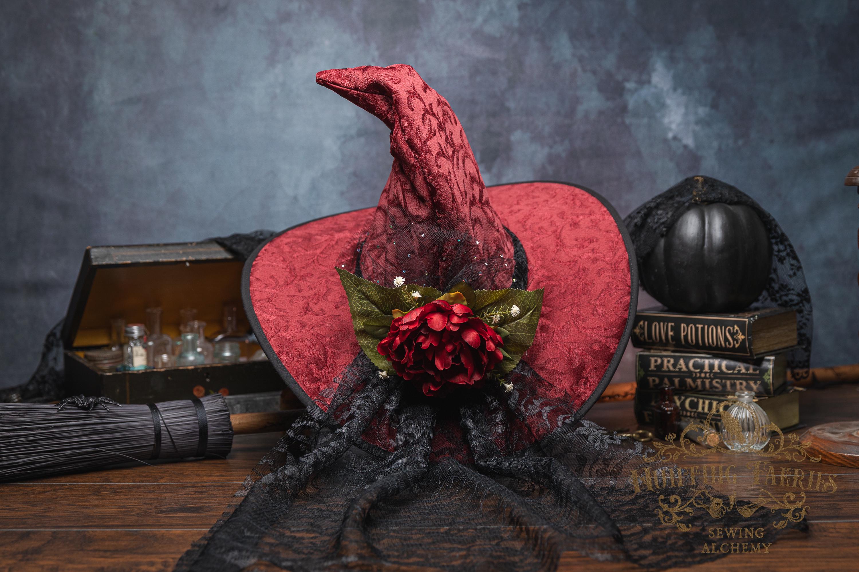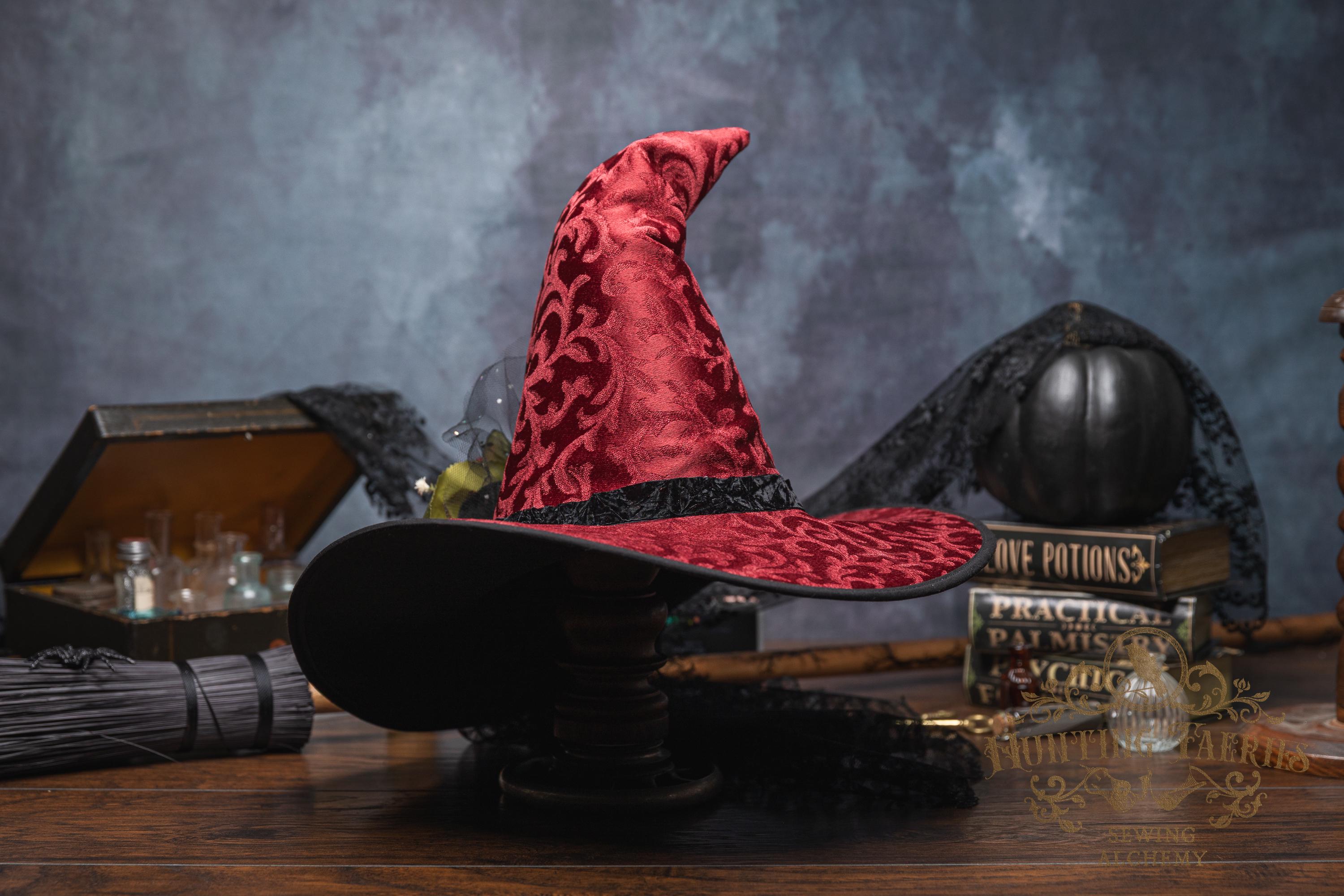 This witch hat is made from burgundy colored damask fabric with a black crushed velvet band encircling a crooked cone. The brim features three layers of magic stitched together and polished off with black bias tape. The underside and inside cone is black felt, which helps the hat maintain its shape, and it absorbs that extra moonlight as you fly through those October skies. The back of the hat is adorned with a red flower and a splash of lace trailing behind. It is removable, allowing you to decorate it to suit your own personal style or change it up to match your witch ensemble.