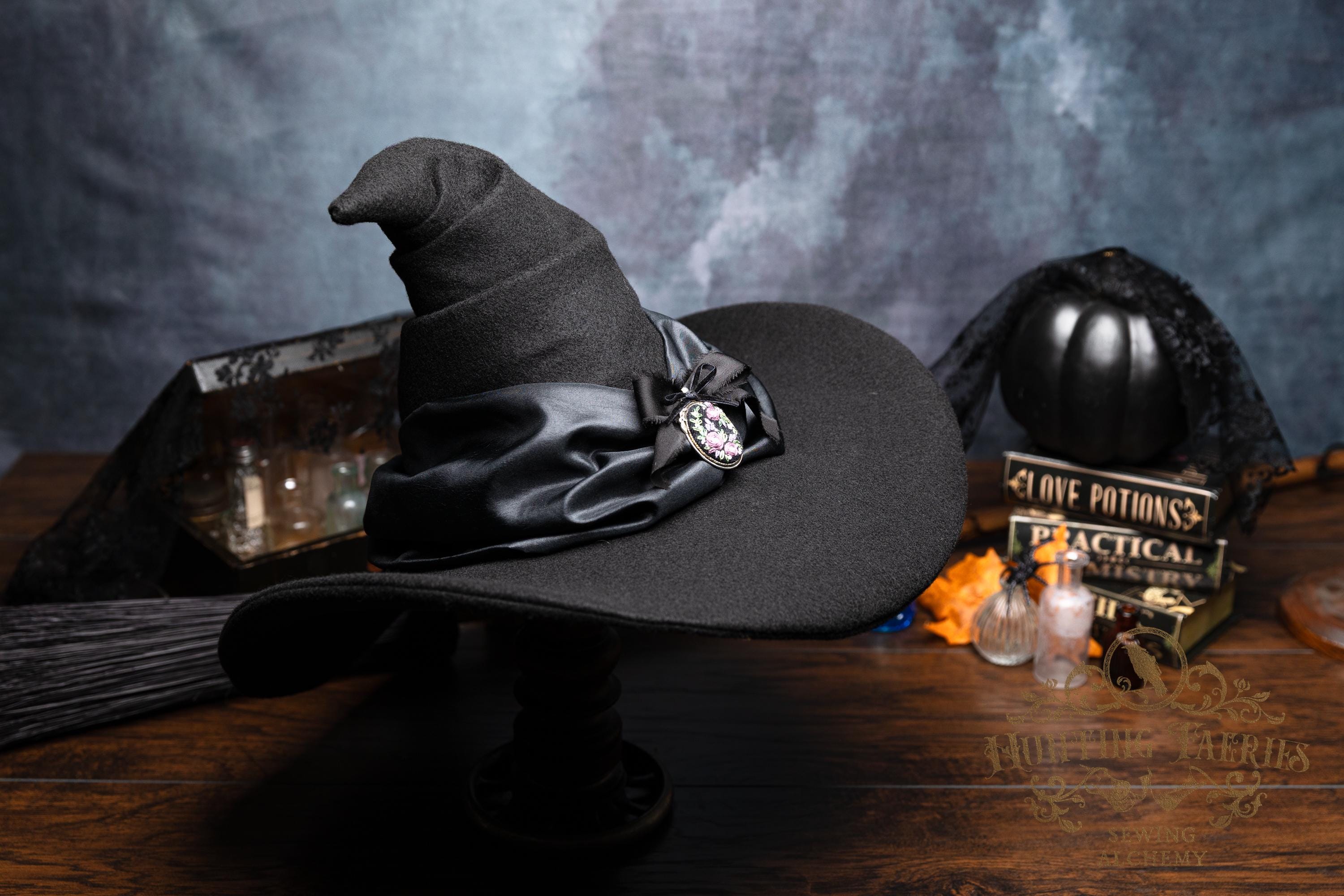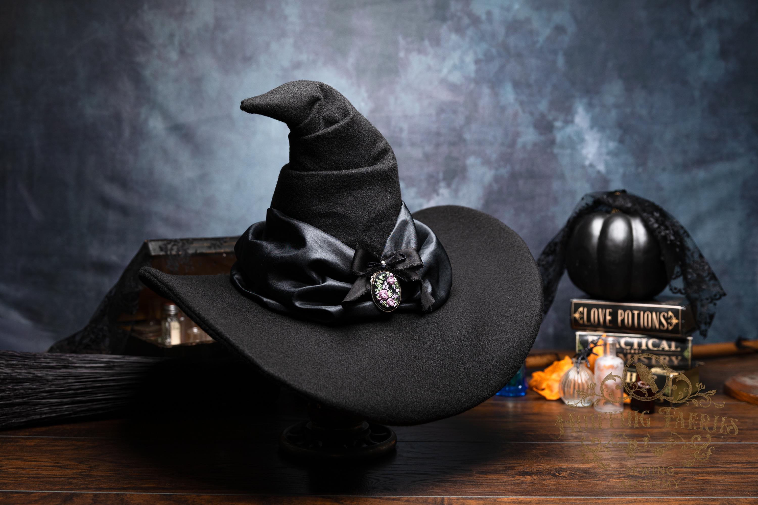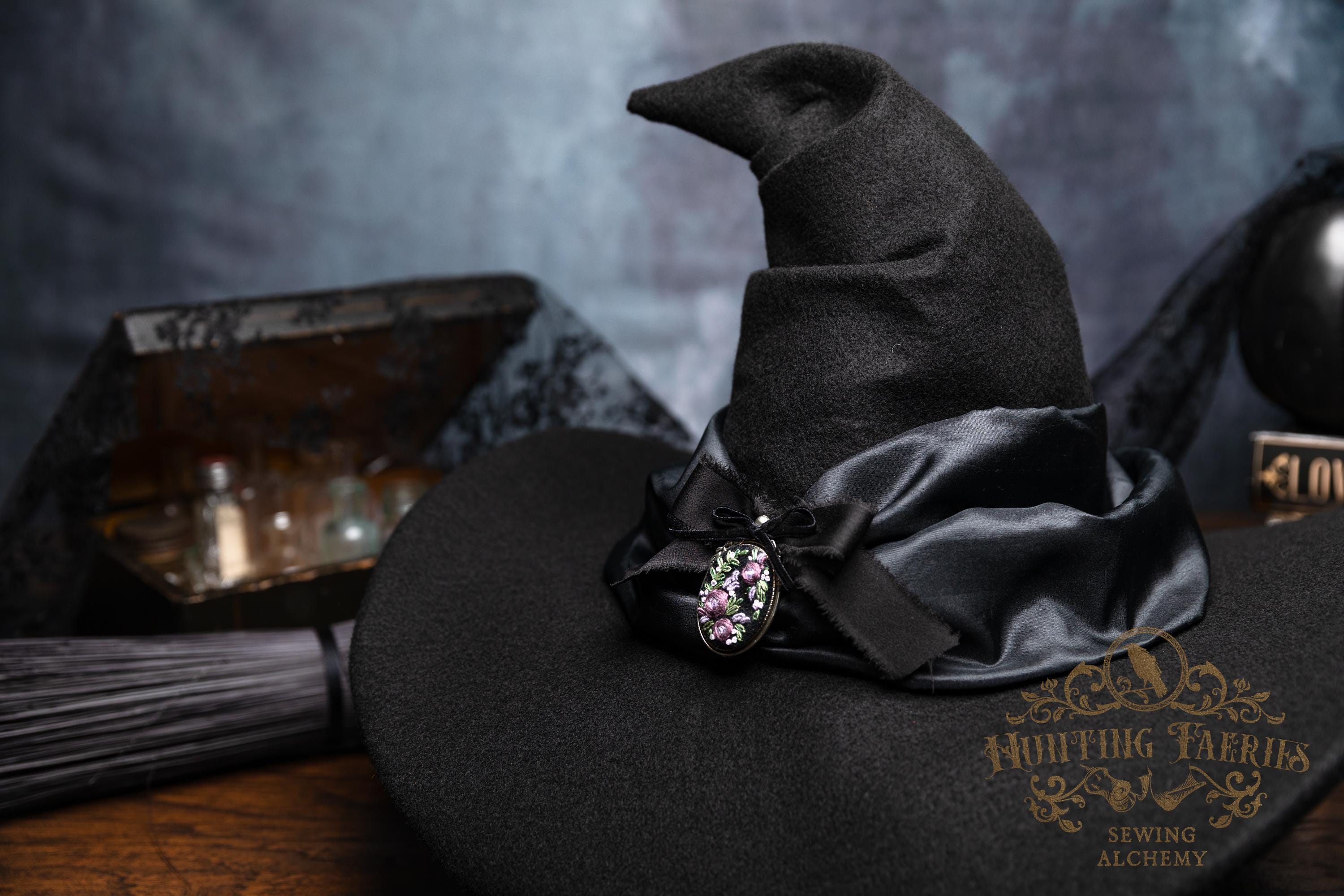 This witch hat is made of black felt, (eco-friendly) it offers a classic dark witchy look. It's great dressed up for your coven, or dressed down for solitary practice. As a witch costume...supreme! Its wide brim is also wired and stitched with three layers of felt, offering a sculpted, look and feel. Mold the brim and define yourself! The cone is crooked to the side. It's band is a black satin scarf that encircles the cone, at the front is a hand-embroidered brooch pin. This witches hat would be great for a wizard or mage cosplay, ren faire costume or everyday wear! The possibilities are only limited by your imagination!
