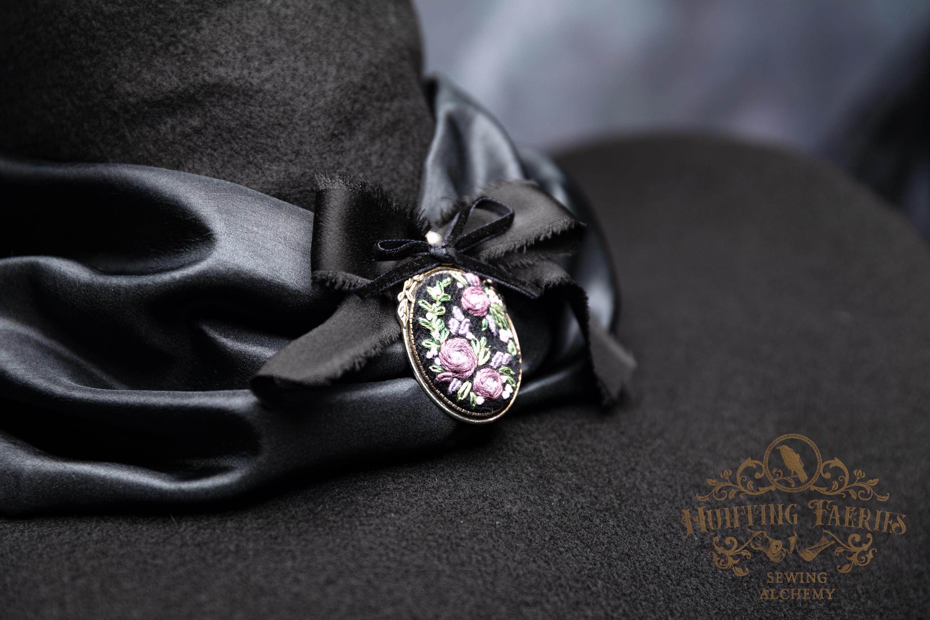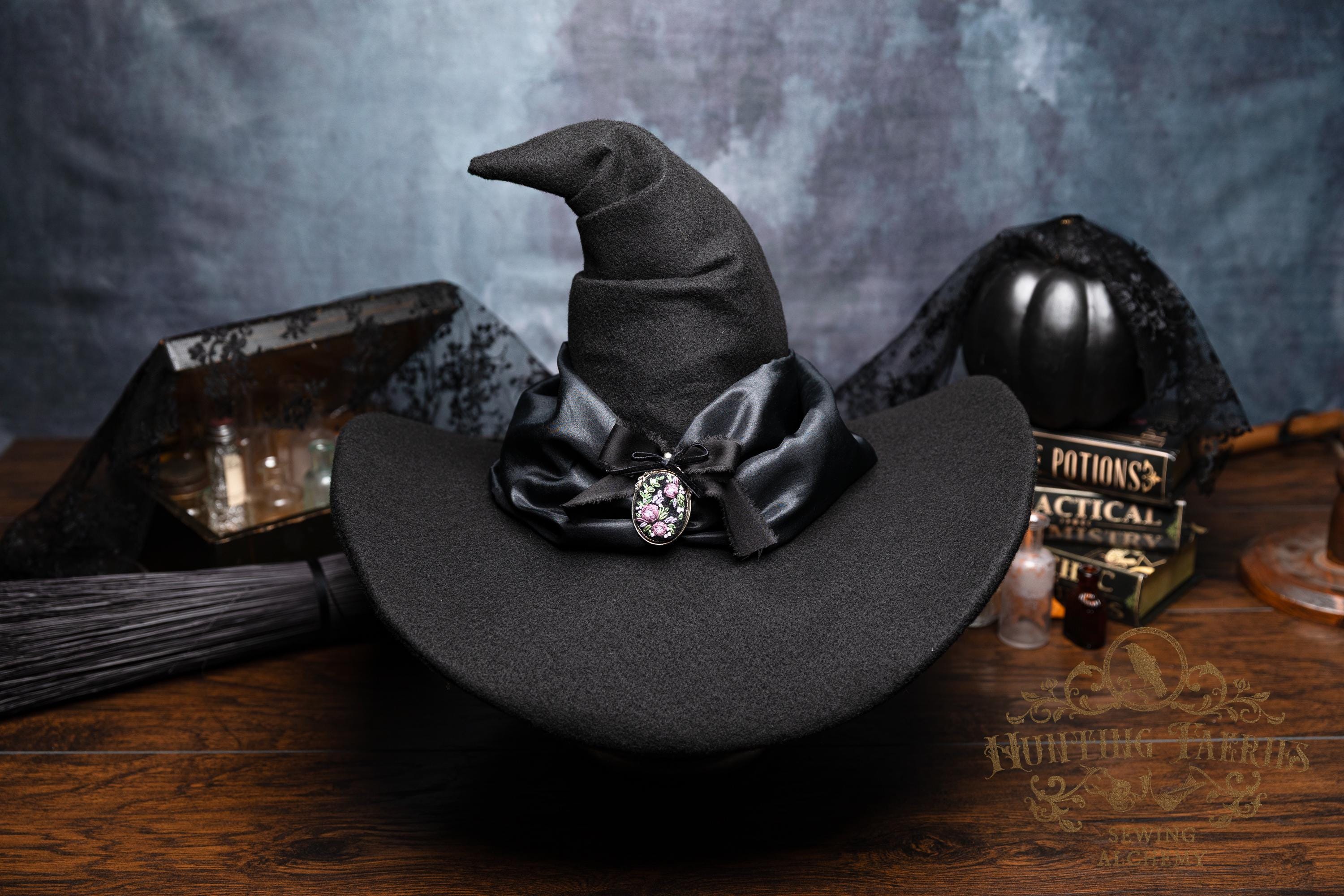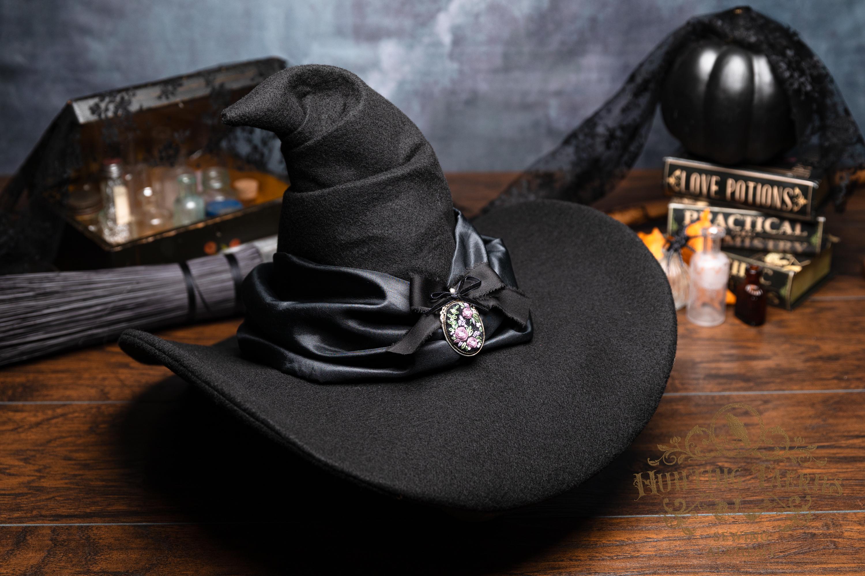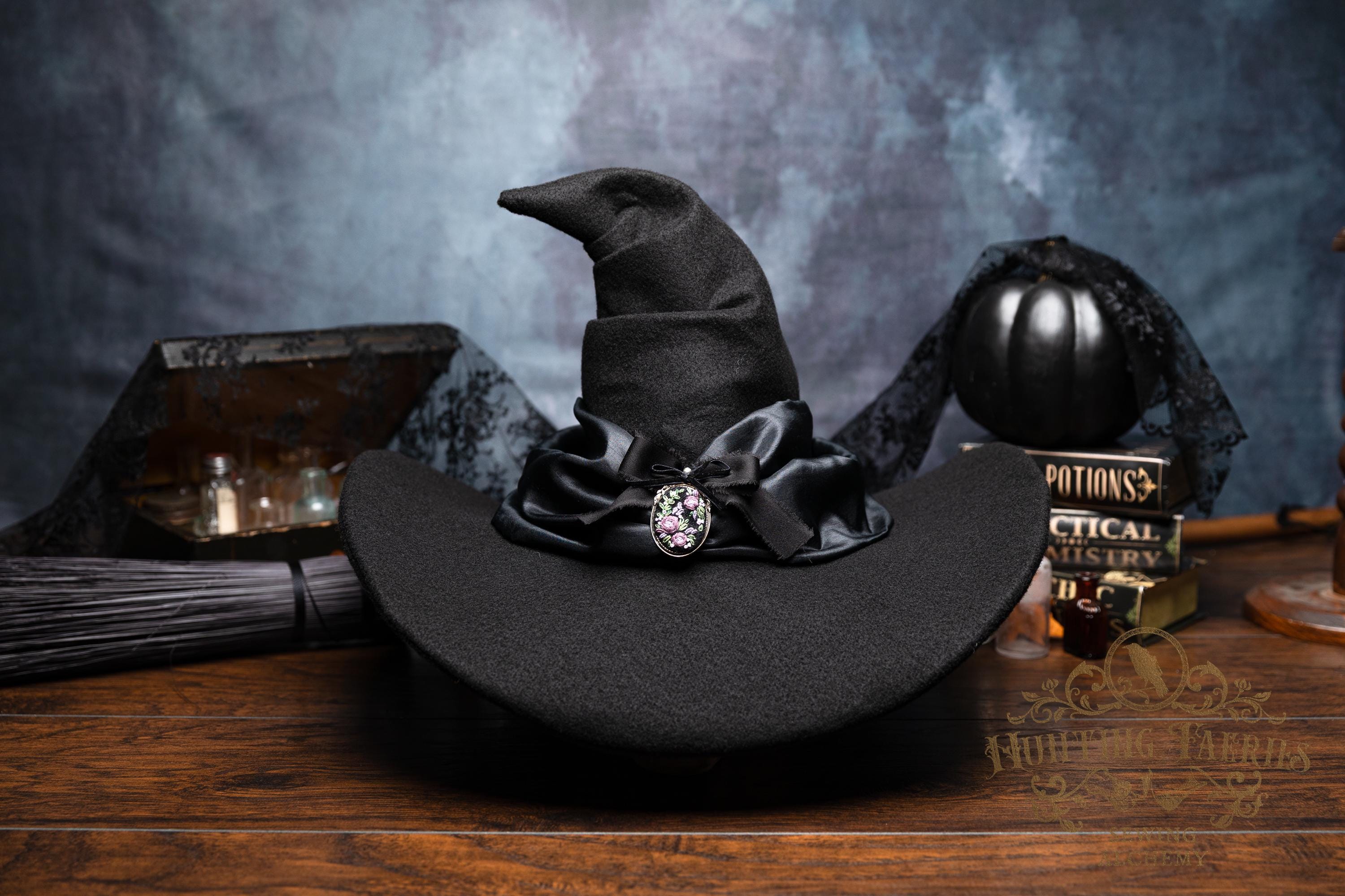 This witch hat is made of black felt, (eco-friendly) it offers a classic dark witchy look. It's great dressed up for your coven, or dressed down for solitary practice. As a witch costume...supreme! Its wide brim is also wired and stitched with three layers of felt, offering a sculpted, look and feel. Mold the brim and define yourself! The cone is crooked to the side. It's band is a black satin scarf that encircles the cone, at the front is a hand-embroidered brooch pin. This witches hat would be great for a wizard or mage cosplay, ren faire costume or everyday wear! The possibilities are only limited by your imagination!