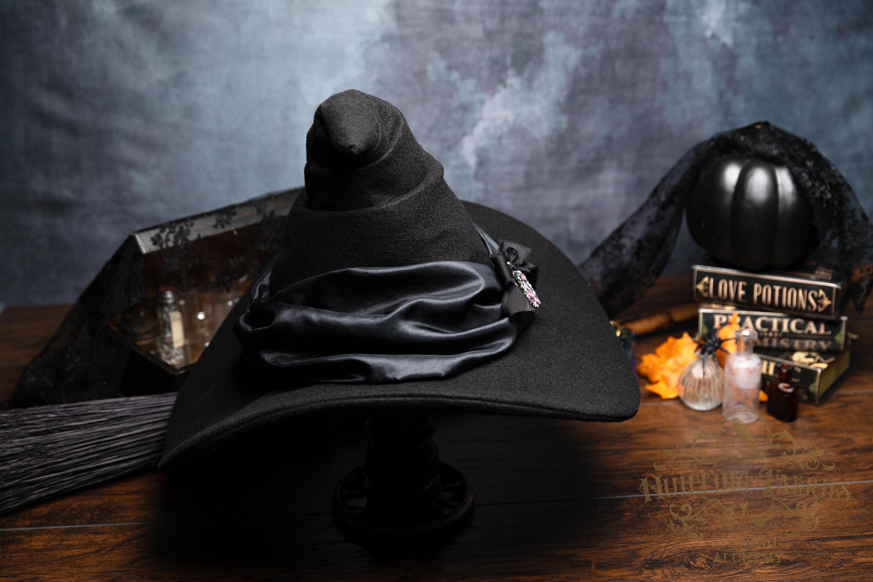 Lets change the image of the witch that we think of as wart infested and green! She just needs a makeover! Something pretty to wear as she stirs up her cauldron and flies through the night skies across the moon. This is the opportunity! No need to mix potions hiding from the neighbors because you aren't looking your best. Slap on the Wren witch hat and the magic begins! NO hags here! Looking to upgrade your old dusty hat? Want to add more black to the rest of your glam witchy black wardrobe? Mix it up with one of these simple yet elegant hats!