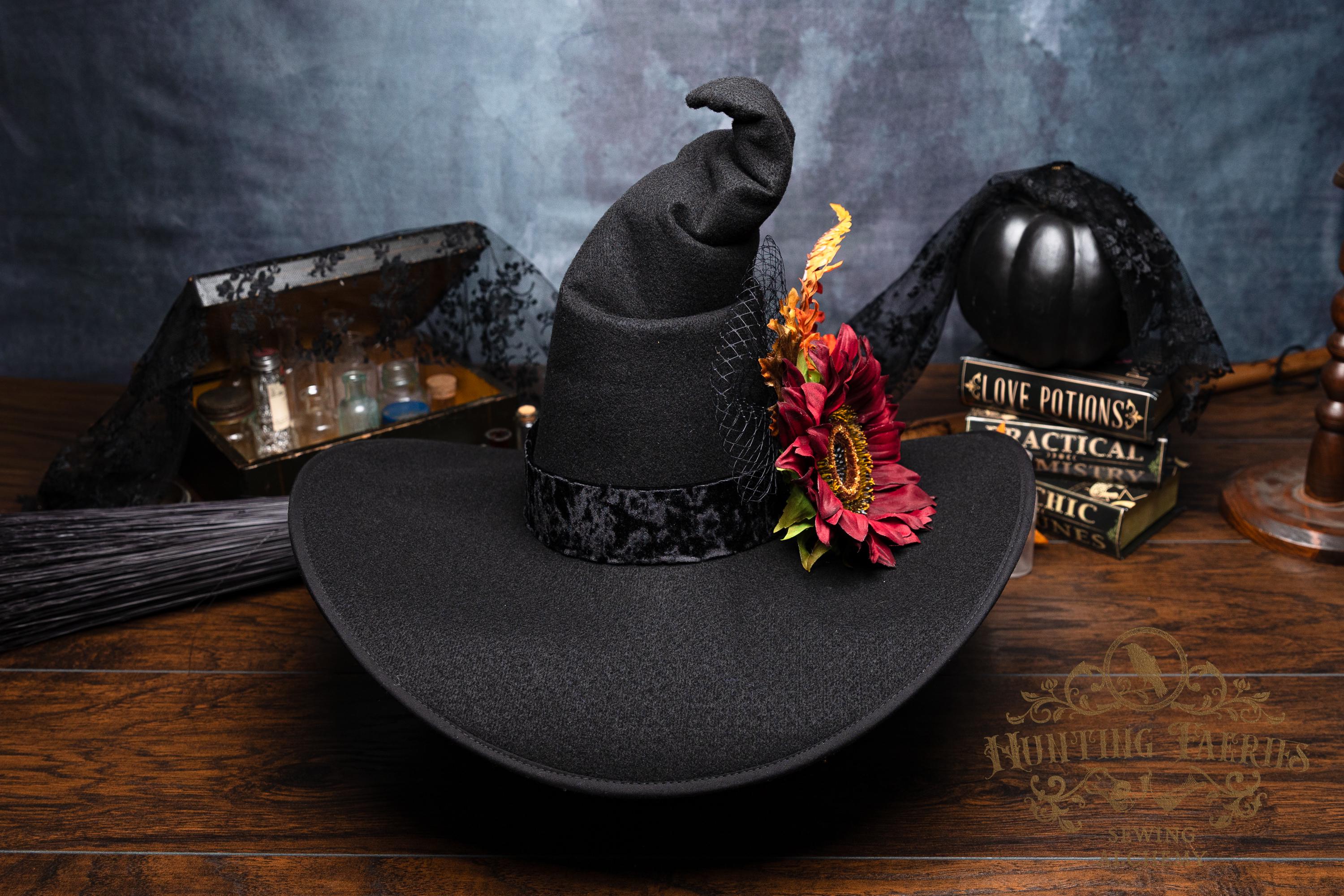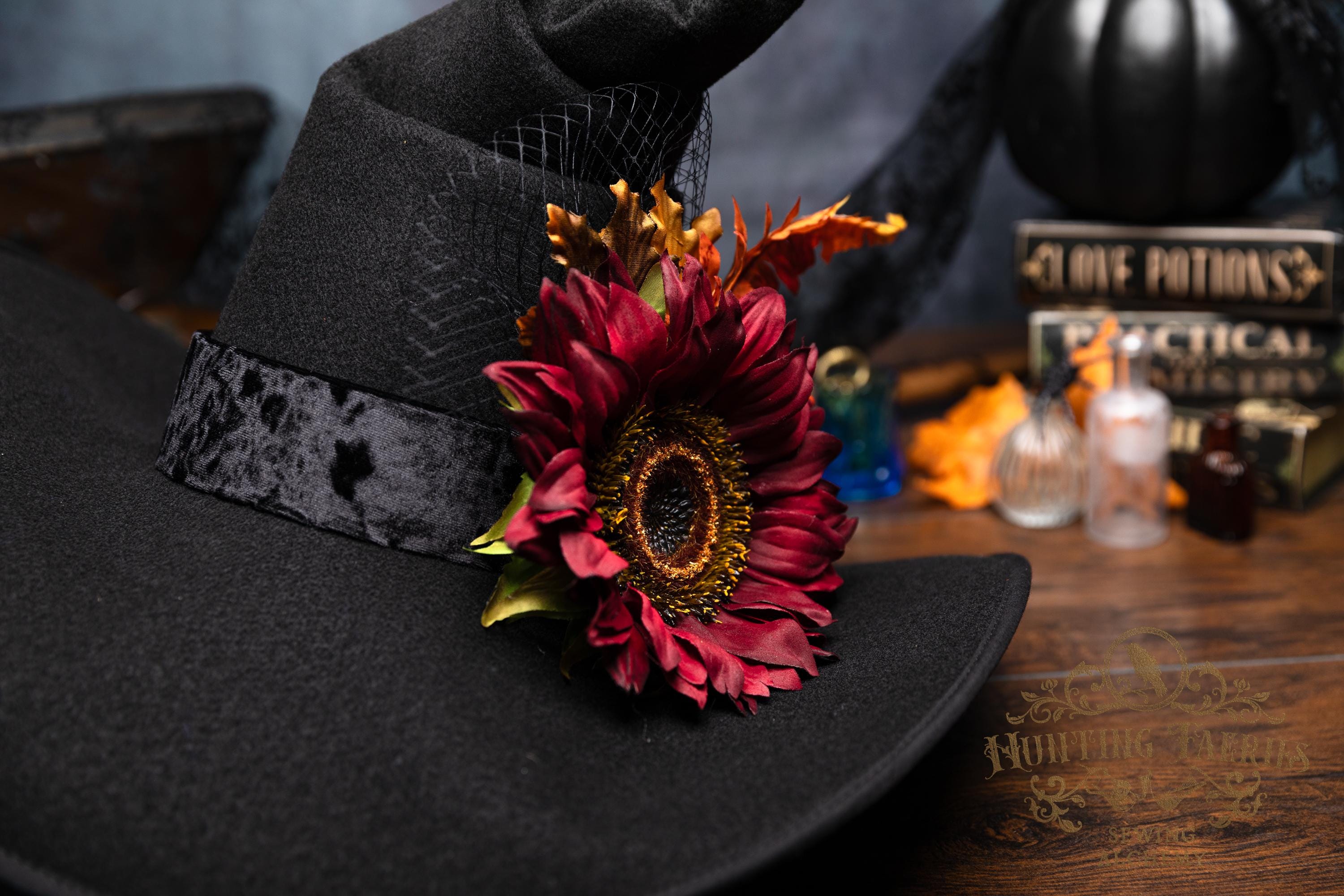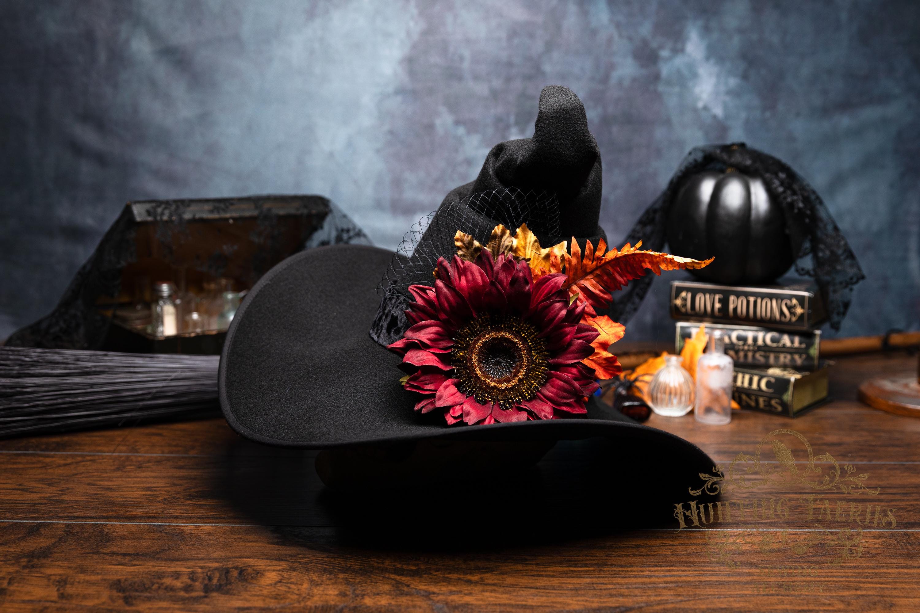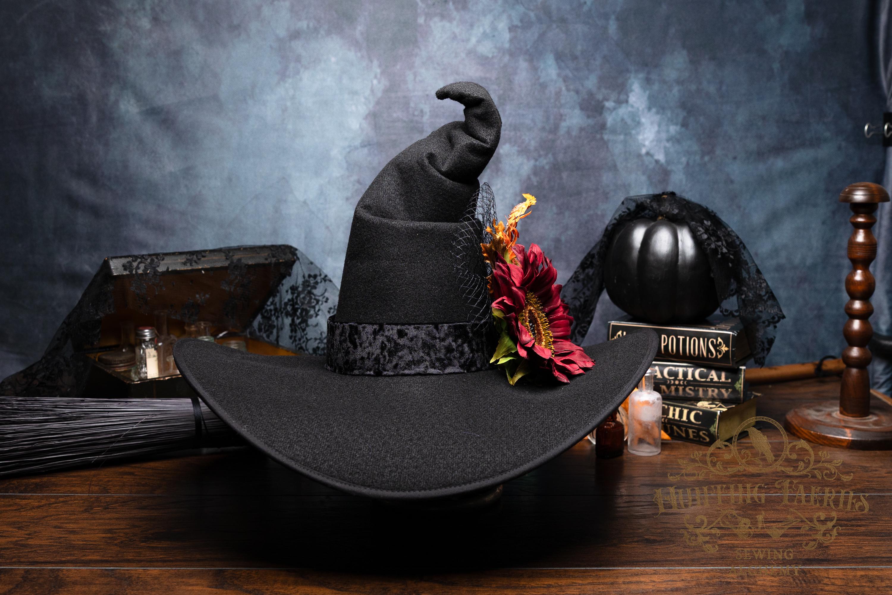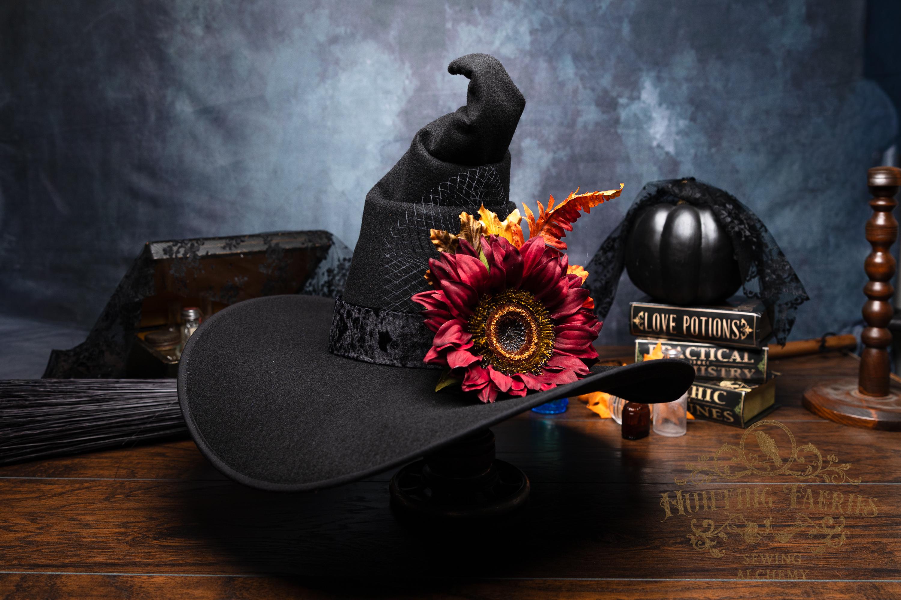 This wide-brimmed witch hat is made of black vegan-friendly felt. It offers a classic dark look with a crooked cone and wired brim. Its wide brim has 2 layers of magic stitched together for a great look and feel. Its edge is polished off with bias tape giving it a classy look. It has a black crushed velvet band around the cone and a Sunflower pin in the color of your choice at the side. Each pin is detachable and has a splash of tulle and veiling for added detail. This hat has the potential for good or evil. That choice is all yours. The brim is wired and exaggerated, it will make a statement wherever you go. This black witches hat would be great for a wizard or mage cosplay, ren faire costume or everyday wear! The possibilities are only limited by your imagination!