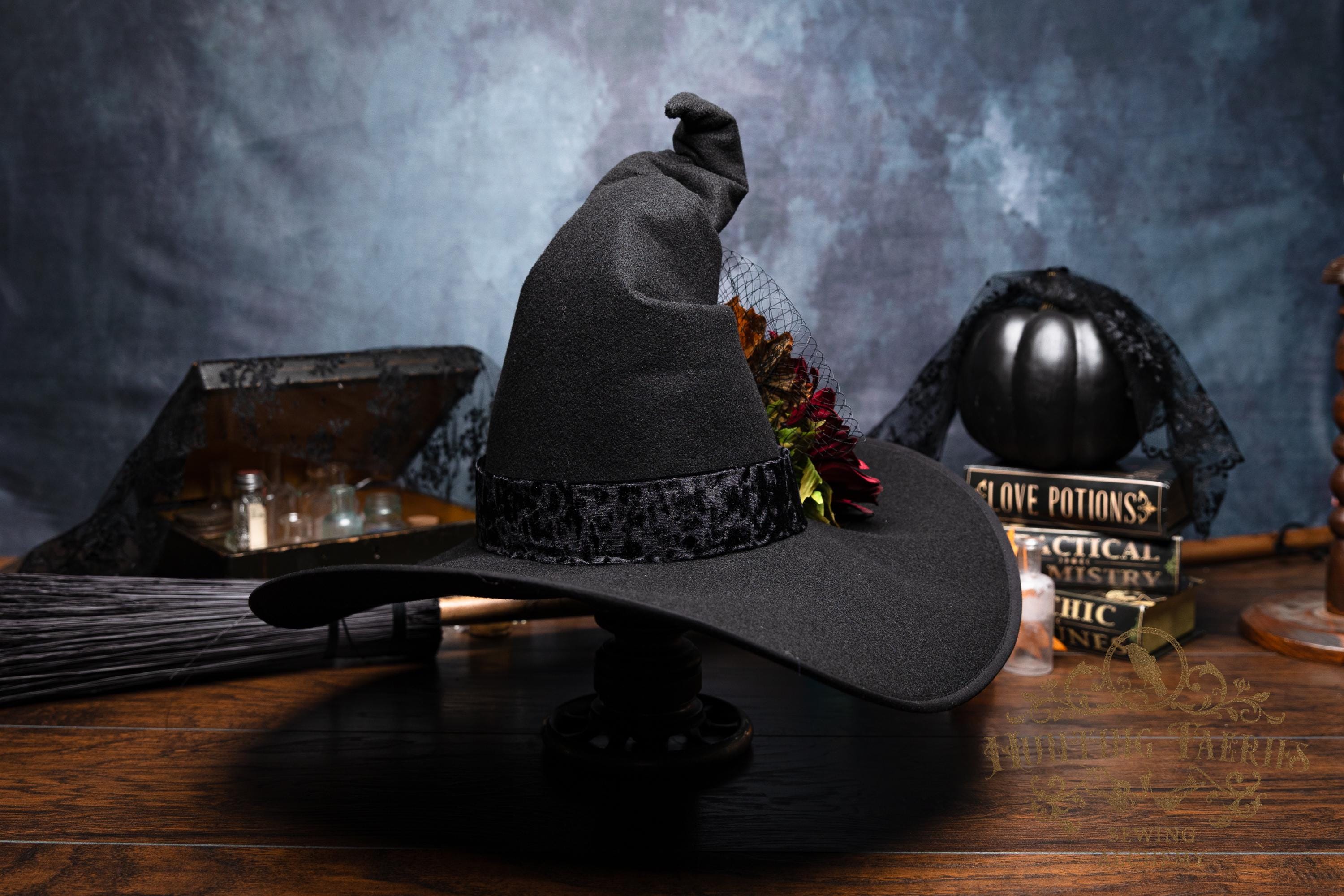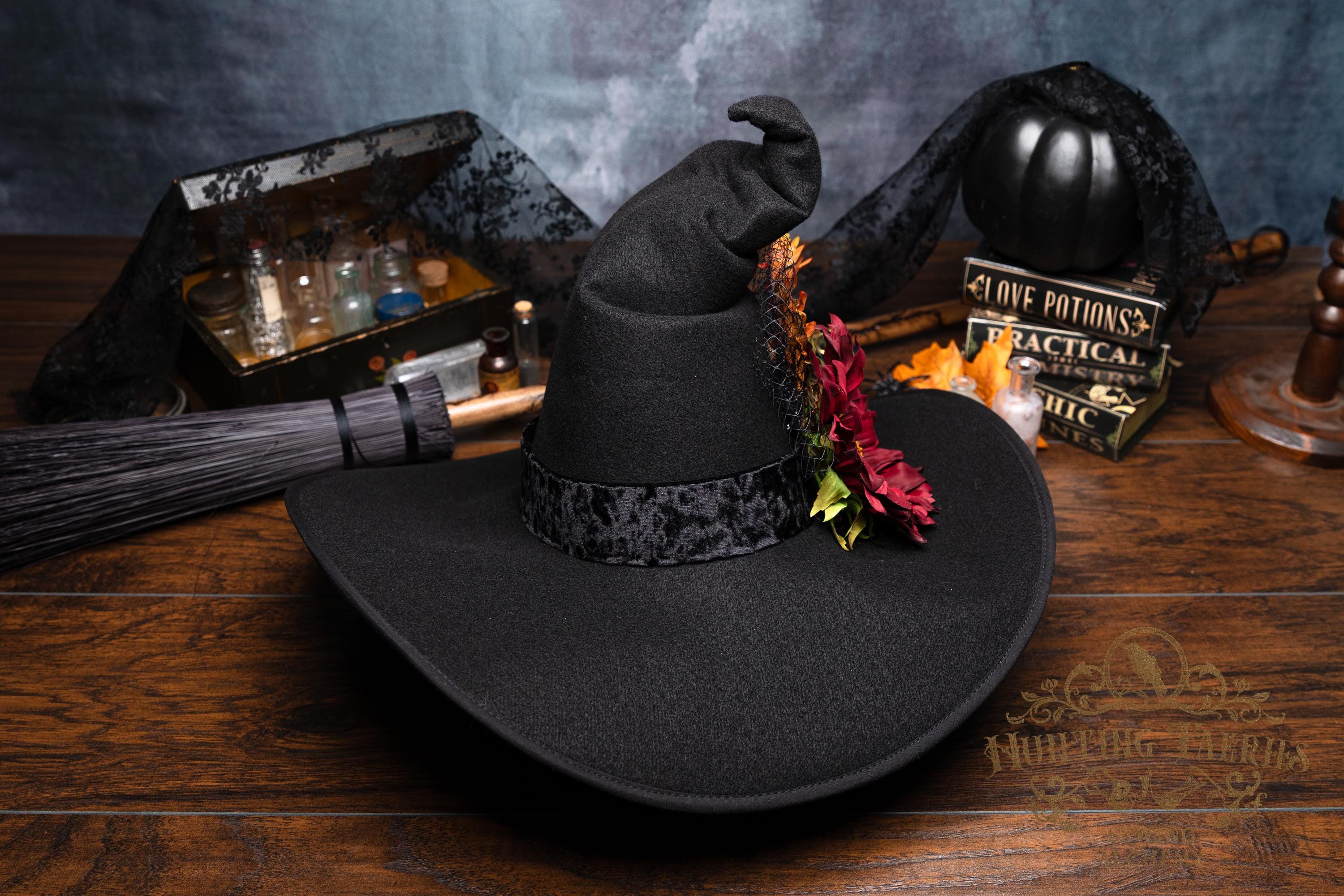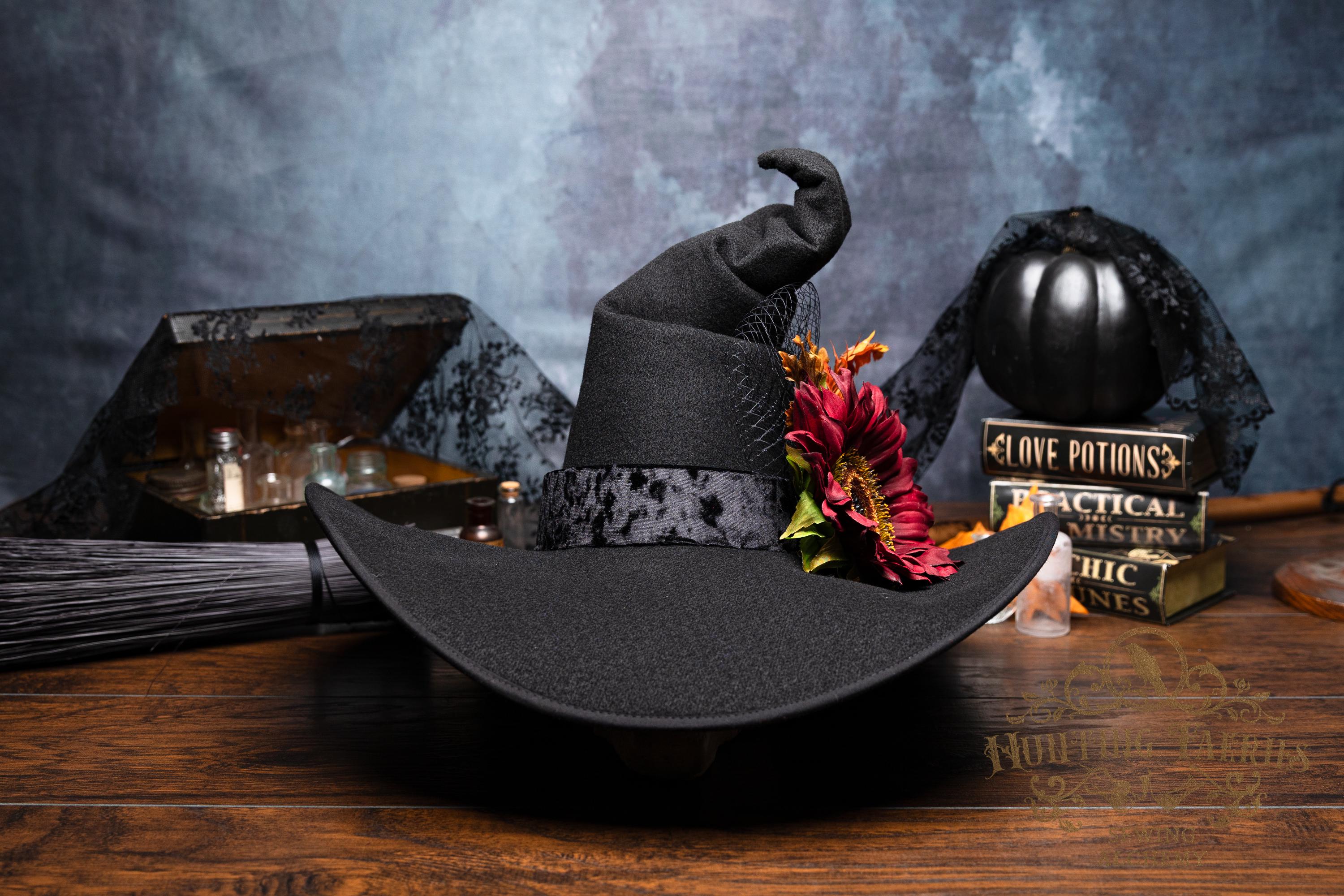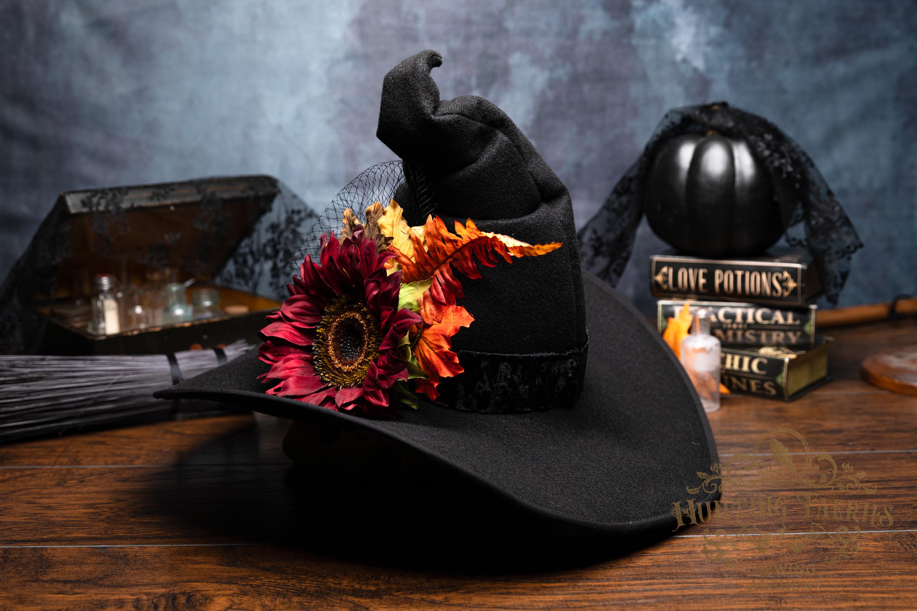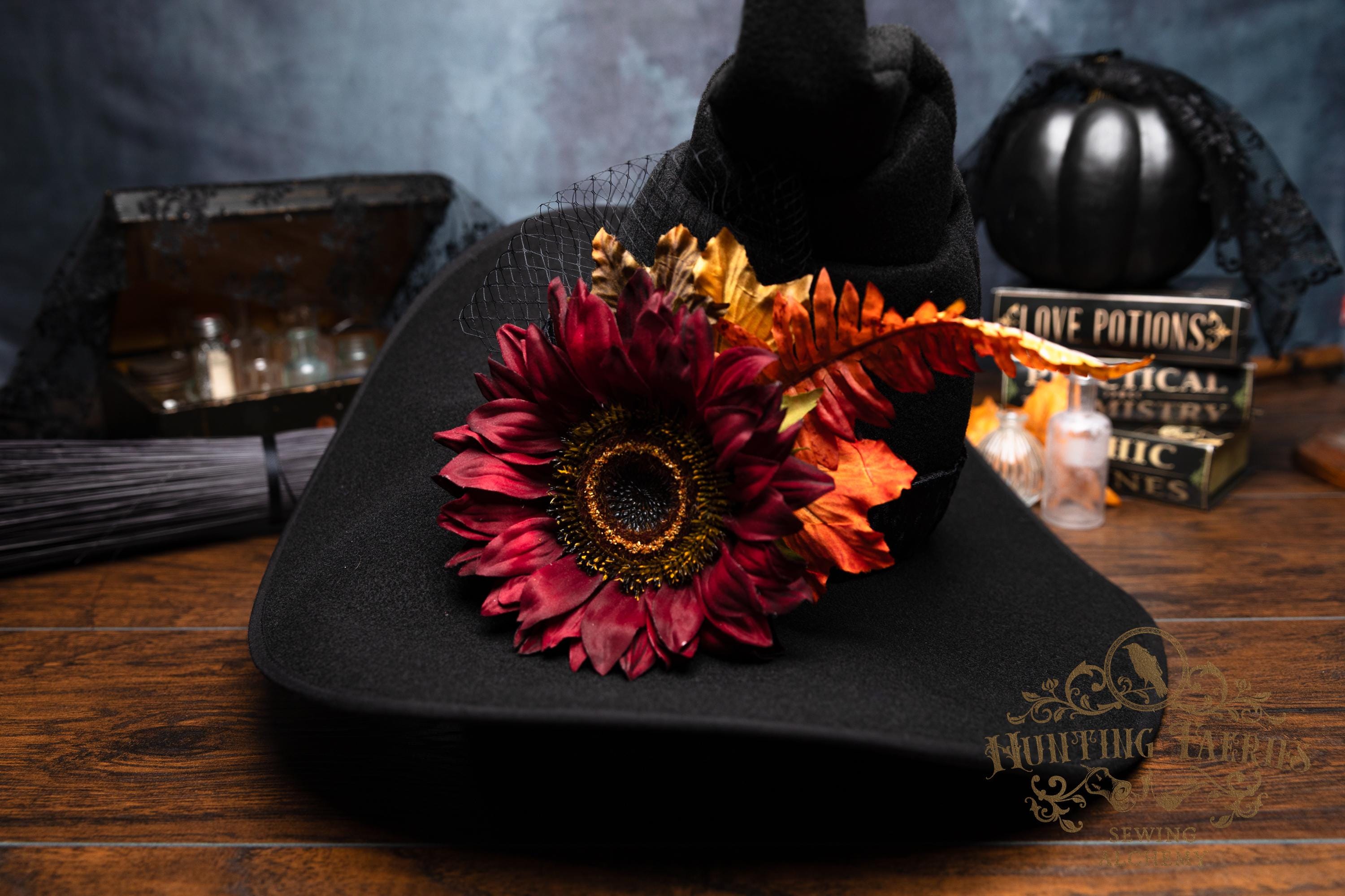 This wide-brimmed witch hat is made of black vegan-friendly felt. It offers a classic dark look with a crooked cone and wired brim. Its wide brim has 2 layers of magic stitched together for a great look and feel. Its edge is polished off with bias tape giving it a classy look. It has a black crushed velvet band around the cone and a Sunflower pin in the color of your choice at the side. Each pin is detachable and has a splash of tulle and veiling for added detail. This hat has the potential for good or evil. That choice is all yours. The brim is wired and exaggerated, it will make a statement wherever you go. This black witches hat would be great for a wizard or mage cosplay, ren faire costume or everyday wear! The possibilities are only limited by your imagination!