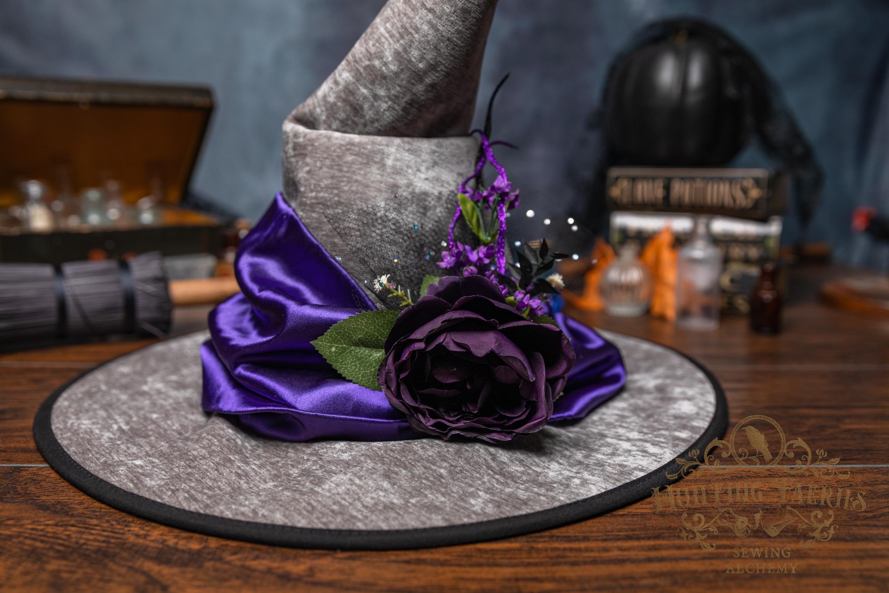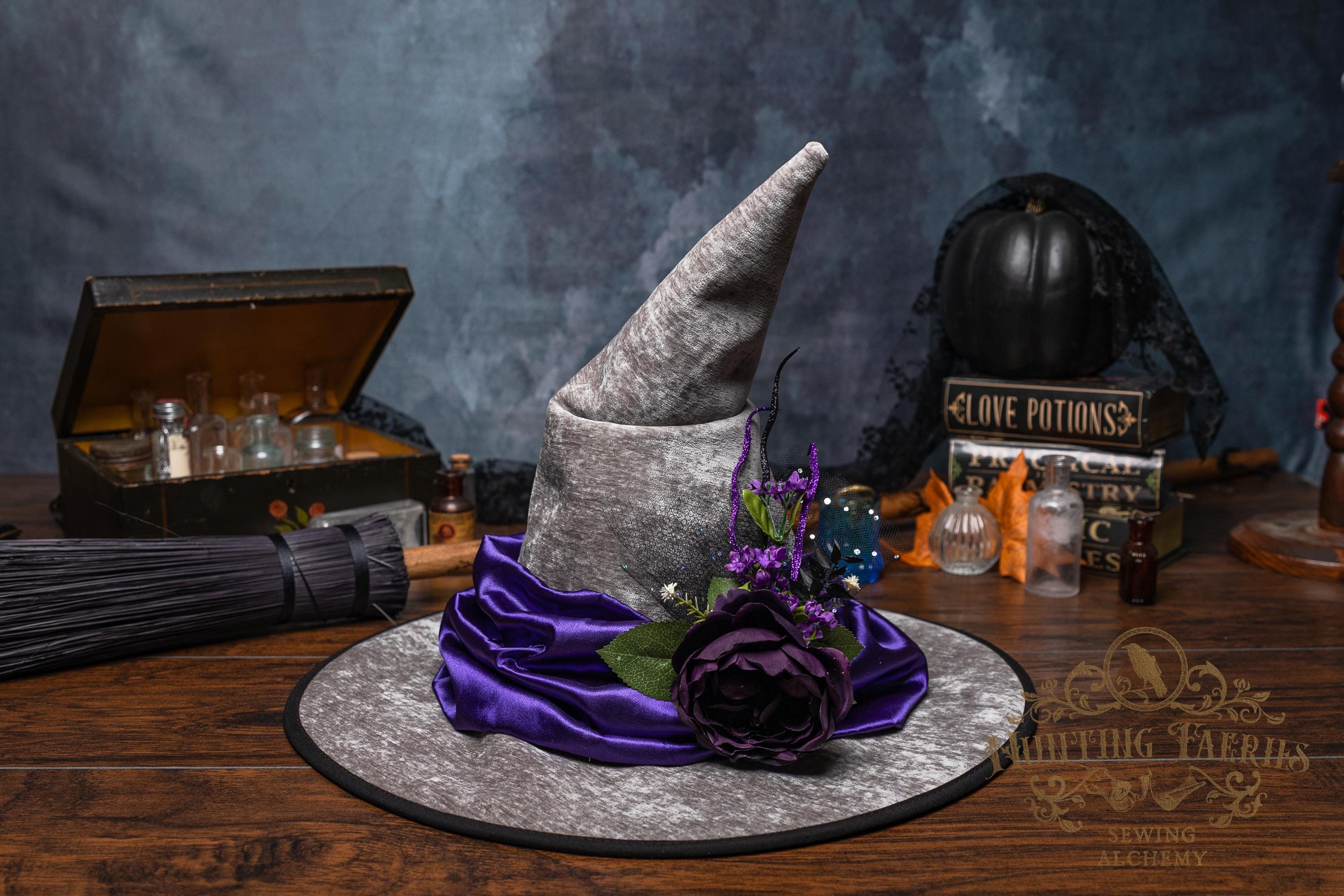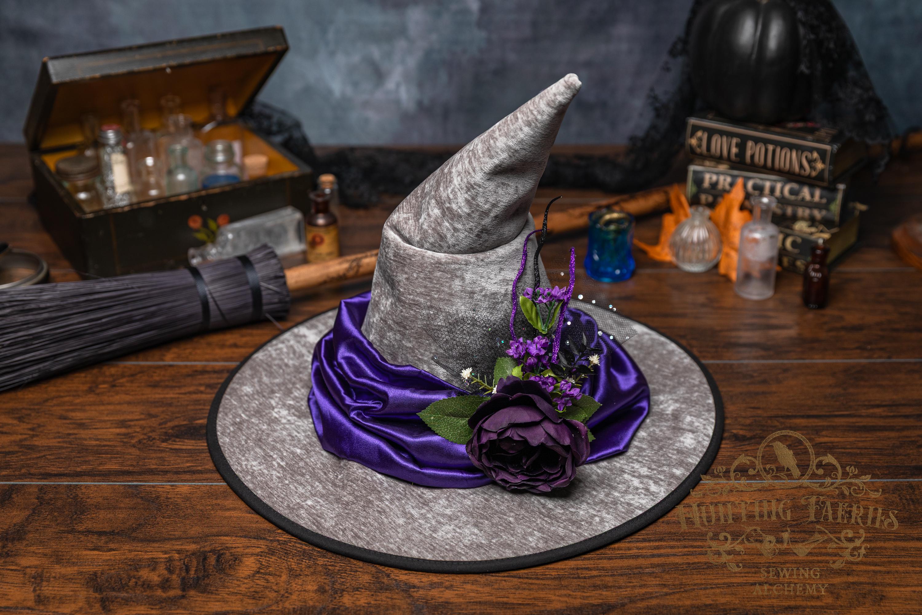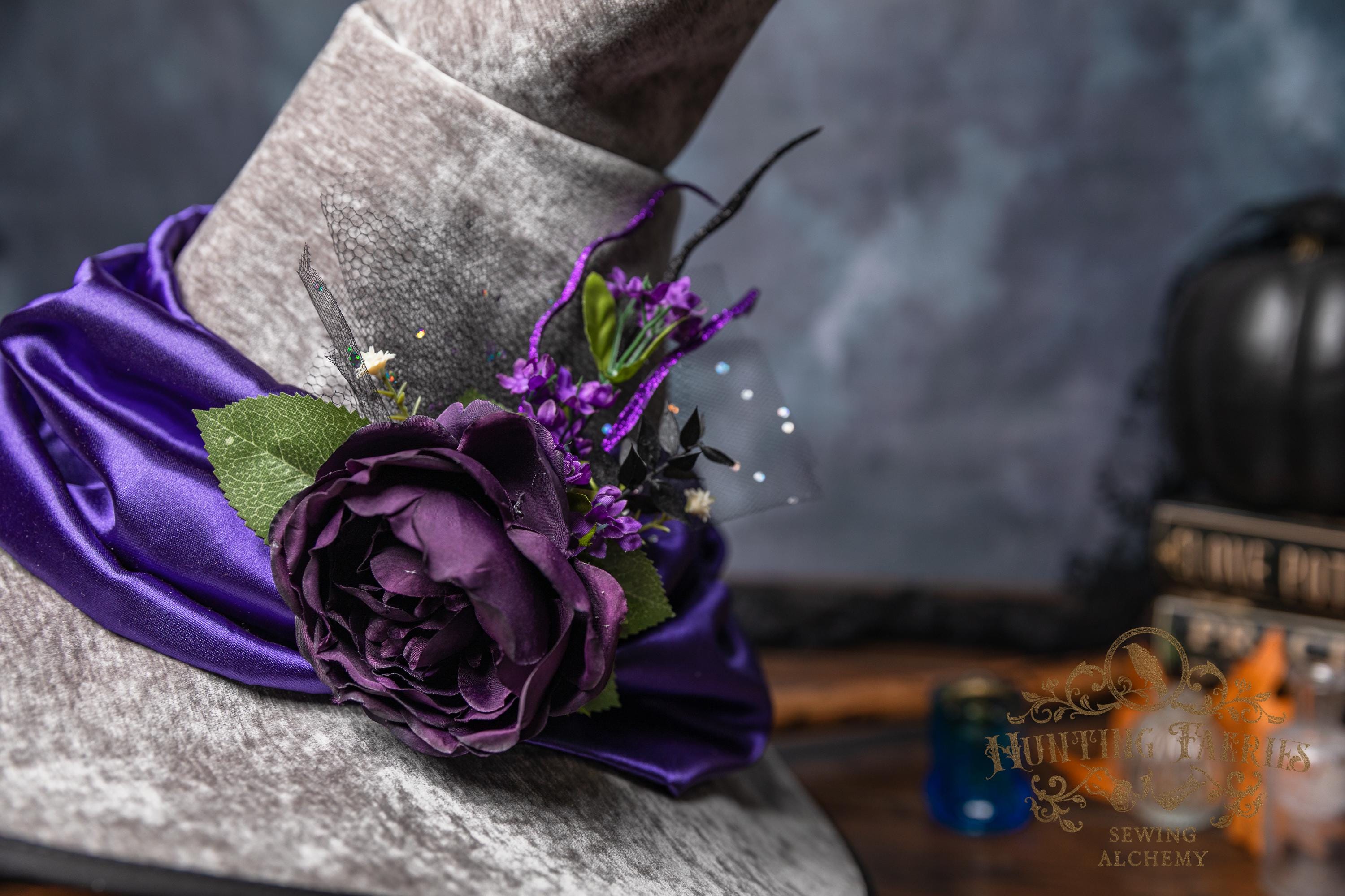This witch hat is made from grey colored chenille fabric with a purple satin scarf band encircling a side crooked cone. The brim features three layers of magic stitched together and polished off with black bias tape. The underside and inside cone is black felt, which helps the hat maintain its shape, and it absorbs that extra moonlight as you fly through those October skies. The side of the hat is adorned with a small cluster of purple flowers and foliage. It is removable, allowing you to decorate it to suit your own personal style or change it up to match your witch ensemble.