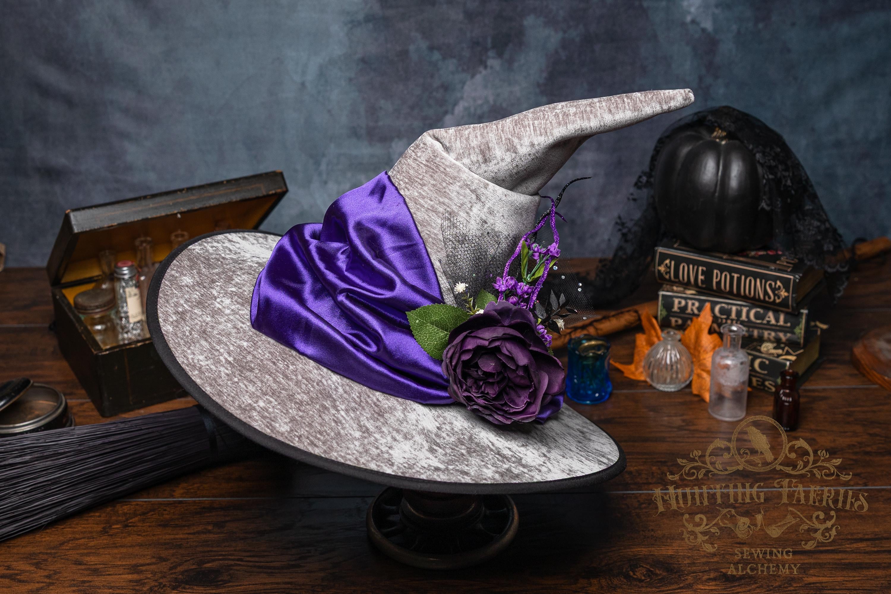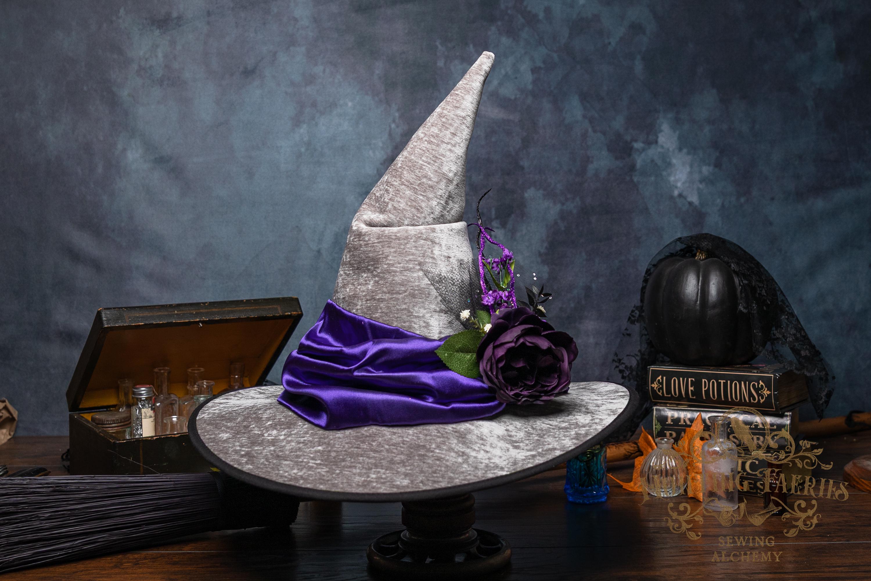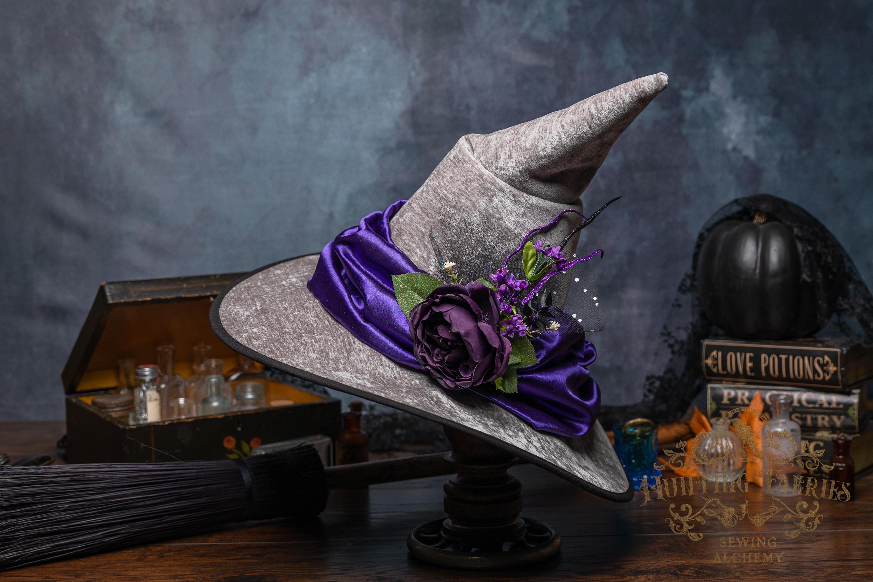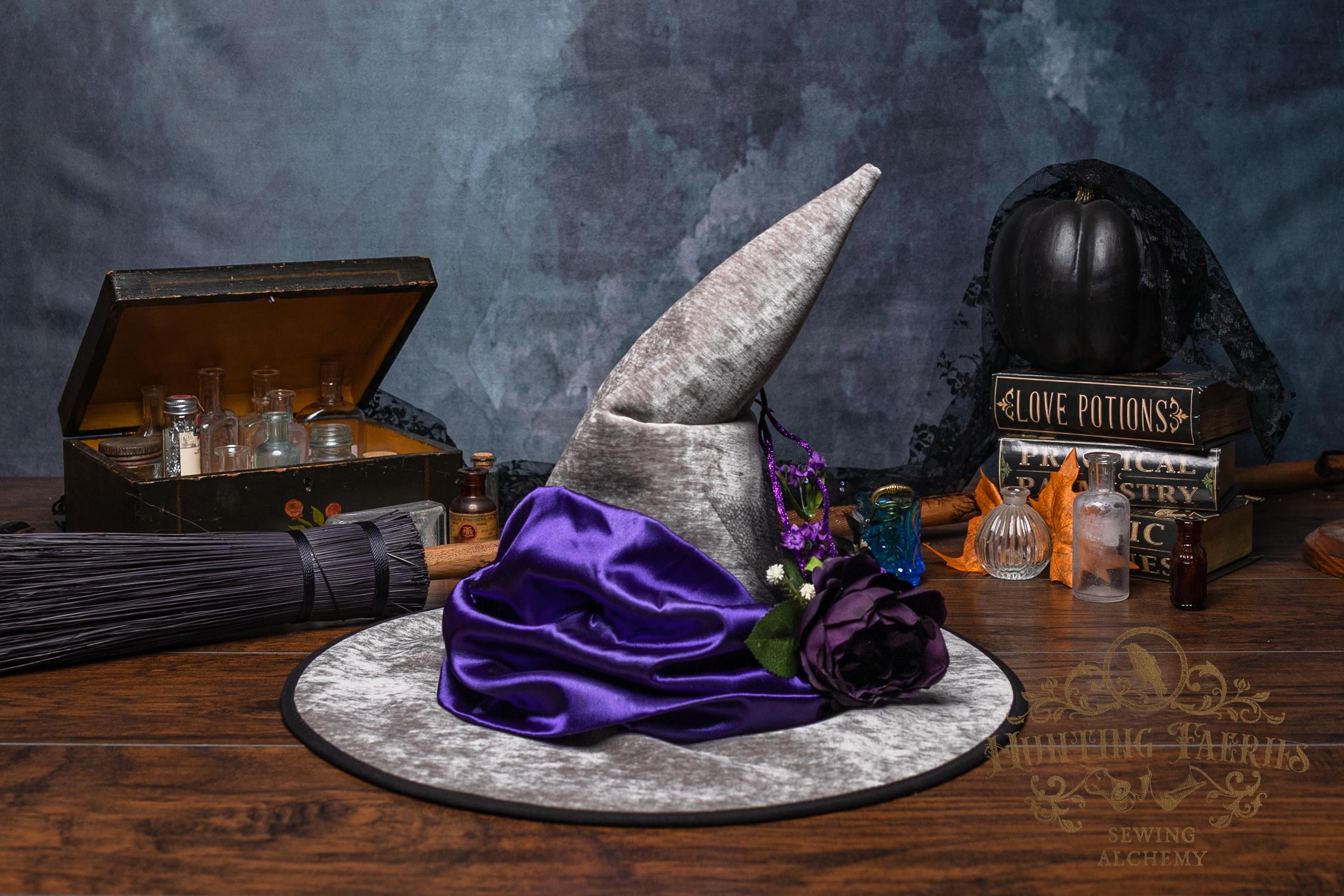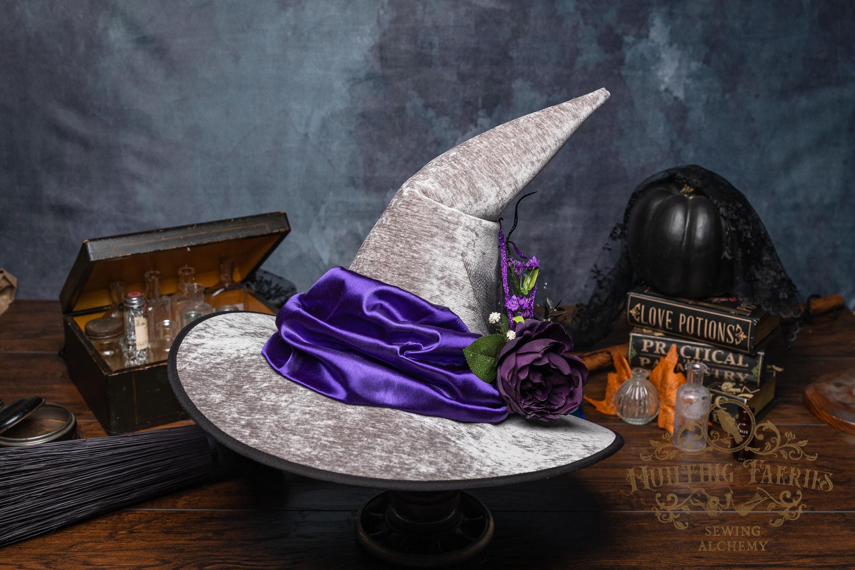 This witch hat is made from grey colored chenille fabric with a purple satin scarf band encircling a side crooked cone. The brim features three layers of magic stitched together and polished off with black bias tape. The underside and inside cone is black felt, which helps the hat maintain its shape, and it absorbs that extra moonlight as you fly through those October skies. The side of the hat is adorned with a small cluster of purple flowers and foliage. It is removable, allowing you to decorate it to suit your own personal style or change it up to match your witch ensemble.