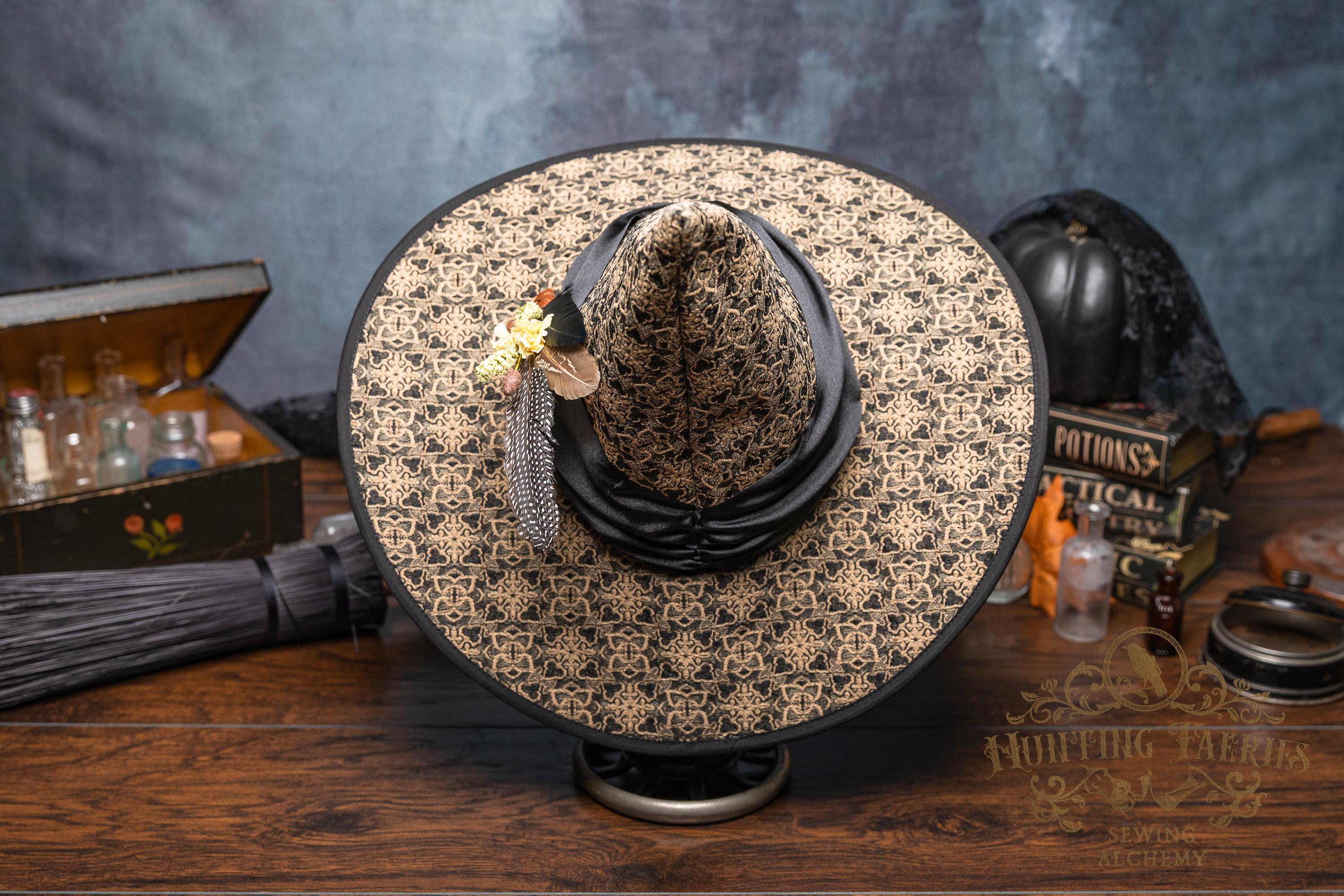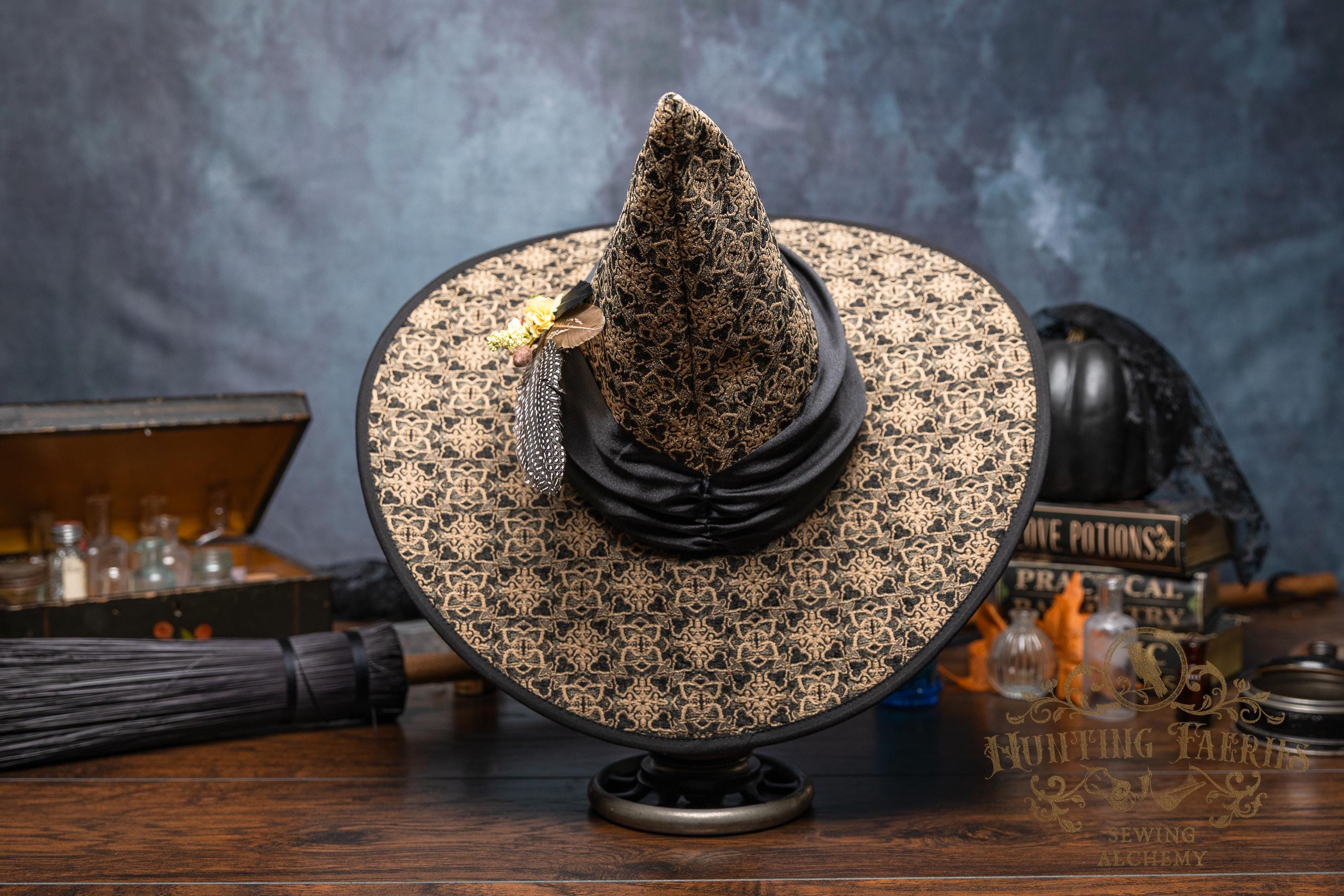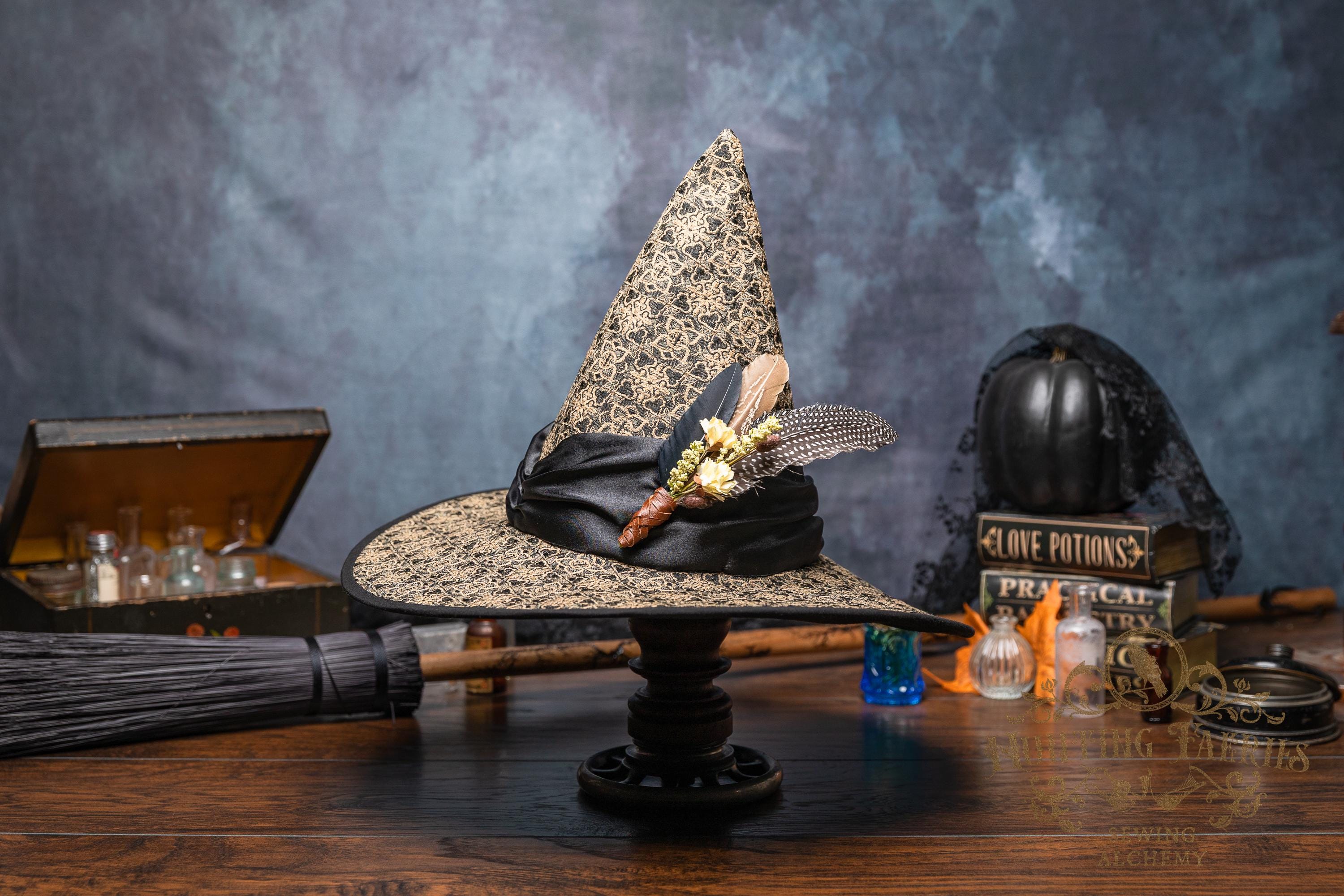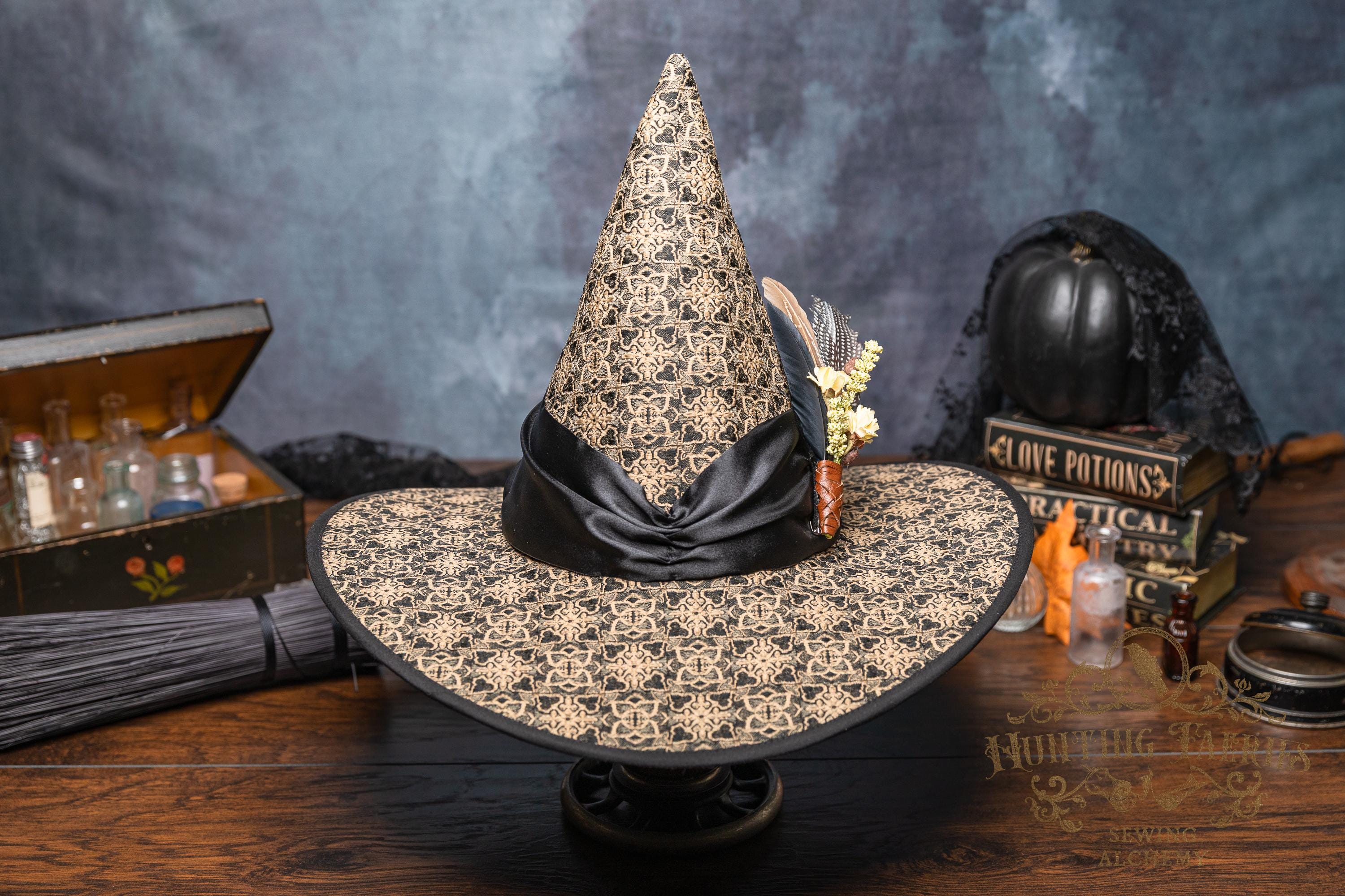 This witch hat is made from a vintage, woven fabric in brown and black. The band is black satin encircling the pointed cone. It's for the trendy good witch looking for an old-timey vibe. The person wearing this is headed out to lurk in the shadows. The mid-sized brim features three layers of magic stitched together. Under the brim is black felt, which helps the hat maintain its shape, and it absorbs that extra moonlight as you fly through those October skies. It features a feather accent at the side with tied with black satin ribbon. The cone is lined in felt to maintain its shape and be a comfortable, soft fit. Simply bewitching!