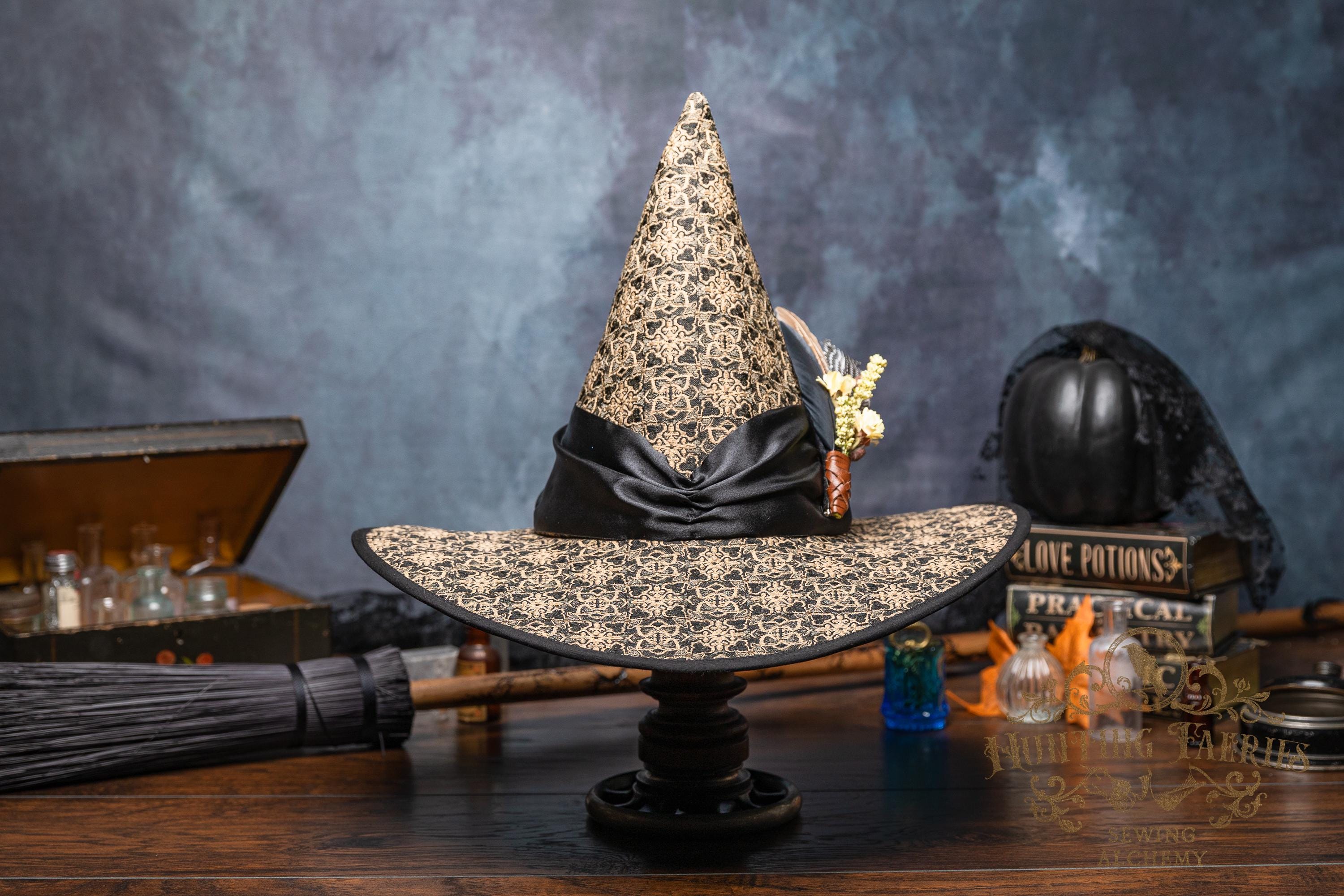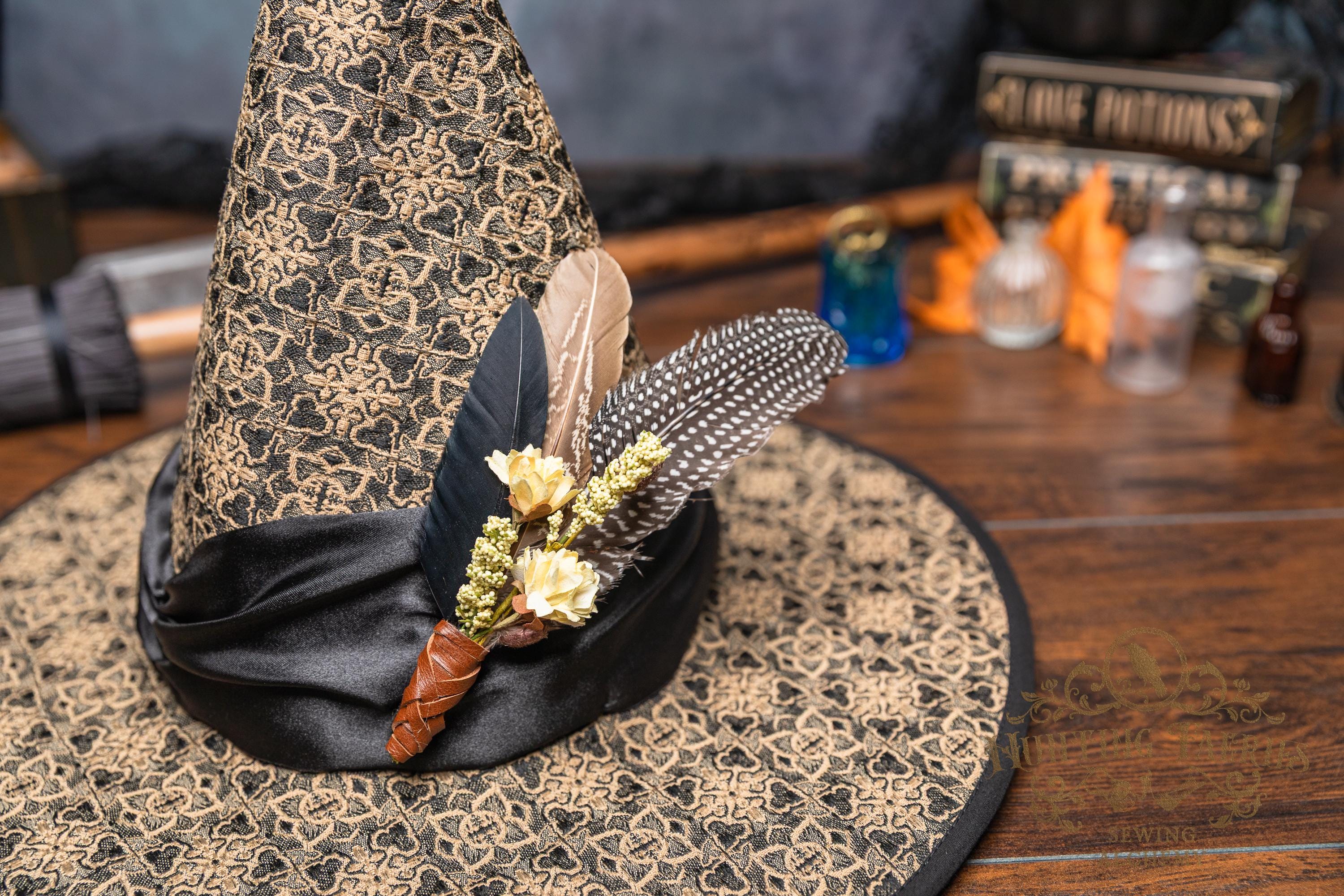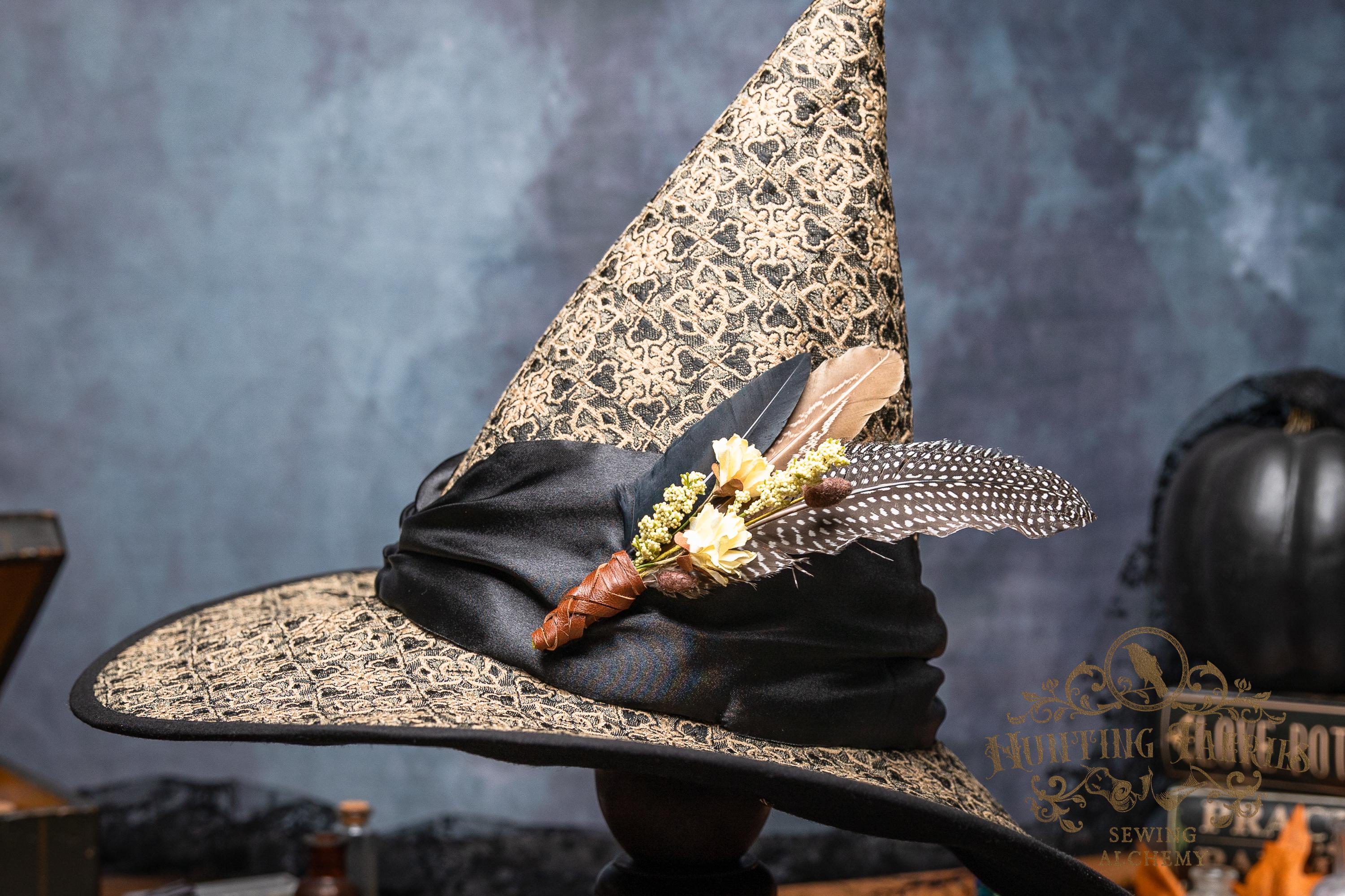 This witch hat is made from a vintage, woven fabric in brown and black. The band is black satin encircling the pointed cone. It's for the trendy good witch looking for an old-timey vibe. The person wearing this is headed out to lurk in the shadows. The mid-sized brim features three layers of magic stitched together. Under the brim is black felt, which helps the hat maintain its shape, and it absorbs that extra moonlight as you fly through those October skies. It features a feather accent at the side with tied with black satin ribbon. The cone is lined in felt to maintain its shape and be a comfortable, soft fit. Simply bewitching!