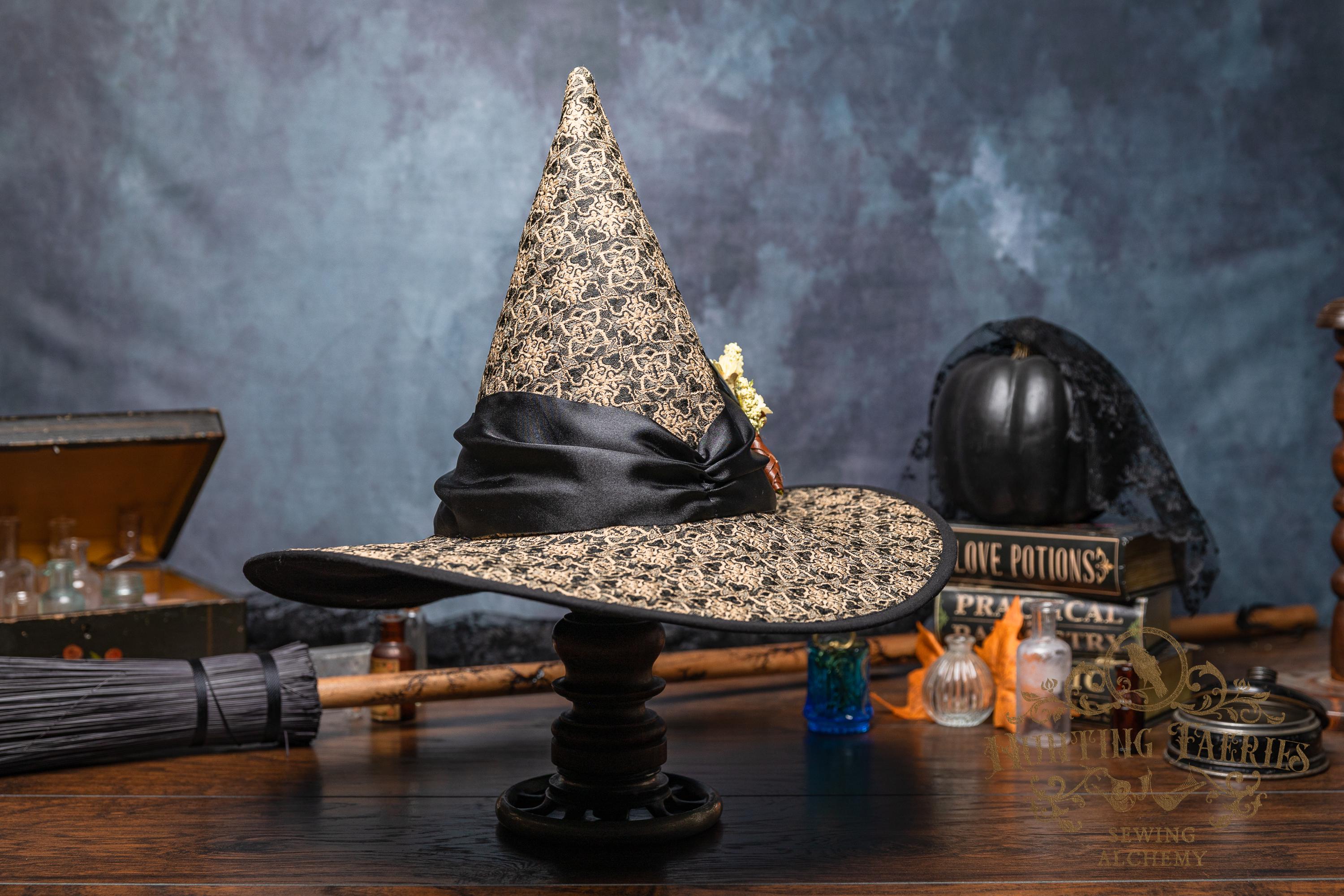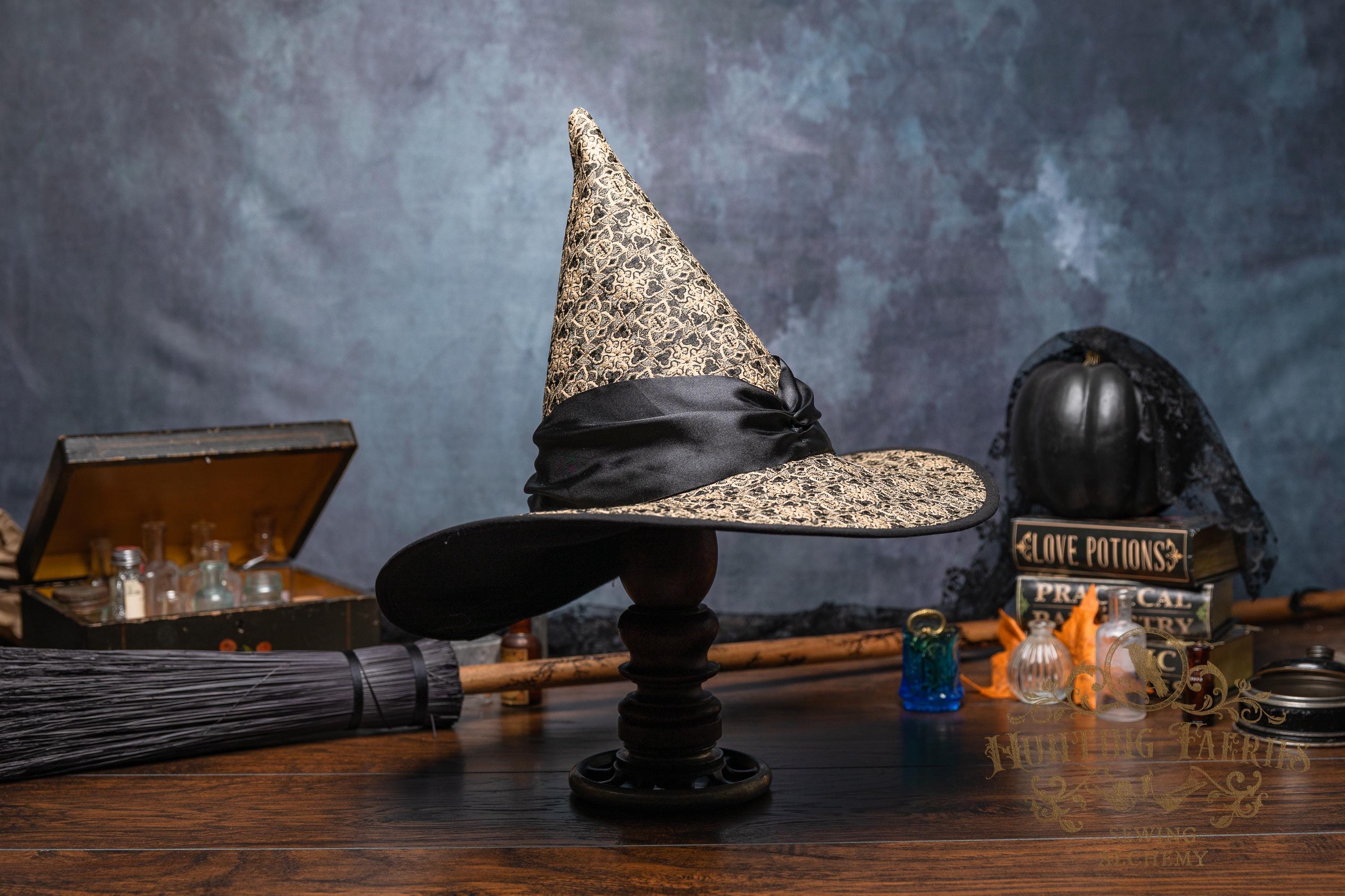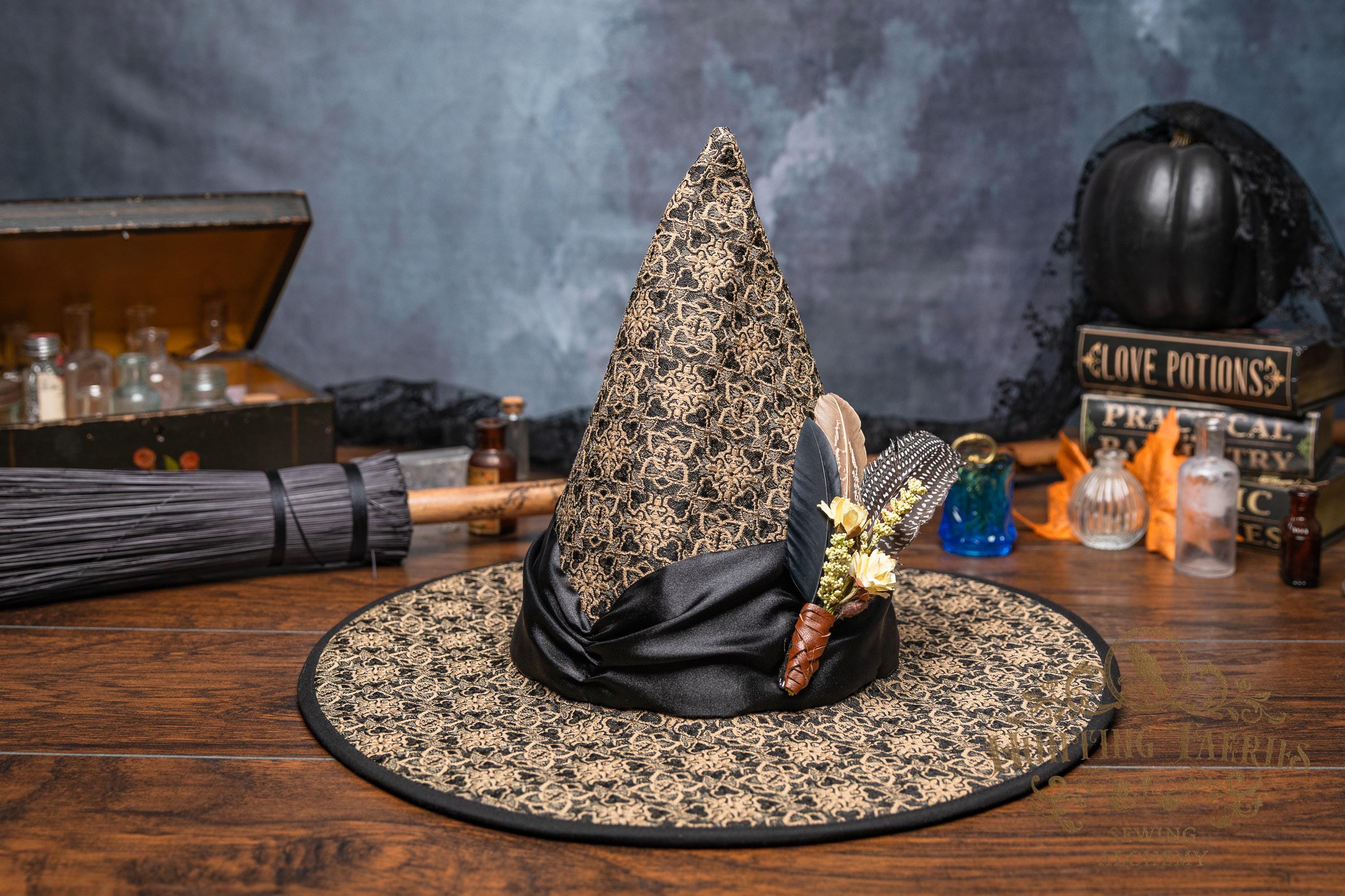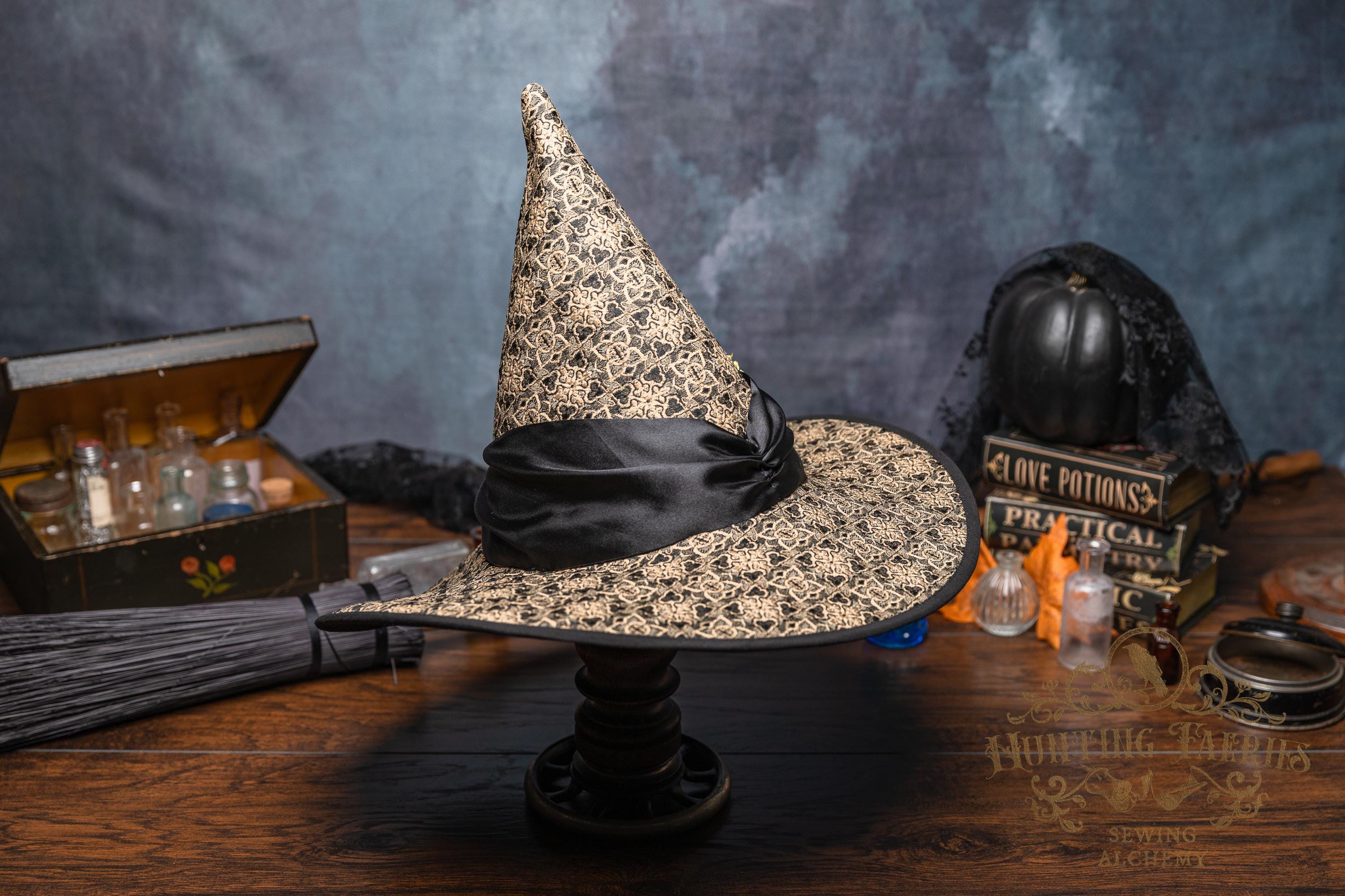 This witch hat is made from a vintage, woven fabric in brown and black. The band is black satin encircling the pointed cone. It's for the trendy good witch looking for an old-timey vibe. The person wearing this is headed out to lurk in the shadows. The mid-sized brim features three layers of magic stitched together. Under the brim is black felt, which helps the hat maintain its shape, and it absorbs that extra moonlight as you fly through those October skies. It features a feather accent at the side with tied with black satin ribbon. The cone is lined in felt to maintain its shape and be a comfortable, soft fit. Simply bewitching!