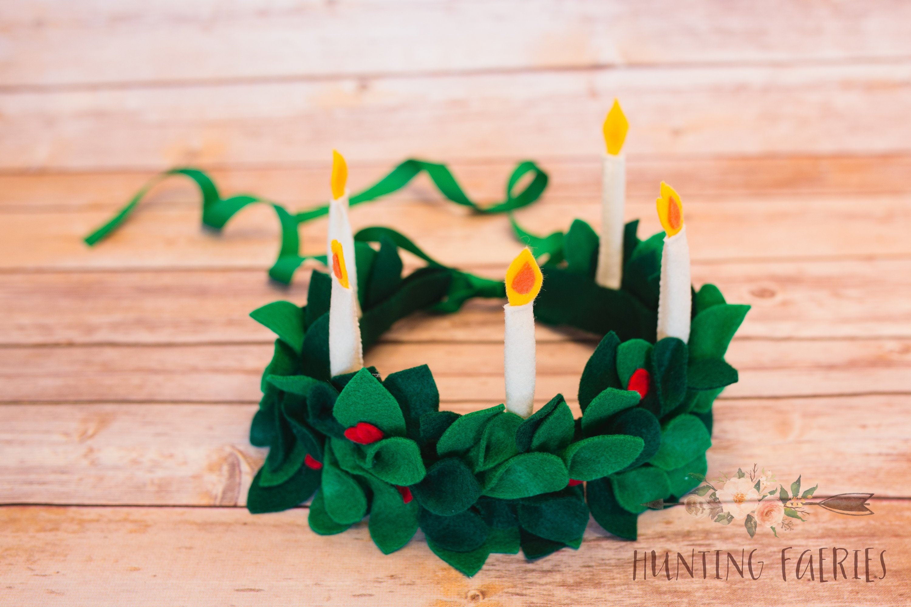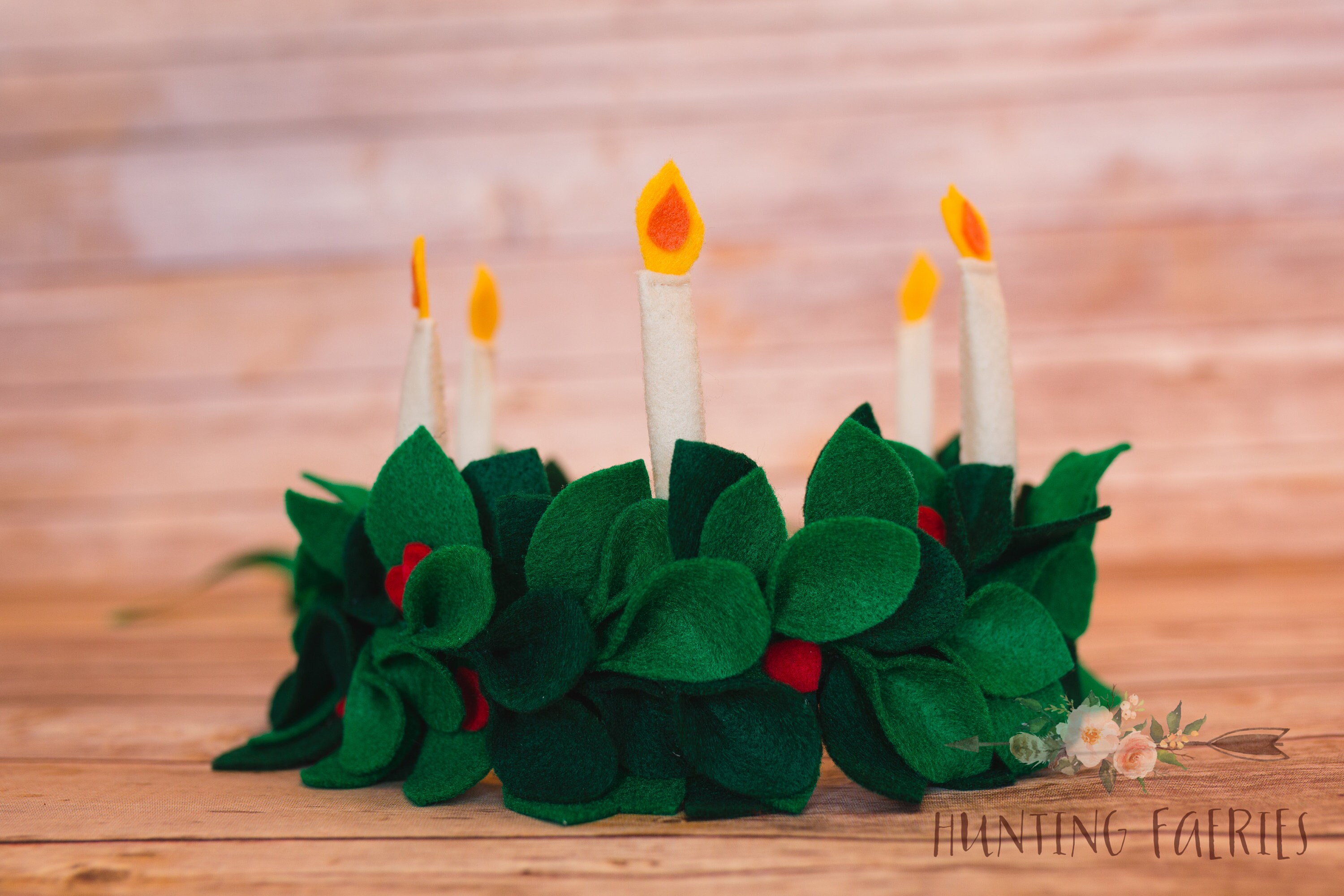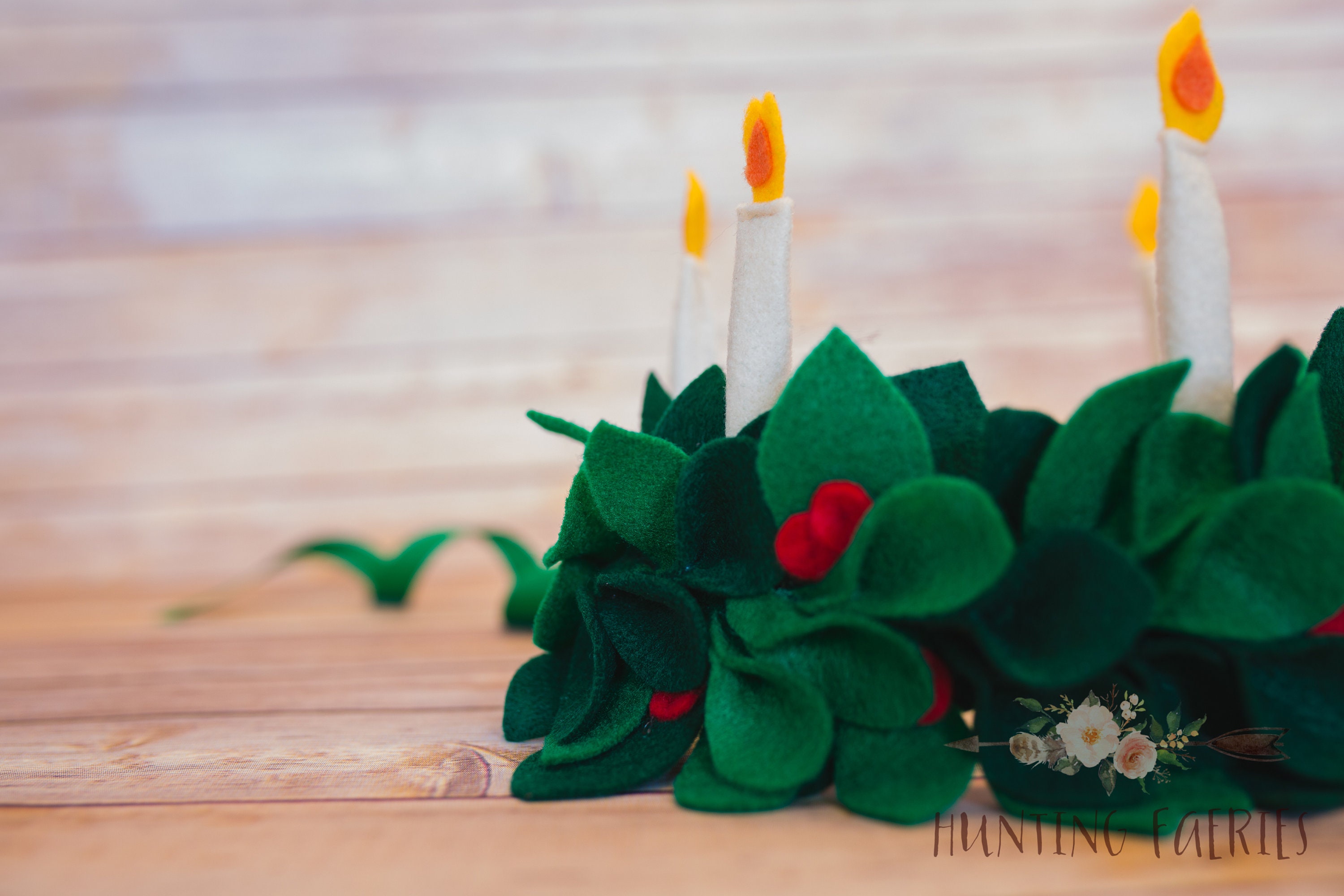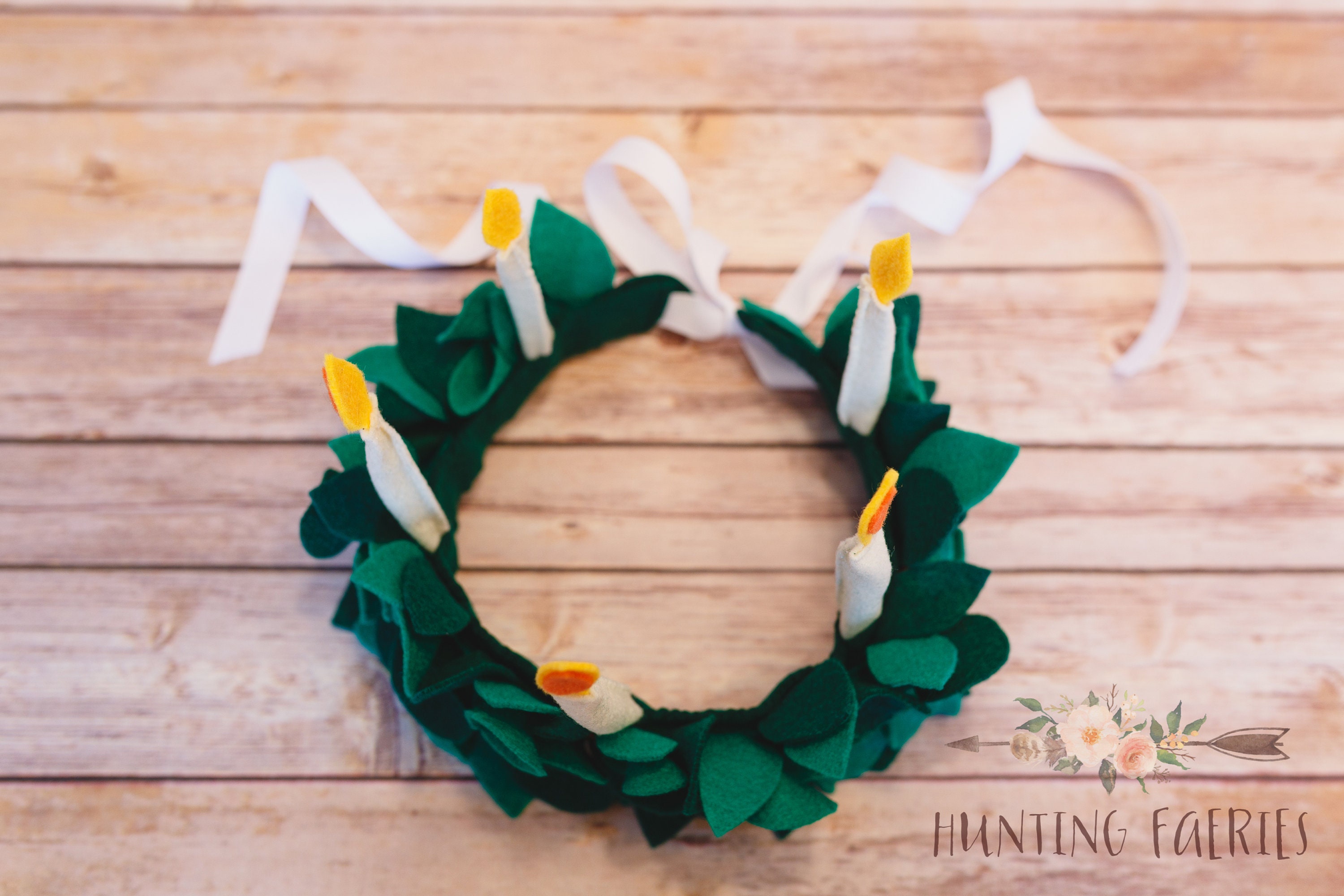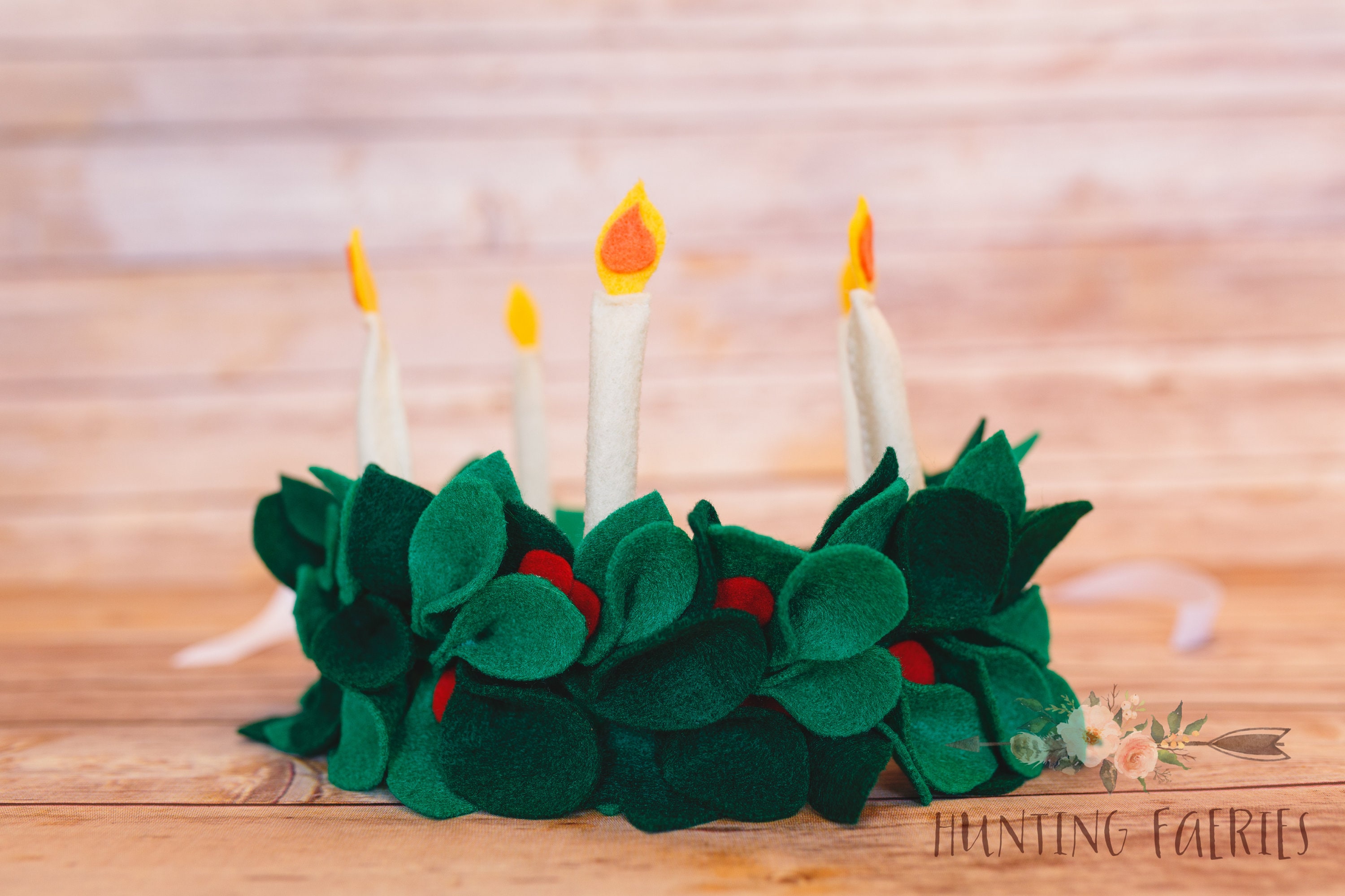 Look what those clever fairies have left on my doorstep today! Something for those who celebrate St. Lucia's Day. The fairies have collected all the Lingonberry leaves from the forest and created lovely little crowns for little girls celebrating St. Lucia's Day. No two are the same. They have been painstakingly created from fresh (felt) leaves and a few (felt)red berries. The candles have been lit and are aglow with warmth. Each is just as lovely as the next and infused with love and a little bit of faerie magic!