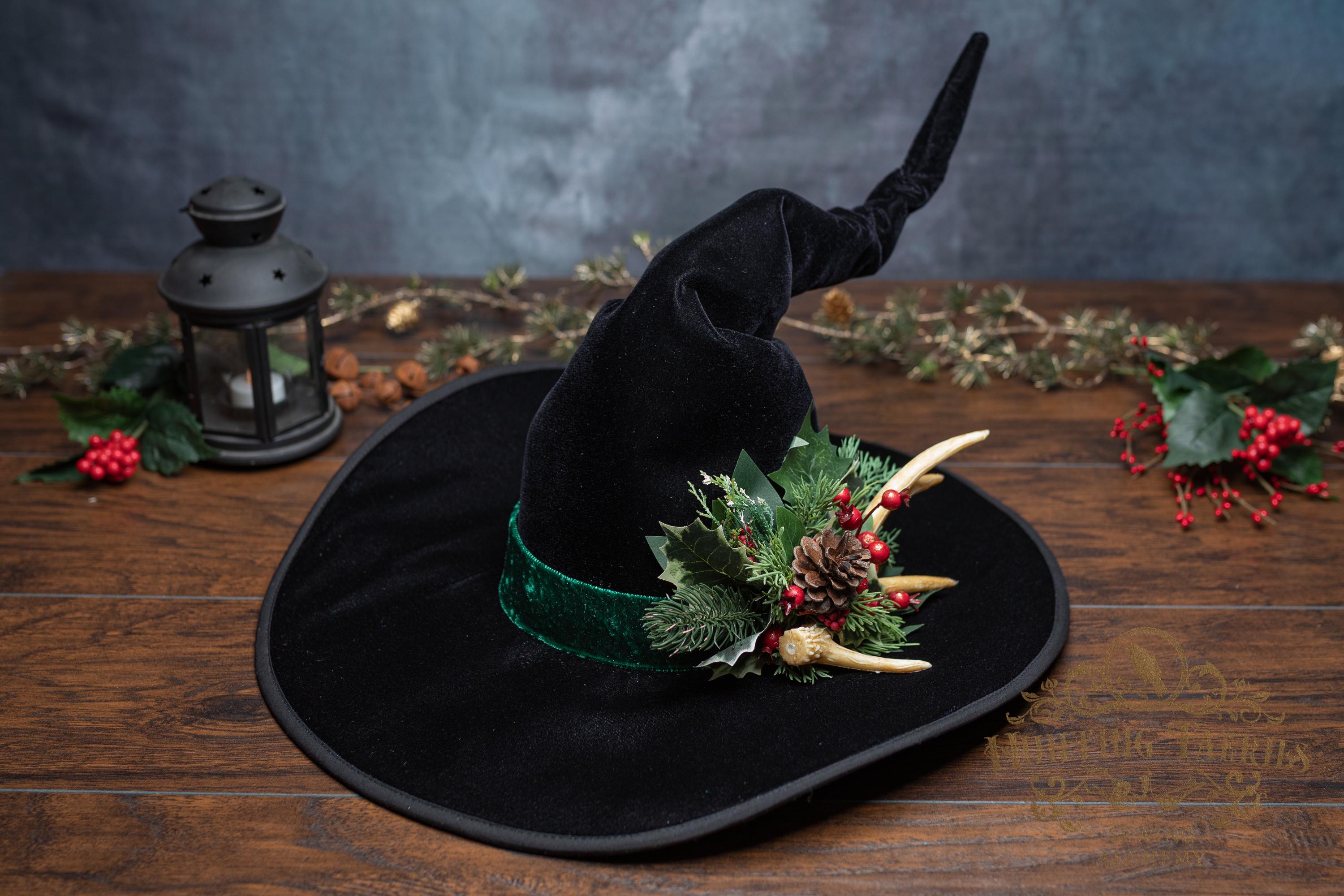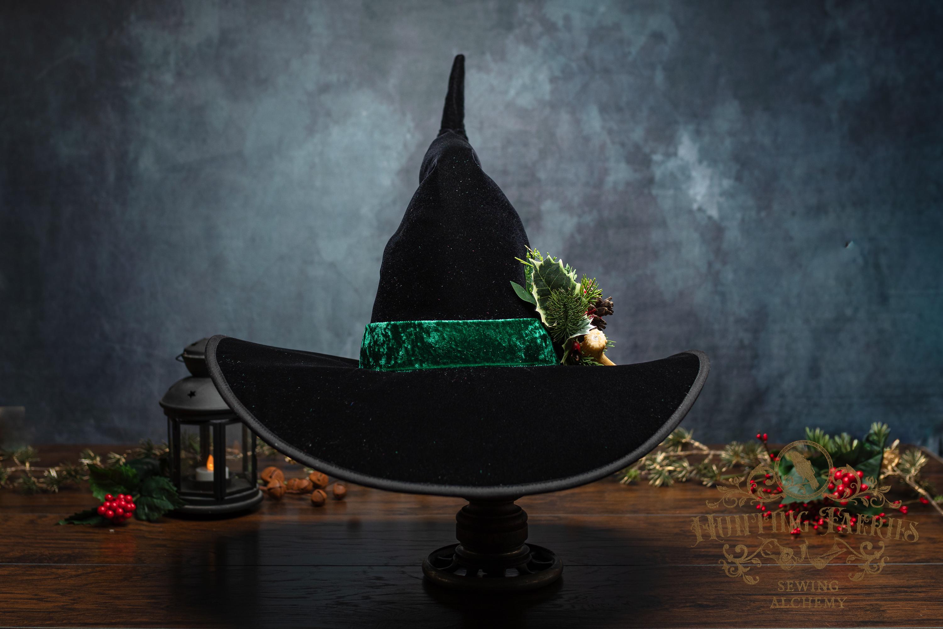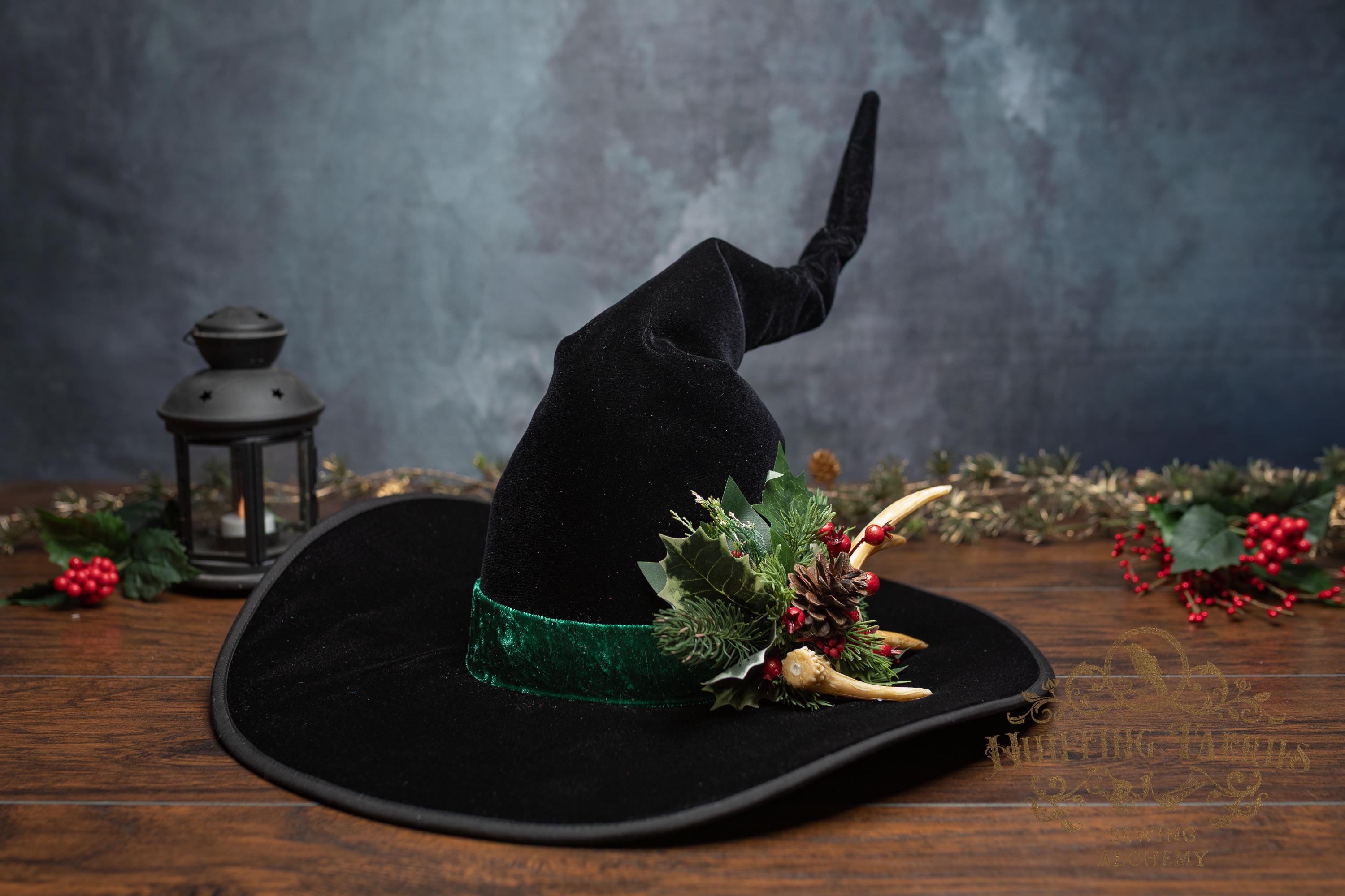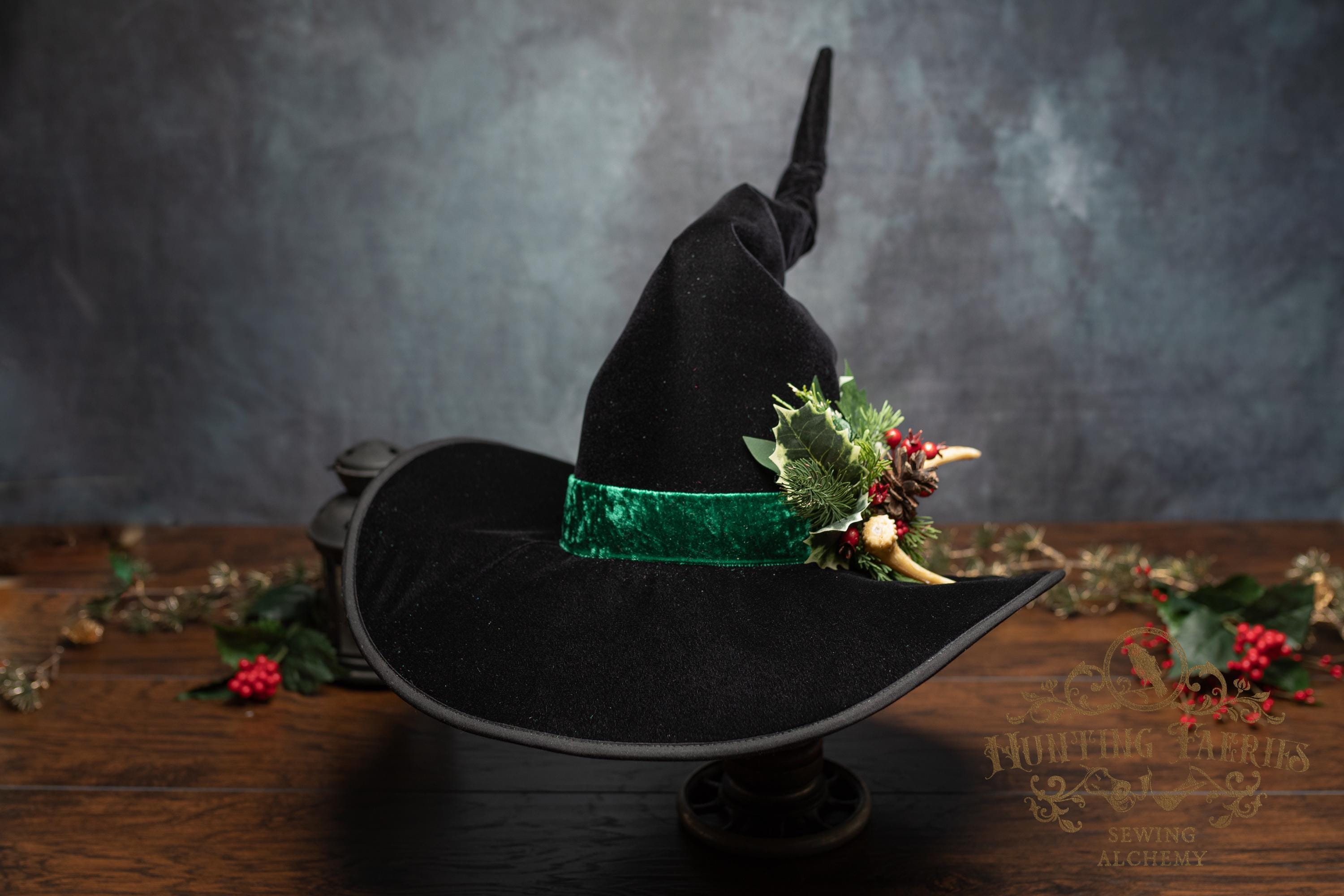This witch hat is made of black velvet with a green crushed velvet band wrapped around the cone. There is a lovely pin at the side with seasonal greens wrapped around a faux deer antler. The edges are finished with bias tape giving it a clean polished look. There are three layers of fabric to stabilize the hats cone and brim, with the underlayer in premium felt. When your festivities are over simply take off the pin and you have a lovely hat for other occasions.