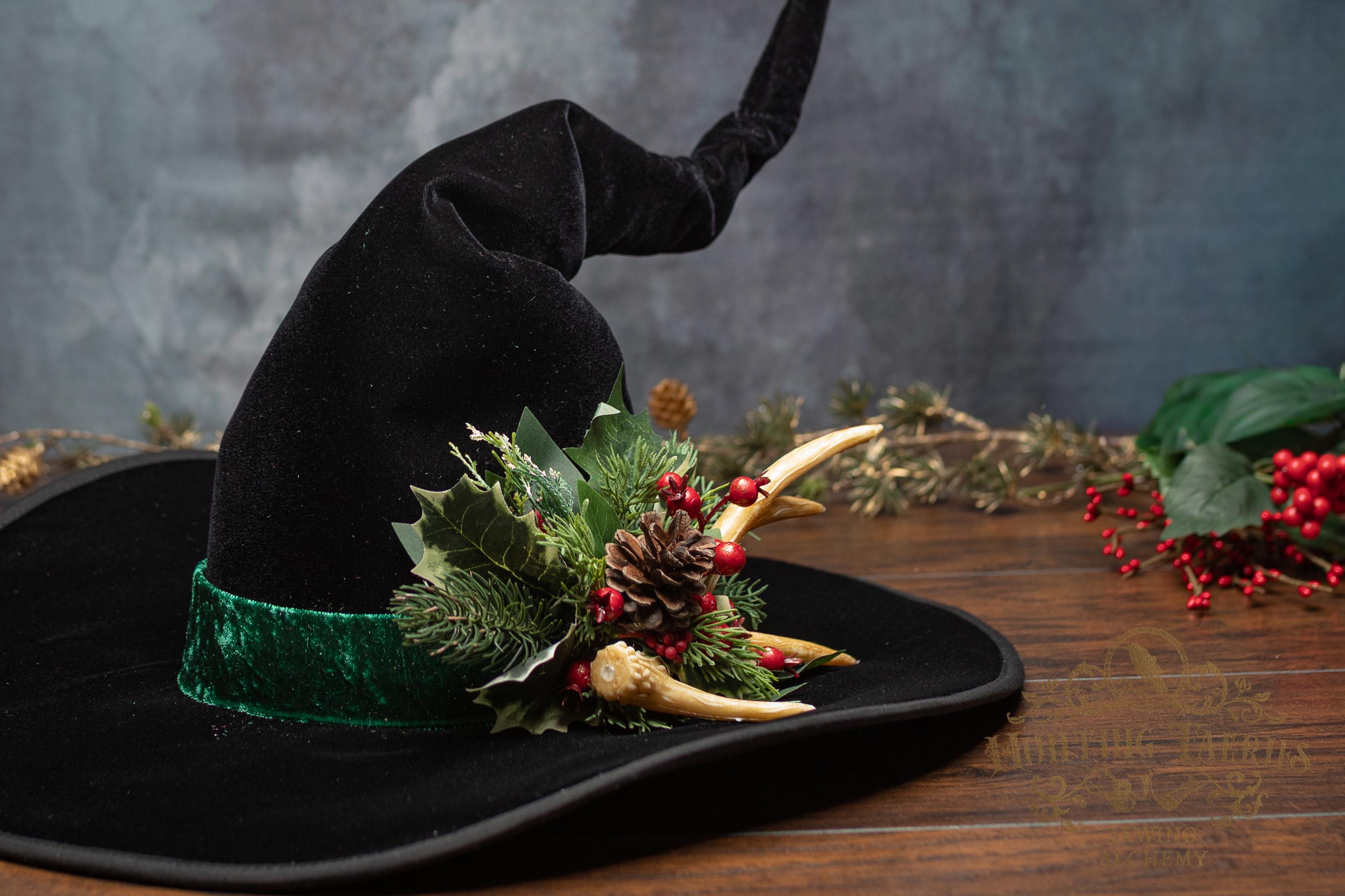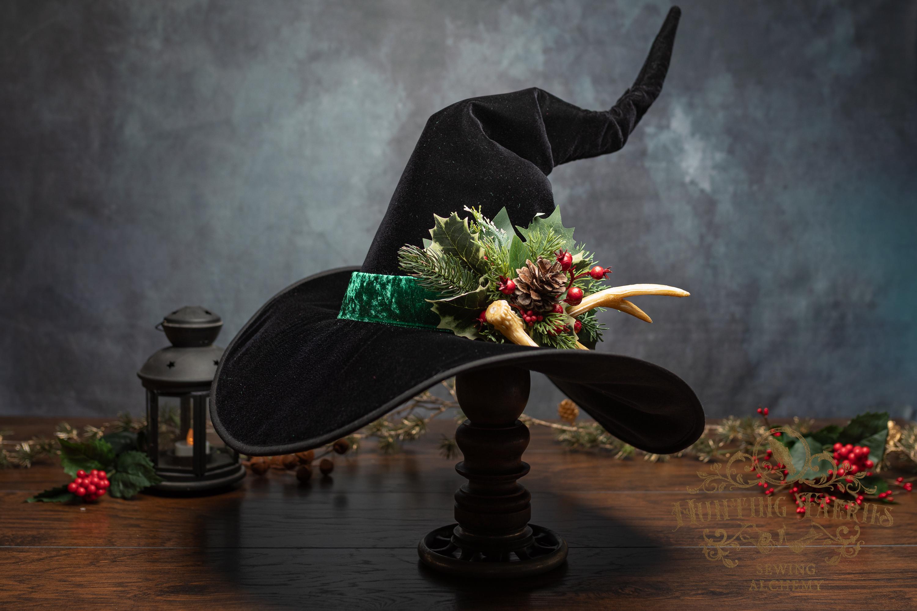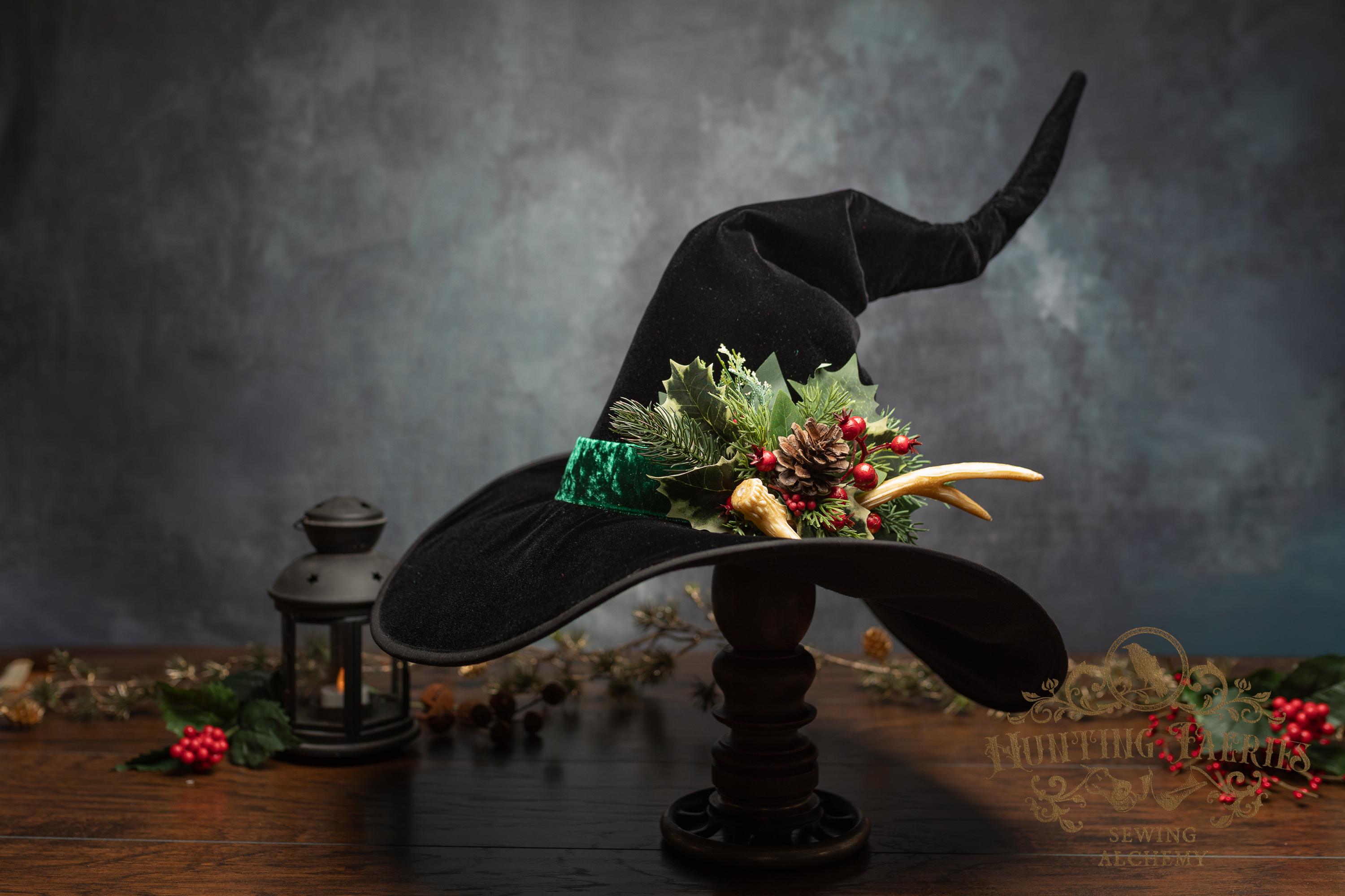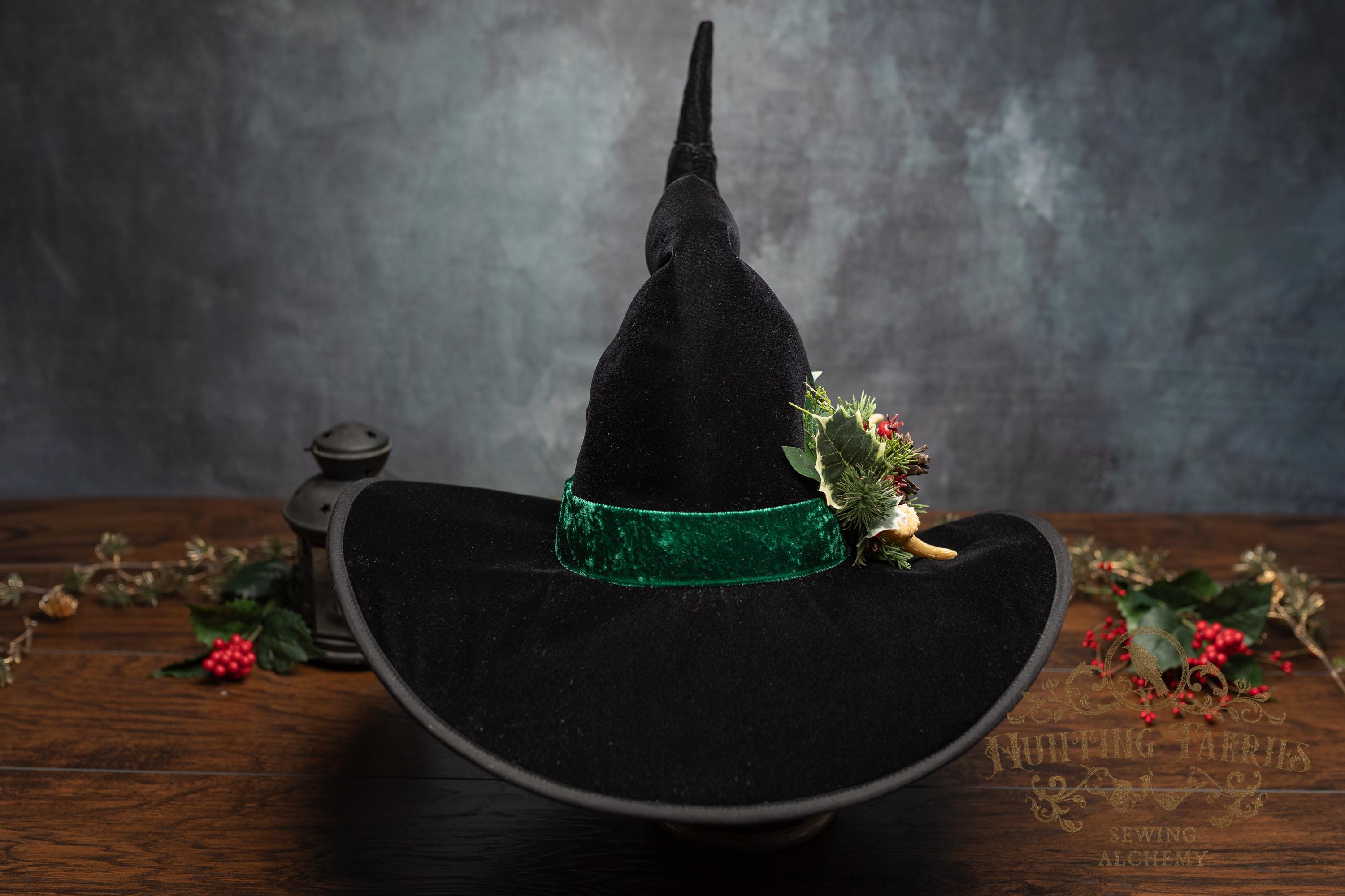 This witch hat is made of black velvet with a green crushed velvet band wrapped around the cone. There is a lovely pin at the side with seasonal greens wrapped around a faux deer antler. The edges are finished with bias tape giving it a clean polished look. There are three layers of fabric to stabilize the hats cone and brim, with the underlayer in premium felt. When your festivities are over simply take off the pin and you have a lovely hat for other occasions.
