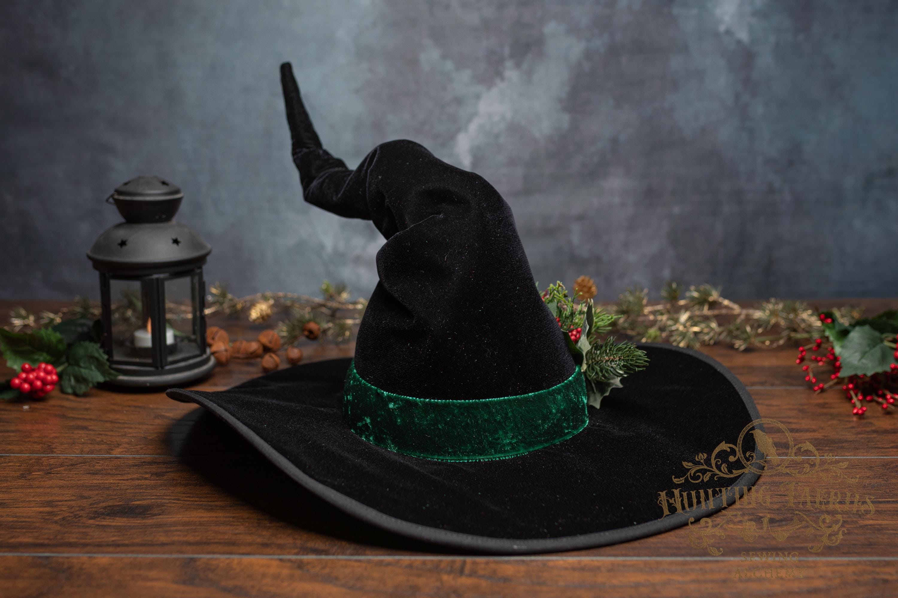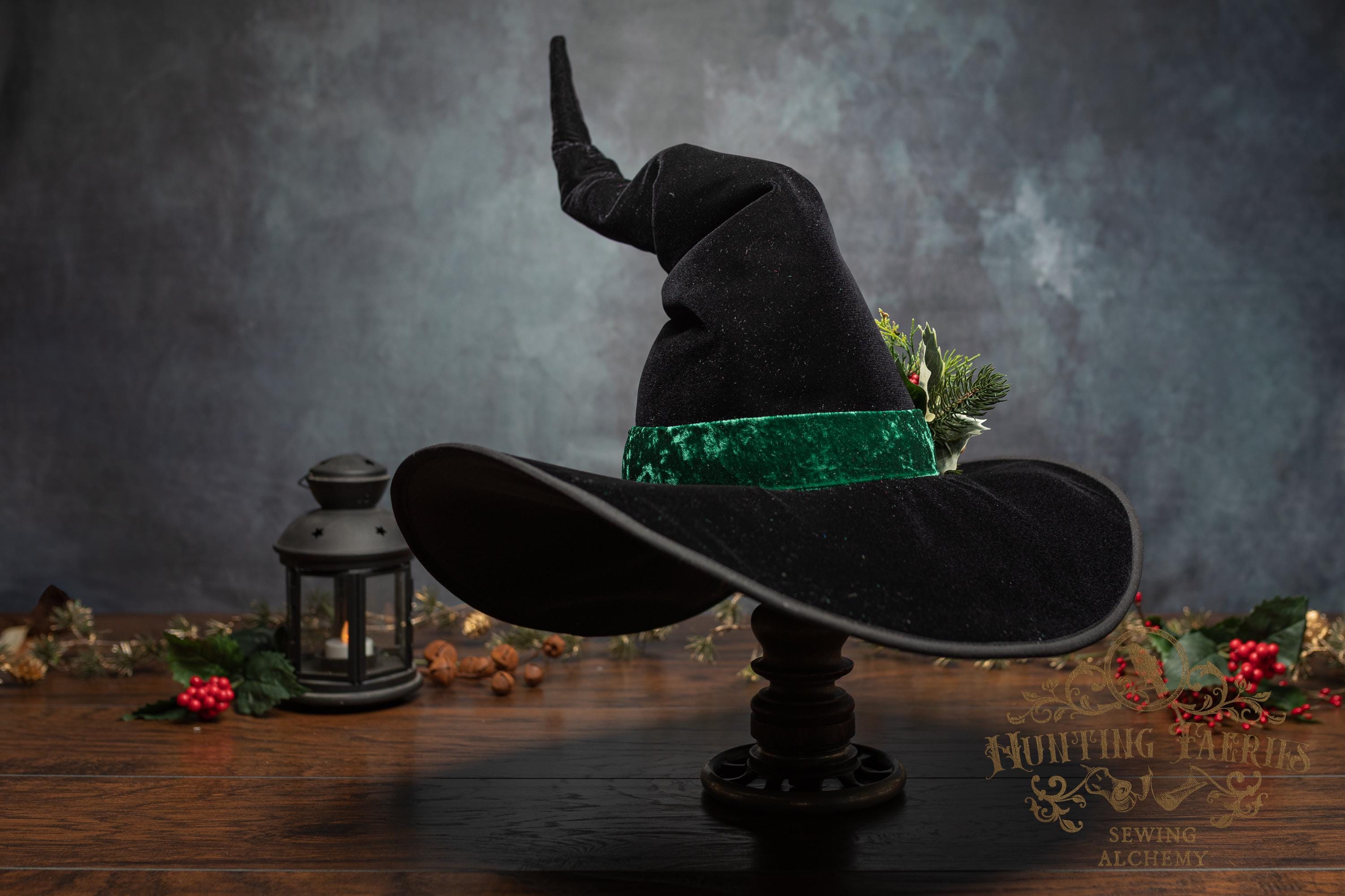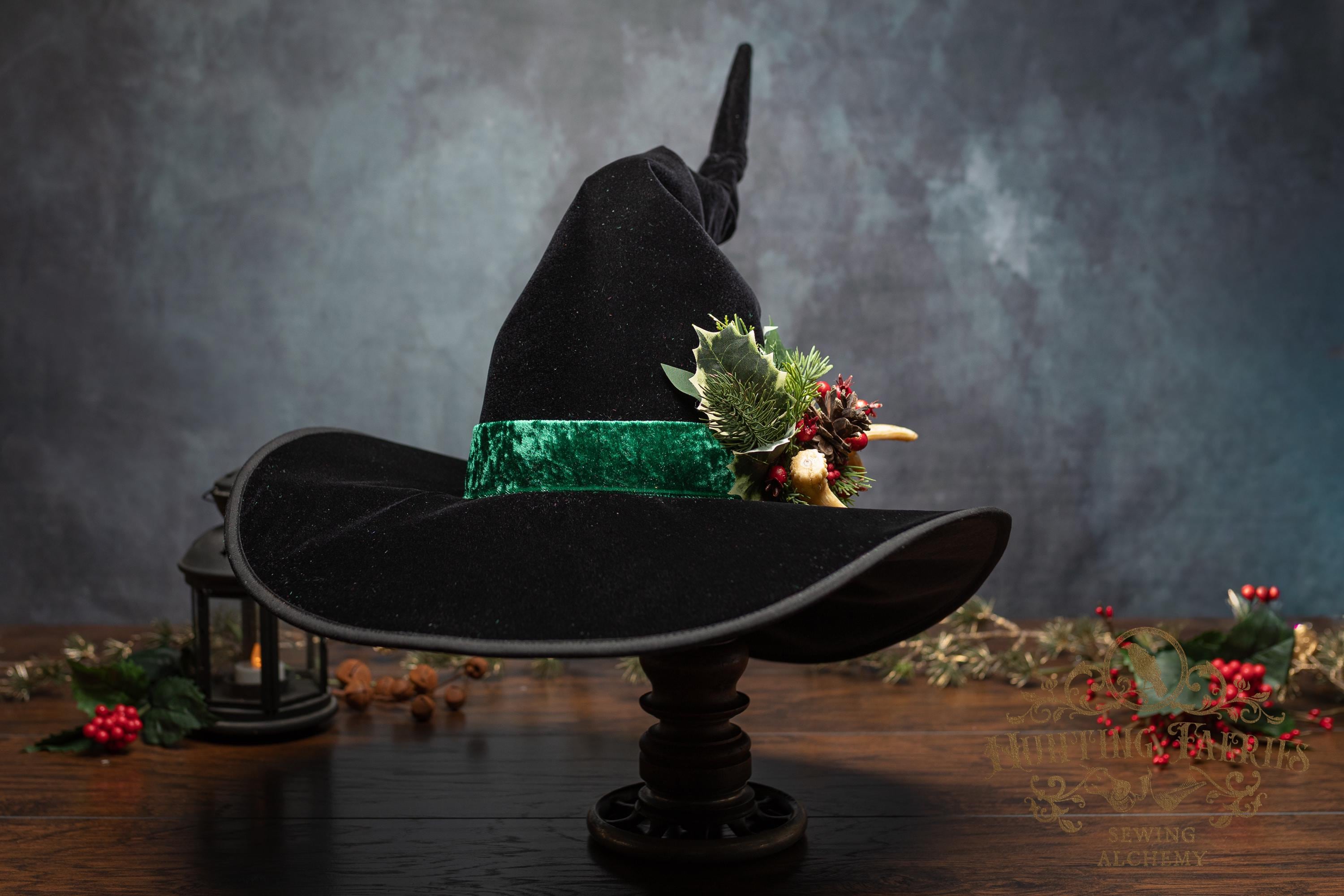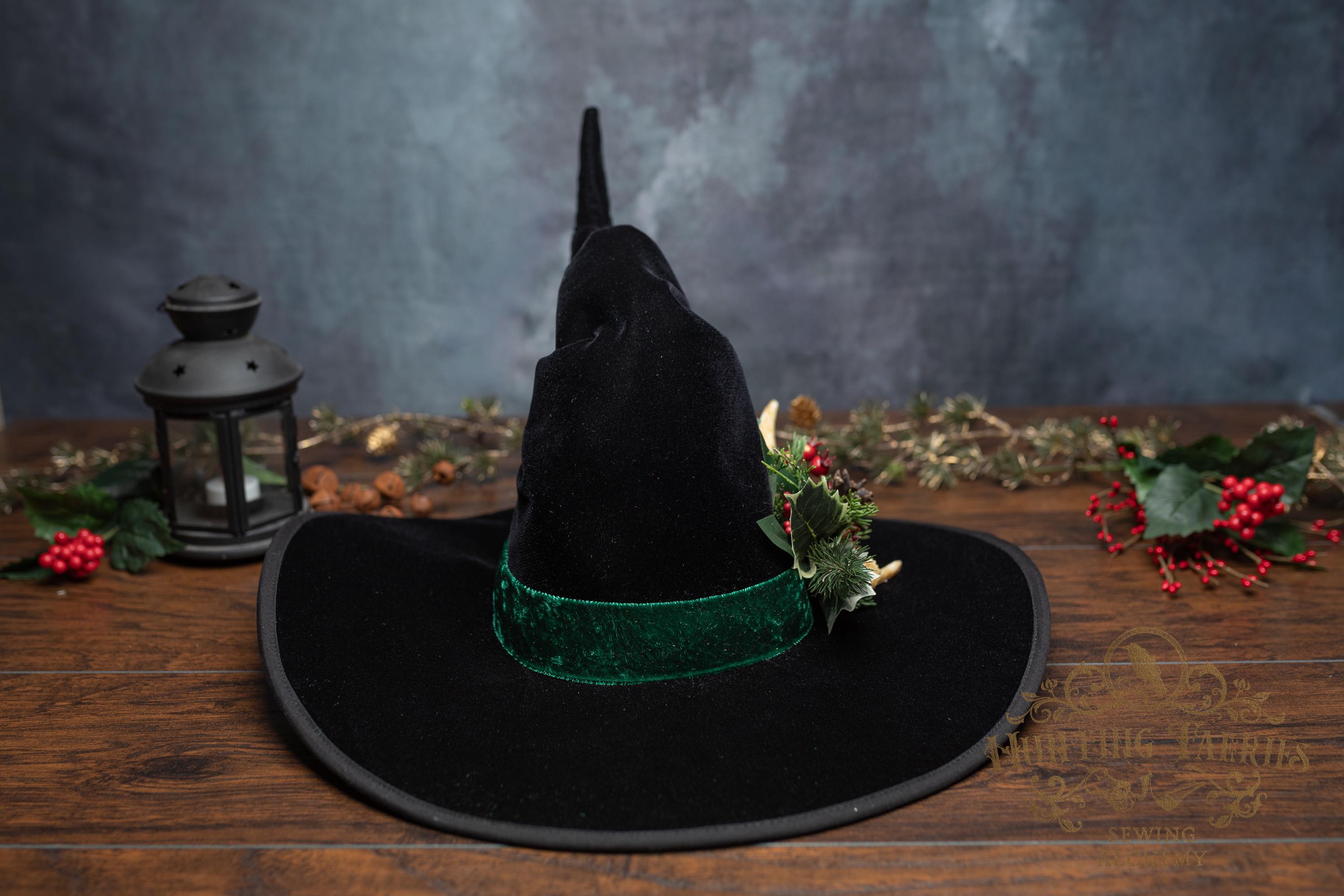 This witch hat is made of black velvet with a green crushed velvet band wrapped around the cone. There is a lovely pin at the side with seasonal greens wrapped around a faux deer antler. The edges are finished with bias tape giving it a clean polished look. There are three layers of fabric to stabilize the hats cone and brim, with the underlayer in premium felt. When your festivities are over simply take off the pin and you have a lovely hat for other occasions.
