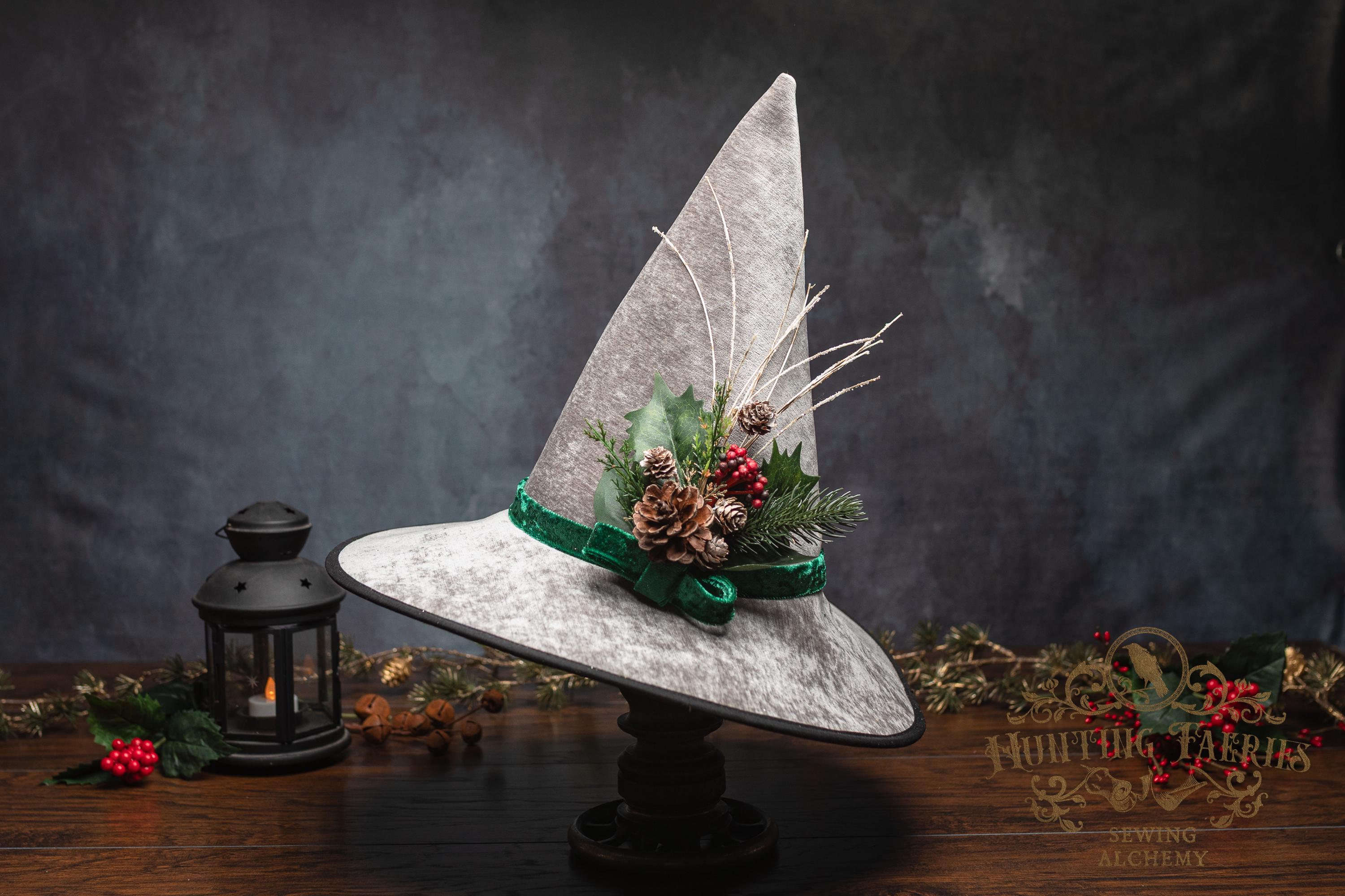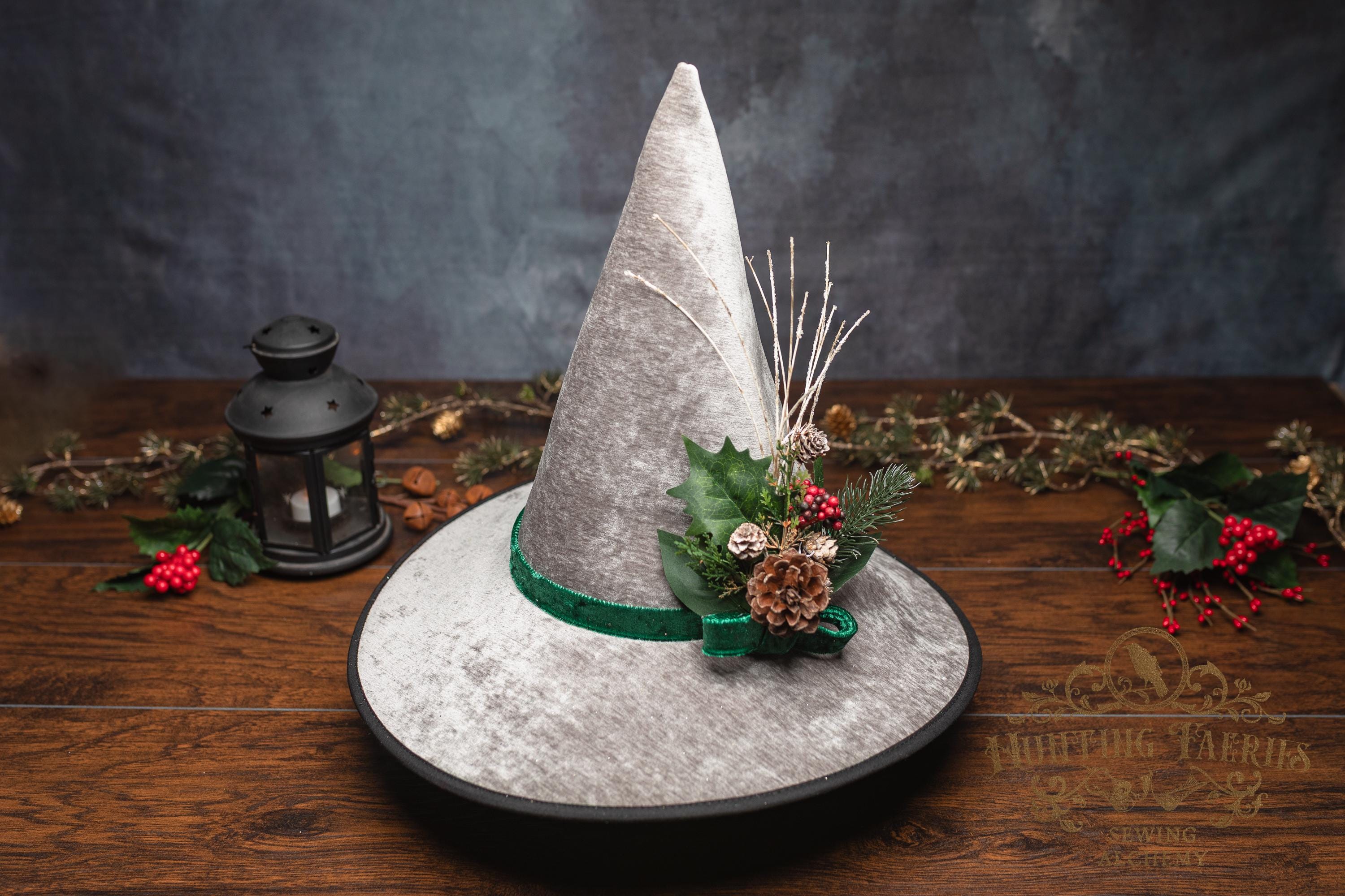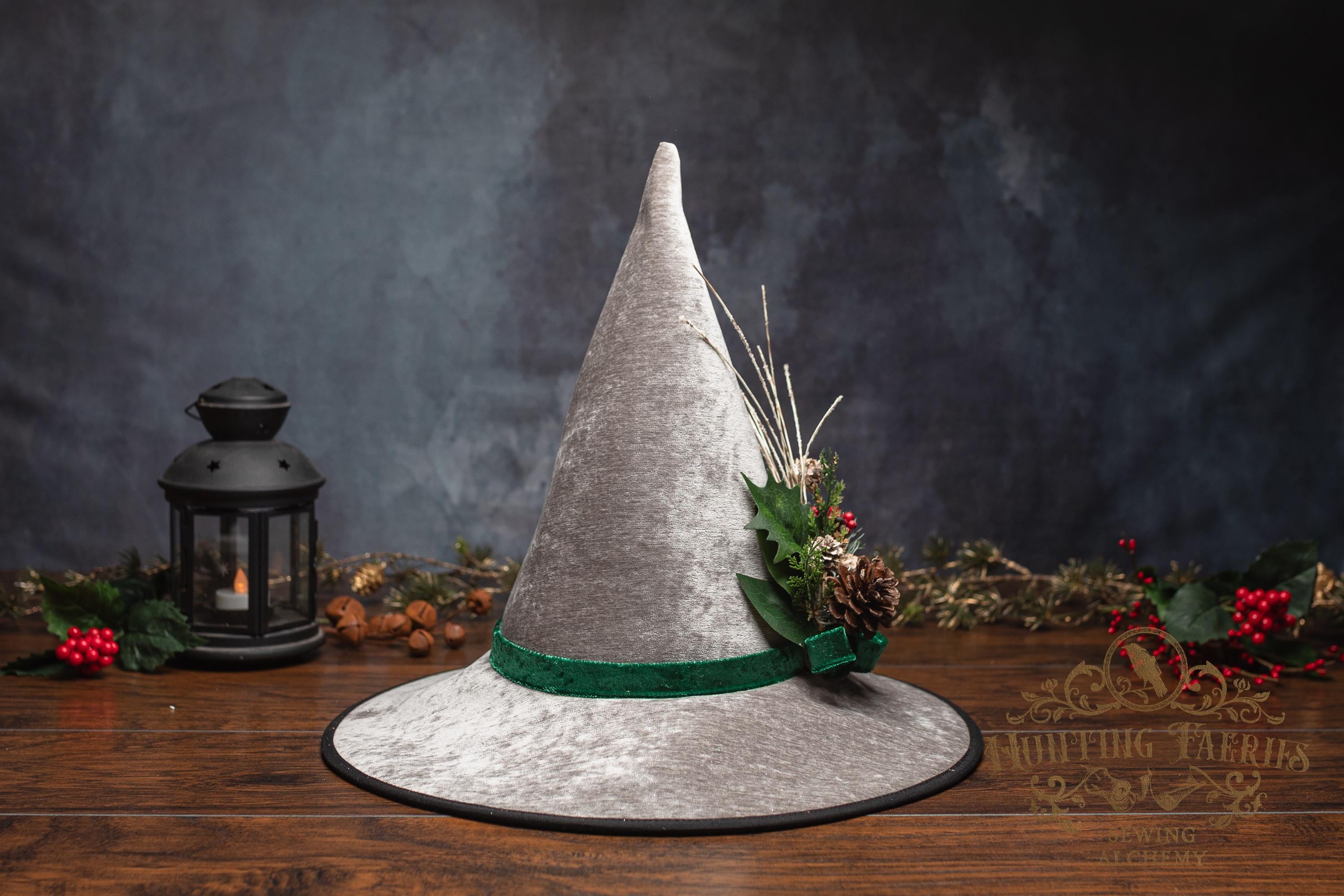 This witch hat is made from silver colored fabric, with a crushed green velvet band encircling the tall cone. The slanted brim features three layers of magic stitched together and polished off with black bias tape. The underside and inside cone is black felt, which helps the hat maintain its shape, and it absorbs that extra moonlight as you fly through those cold December skies. The side of the hat is adorned with a seasonal woodsy pin consisting of faux Holly, evergreen bits and pinecone. The base is finished off with a matching green bow. It is removable, allowing you to decorate it to suit your own personal style or change it up to match your seasonal whim.