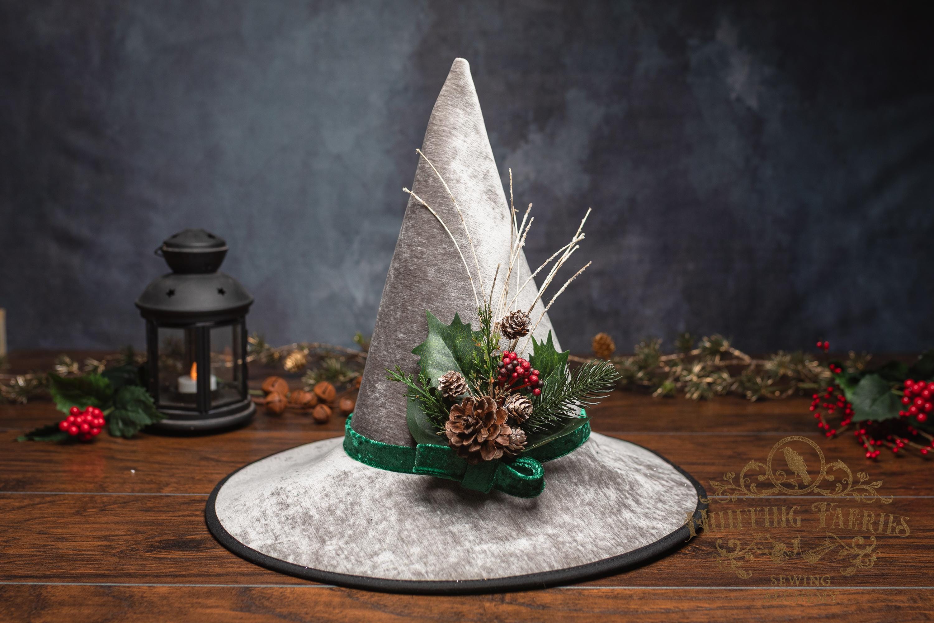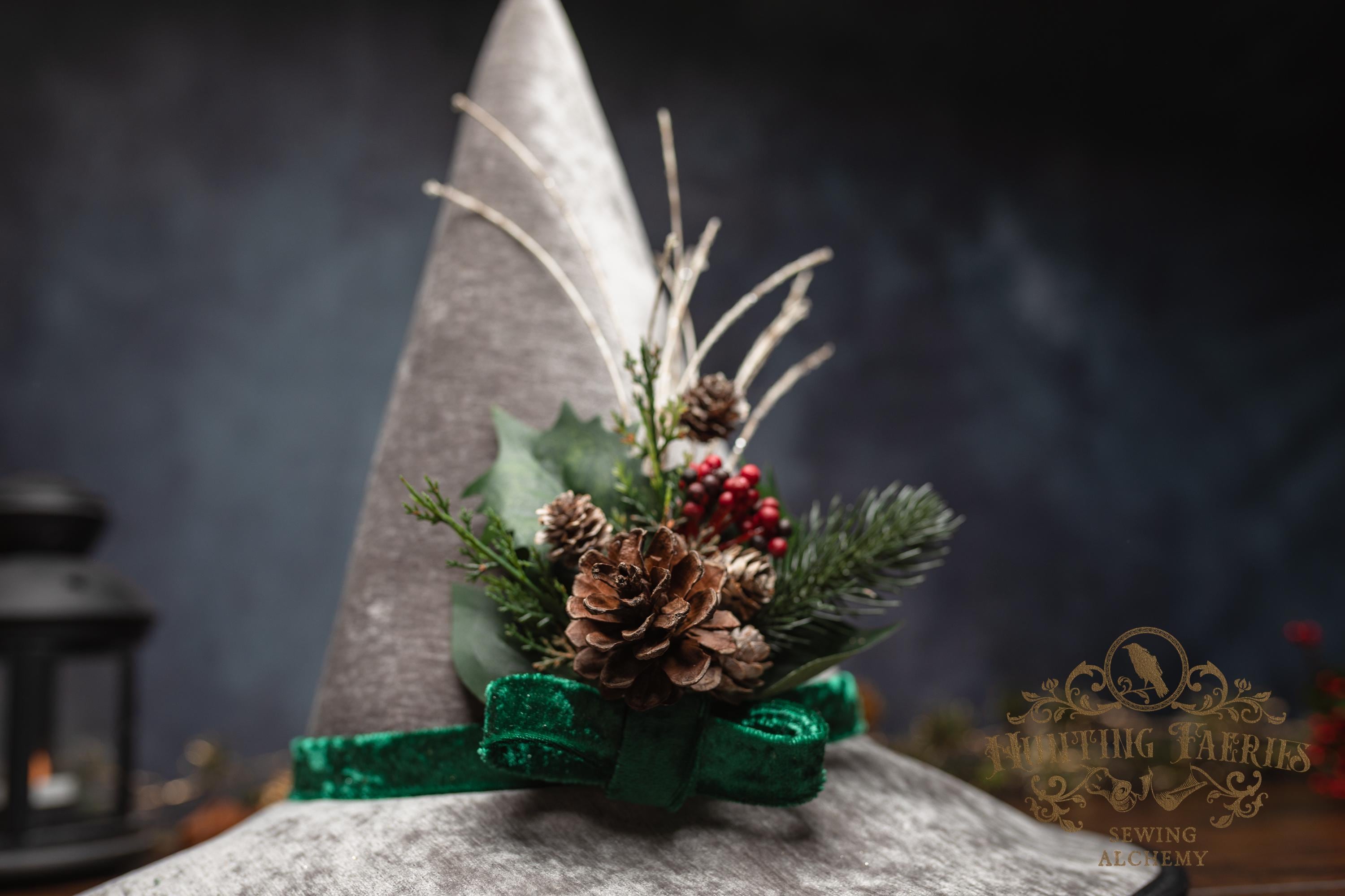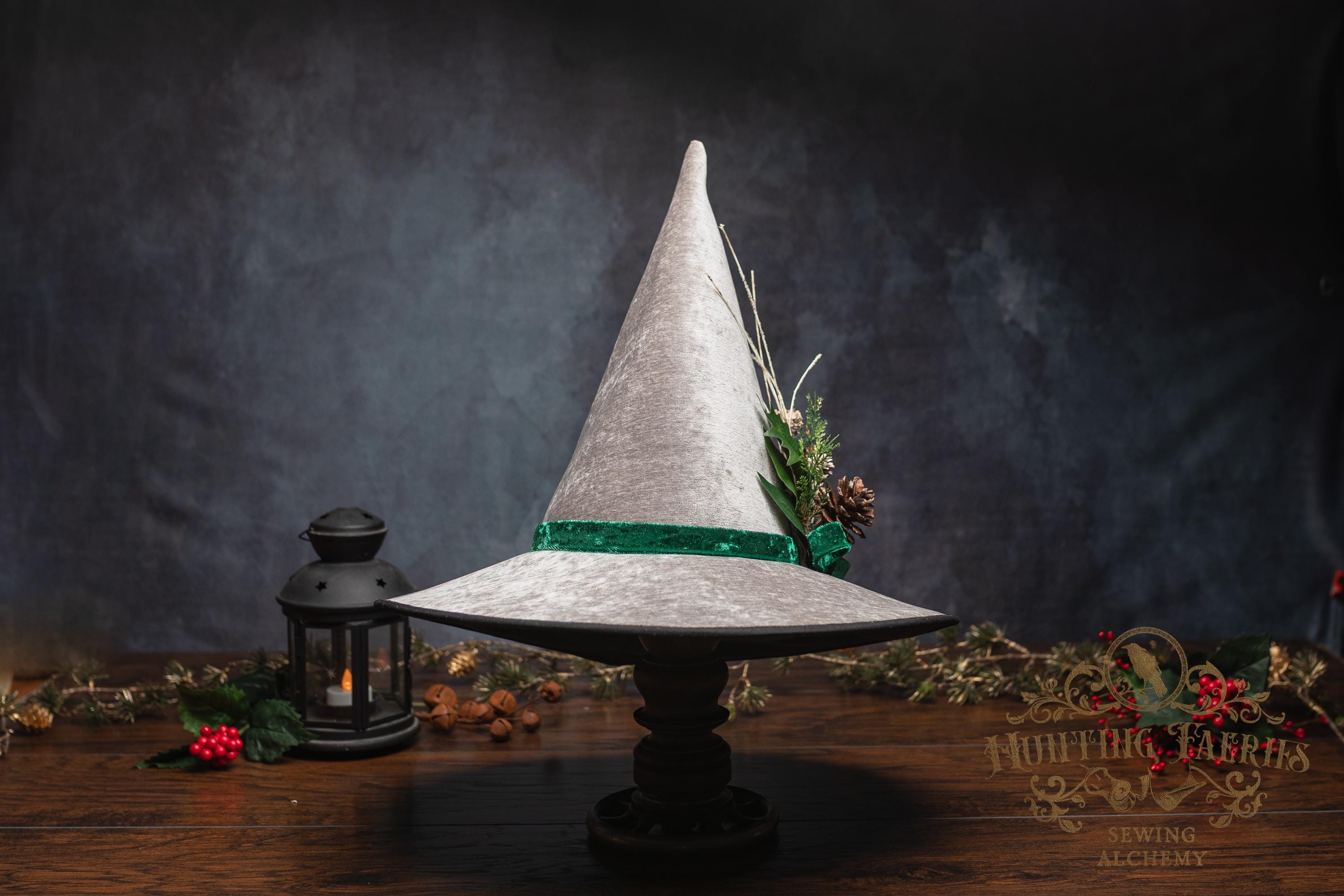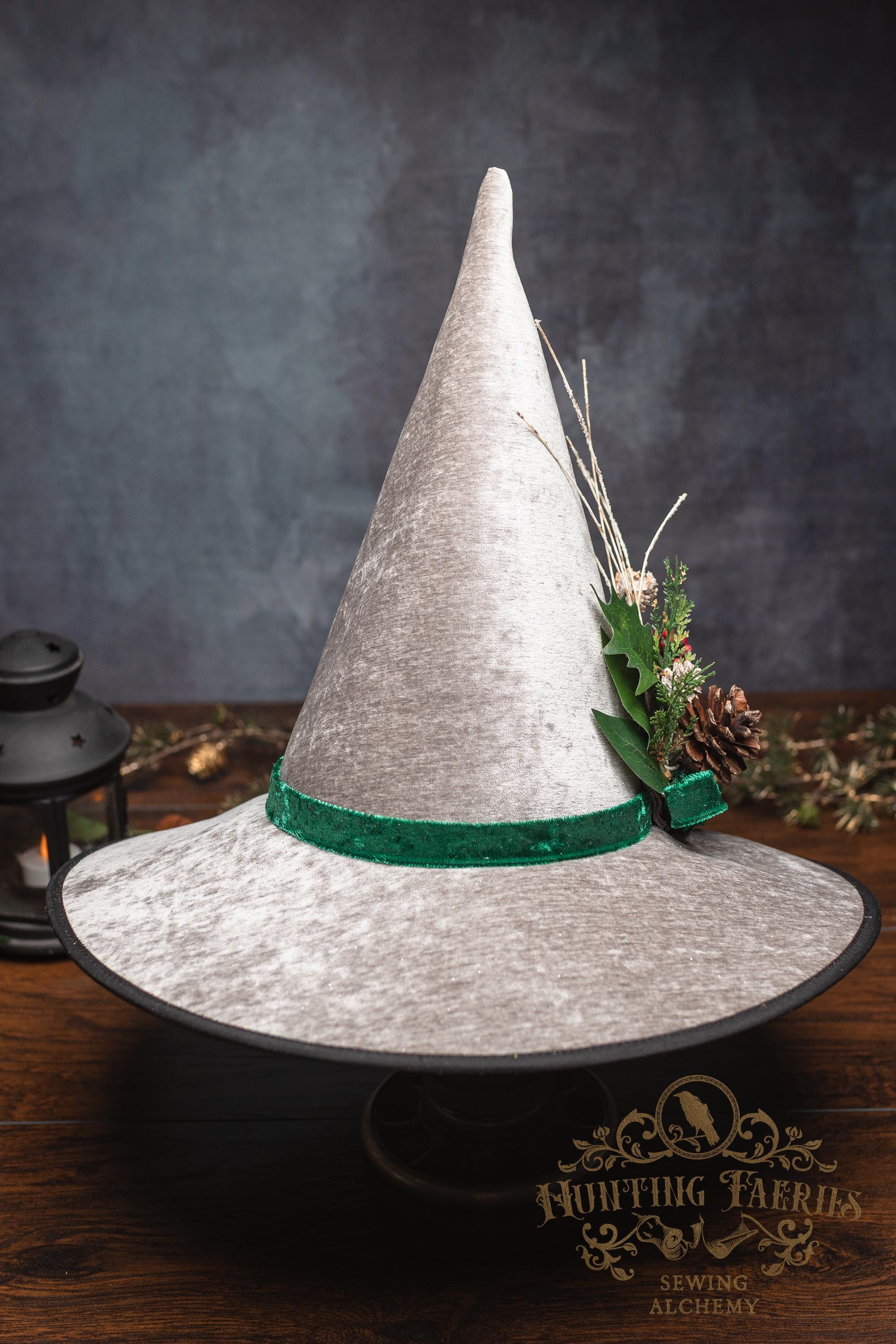 This witch hat is made from silver colored fabric, with a crushed green velvet band encircling the tall cone. The slanted brim features three layers of magic stitched together and polished off with black bias tape. The underside and inside cone is black felt, which helps the hat maintain its shape, and it absorbs that extra moonlight as you fly through those cold December skies. The side of the hat is adorned with a seasonal woodsy pin consisting of faux Holly, evergreen bits and pinecone. The base is finished off with a matching green bow. It is removable, allowing you to decorate it to suit your own personal style or change it up to match your seasonal whim.