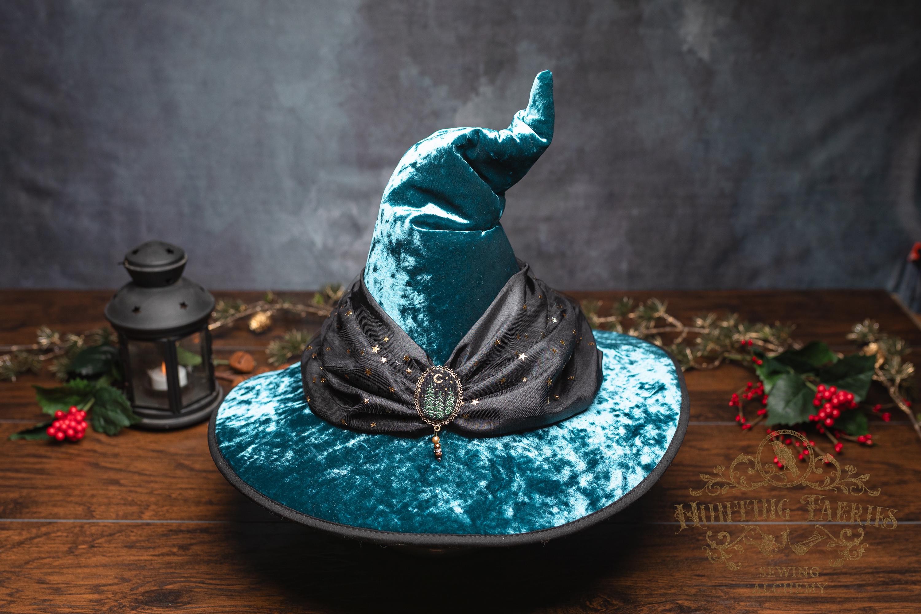 This witch hat is made from a blue-green colored fabric, with a black satin scarf and tulle star band encircling the tall cone. There is a double crook in the cone. The slanted brim features three layers of magic stitched together and polished off with black bias tape. The underside and inside cone is black felt, which helps the hat maintain its shape, and it absorbs that extra moonlight as you fly through those cold December skies. The front of the hat is adorned with a hand embroidered forest scene beneath a starry sky. It is removable, allowing you to decorate it to suit your own personal style or change it up to match your seasonal whim.
