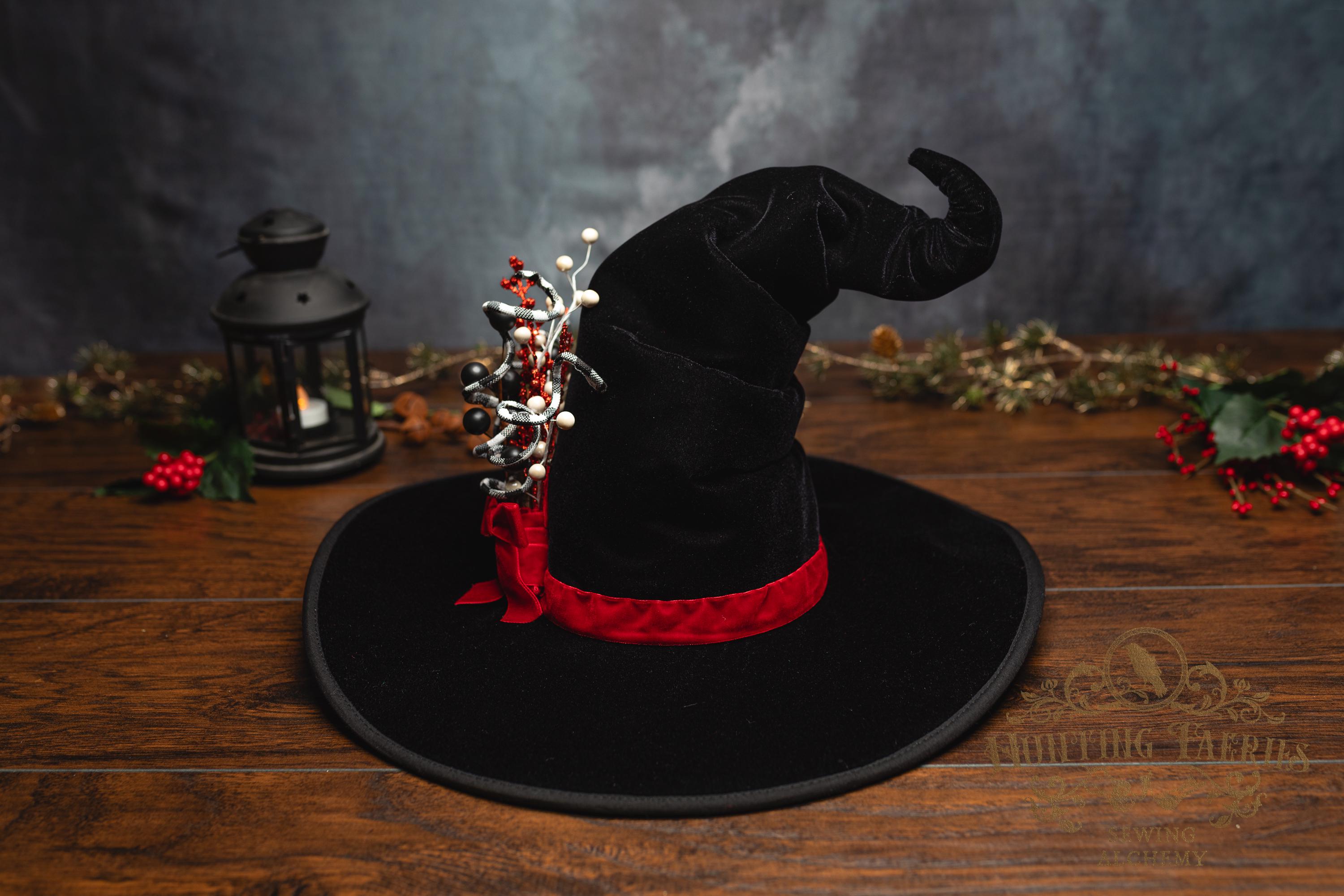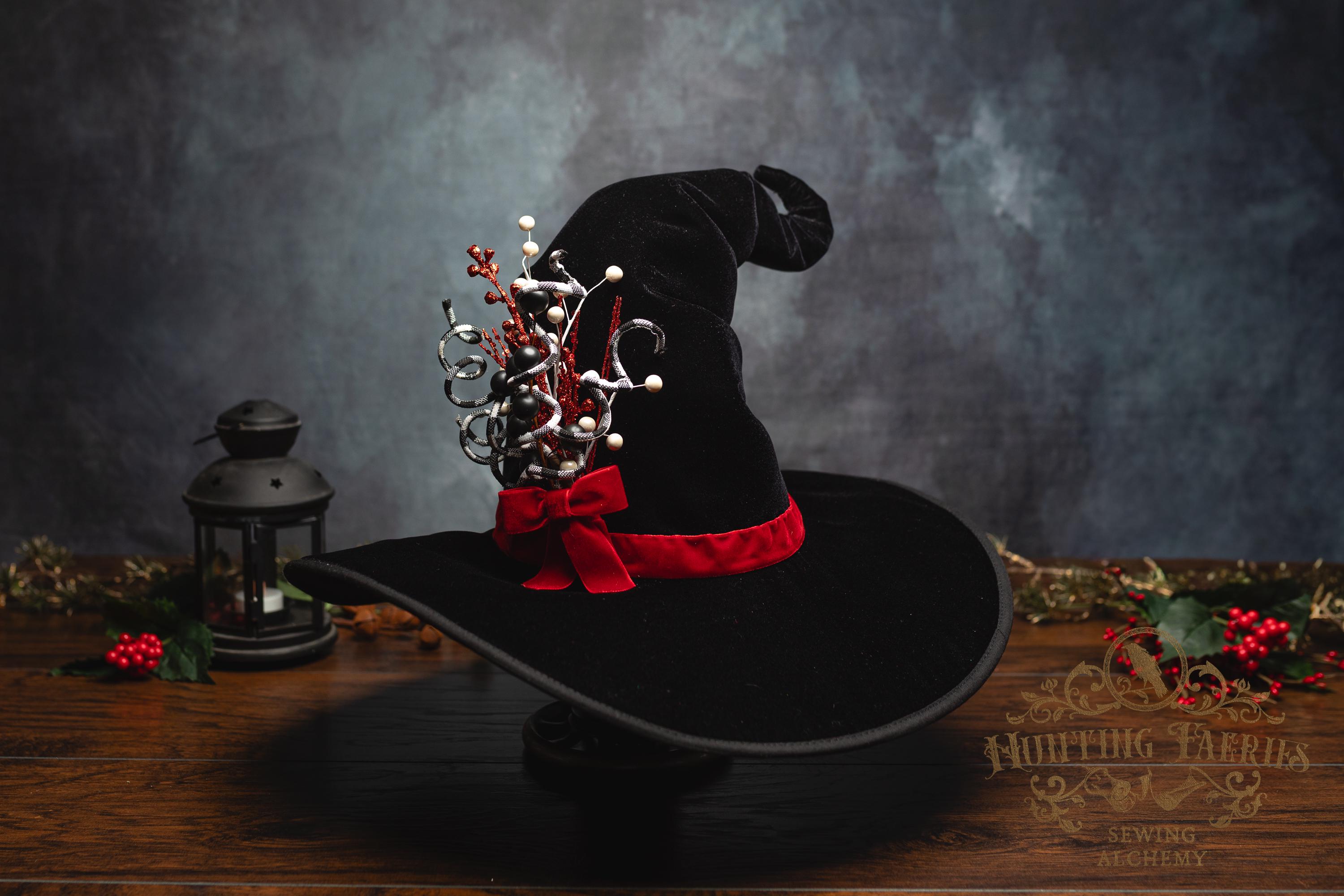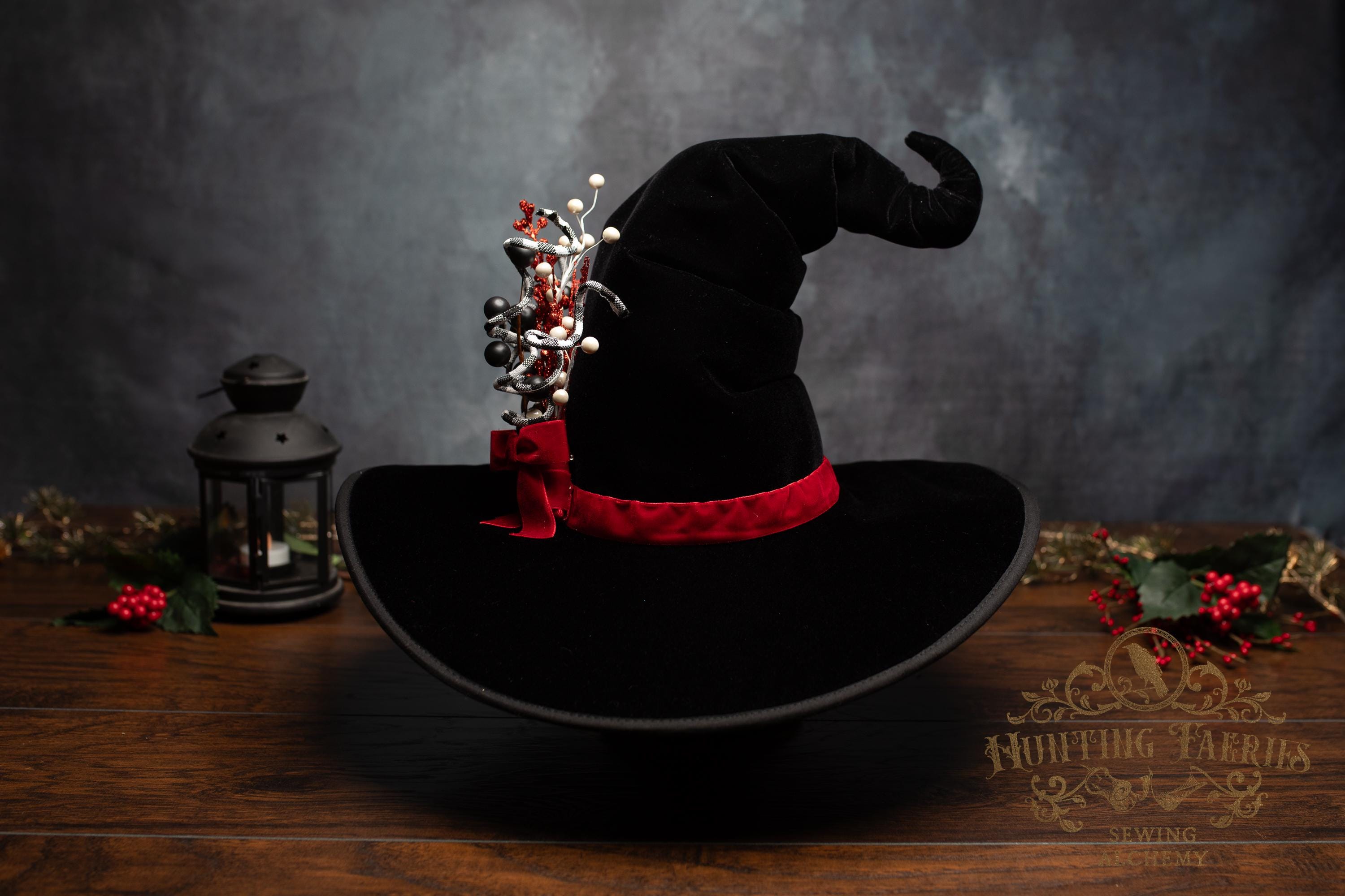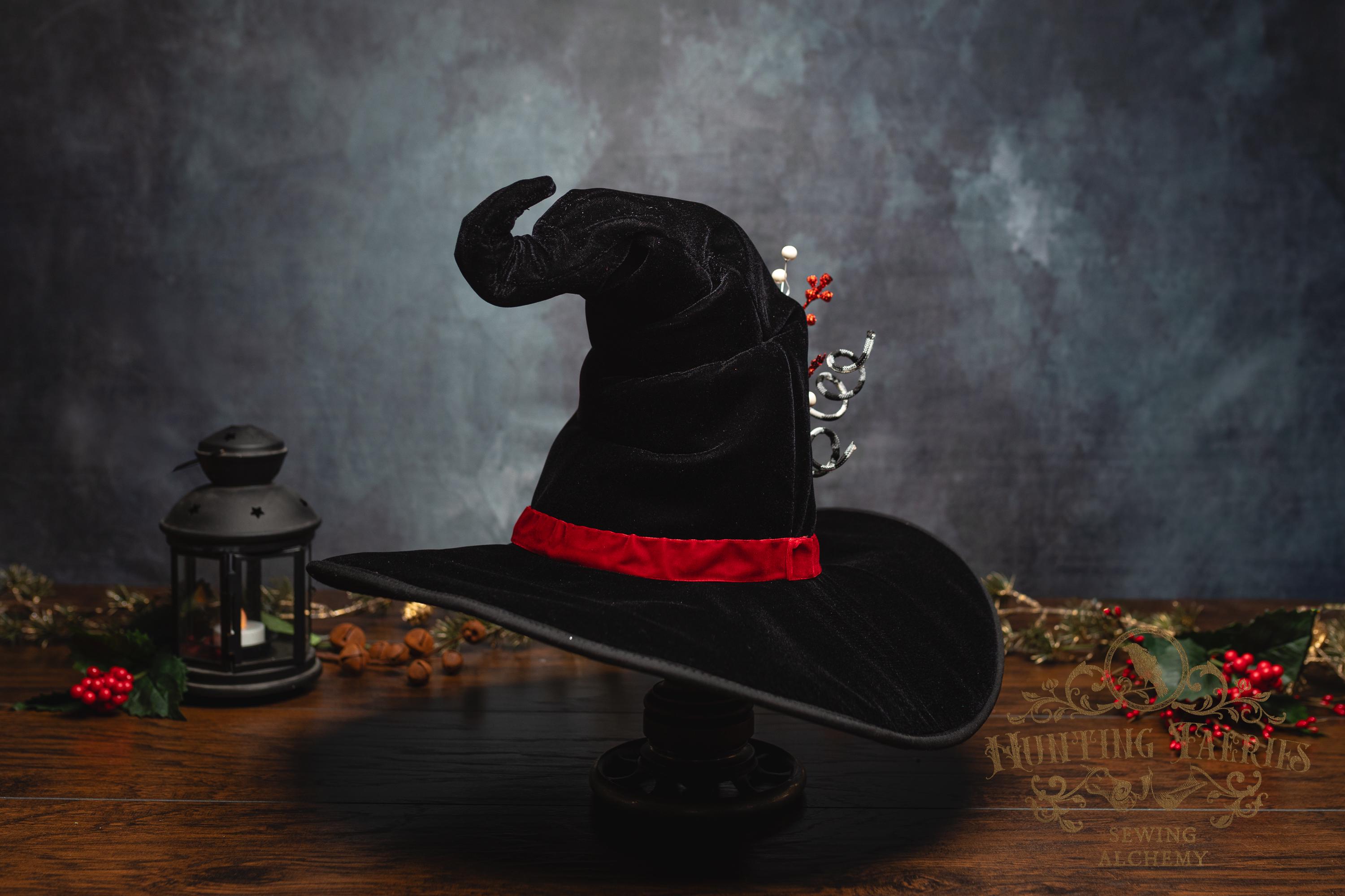 This witch hat is made from black velvet, with a red velvet band encircling a side crooked cone. The brim features three layers of magic stitched together and polished off with black bias tape. The underside and inside cone is black felt, which helps the hat maintain its shape, and it absorbs that extra moonlight as you fly through those chilly December skies. The side of the hat is adorned with a large red white and black decorated pin. It is removable, allowing you to decorate it to suit your own personal style or change it up to match your specific witch need.