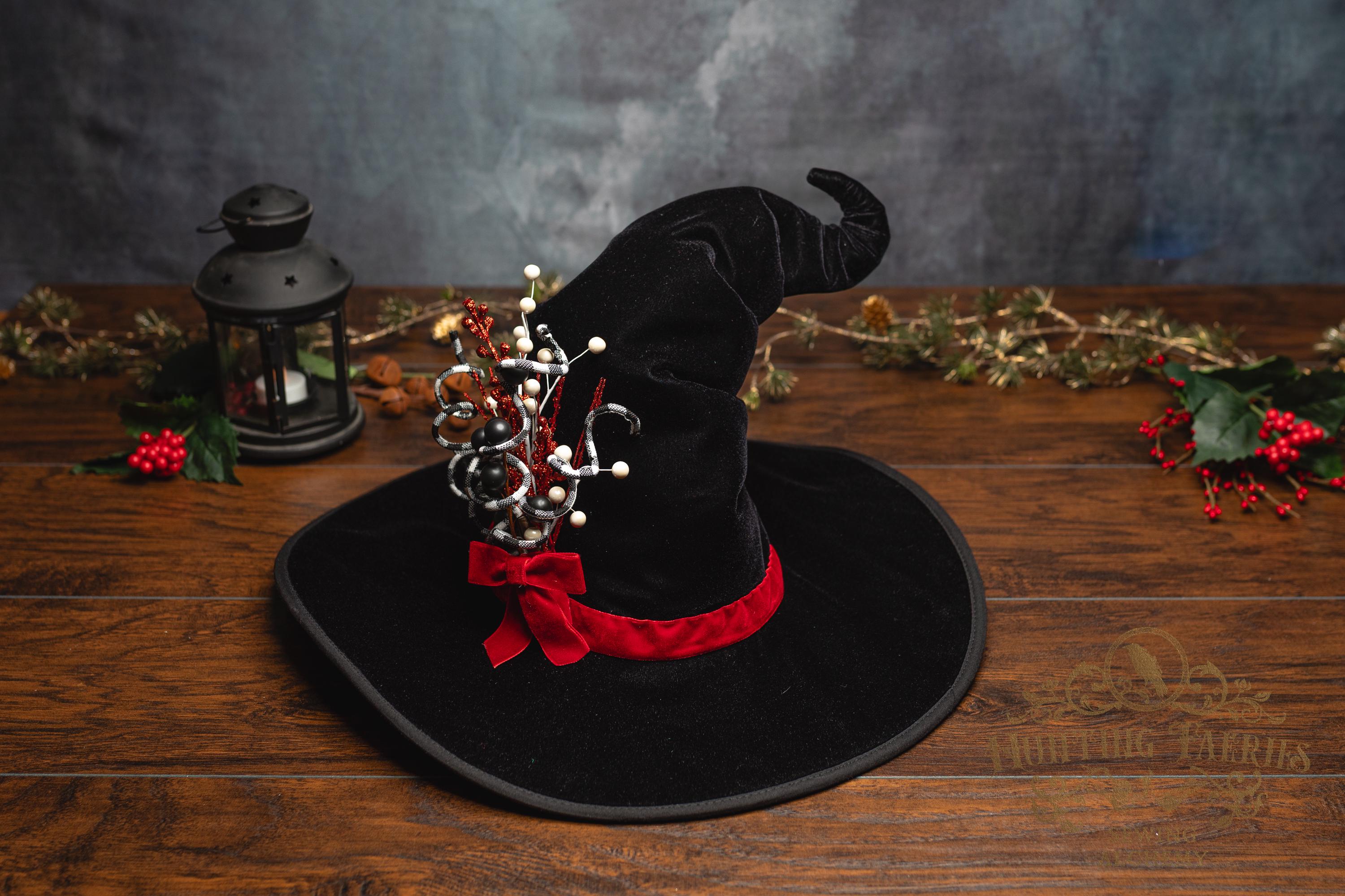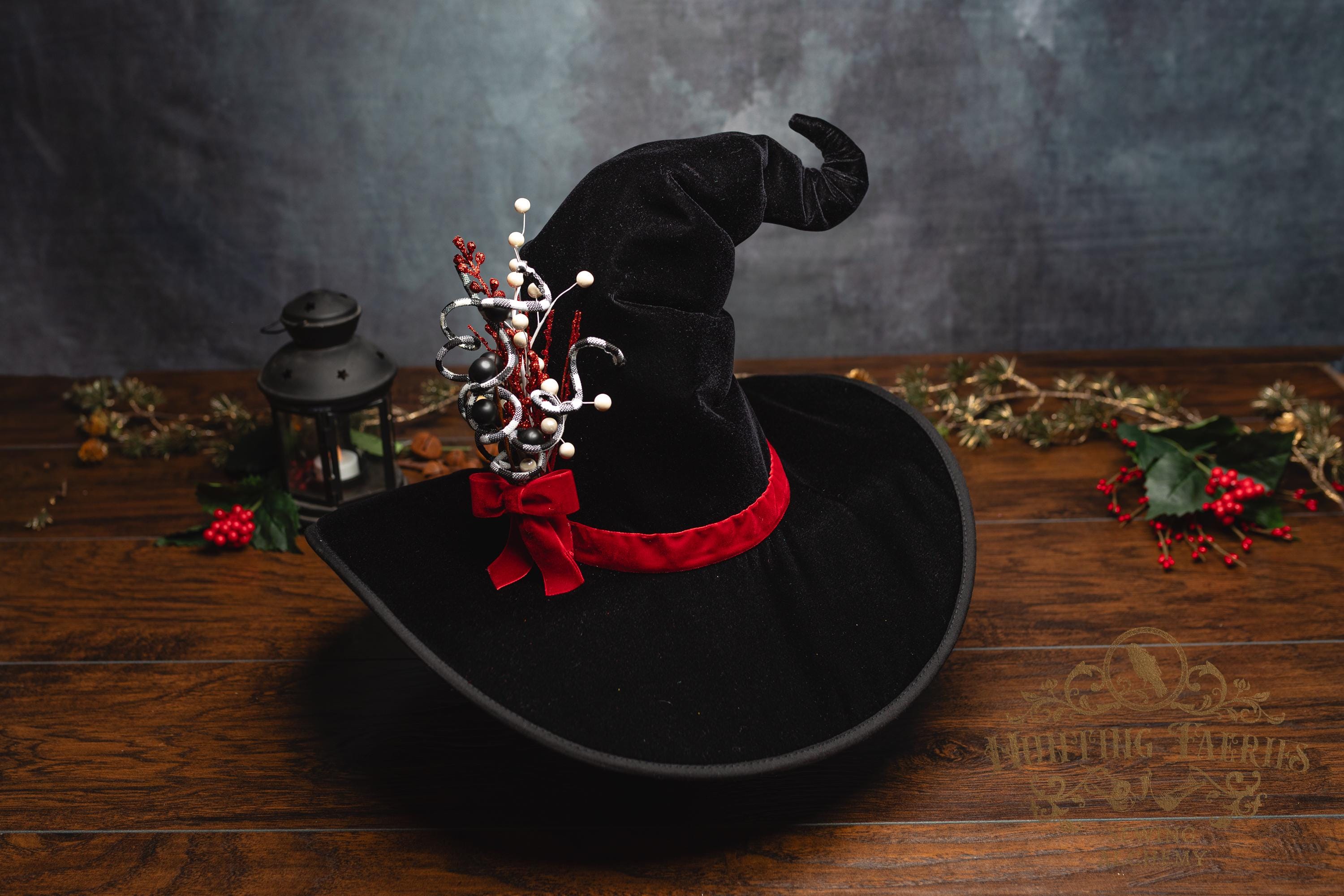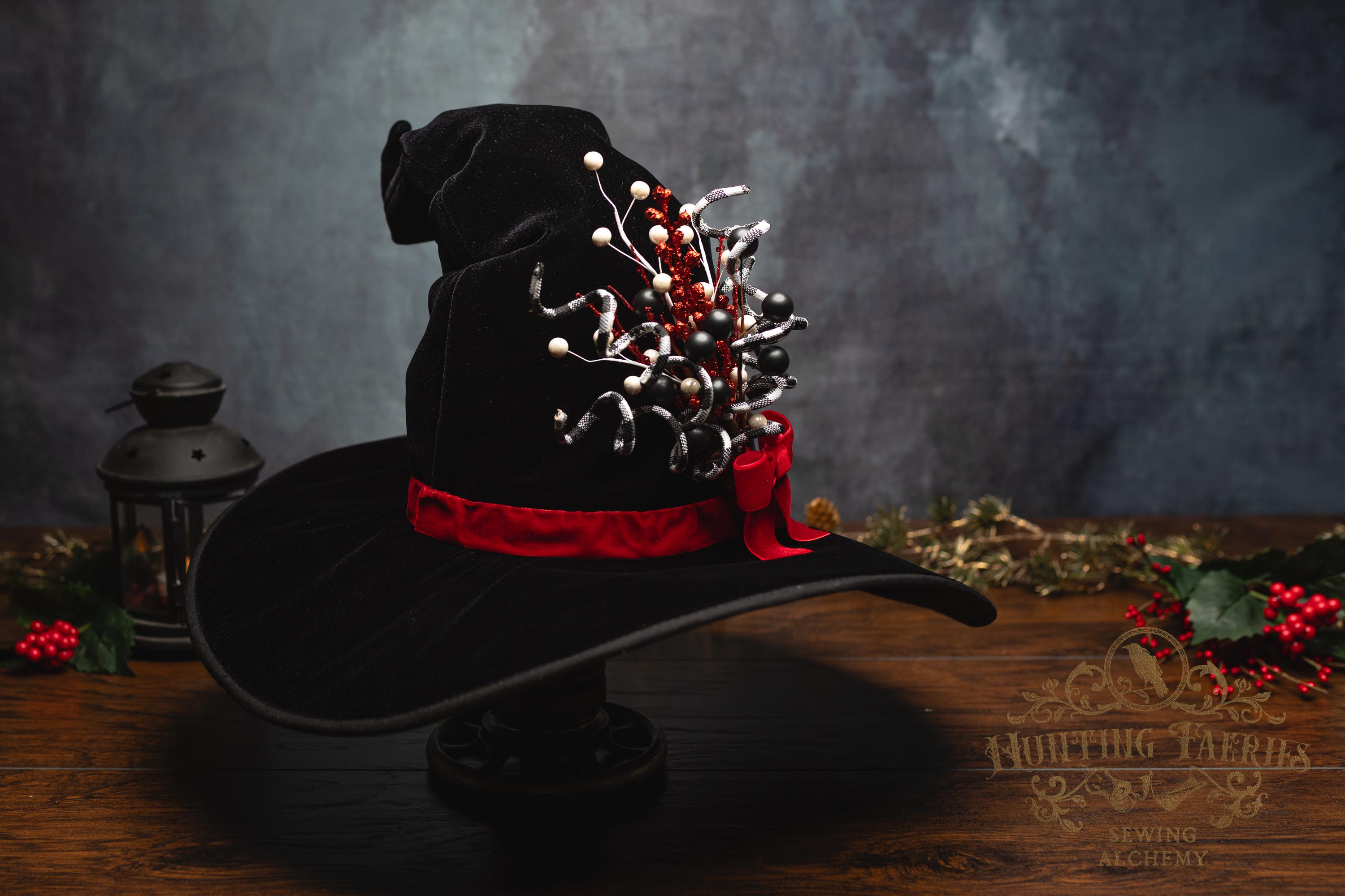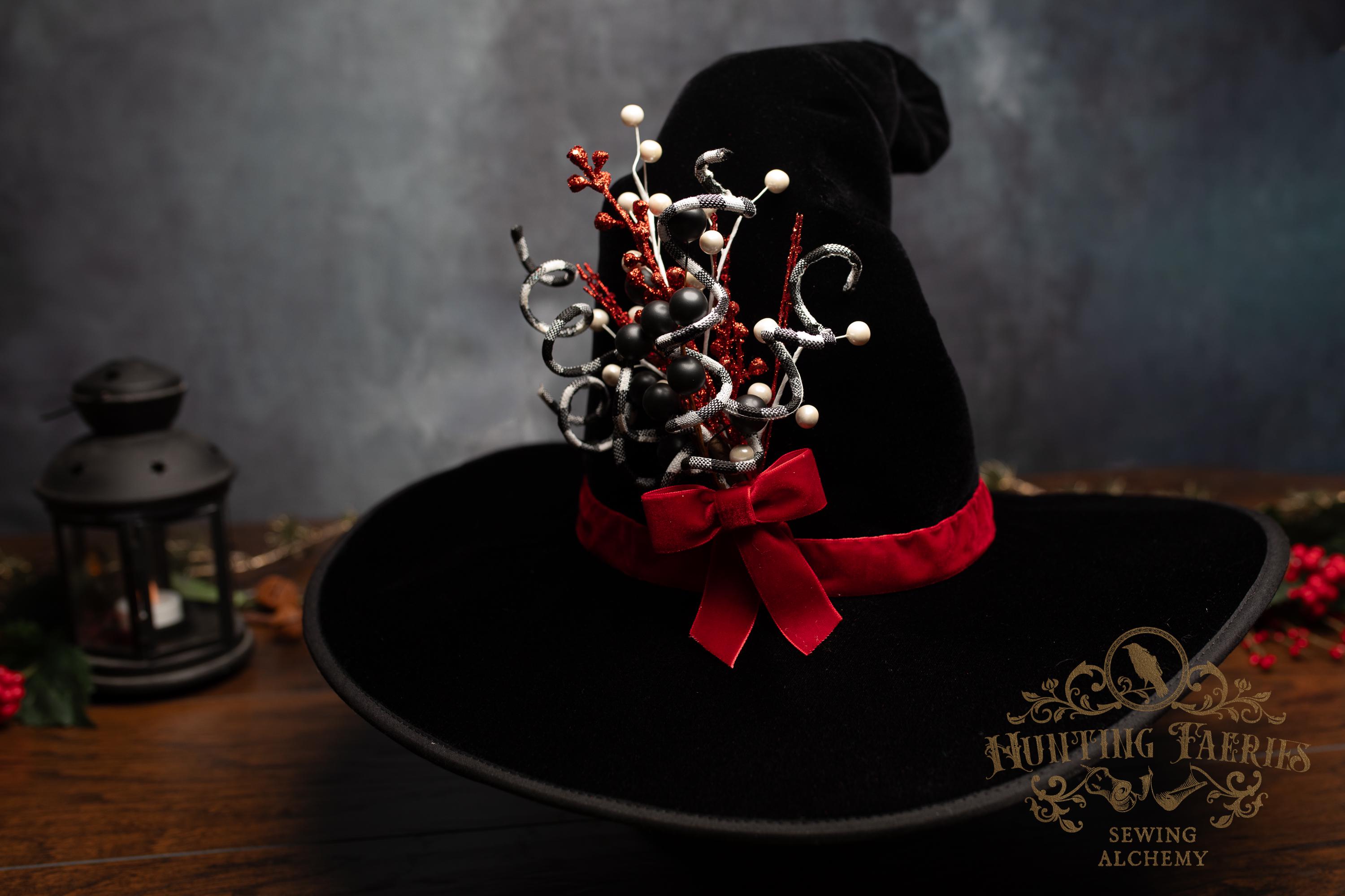 This witch hat is made from black velvet, with a red velvet band encircling a side crooked cone. The brim features three layers of magic stitched together and polished off with black bias tape. The underside and inside cone is black felt, which helps the hat maintain its shape, and it absorbs that extra moonlight as you fly through those chilly December skies. The side of the hat is adorned with a large red white and black decorated pin. It is removable, allowing you to decorate it to suit your own personal style or change it up to match your specific witch need.