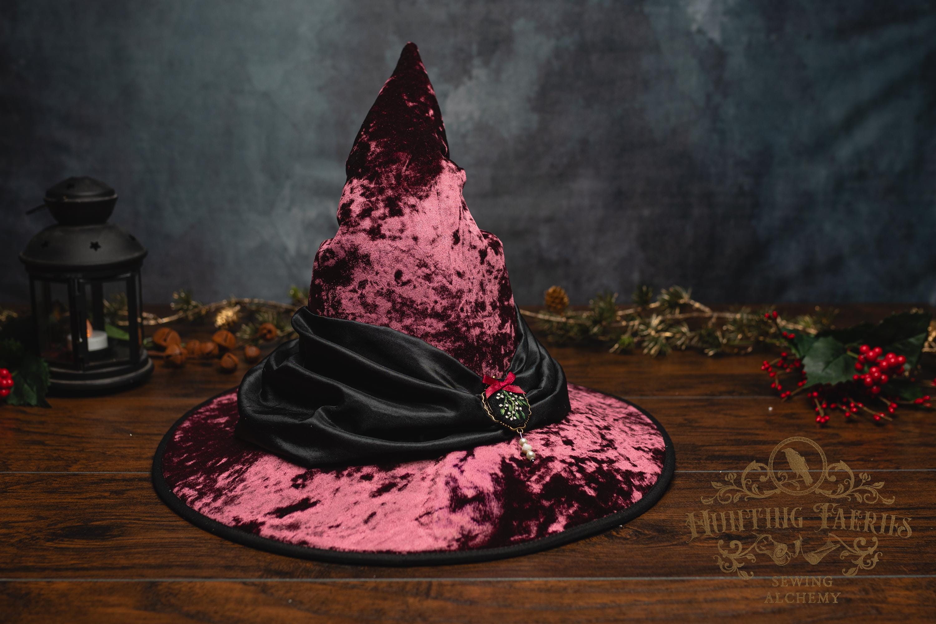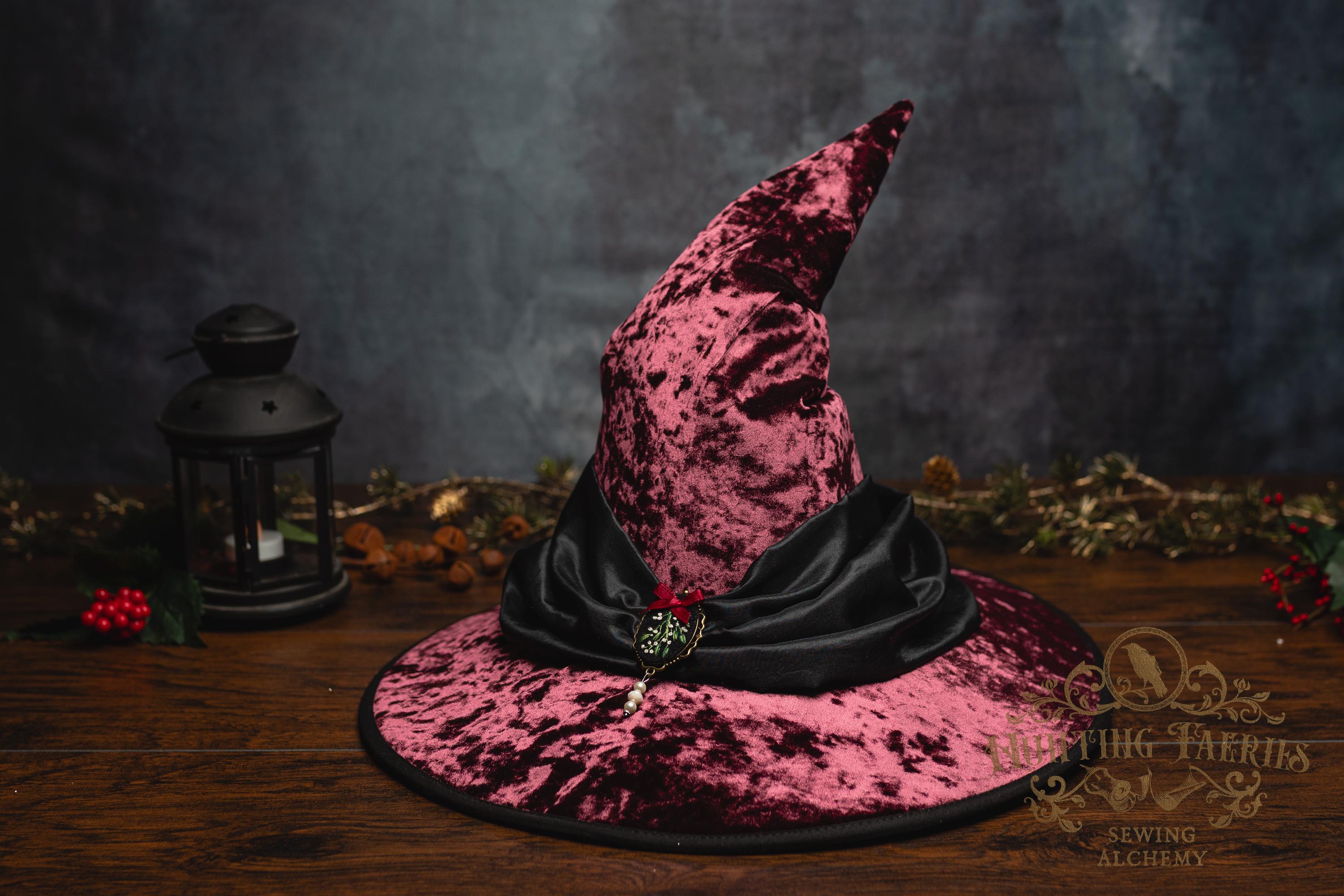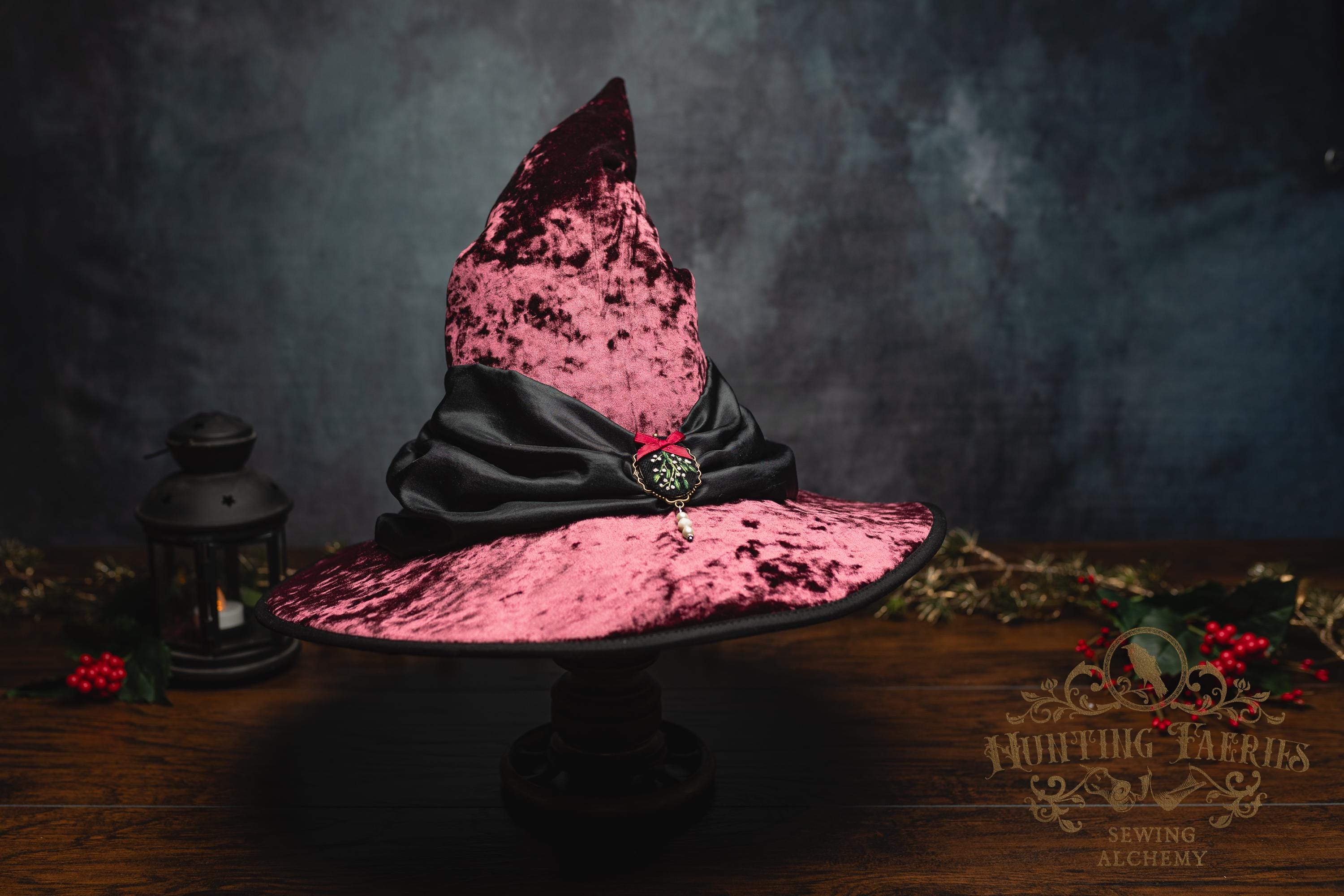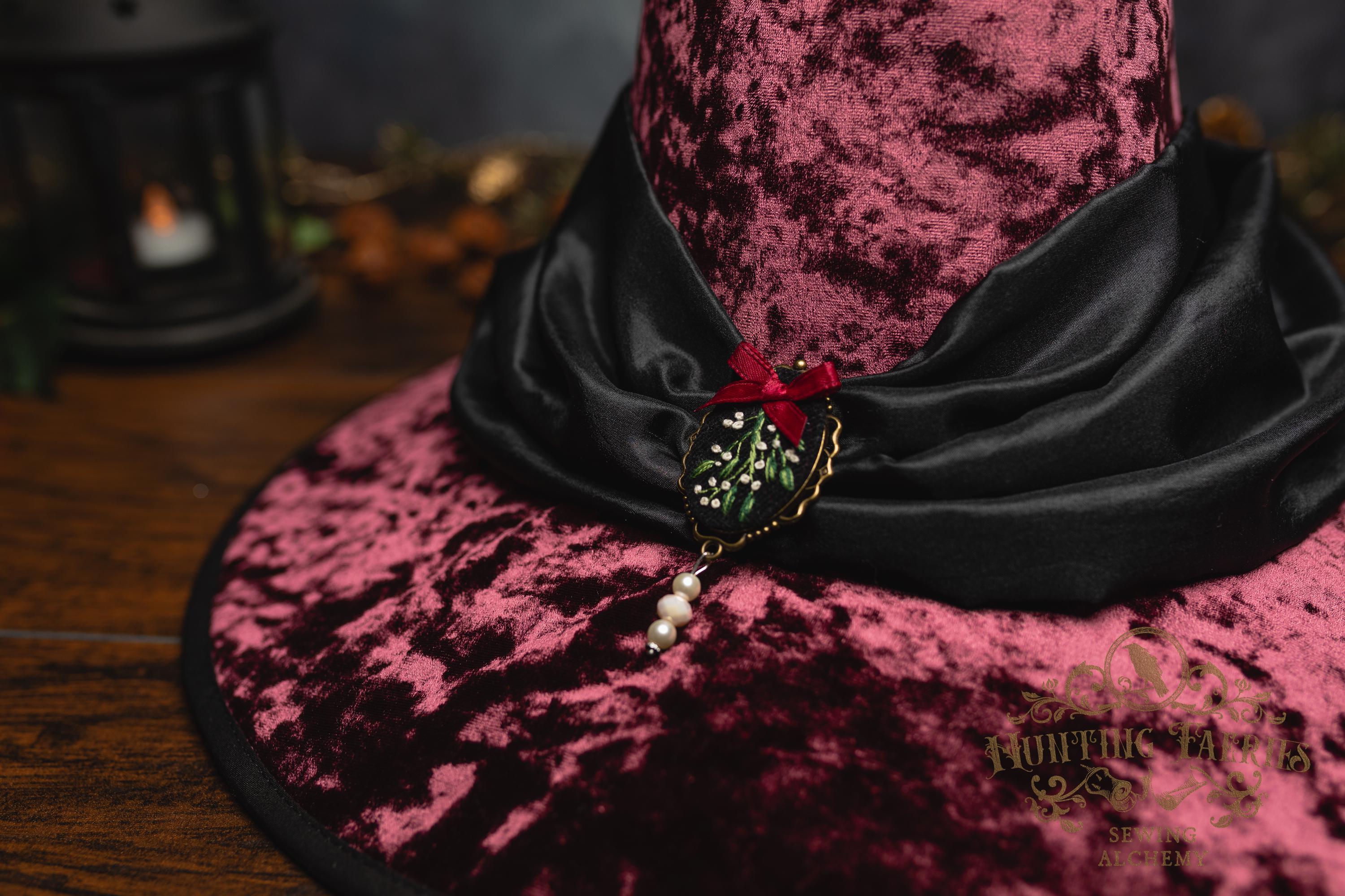 This witch hat is made of crushed fig colored fabric, with a silky scarf encircling the crooked cone. The slanted brim features three layers of magic stitched together and polished off with black bias tape. The underside and inside cone is black felt, which helps the hat maintain its shape, and it absorbs that extra moonlight as you fly through those cold December skies. The front of the hat is adorned with a hand-stitched mistletoe brooch. It is removable, allowing you to decorate it to suit your own personal style or change it up to match your seasonal whim.