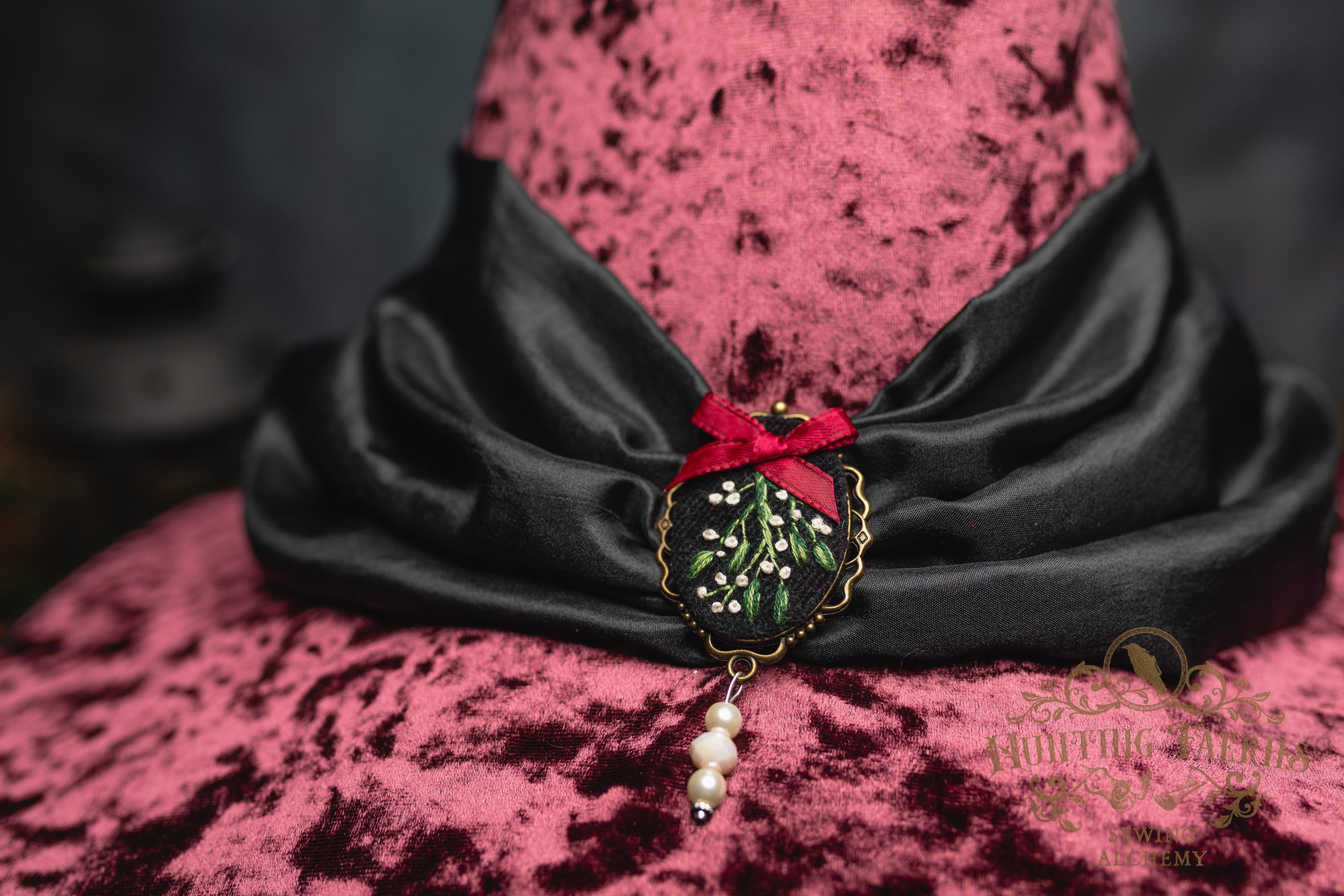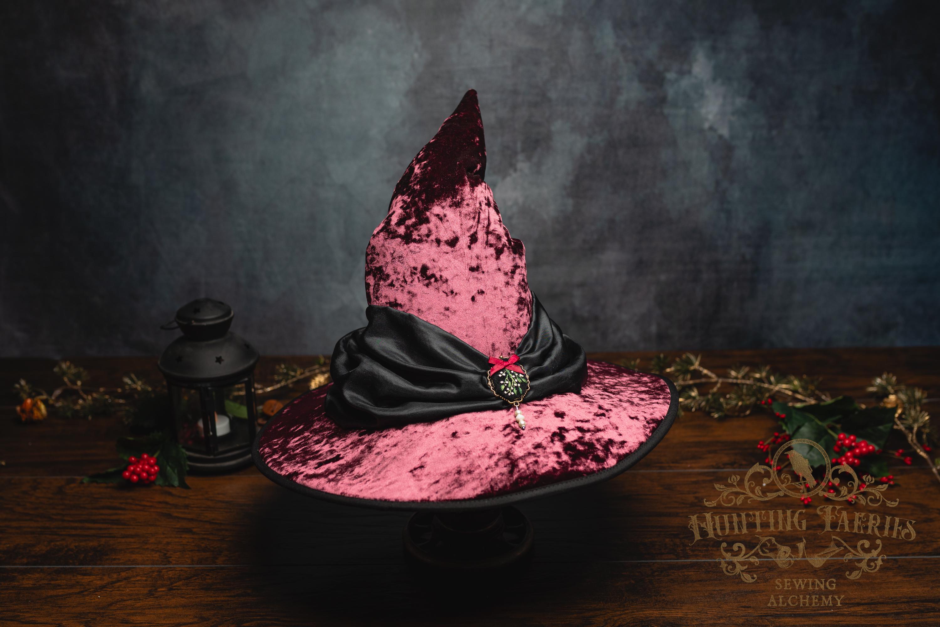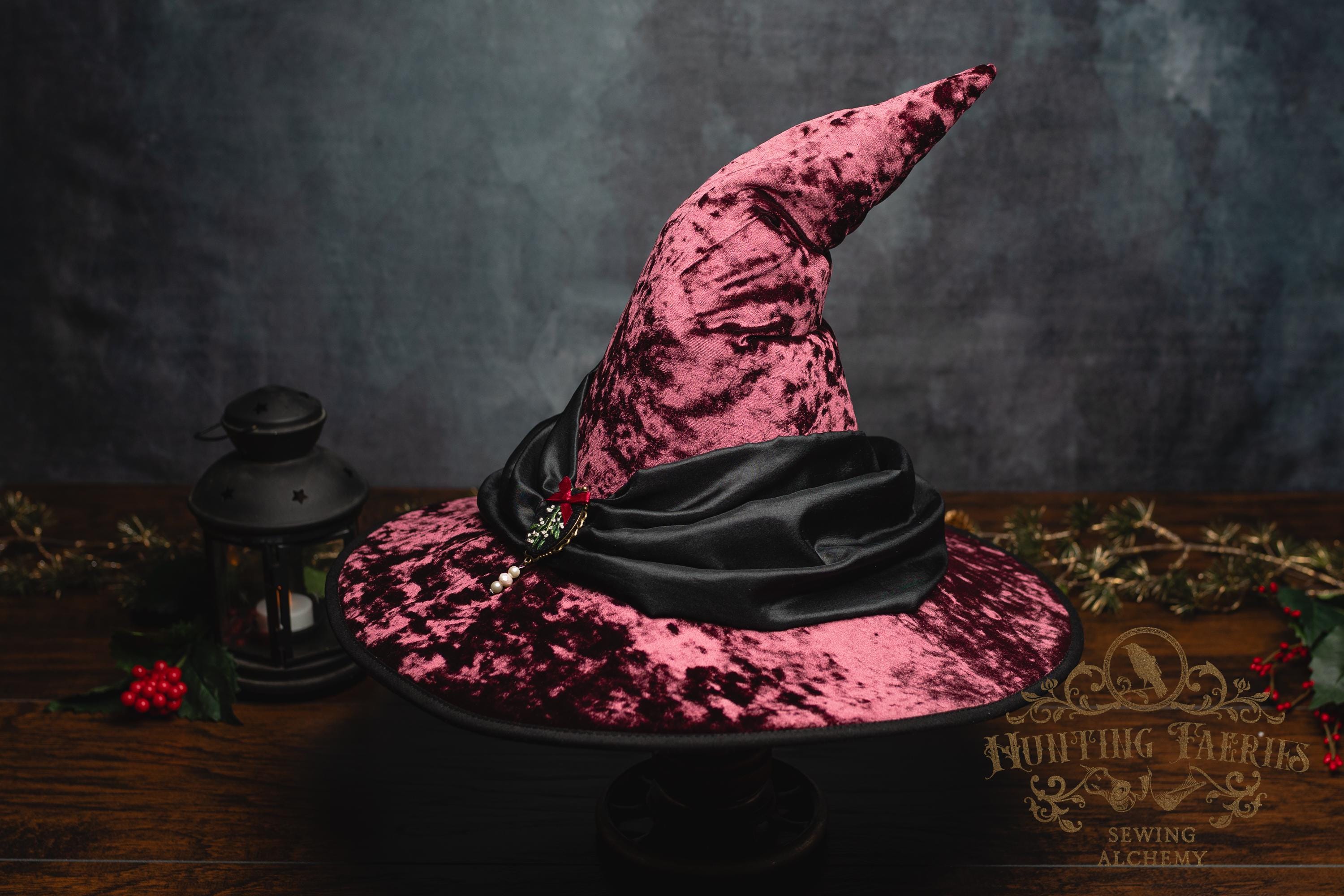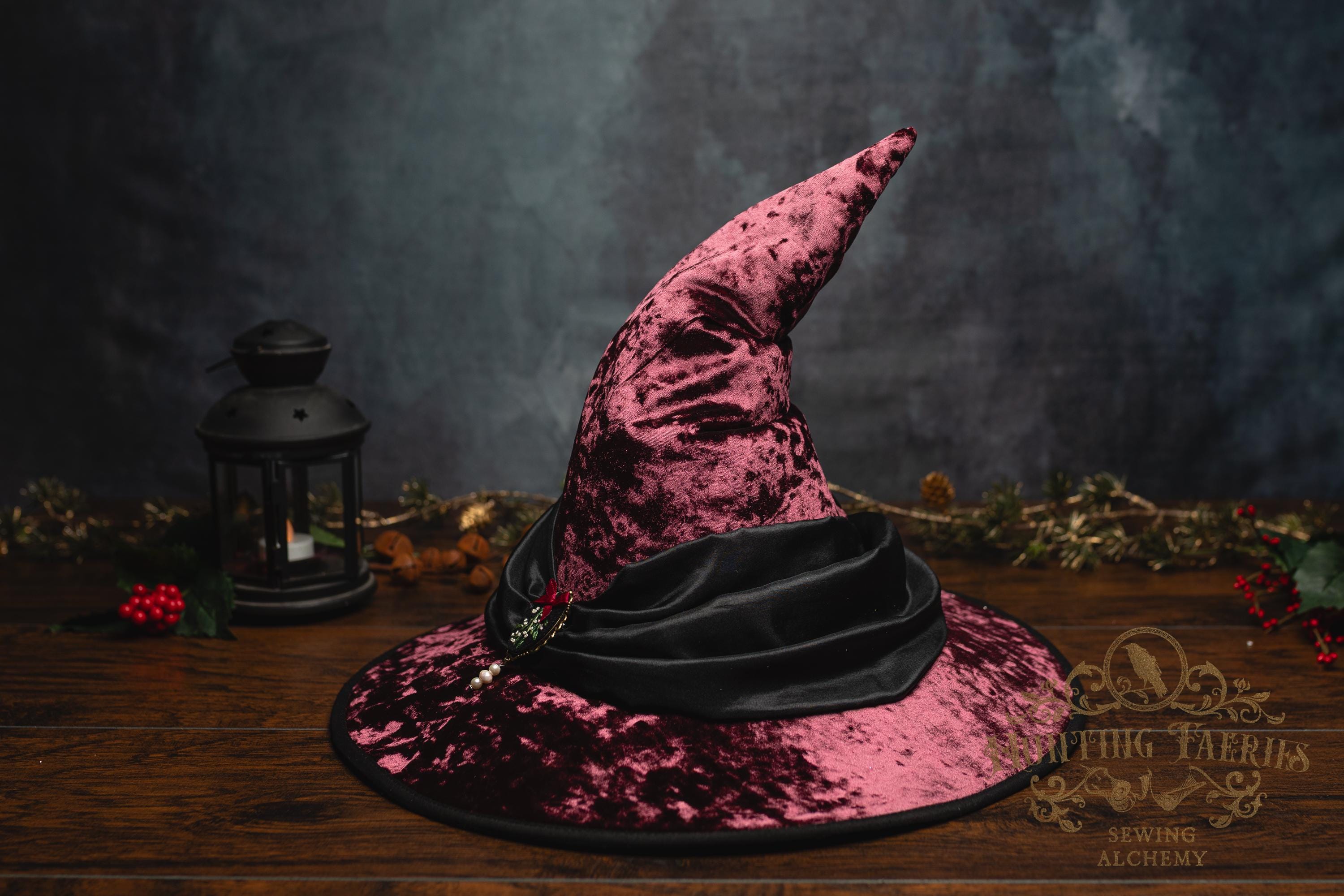 This witch hat is made of crushed fig colored fabric, with a silky scarf encircling the crooked cone. The slanted brim features three layers of magic stitched together and polished off with black bias tape. The underside and inside cone is black felt, which helps the hat maintain its shape, and it absorbs that extra moonlight as you fly through those cold December skies. The front of the hat is adorned with a hand-stitched mistletoe brooch. It is removable, allowing you to decorate it to suit your own personal style or change it up to match your seasonal whim.