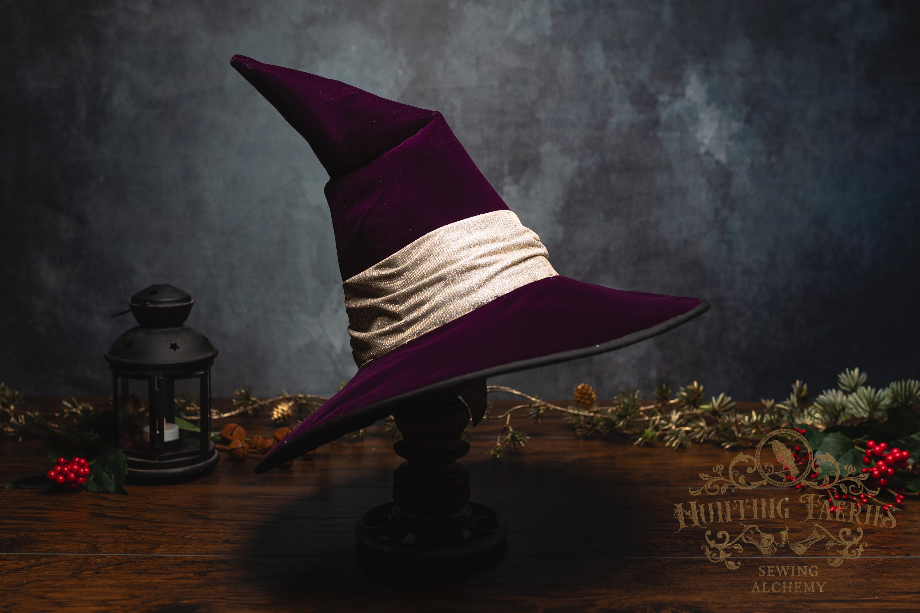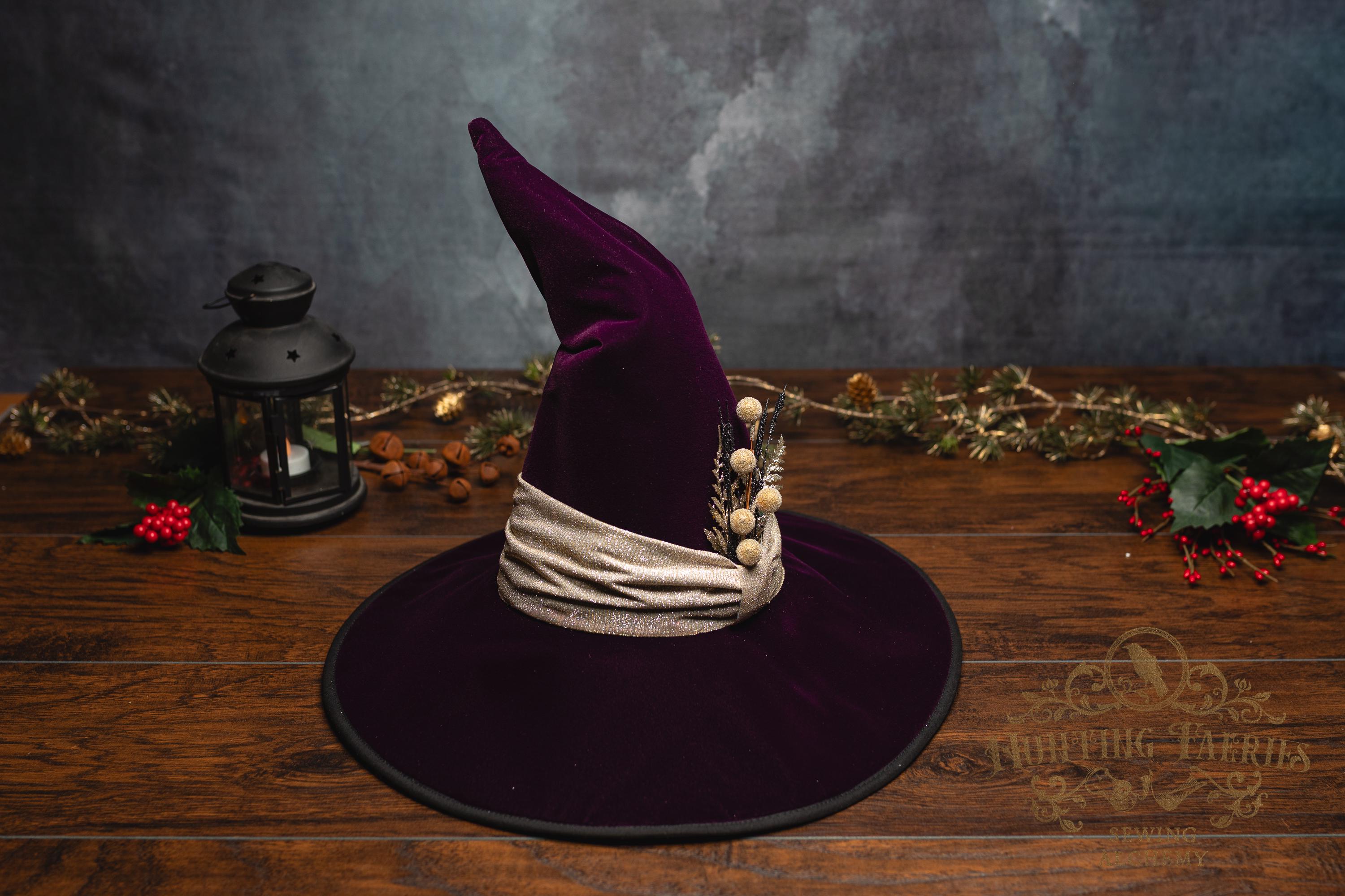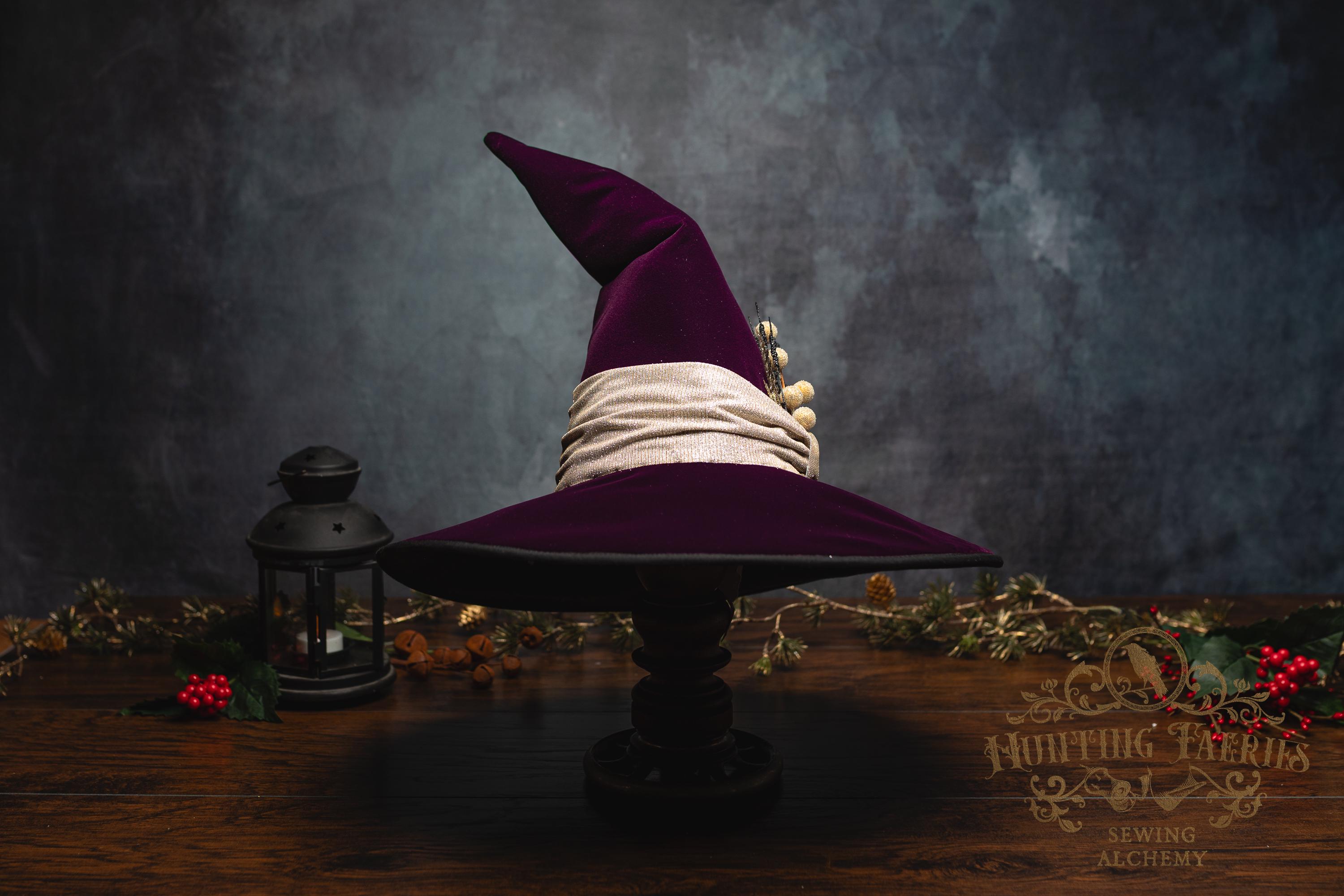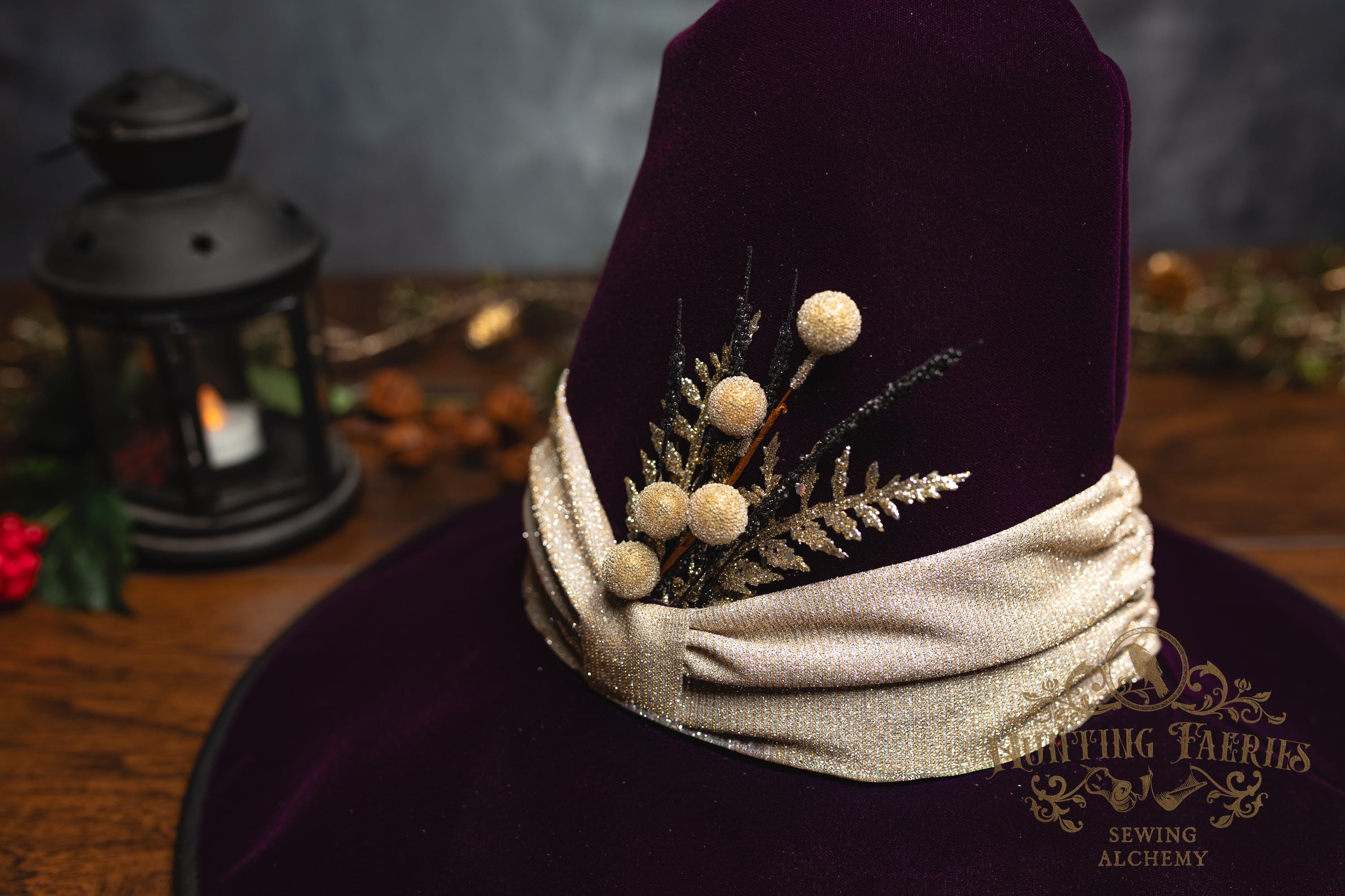 This witch hat is made from plum velvet, with a gold glittery band encircling the crooked cone. The slanted brim features three layers of magic stitched together and polished off with black bias tape. The underside and inside cone is black felt, which helps the hat maintain its shape, and absorbs that extra moonlight as you fly through those cold December skies. The side of the hat is adorned with a simple small gold accented pin. It is removable, allowing you to decorate it to suit your own personal style or change it up to match your seasonal whim.