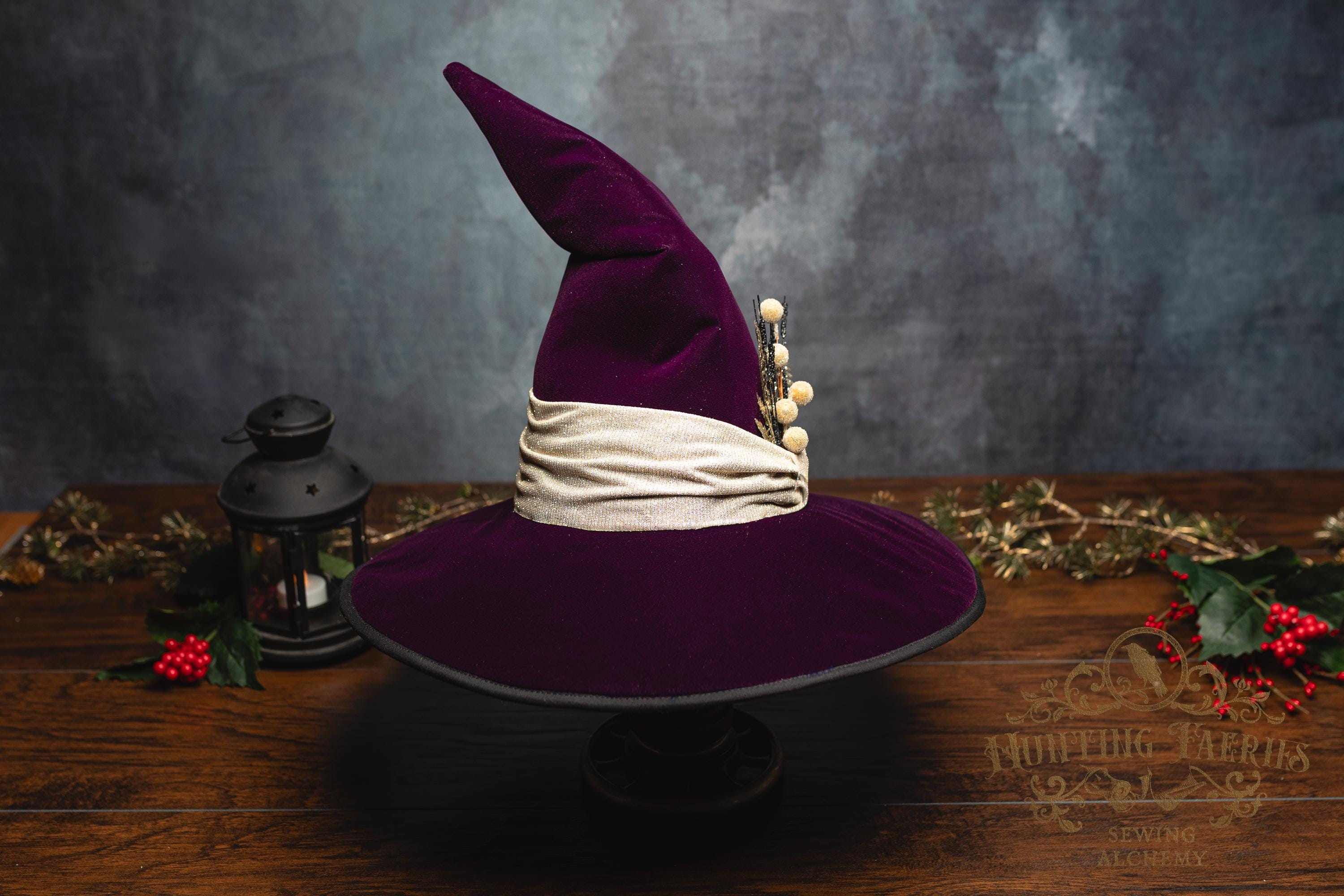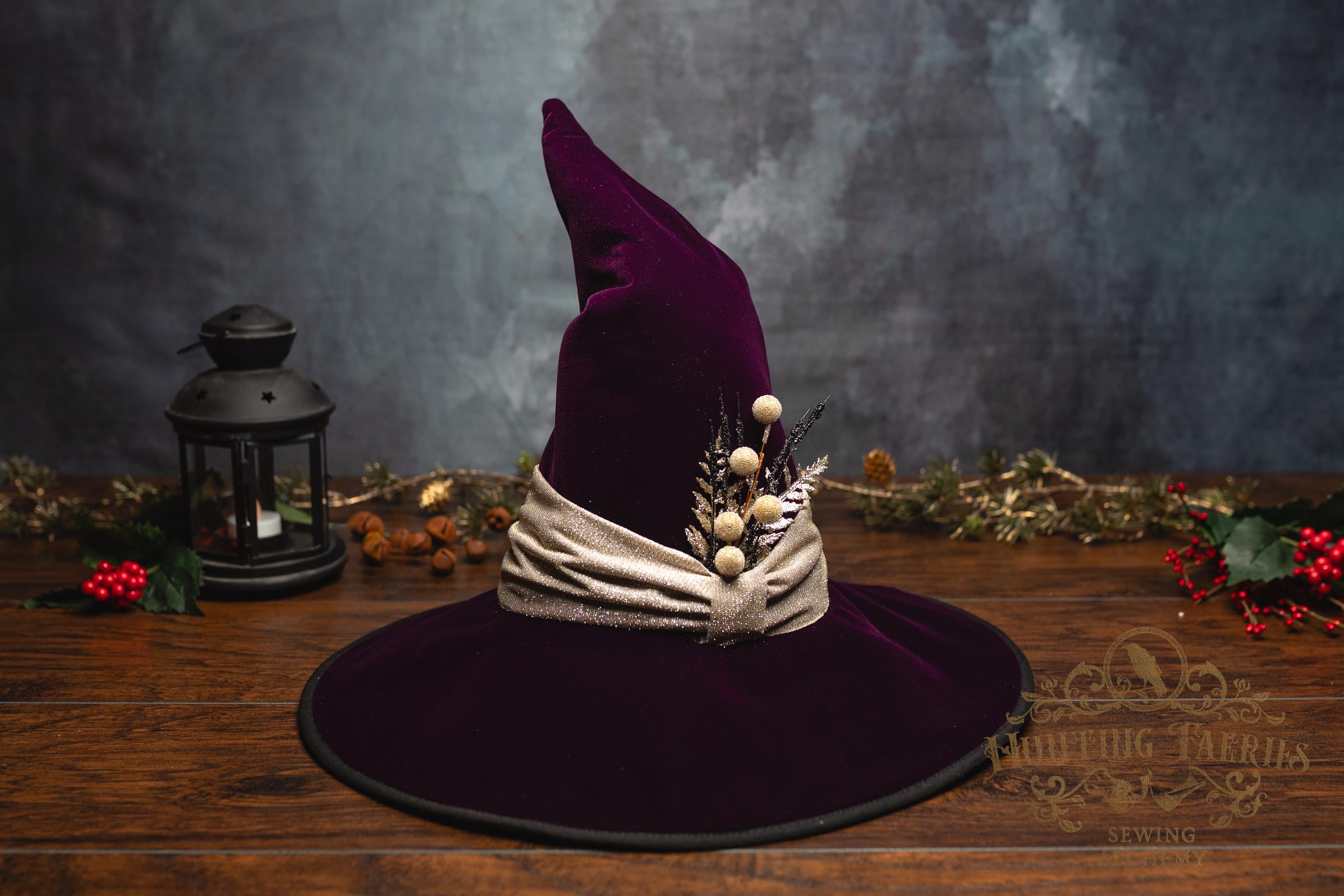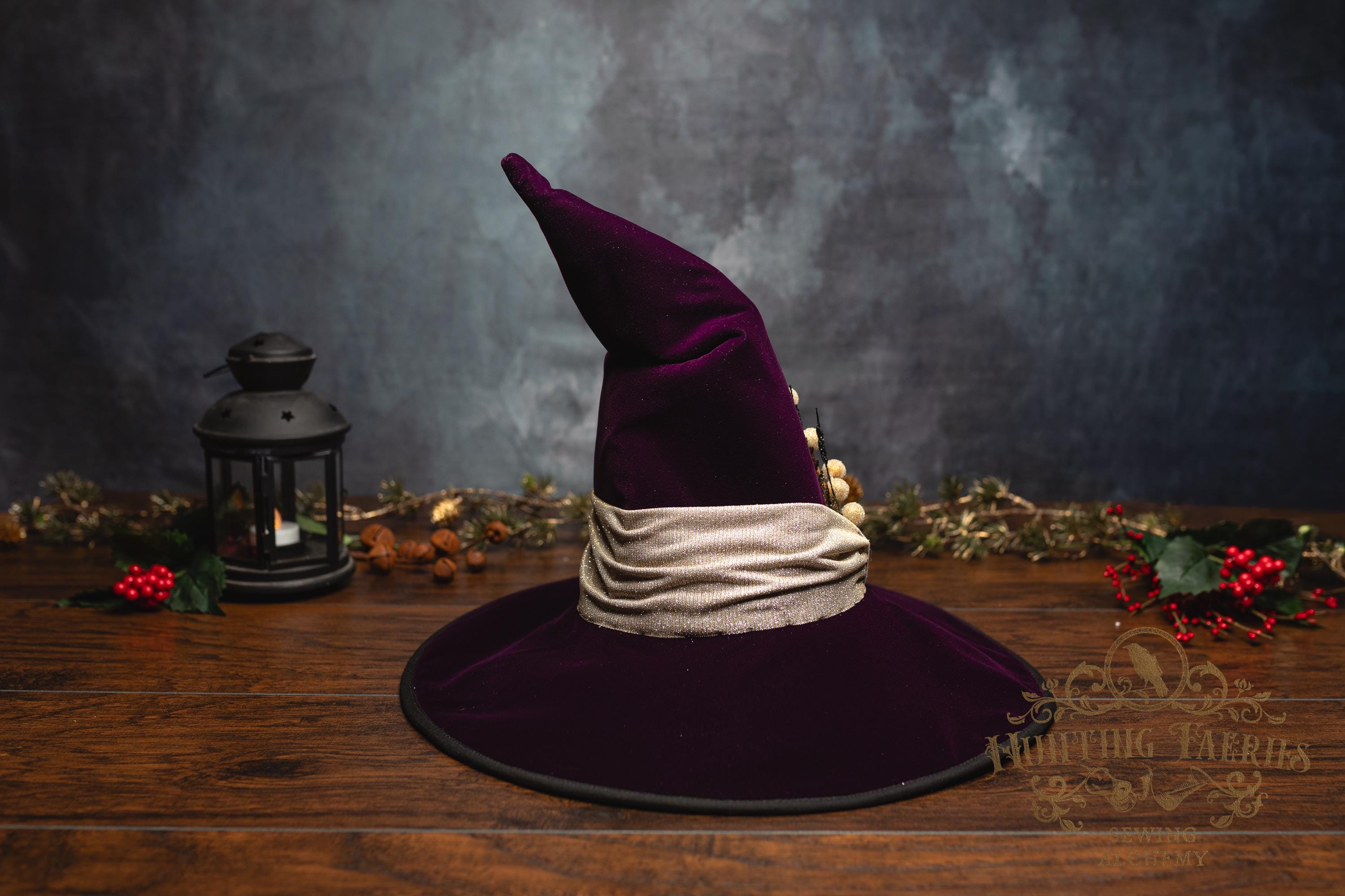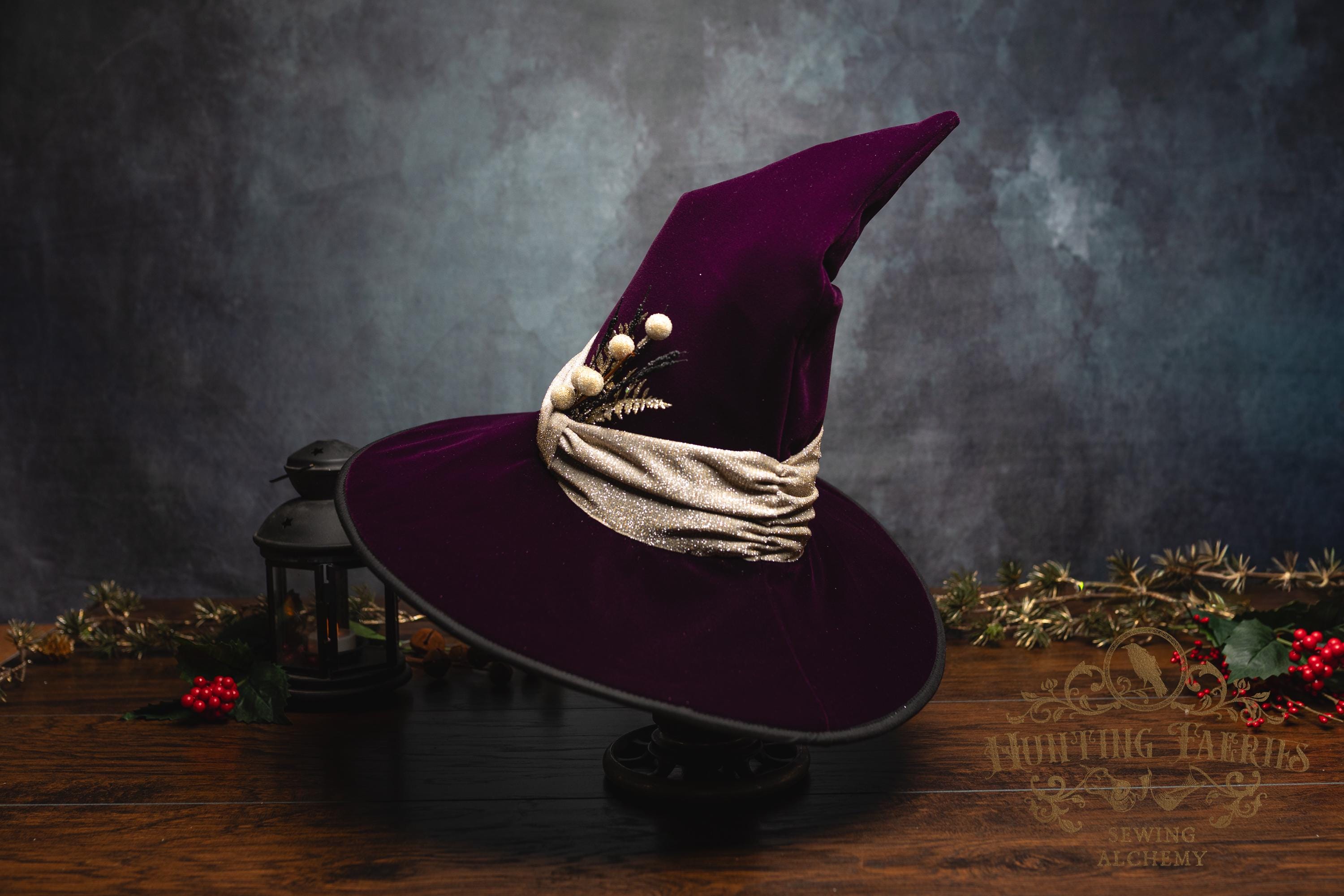 This witch hat is made from plum velvet, with a gold glittery band encircling the crooked cone. The slanted brim features three layers of magic stitched together and polished off with black bias tape. The underside and inside cone is black felt, which helps the hat maintain its shape, and absorbs that extra moonlight as you fly through those cold December skies. The side of the hat is adorned with a simple small gold accented pin. It is removable, allowing you to decorate it to suit your own personal style or change it up to match your seasonal whim.