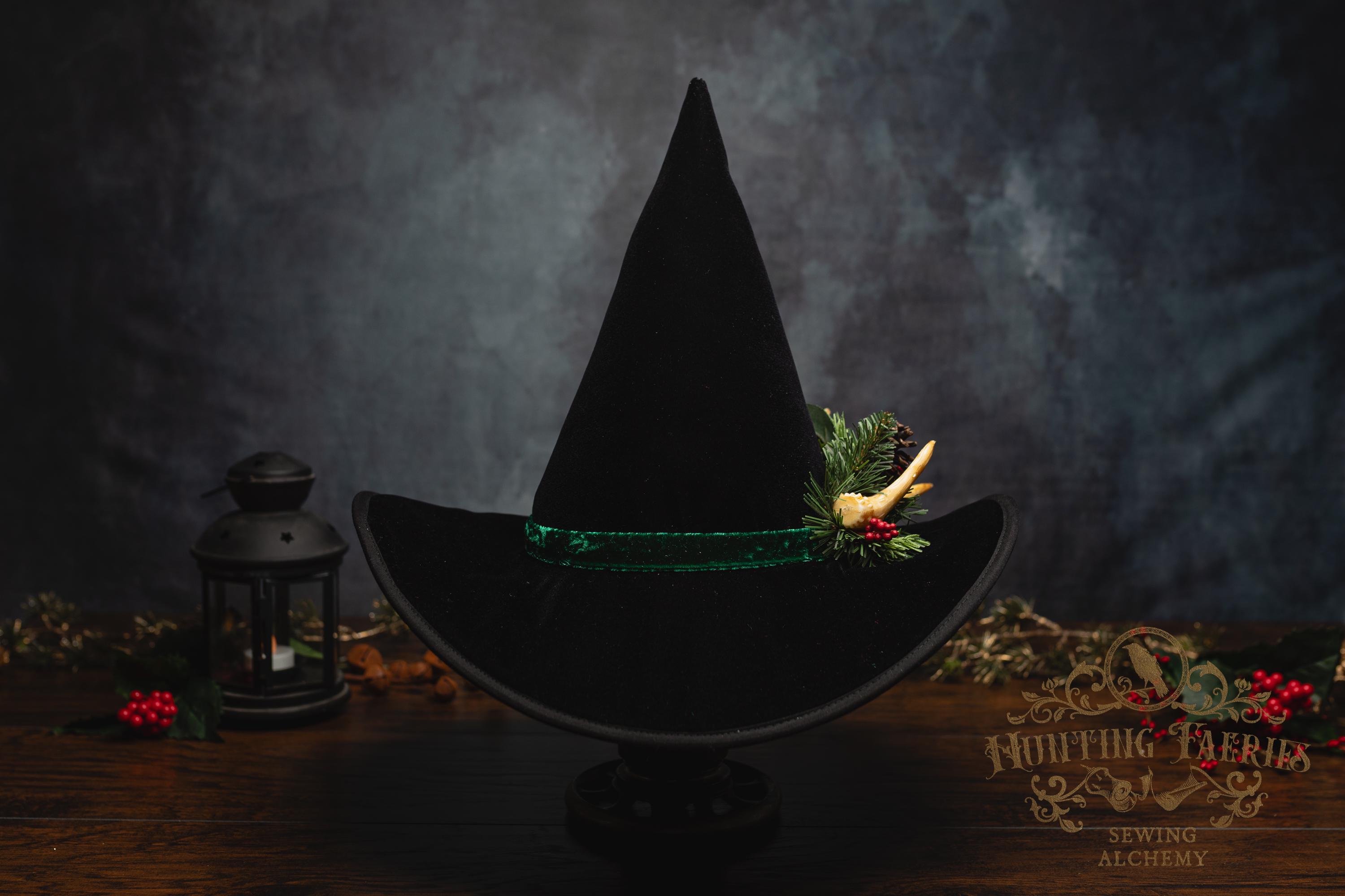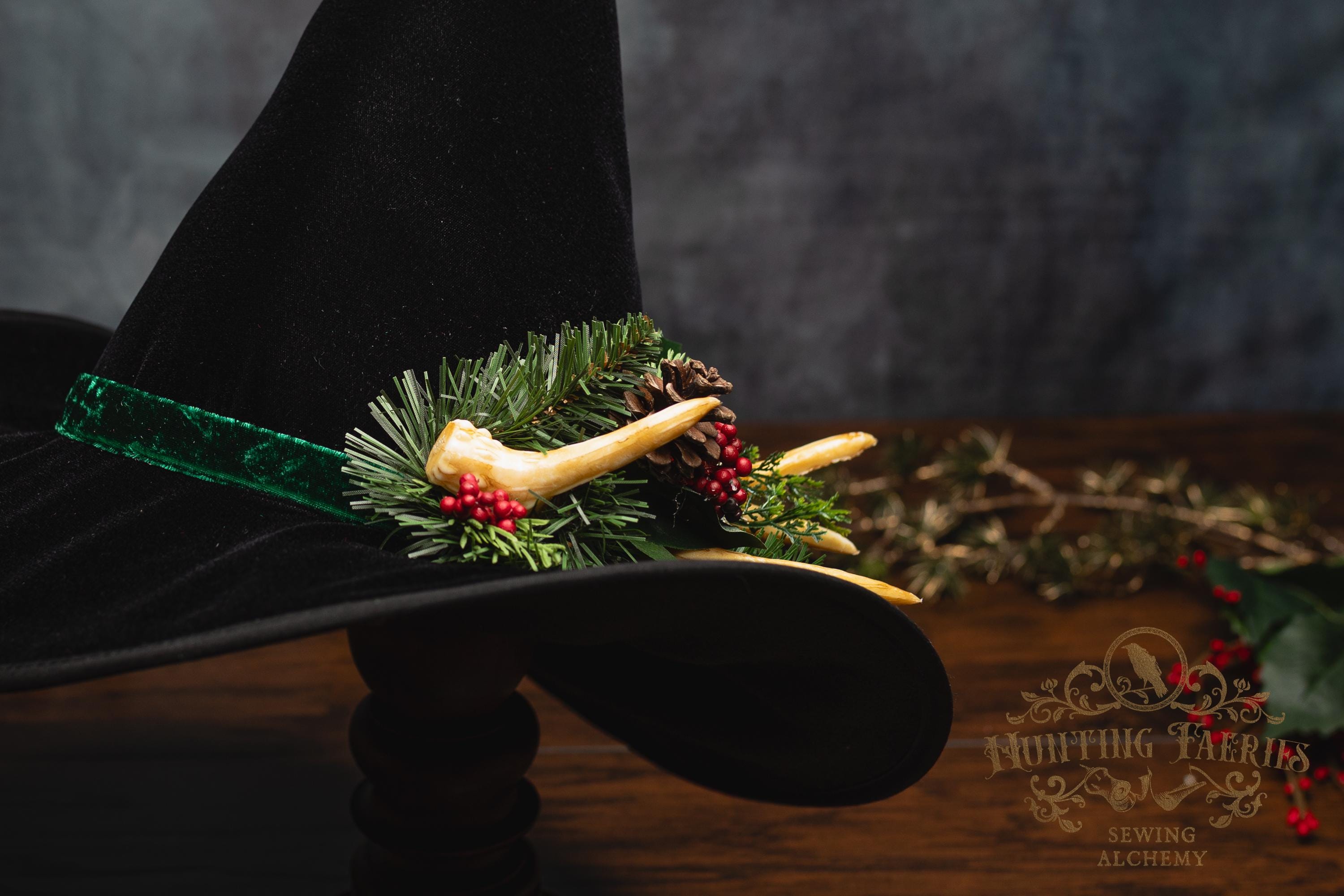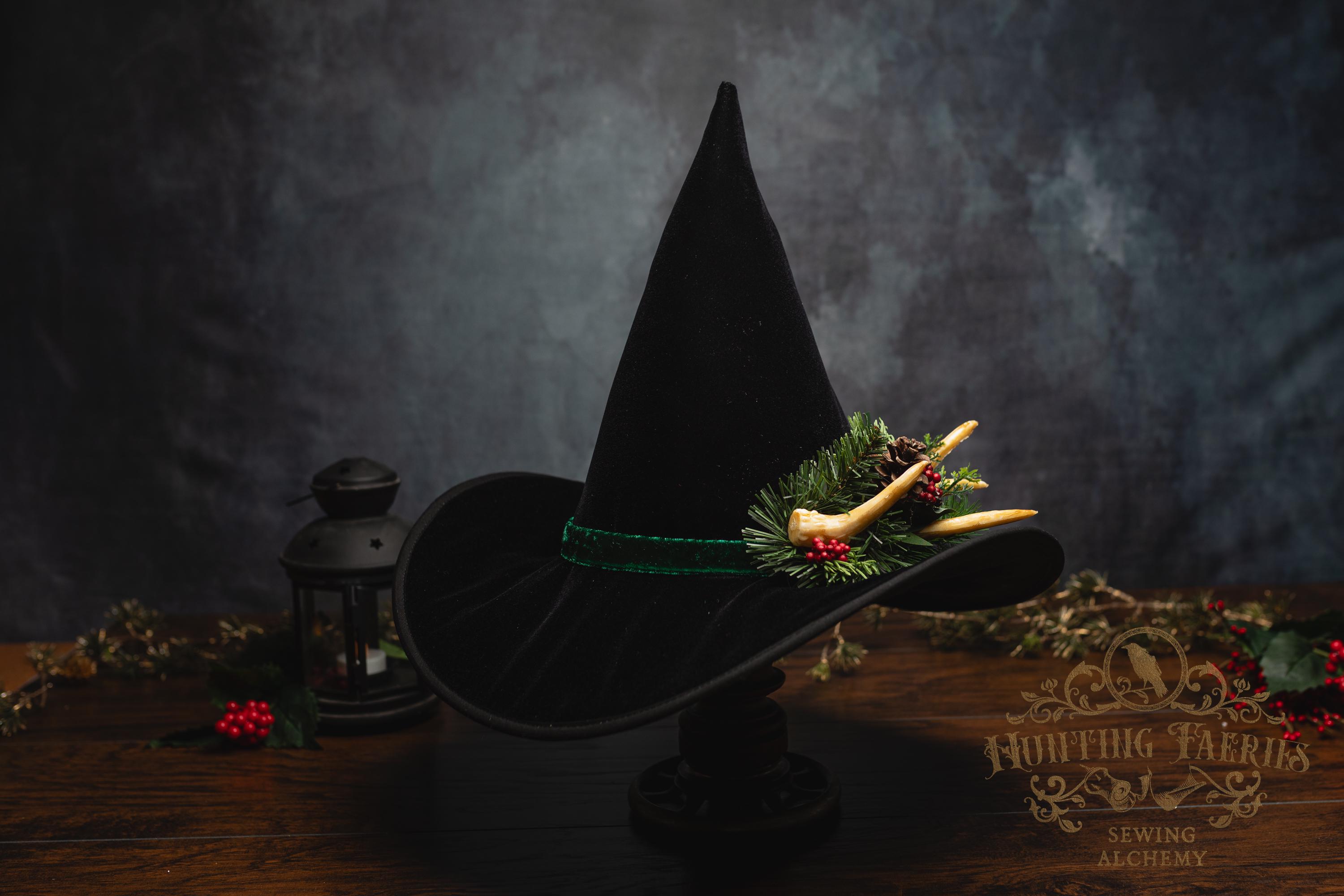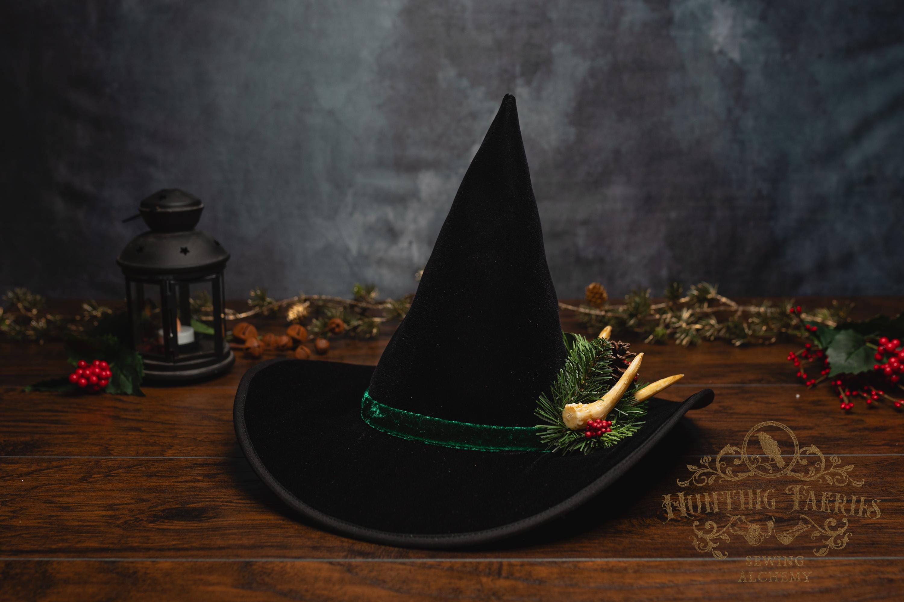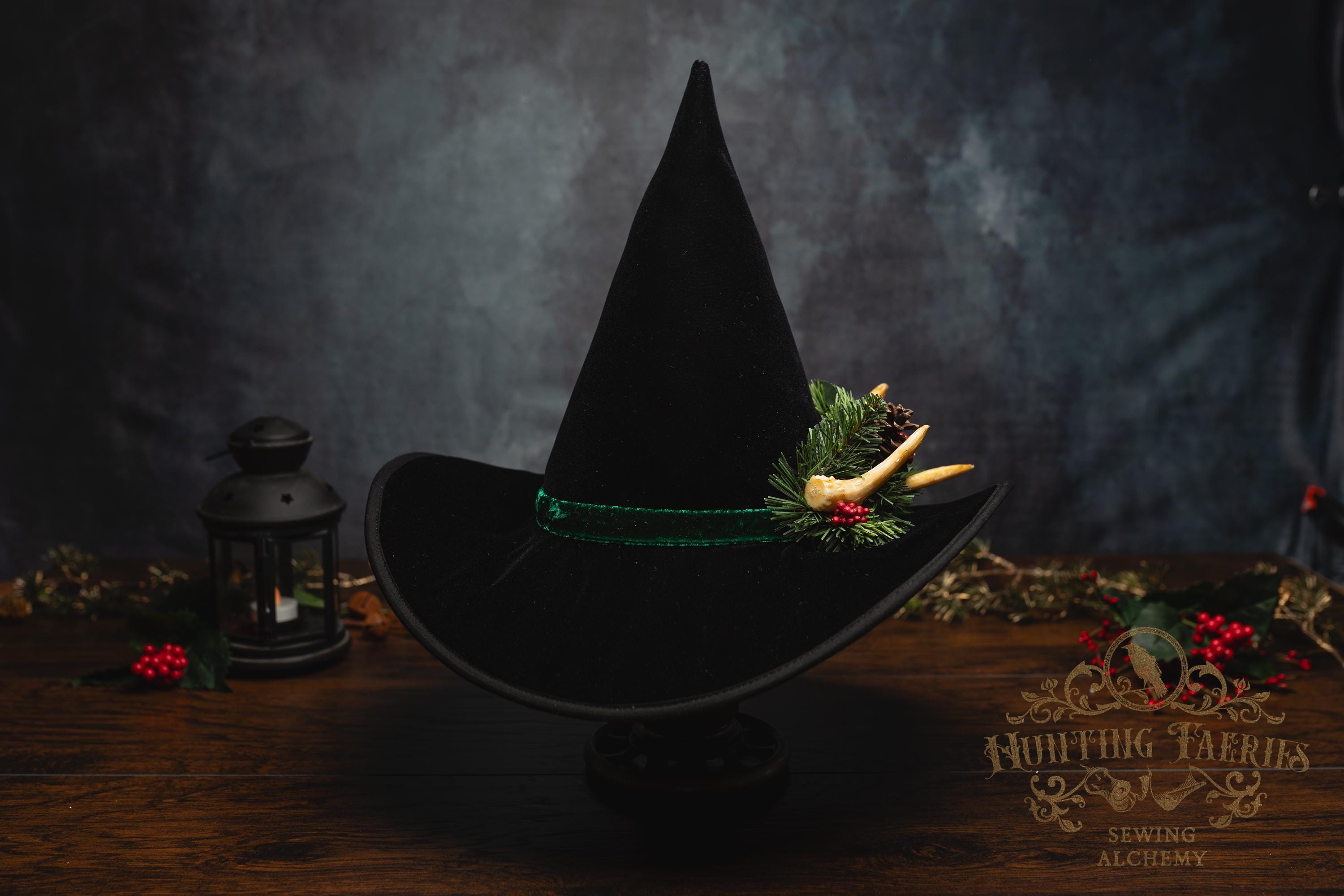 This witch hat is made from black velvet with a green velvet ribbon encircling the straight cone. The mid-sized brim features three layers of magic stitched together. Under the brim is black felt, which helps the hat maintain its shape, and it absorbs that extra moonlight as you fly through those December skies. It features a woodland pin at the side with a faux antler. The cone is lined in felt to maintain its shape and be a comfortable, soft fit. Simply bewitching!