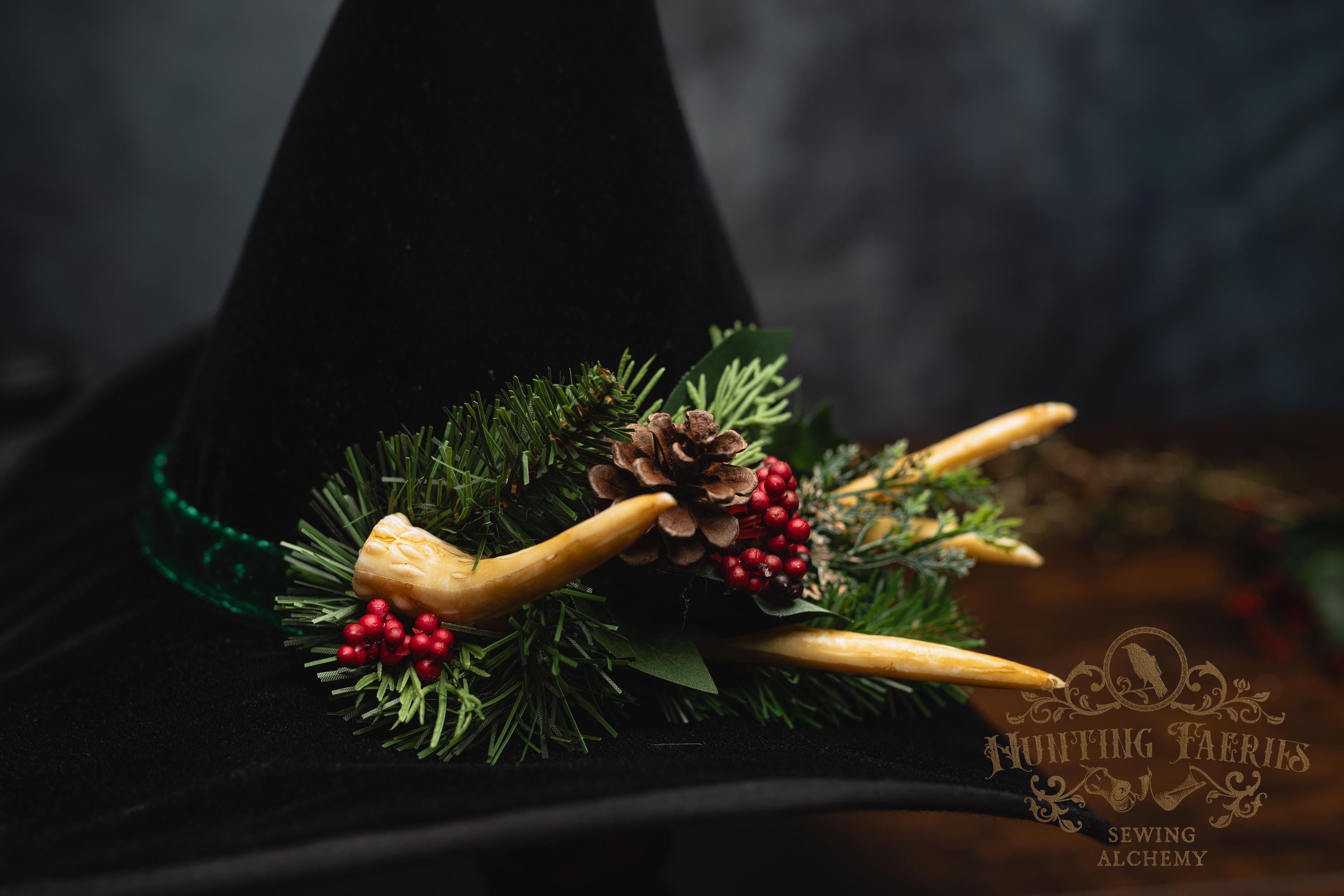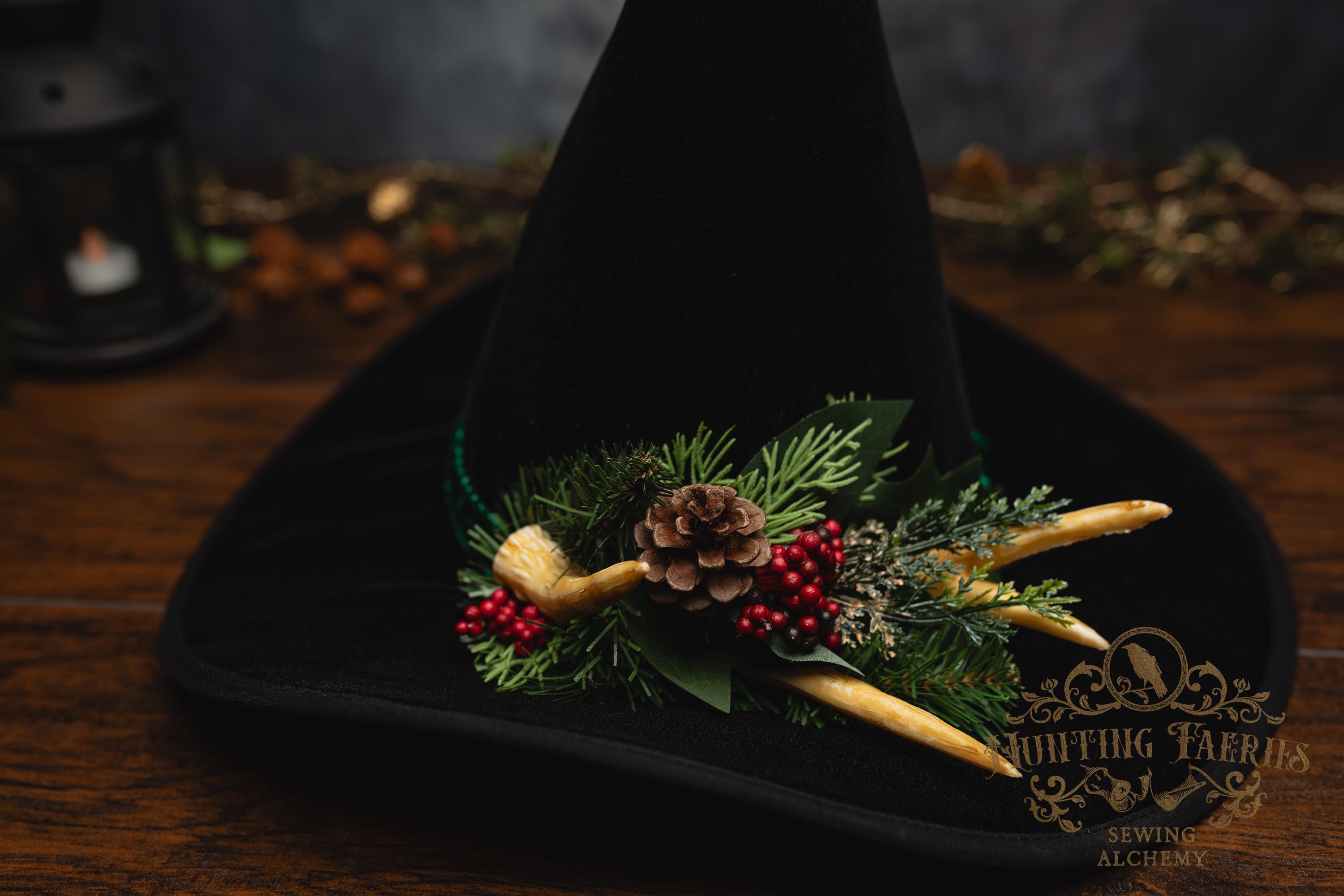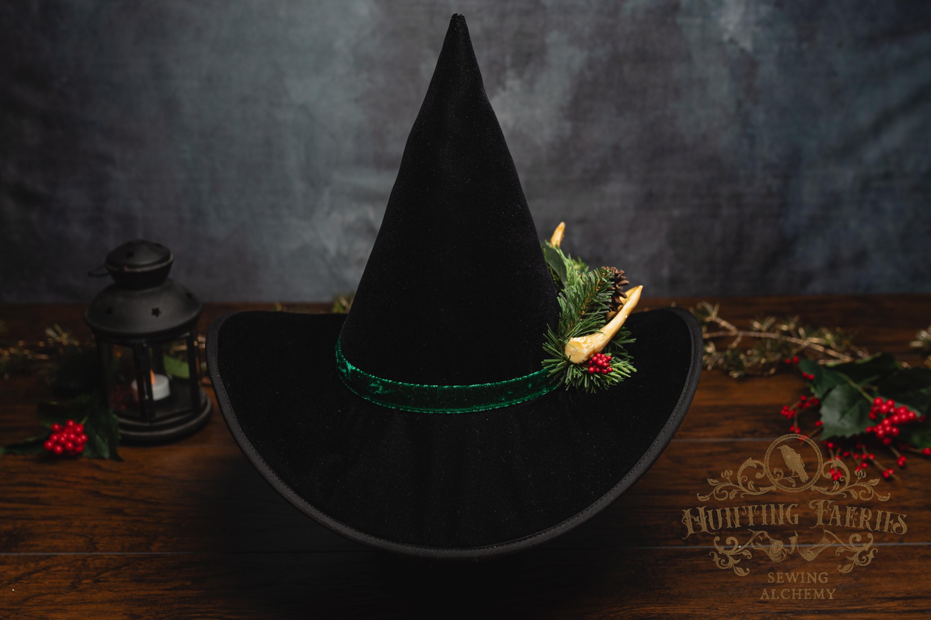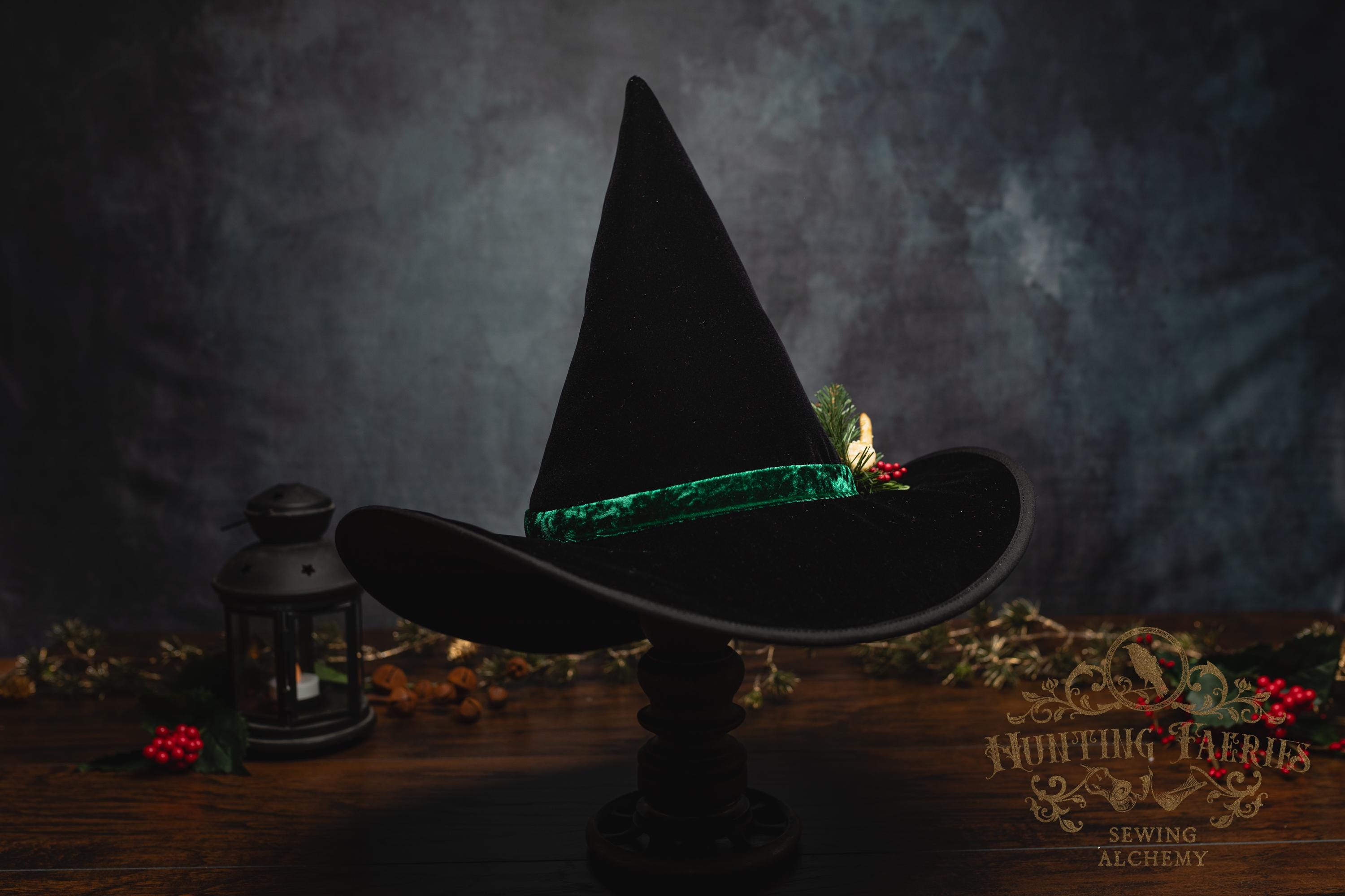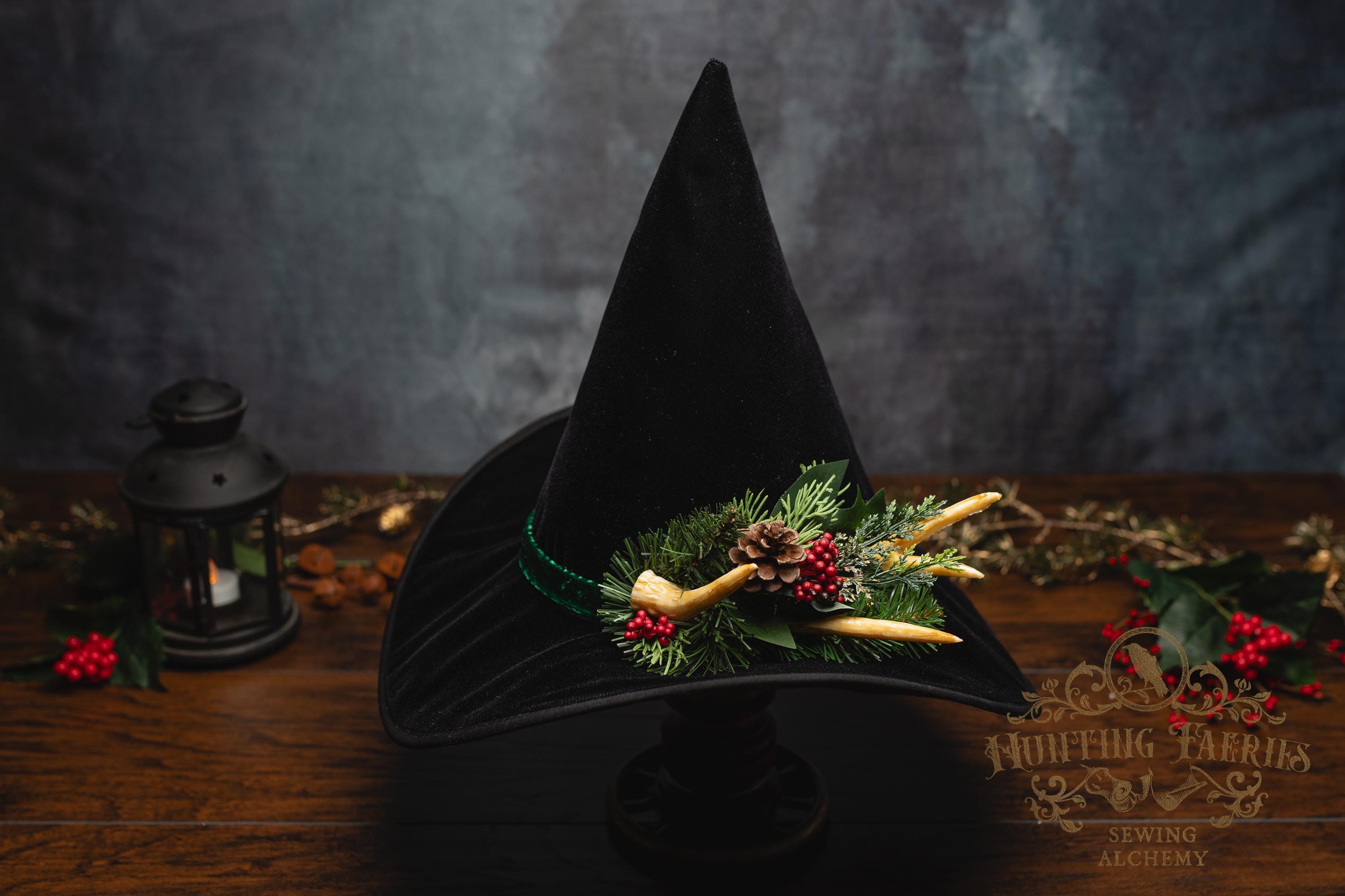 This witch hat is made from black velvet with a green velvet ribbon encircling the straight cone. The mid-sized brim features three layers of magic stitched together. Under the brim is black felt, which helps the hat maintain its shape, and it absorbs that extra moonlight as you fly through those December skies. It features a woodland pin at the side with a faux antler. The cone is lined in felt to maintain its shape and be a comfortable, soft fit. Simply bewitching!