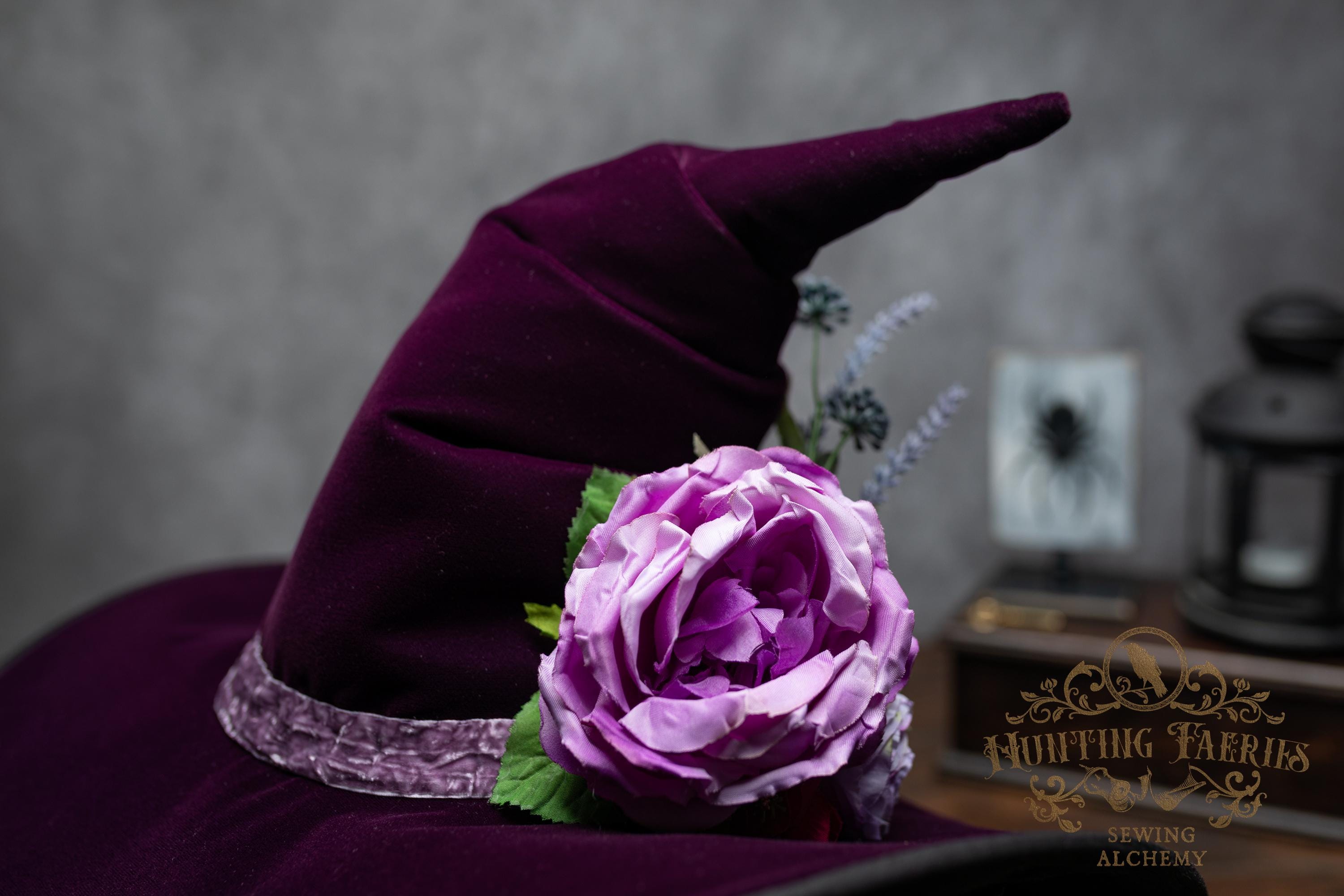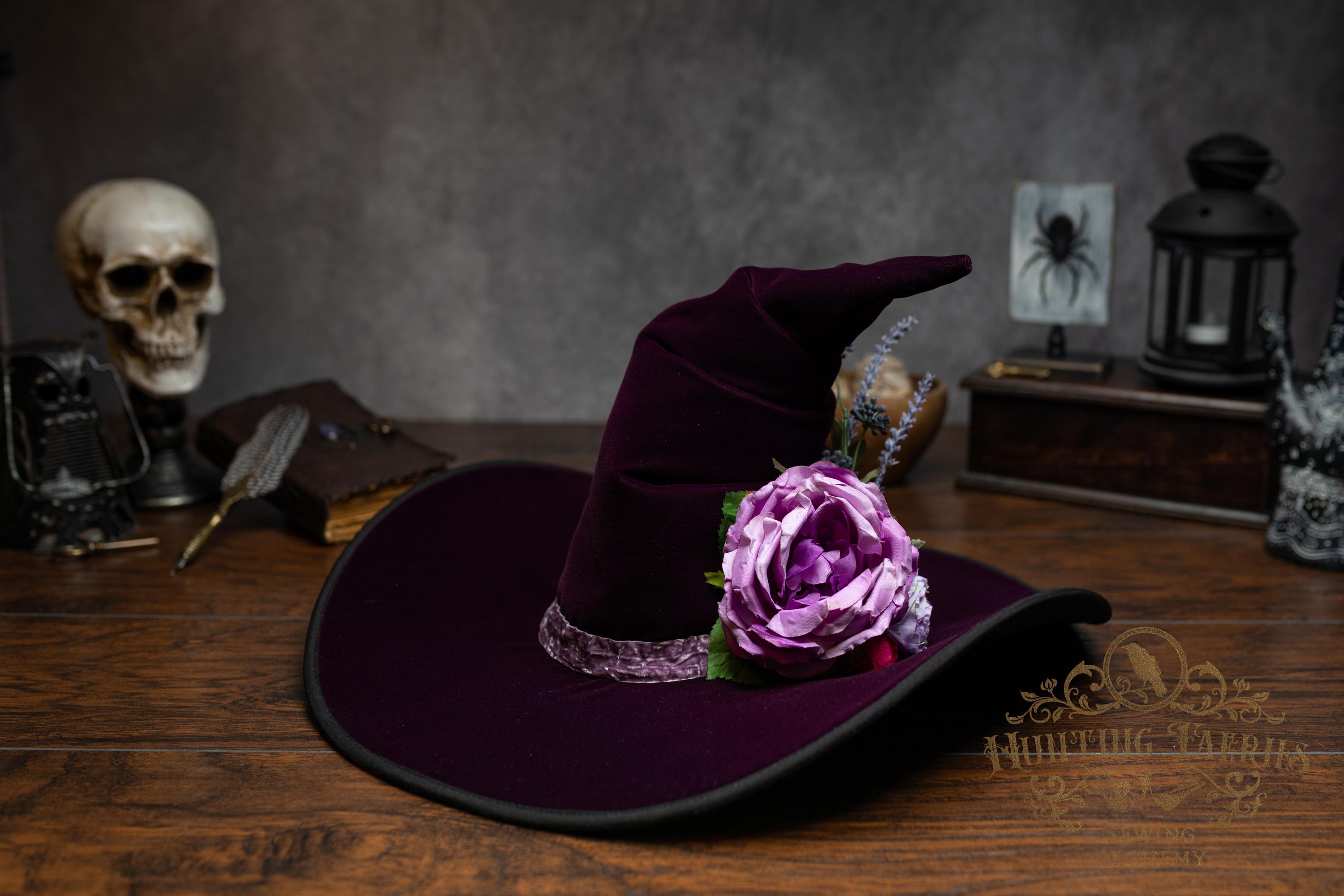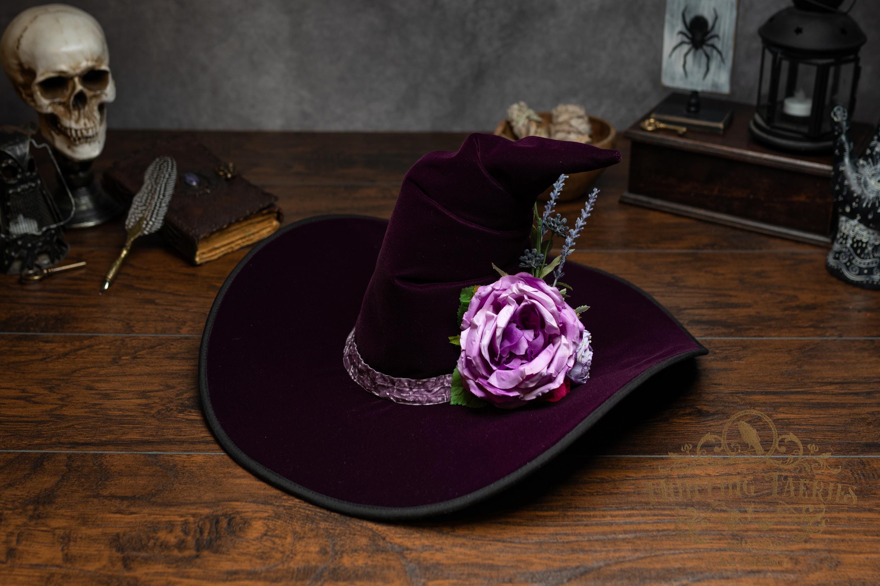 This handcrafted dark purple velvet witch hat features a lilac crushed-velvet ribbon around the cone with a purple "think Spring!" artificial flower accent on the side. The latter is attached via a set of pins, allowing you to take it off and decorate yourself if you wish.