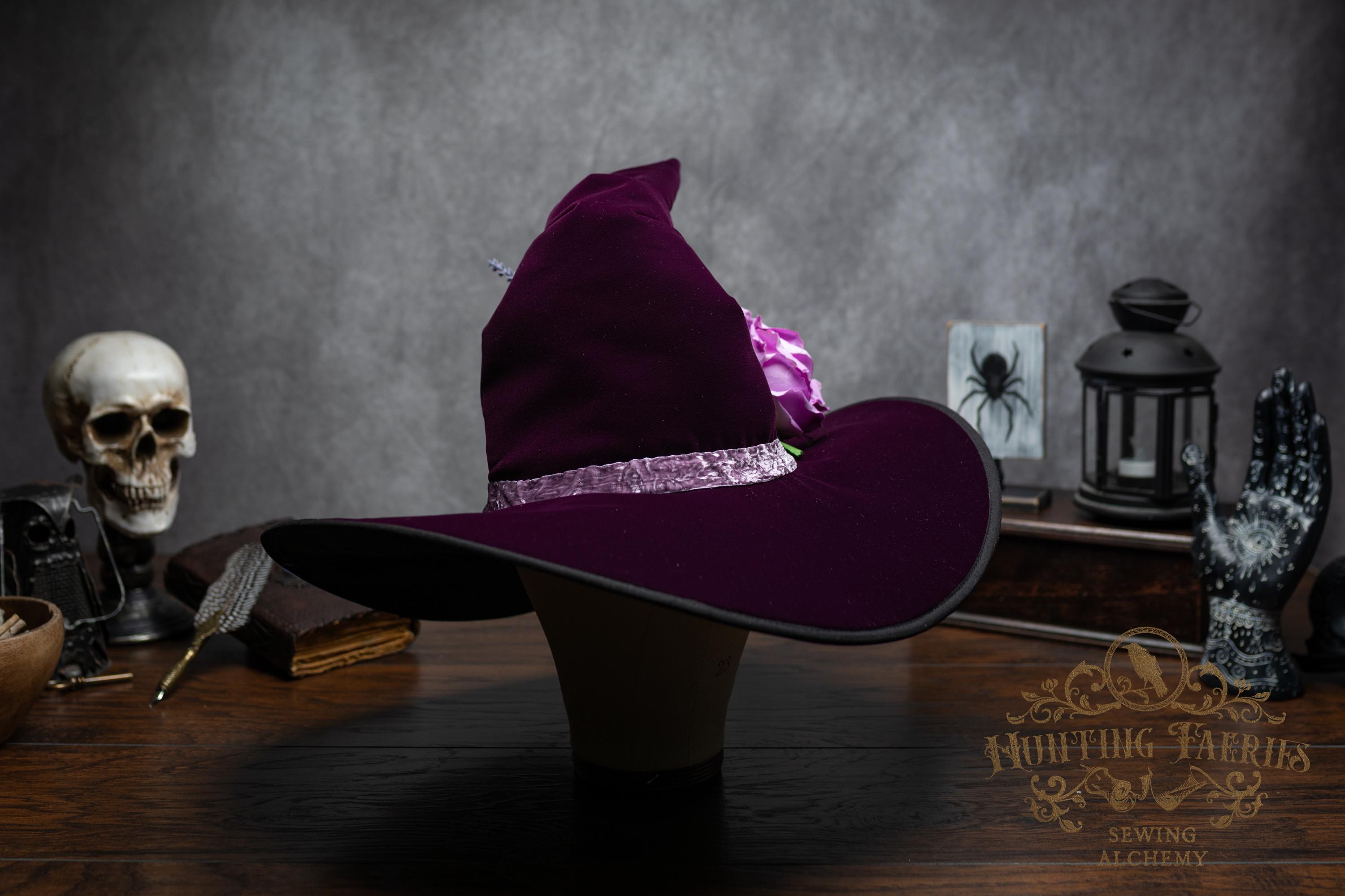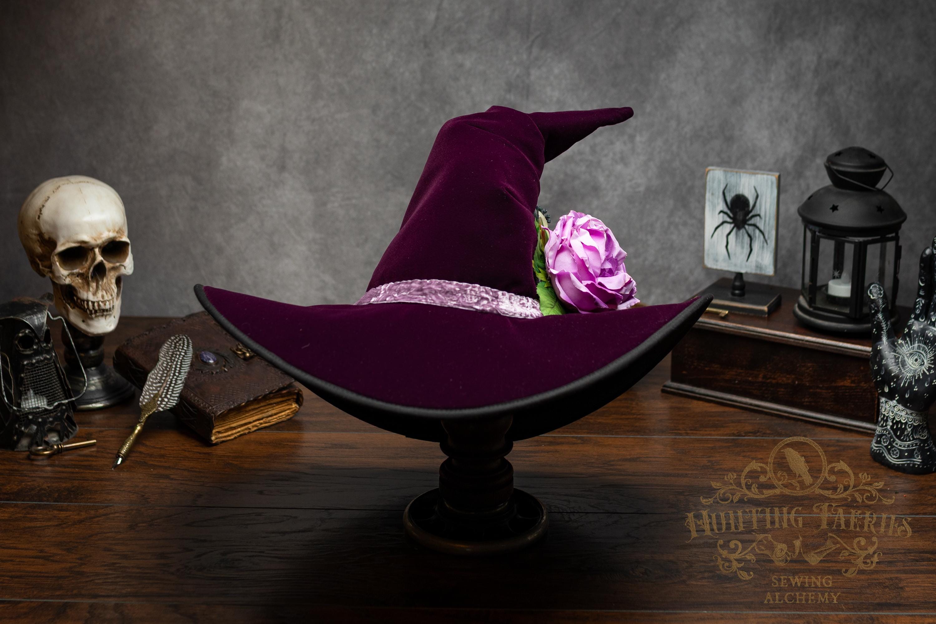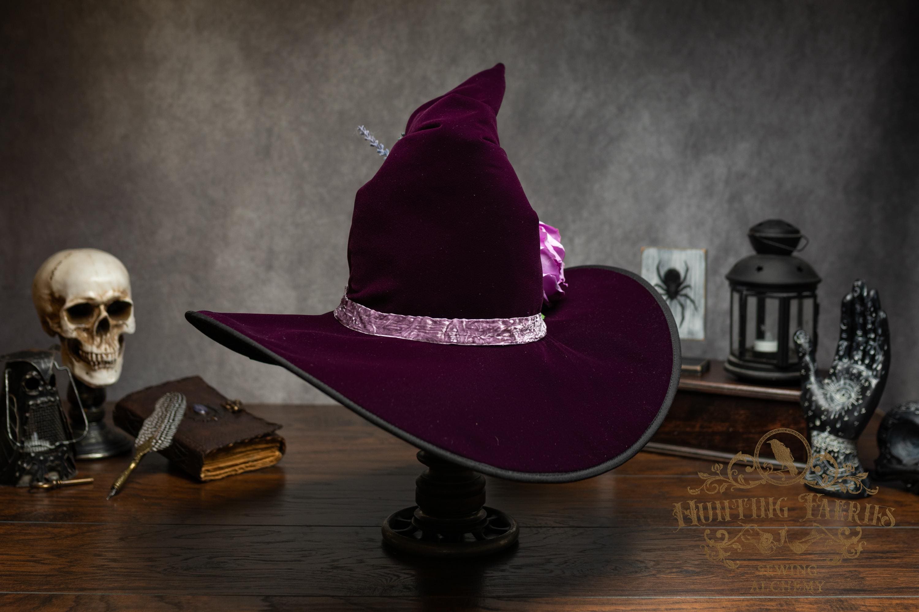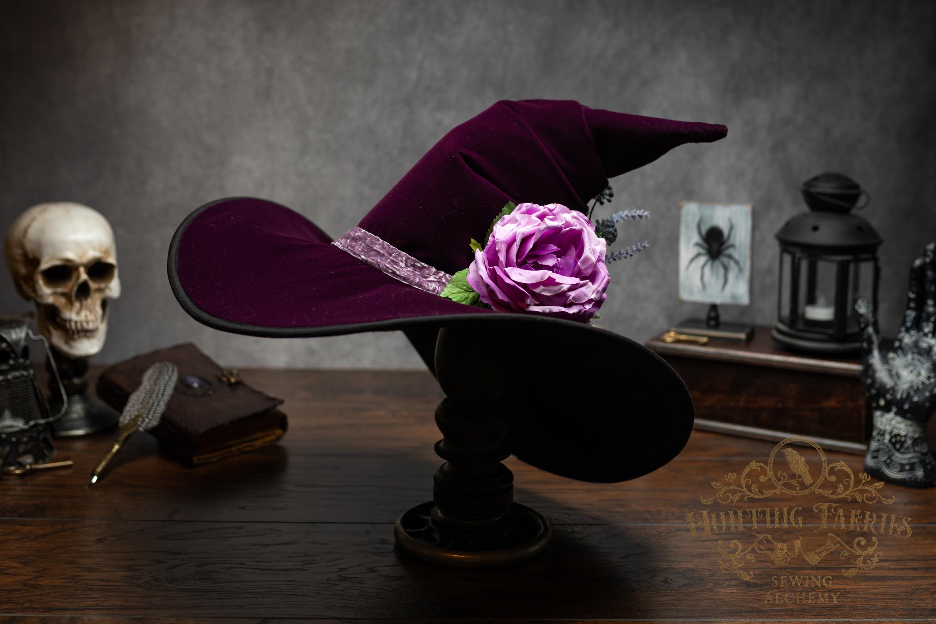 This handcrafted dark purple velvet witch hat features a lilac crushed-velvet ribbon around the cone with a purple "think Spring!" artificial flower accent on the side. The latter is attached via a set of pins, allowing you to take it off and decorate yourself if you wish.