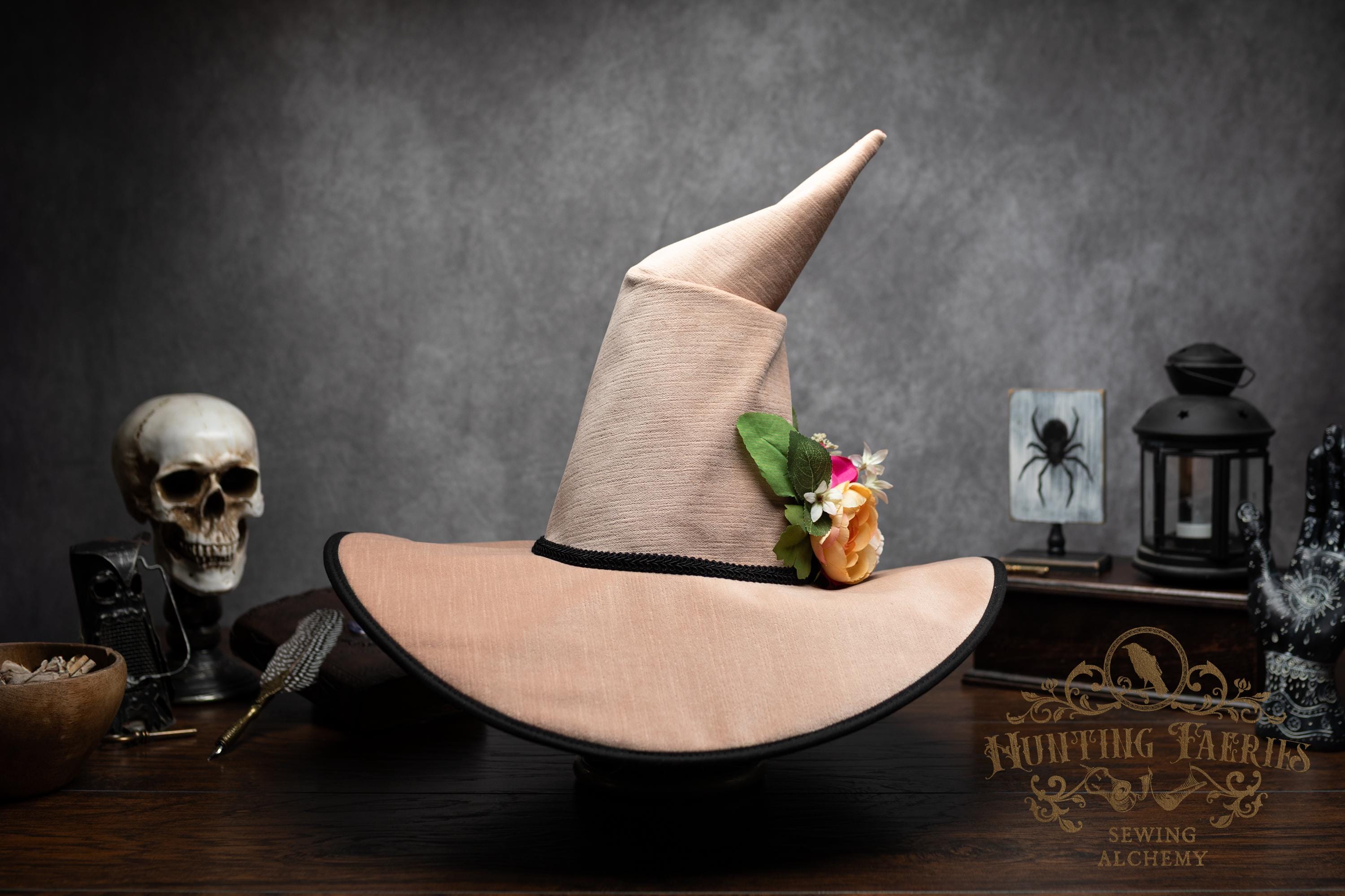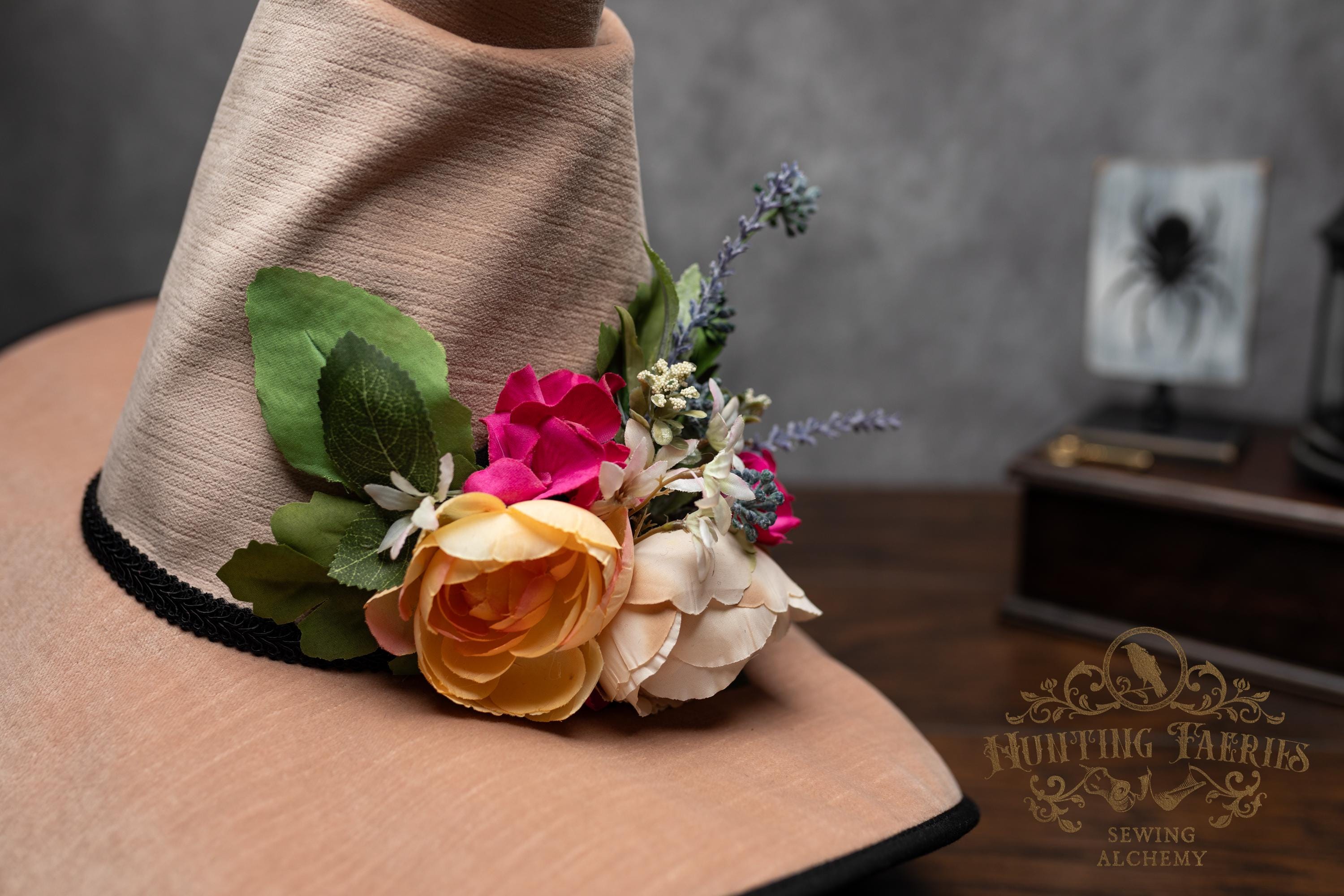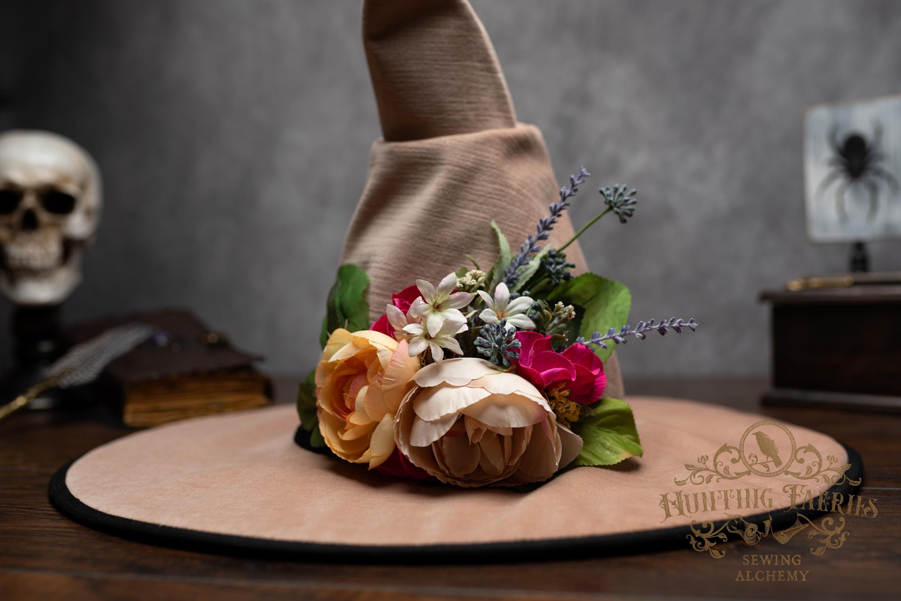 This handcrafted bush-colored velvet witch hat features a black gimp band around the cone and a small bunch of flowers on the side attached with pins. This is easily detachable, allowing you to change up your look at any time.