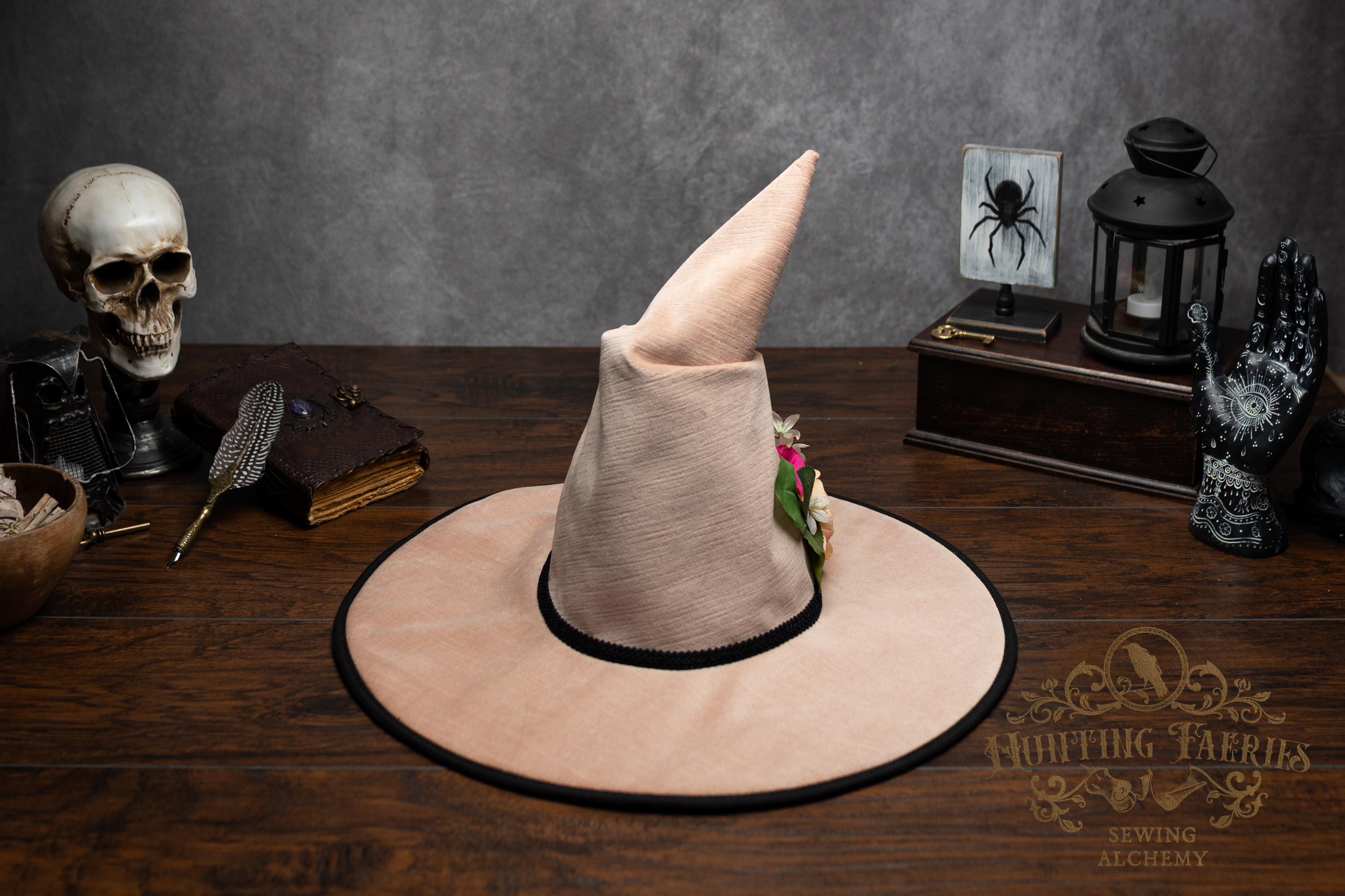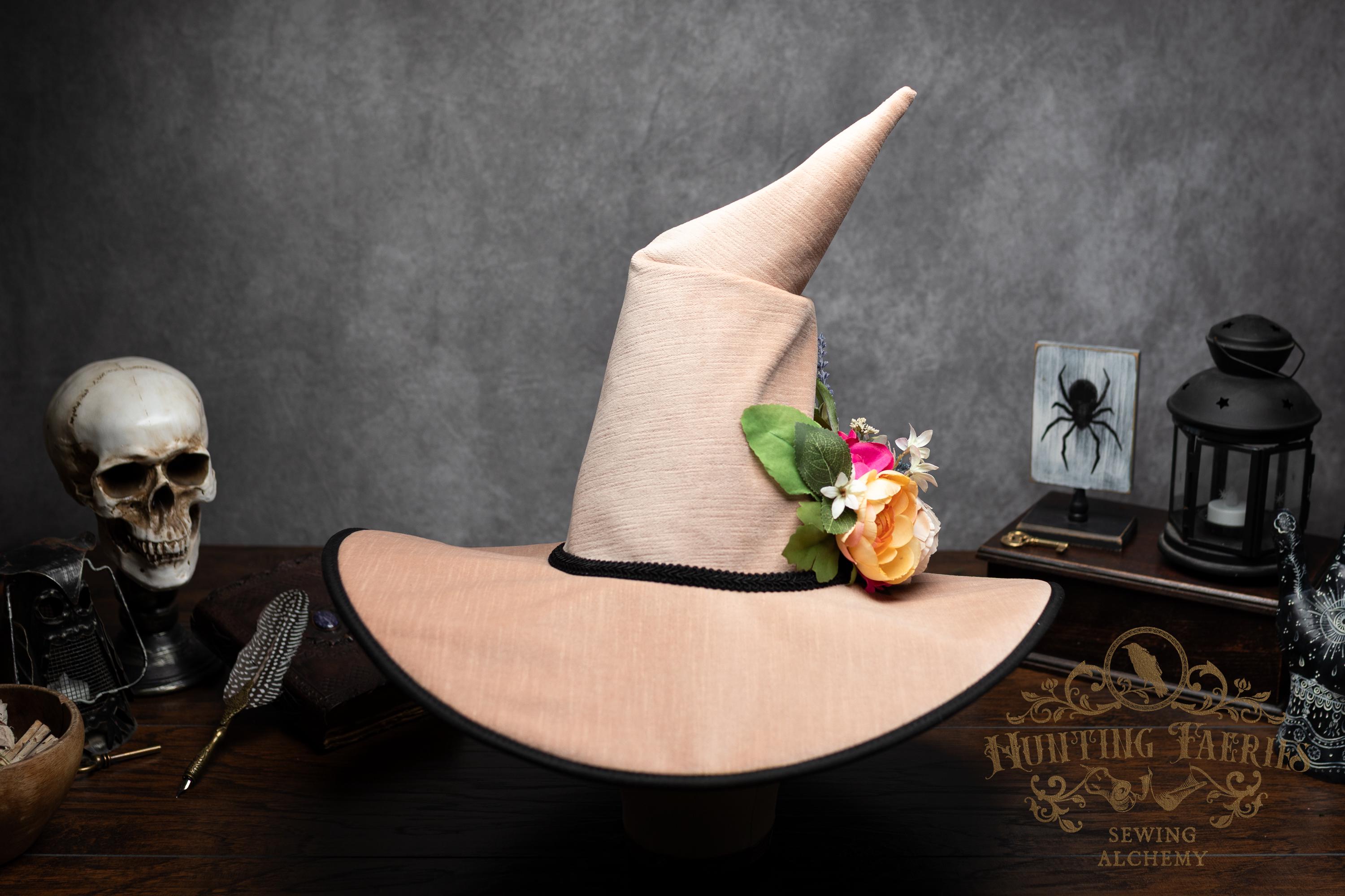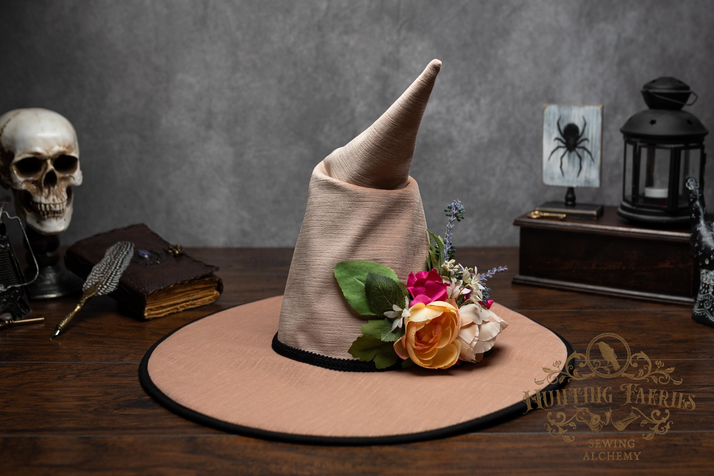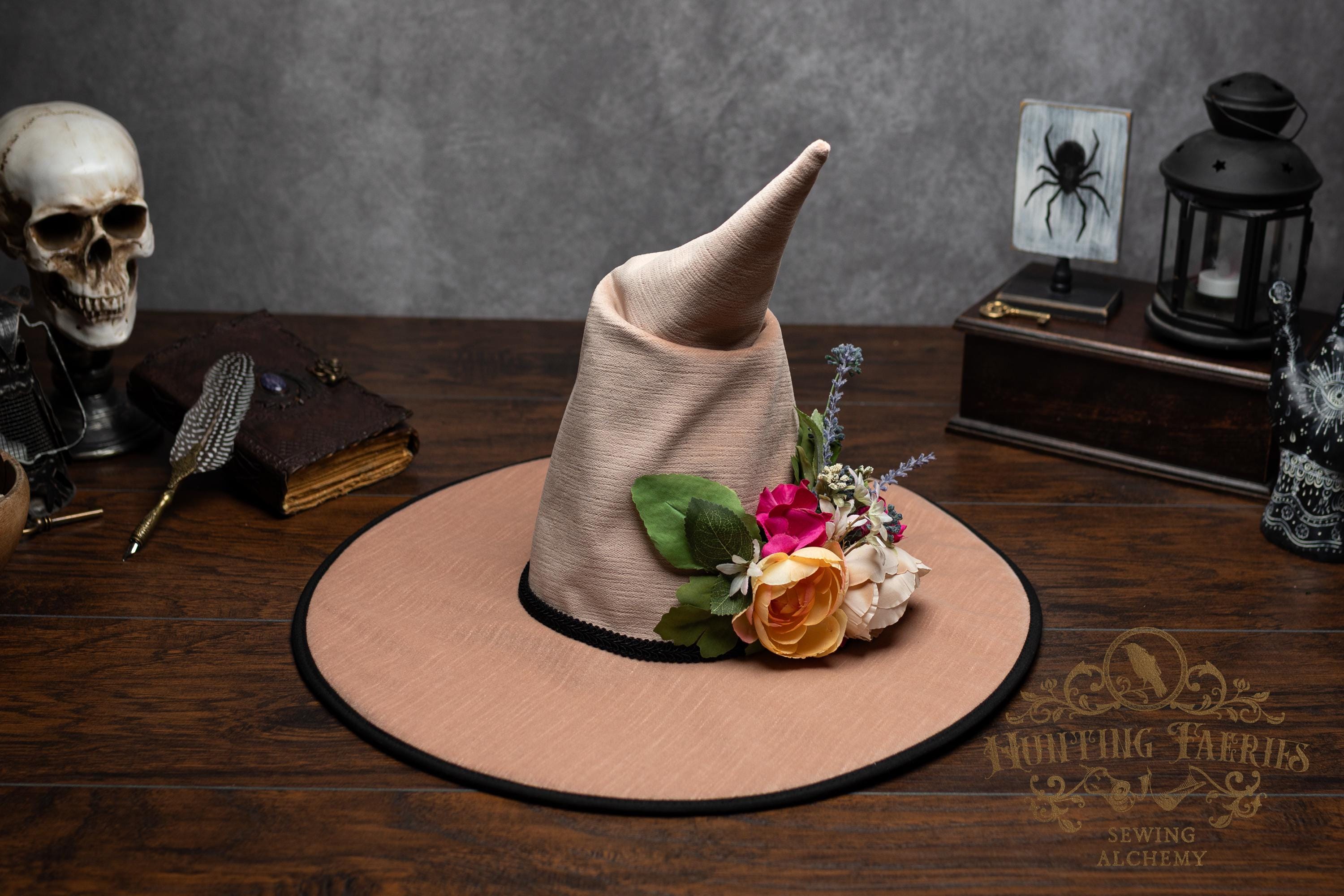 This handcrafted bush-colored velvet witch hat features a black gimp band around the cone and a small bunch of flowers on the side attached with pins. This is easily detachable, allowing you to change up your look at any time.